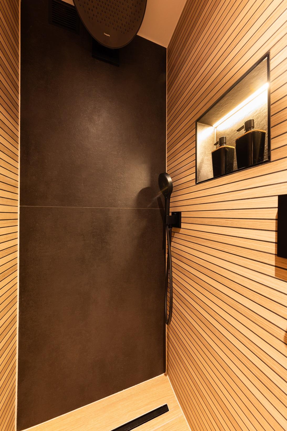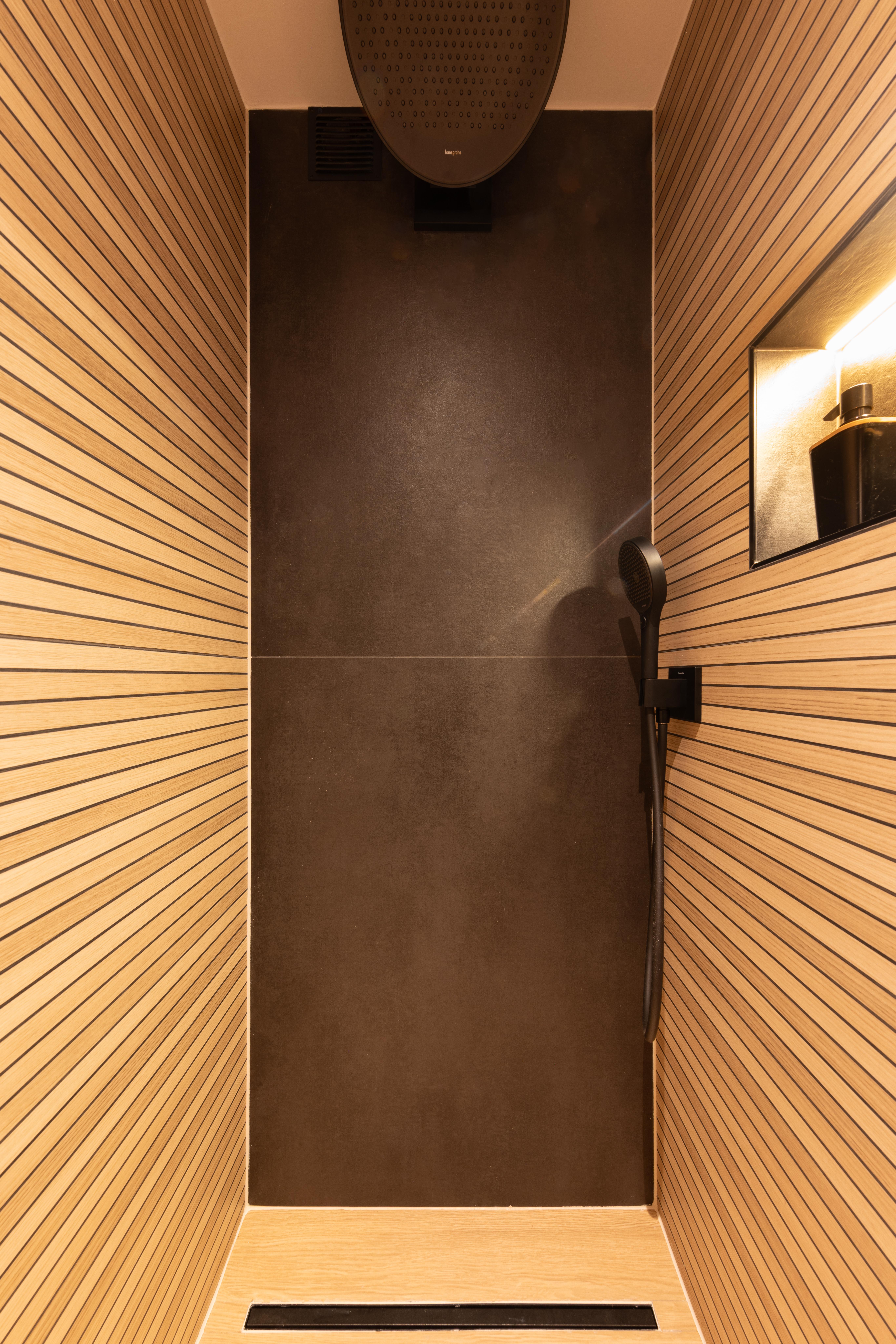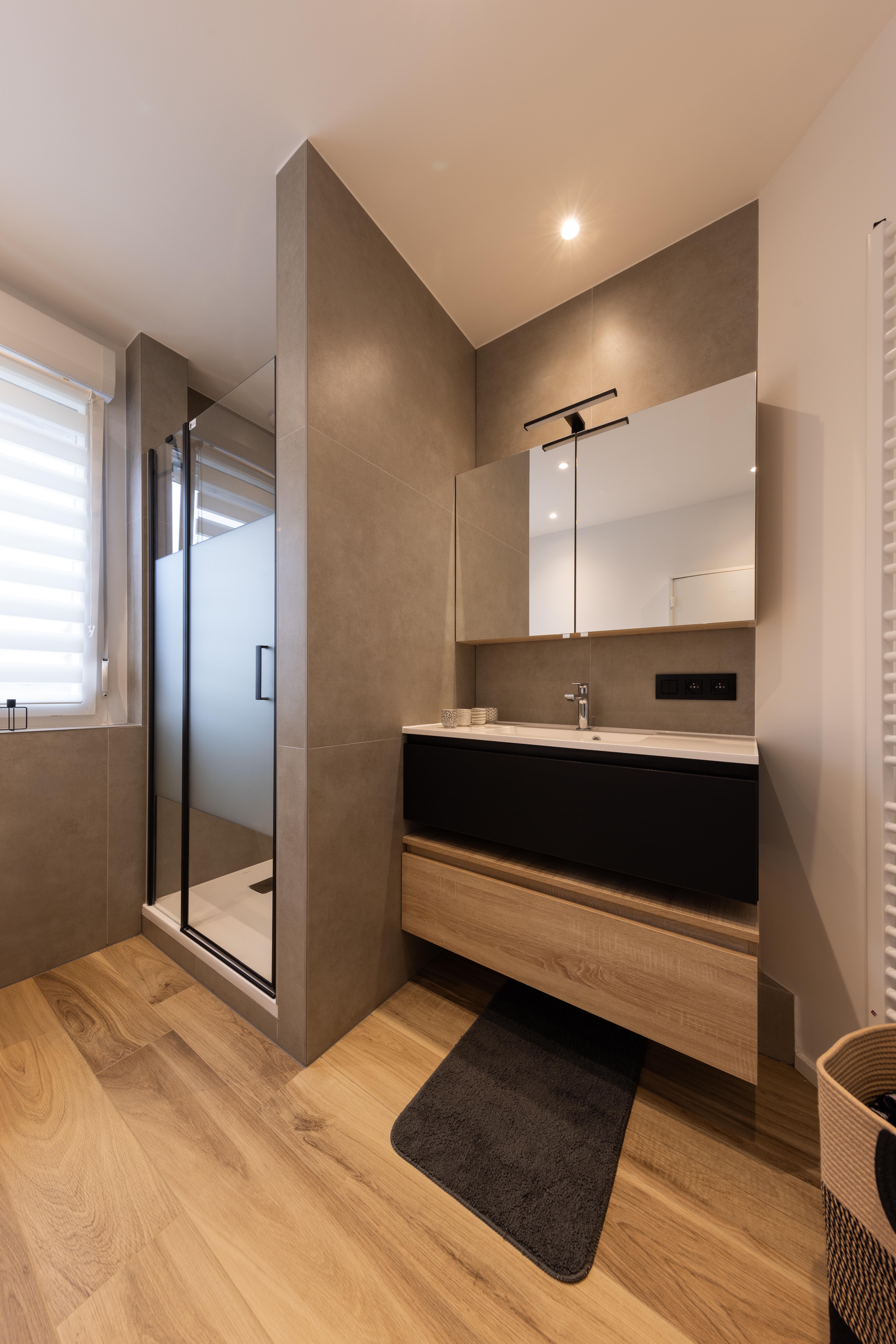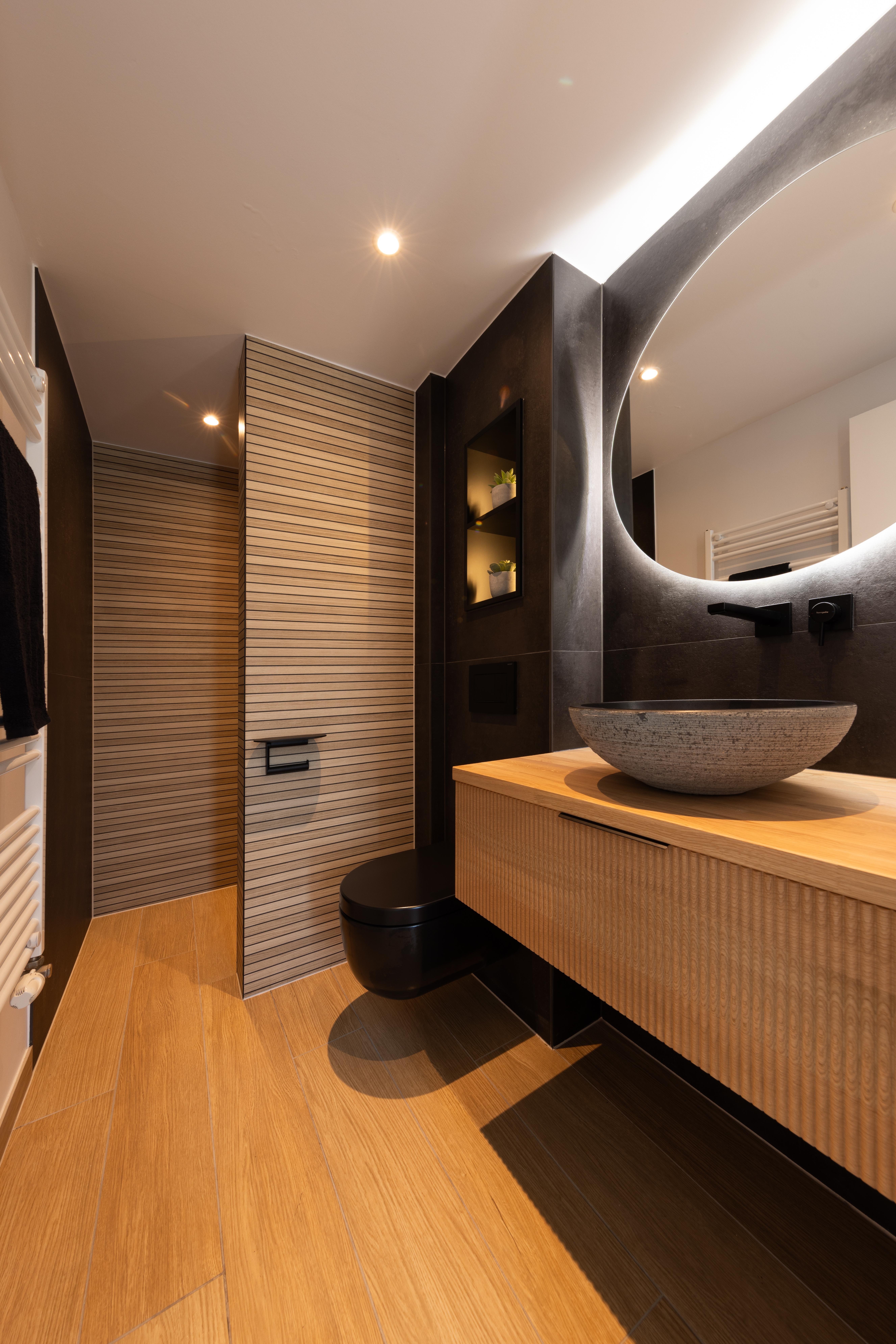 Dans ce projet l'effet du bois vient réchauffé la tonalité noire relativement majoritaire. La combinaison du meuble et de la douche, a permis le placement du wc dans la nouvelle cloison qui a été créée.