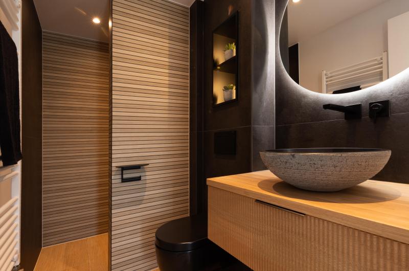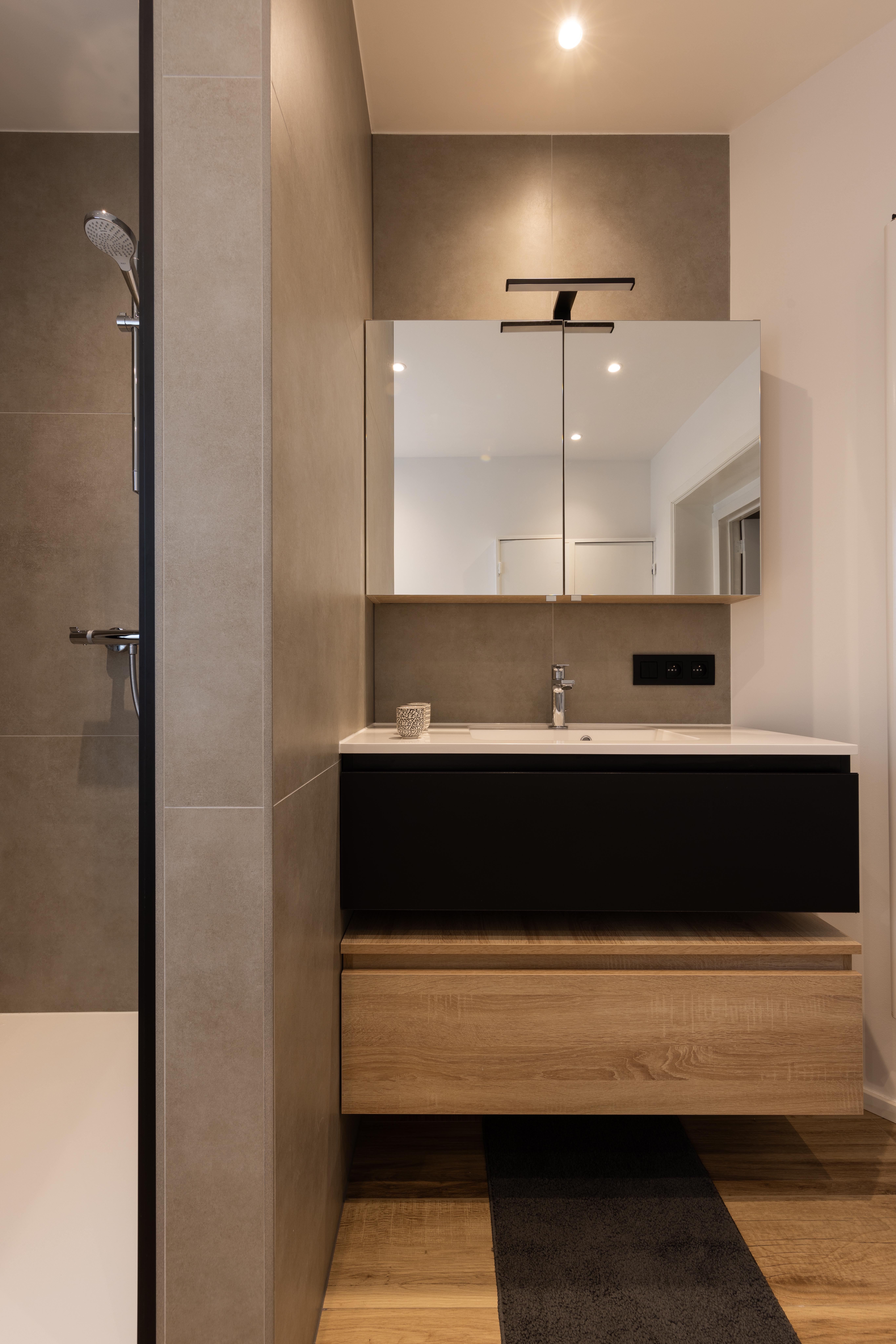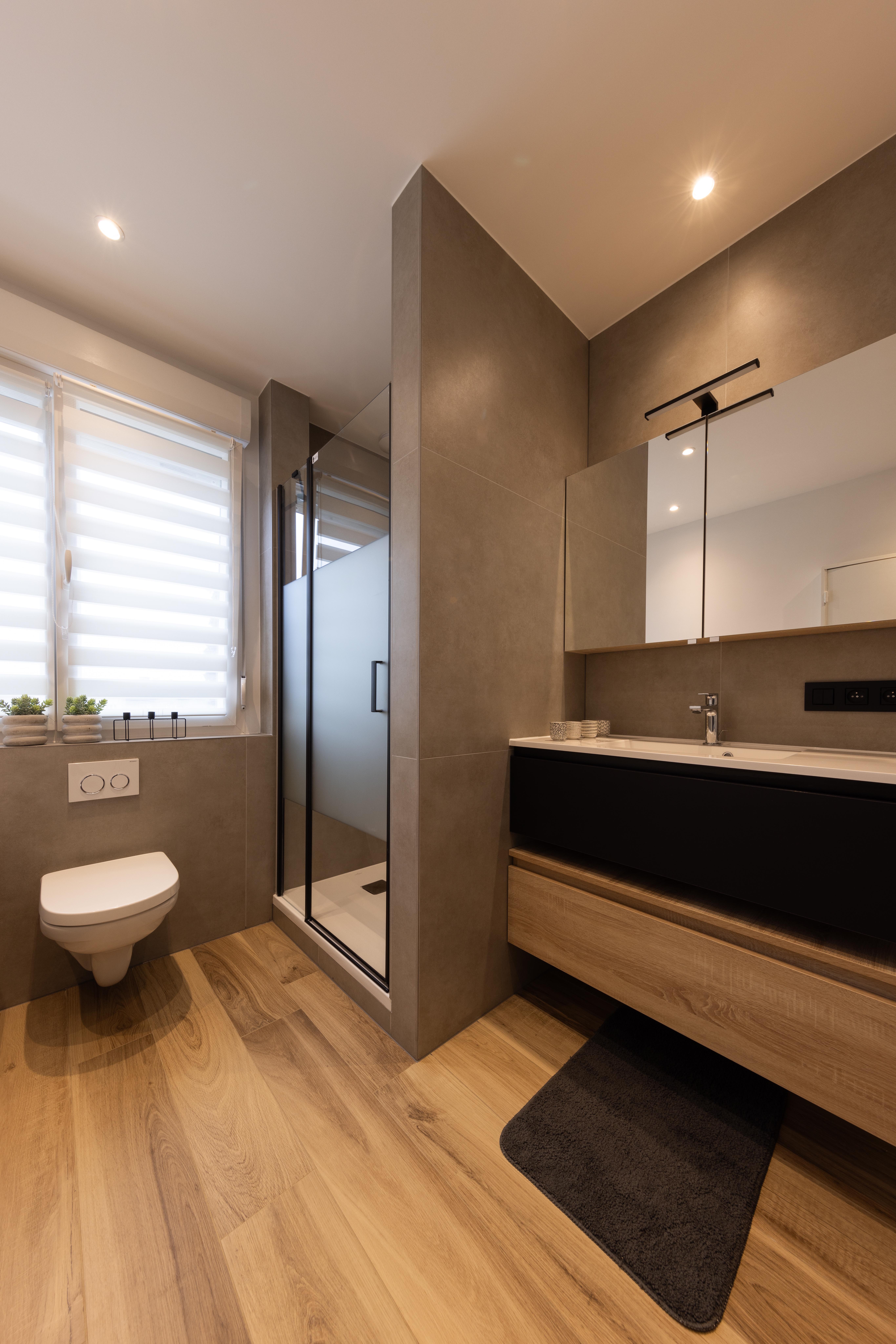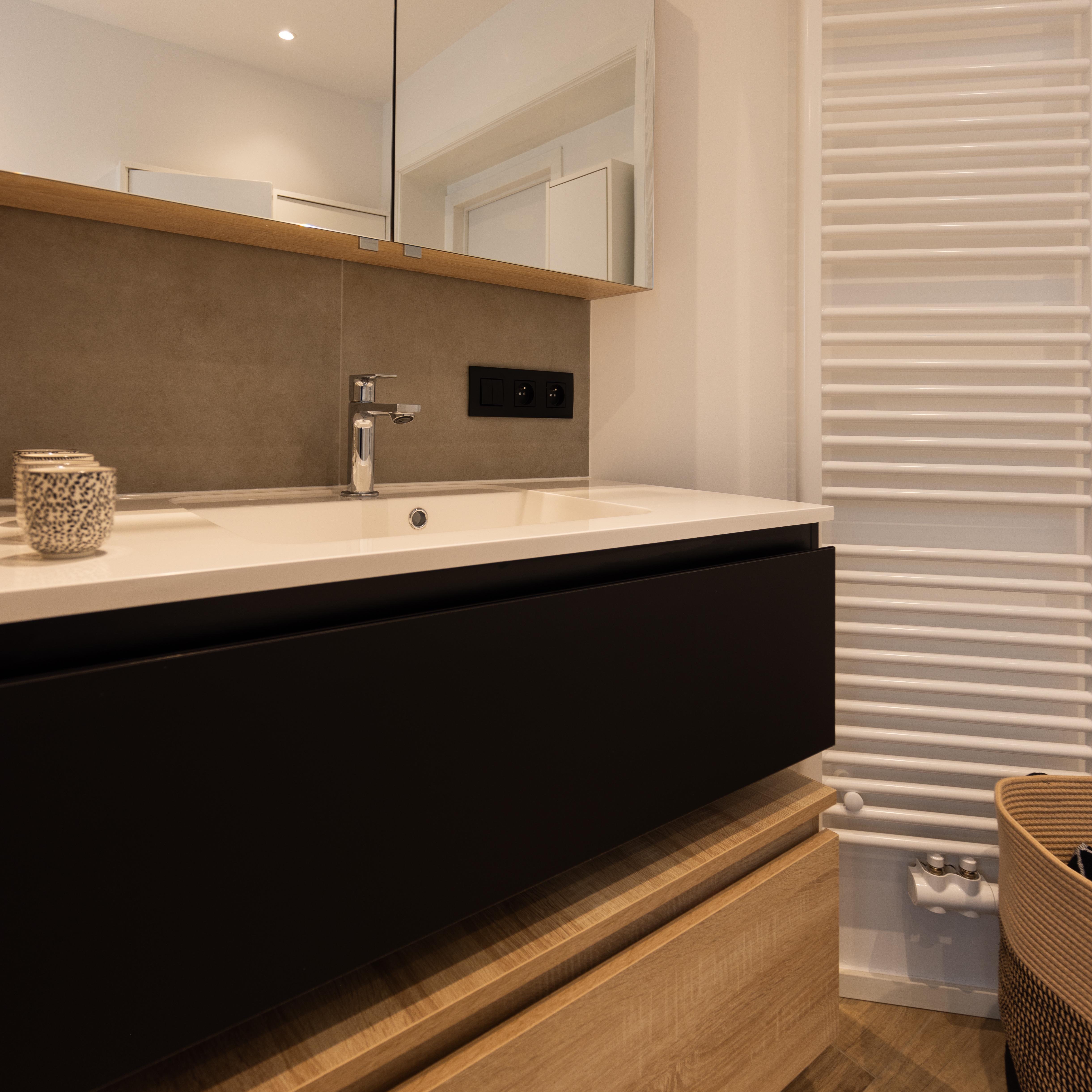 Dans ce projet l'effet du bois vient réchauffé la tonalité noire relativement majoritaire. La combinaison du meuble et de la douche, a permis le placement du wc dans la nouvelle cloison qui a été créée.
