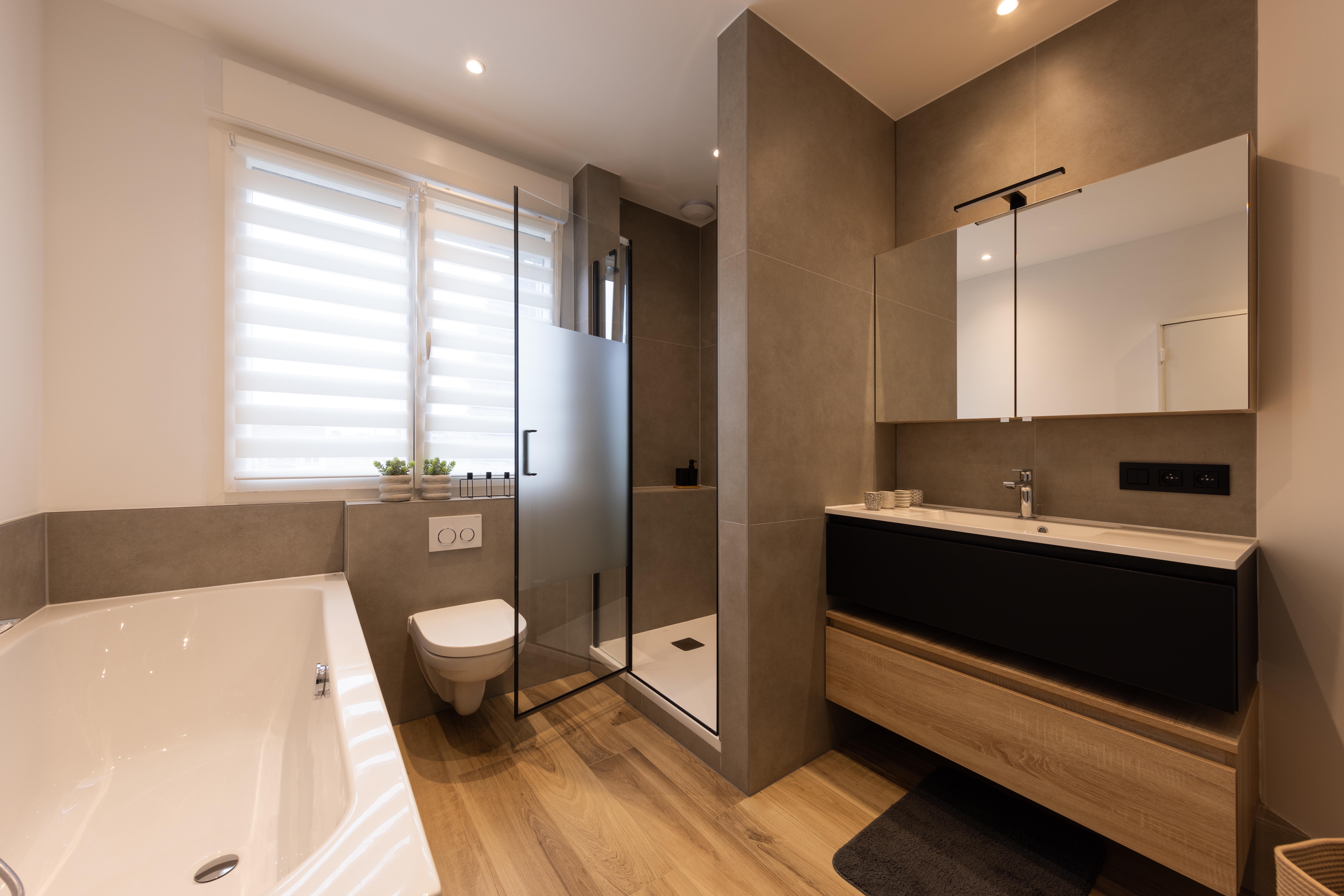 Salle de bain spacieuse et chaleureuse avec une belle touche de modernité dû à l'association de l'effet bois et du carrelage ultra moderne au coloris foncé. Selon la déco, cette salle de bains vous paraîtra champêtre ou industrielle chic.