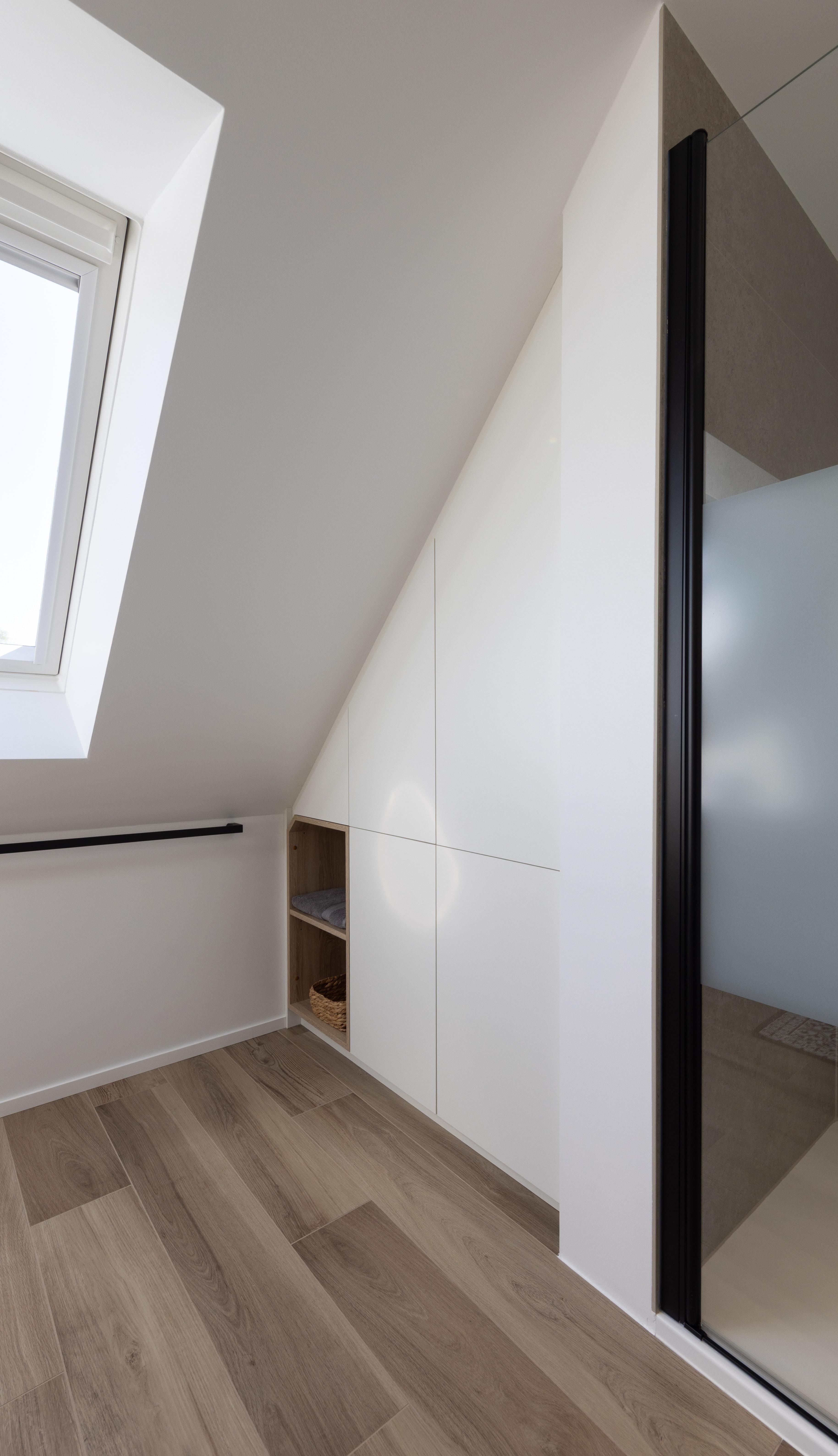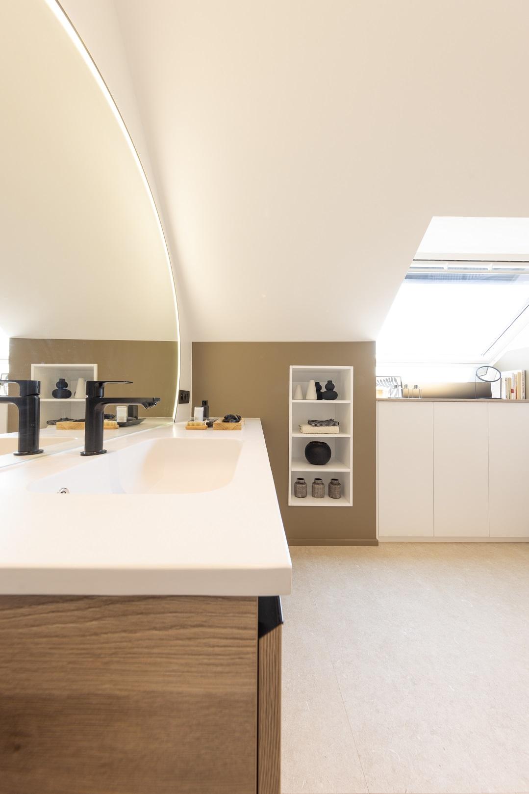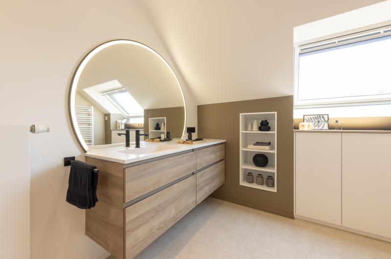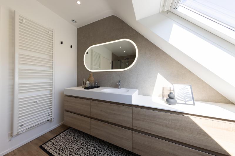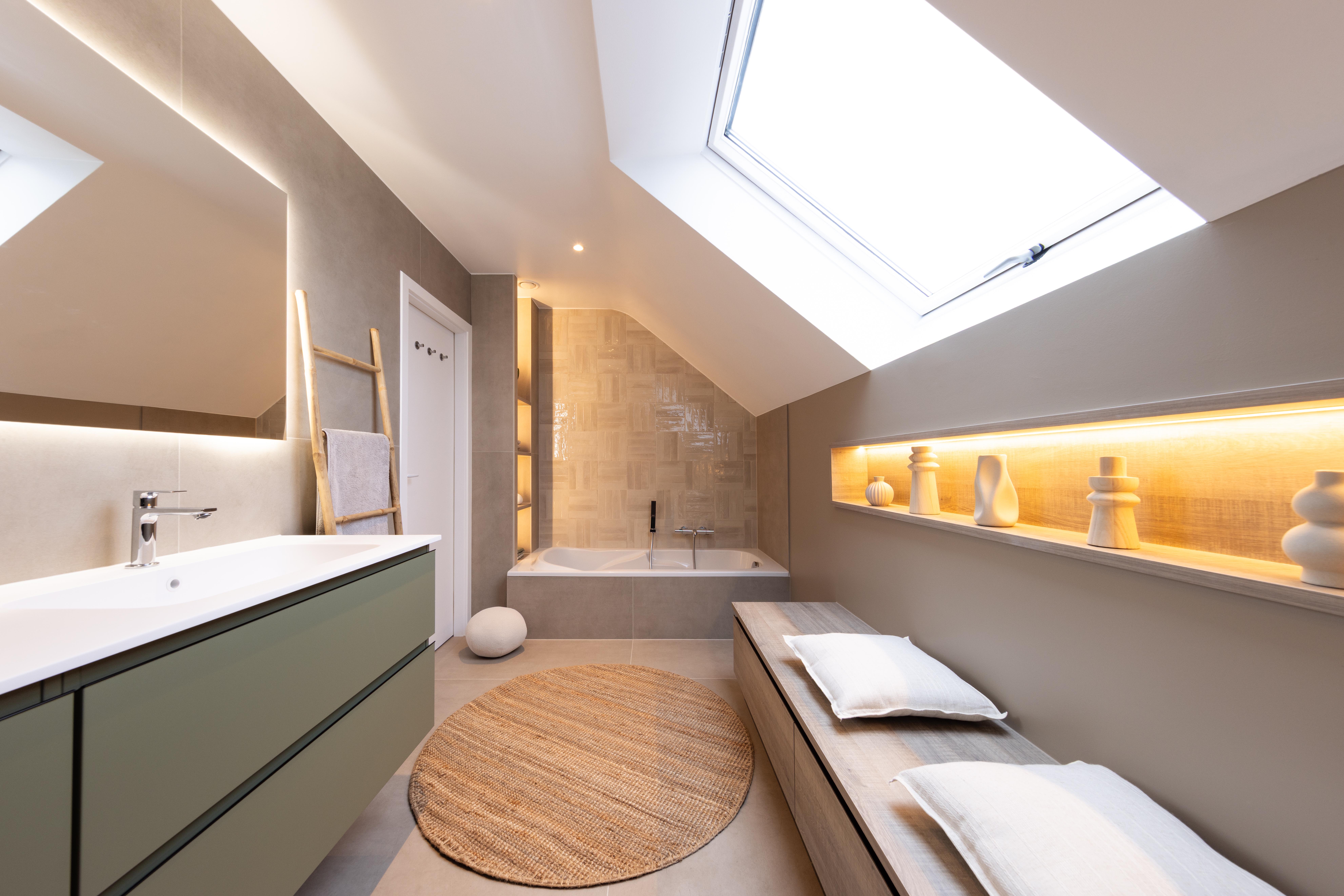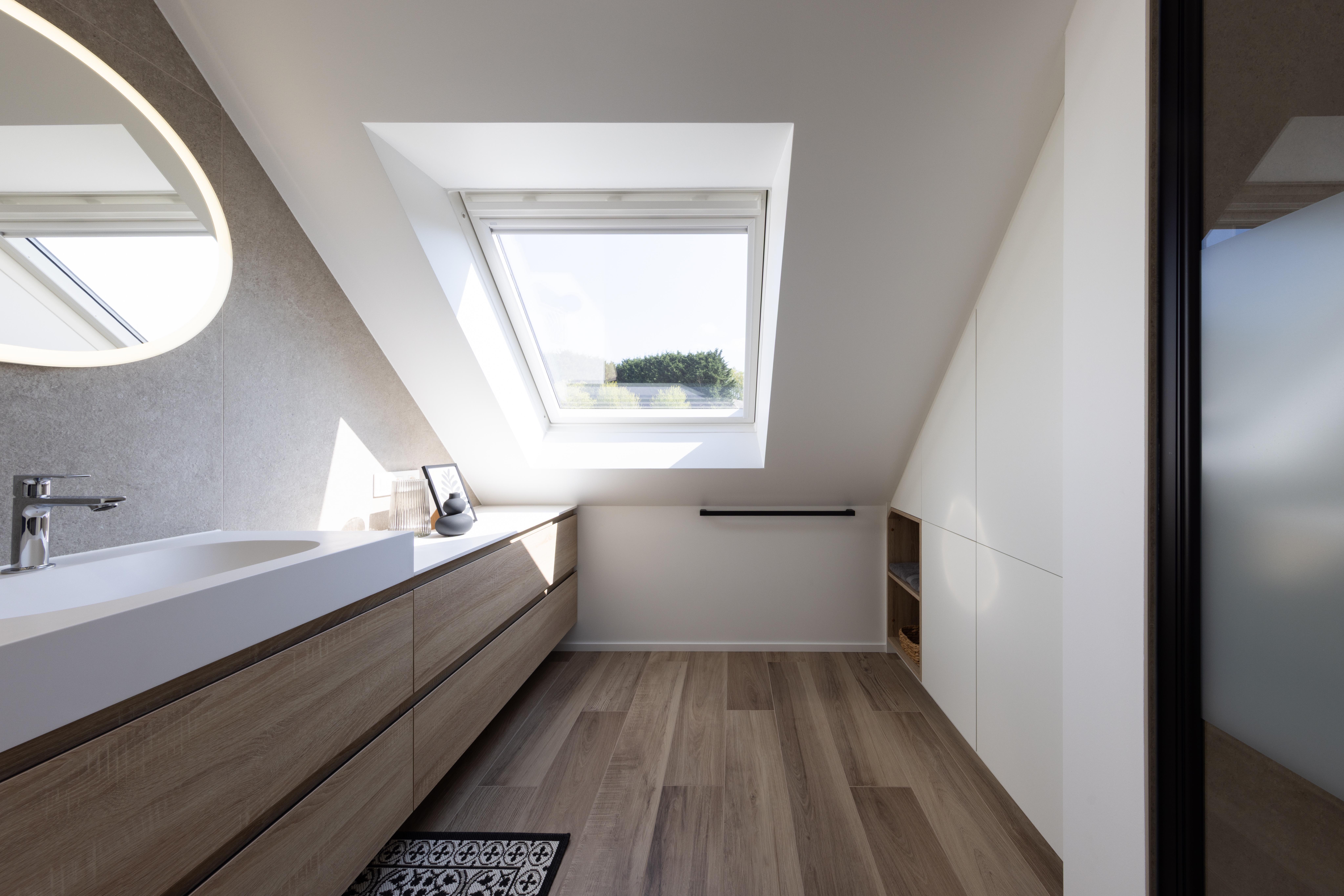Salle de bains aux lignes épurées, qui reçoit une superbe lumière naturelle depuis la fenêtre de toit. Des rangements intégrés sur mesure, épousant la pente du toit, pour allier fonctionnalité et discrétion. Le tout dans une palette douce de bois clair et d'un ton sable minéral, pour une ambiance à la fois chaleureuse et...