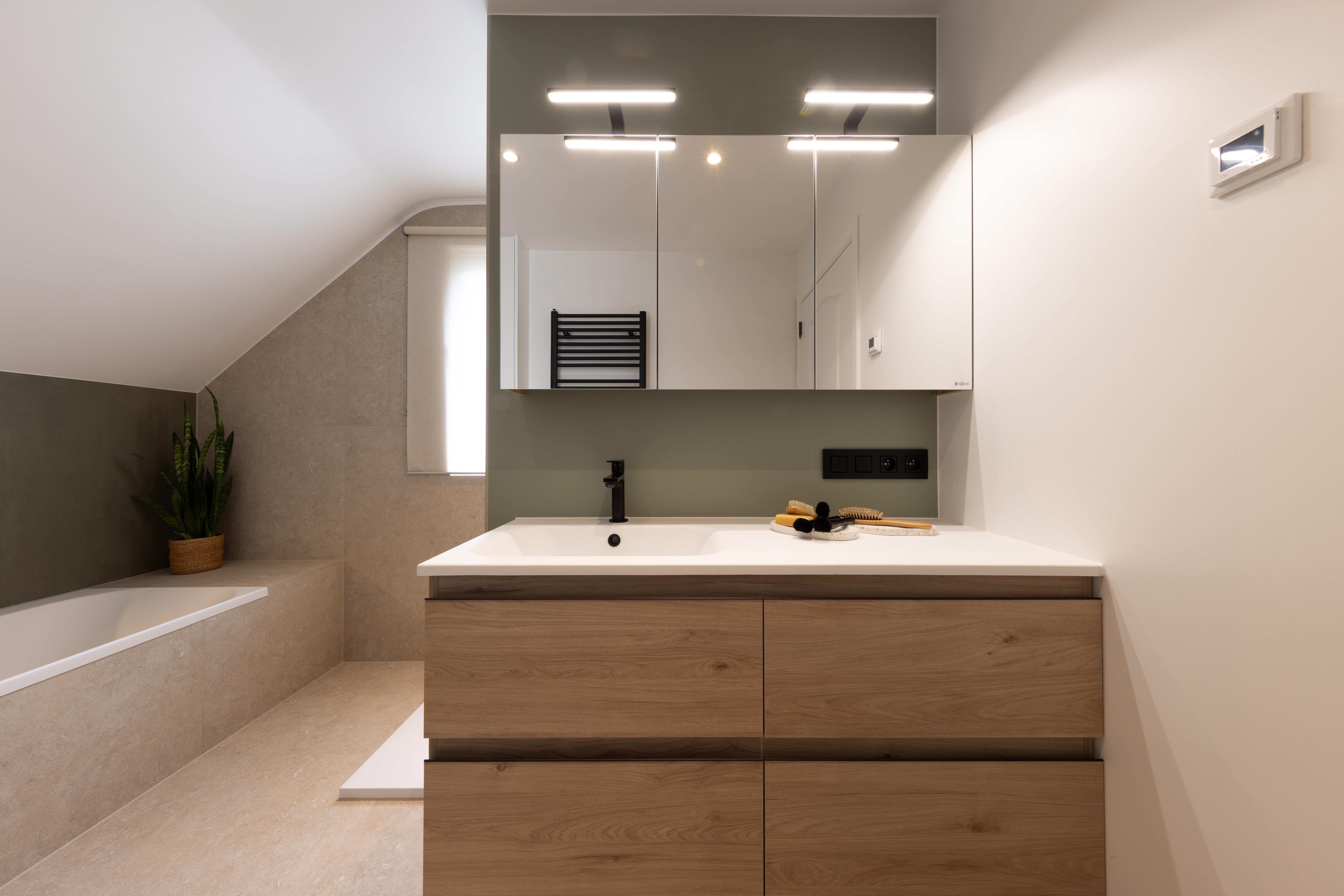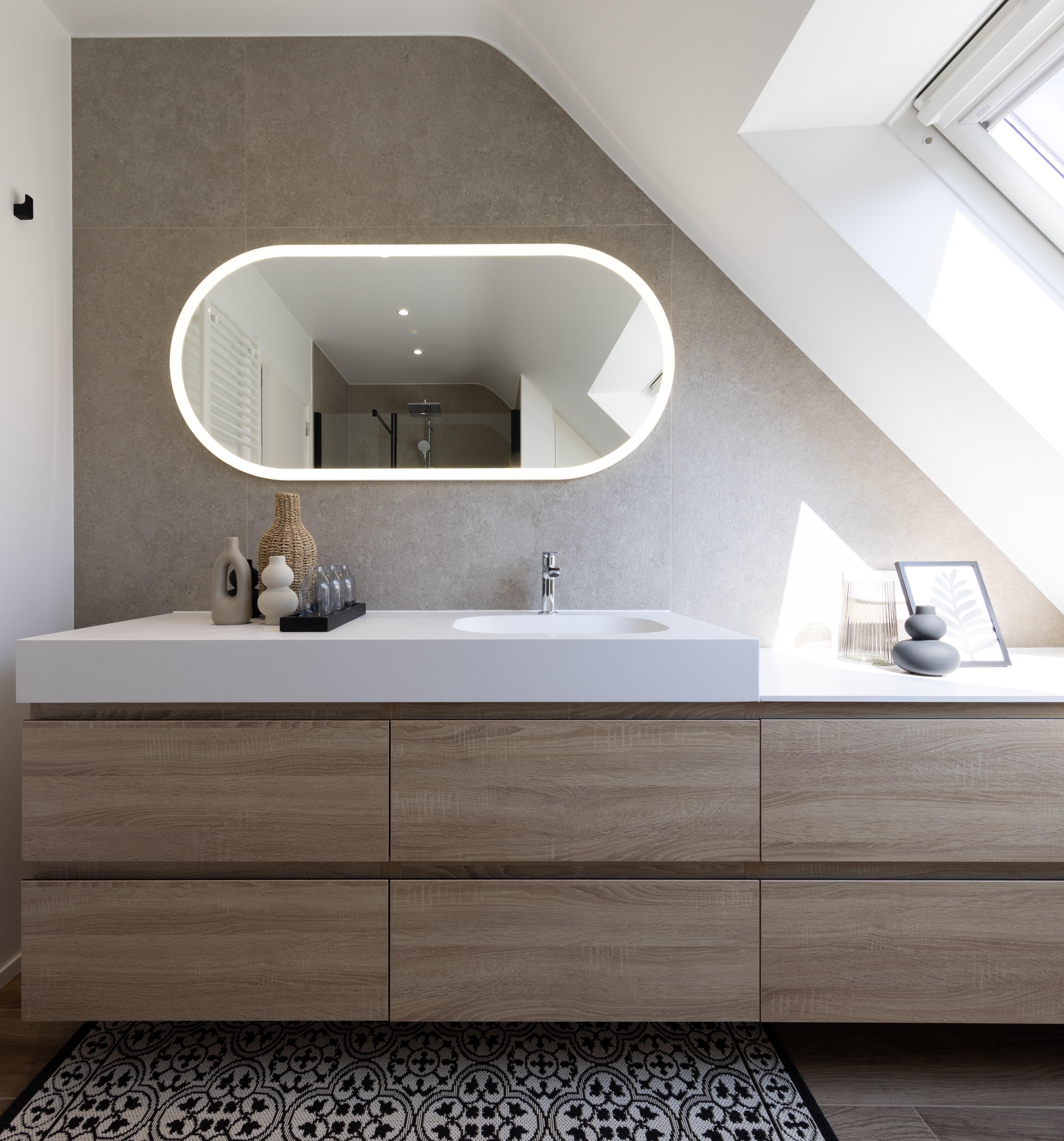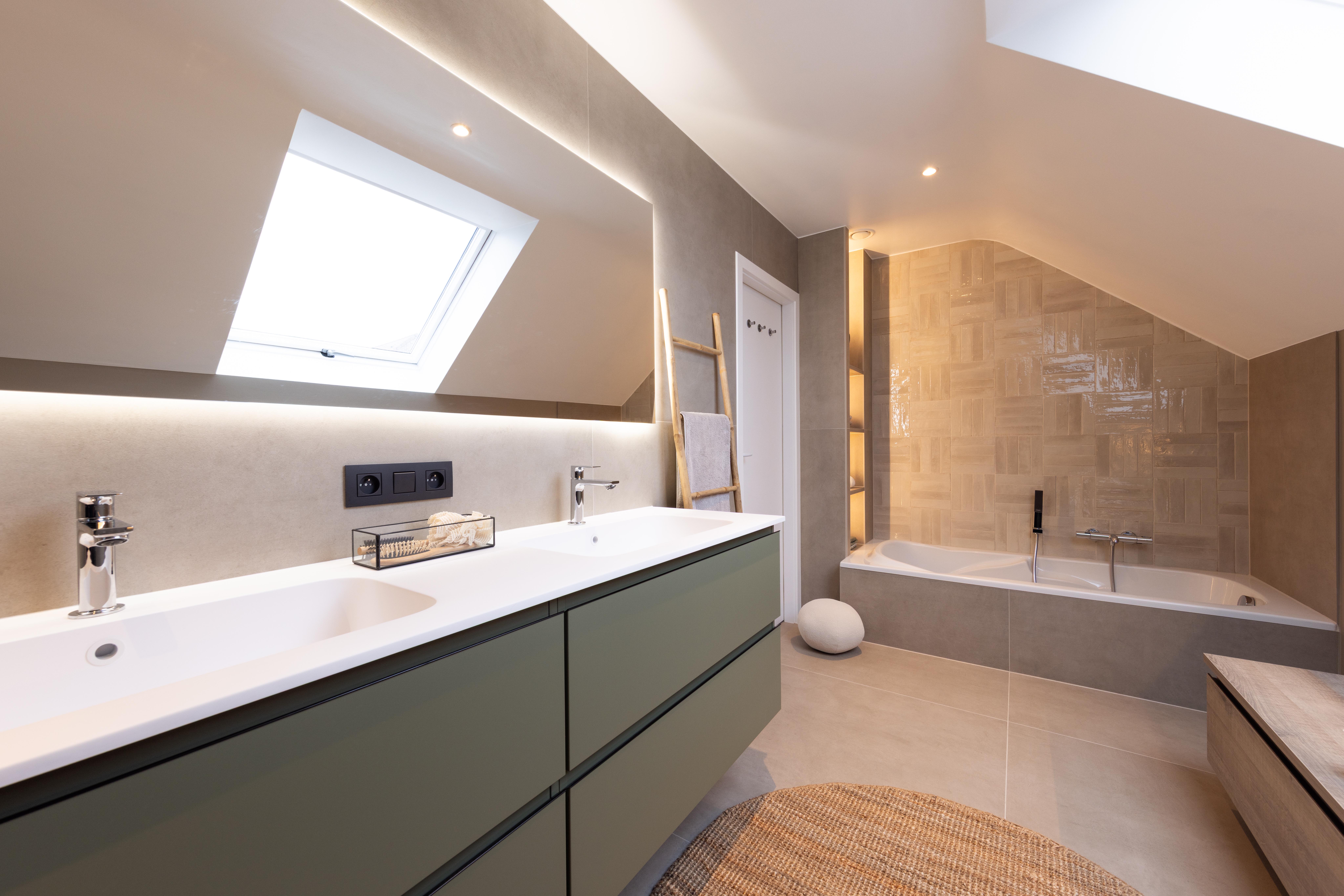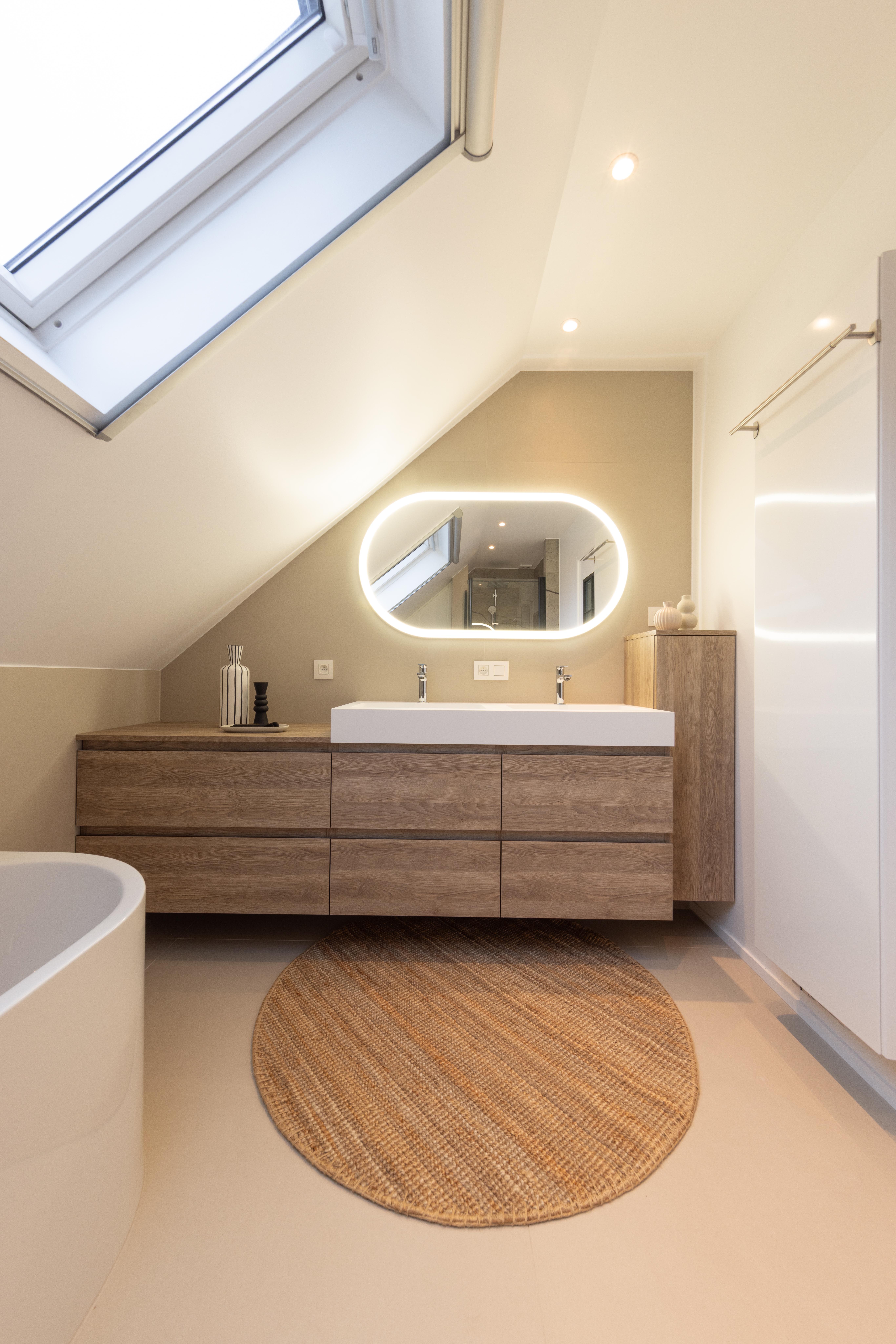 Salle de bains aux lignes épurées, qui reçoit une superbe lumière naturelle depuis la fenêtre de toit. Des rangements intégrés sur mesure, épousant la pente du toit, pour allier fonctionnalité et discrétion. Le tout dans une palette douce de bois clair et d'un ton sable minéral, pour une ambiance à la fois chaleureuse et...