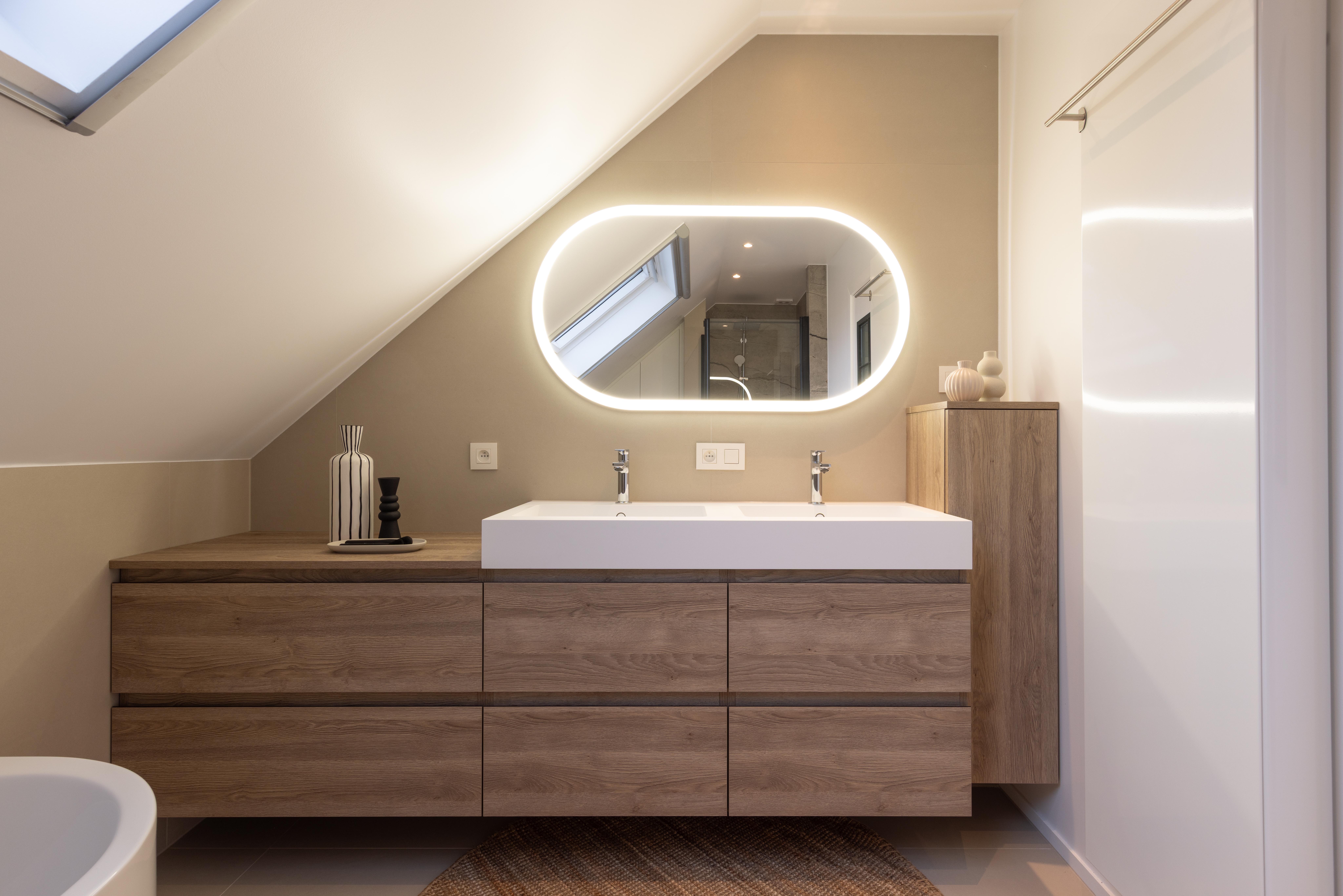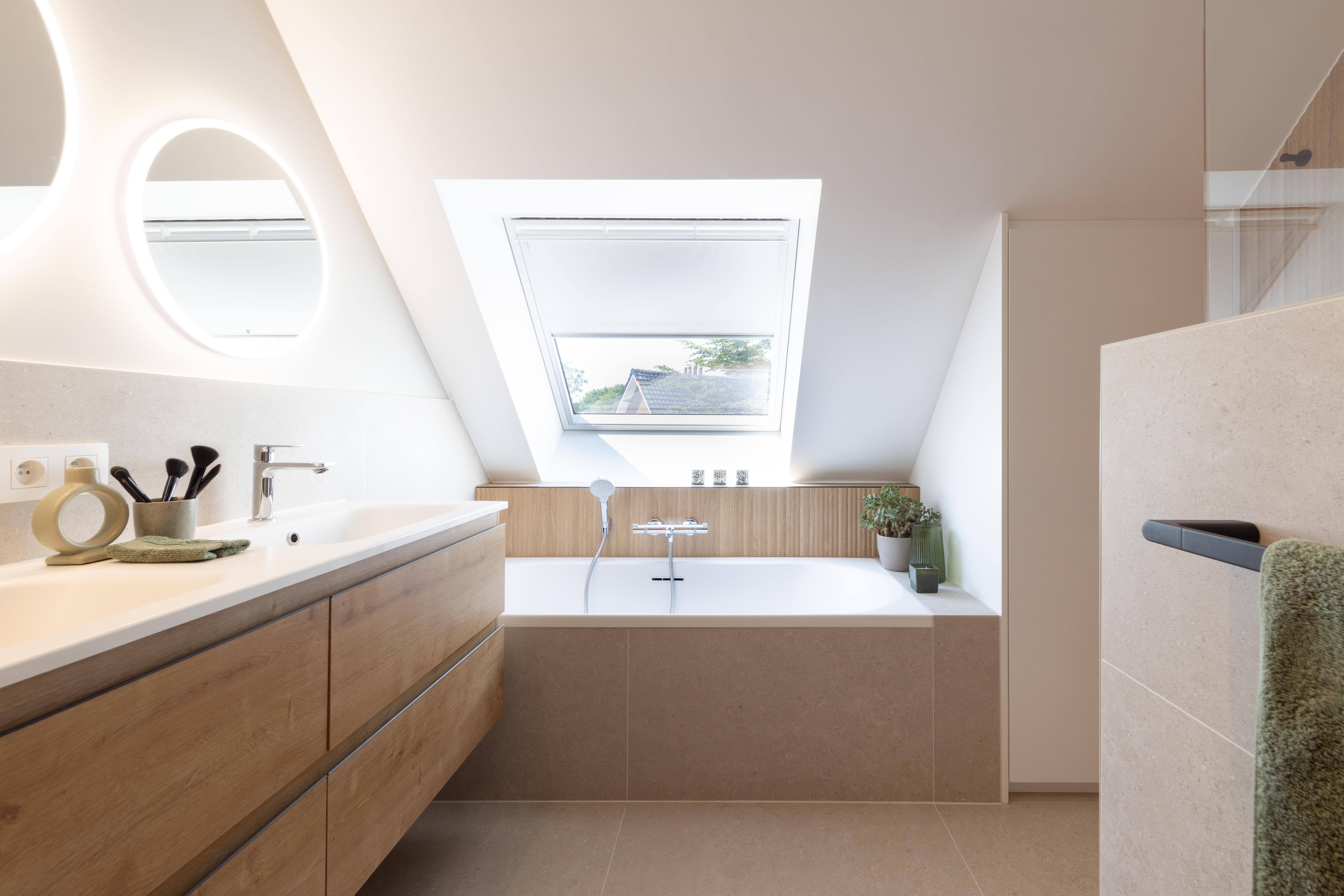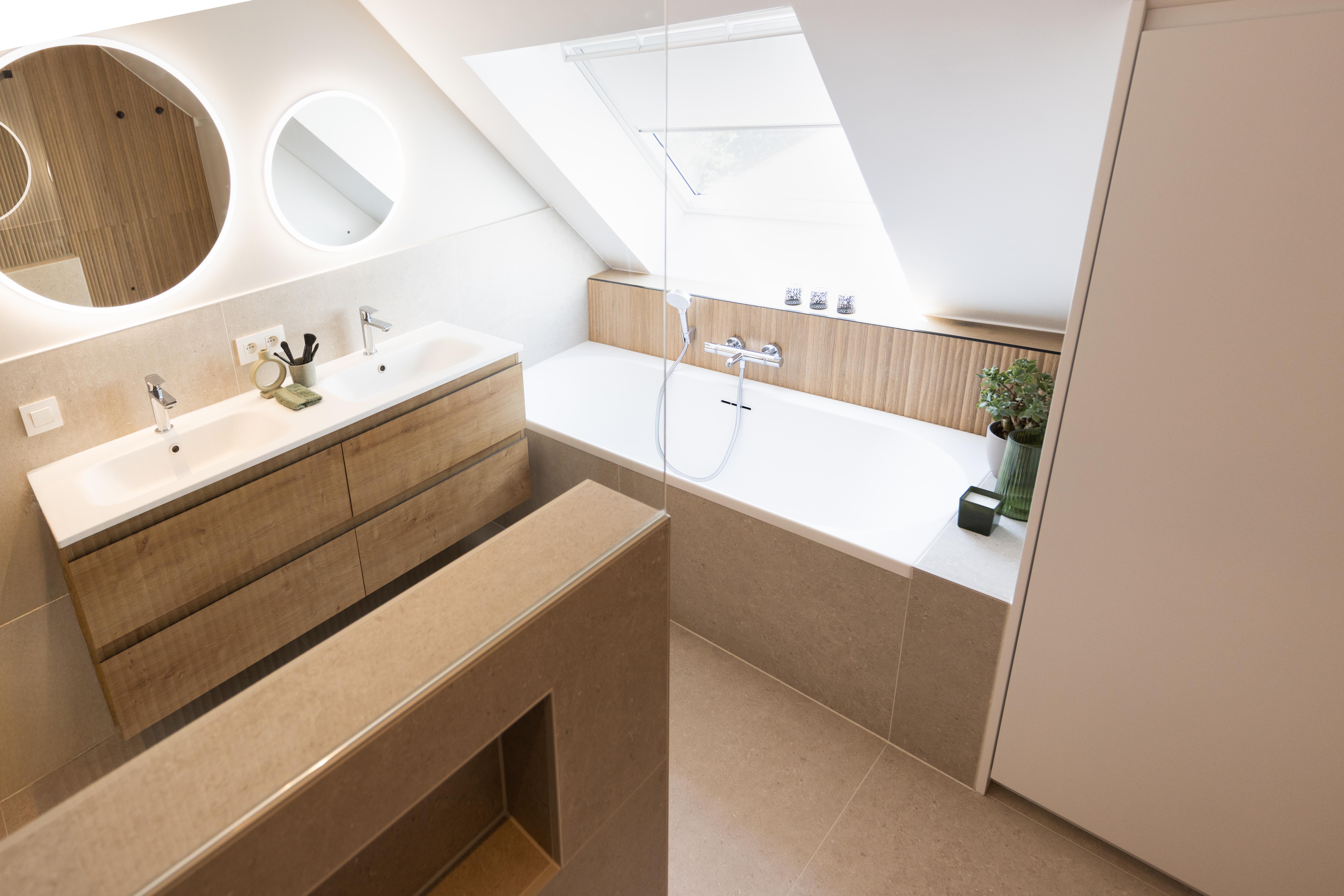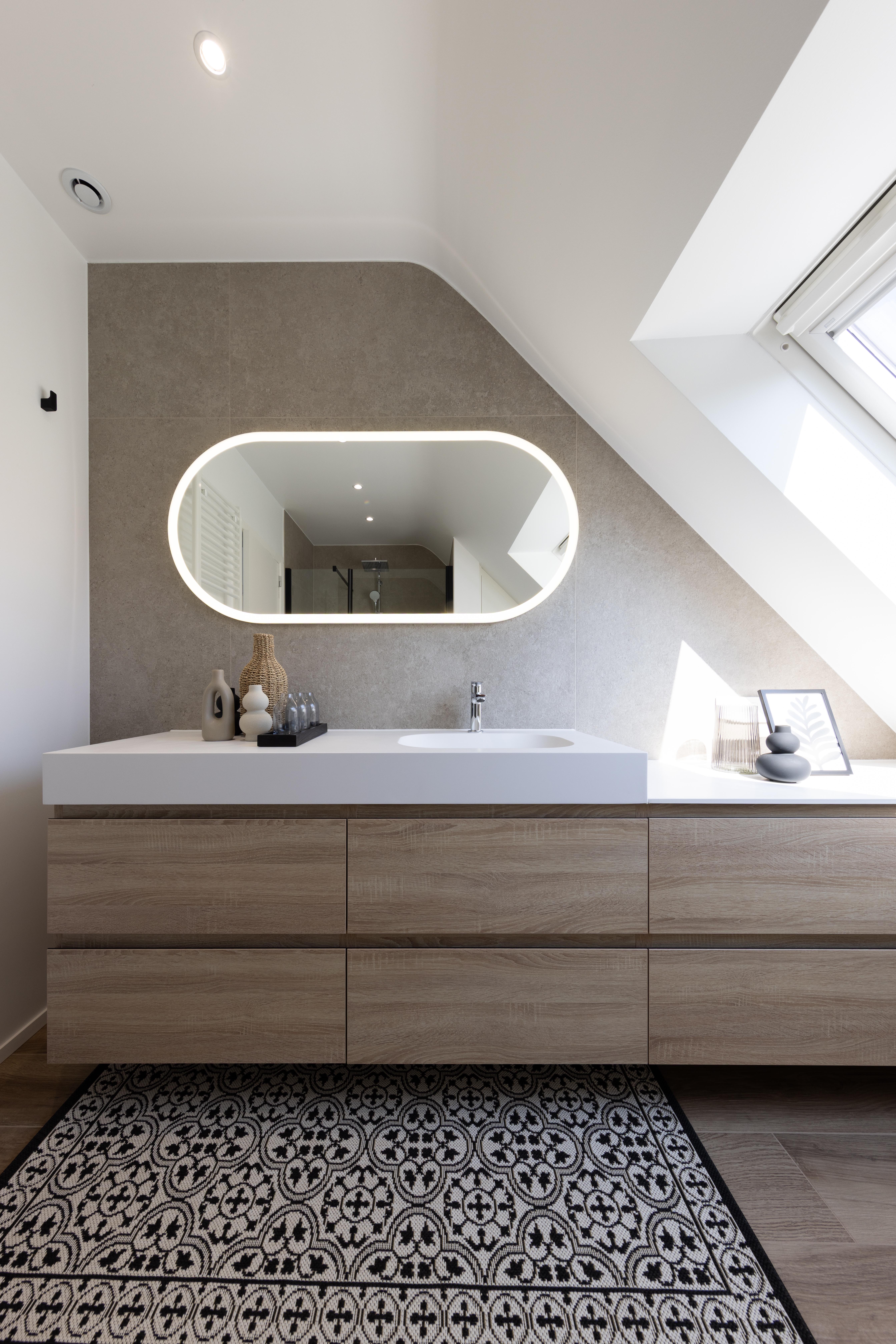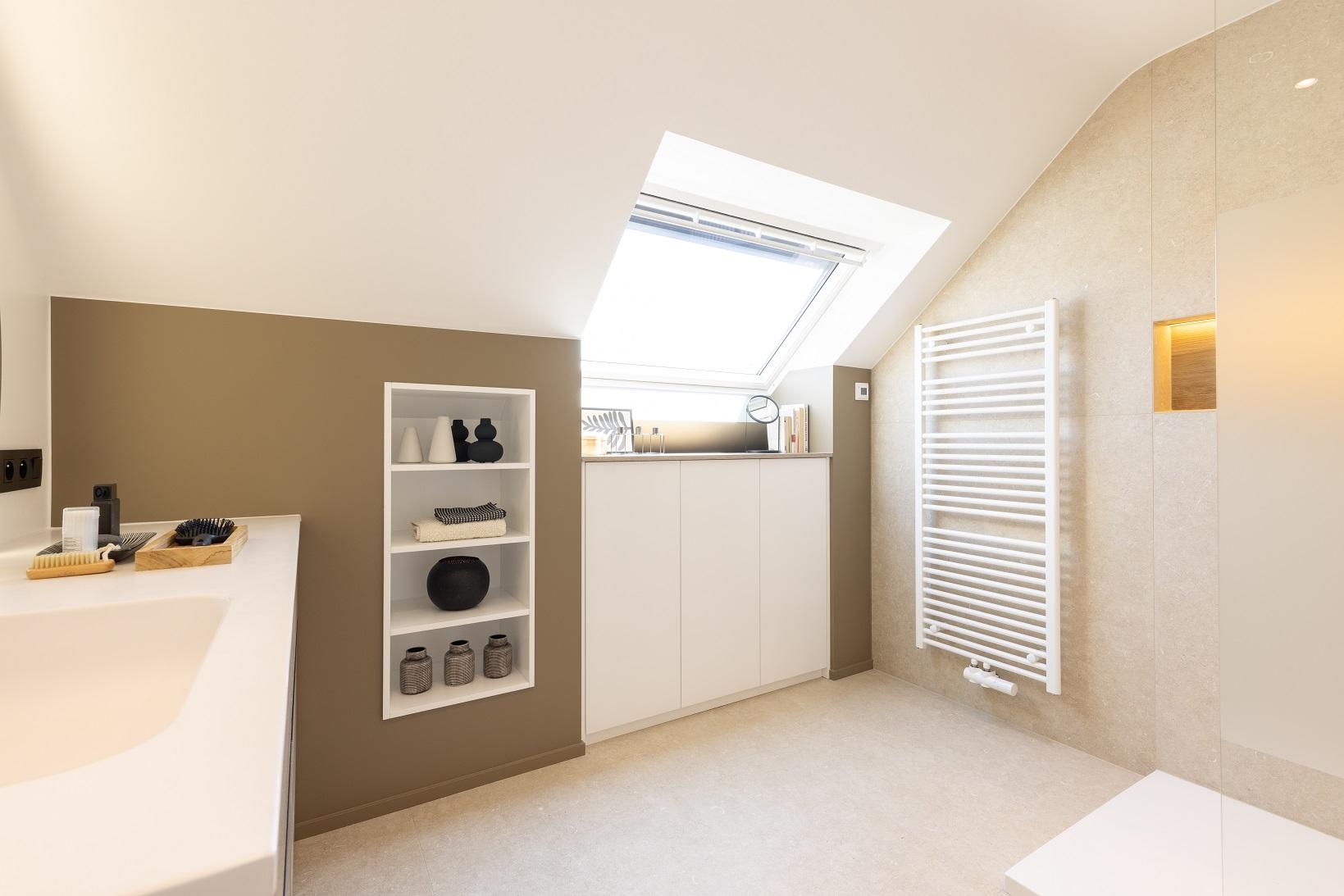 Salle de bains aux lignes épurées, qui reçoit une superbe lumière naturelle depuis la fenêtre de toit. Des rangements intégrés sur mesure, épousant la pente du toit, pour allier fonctionnalité et discrétion. Le tout dans une palette douce de bois clair et d'un ton sable minéral, pour une ambiance à la fois chaleureuse et...