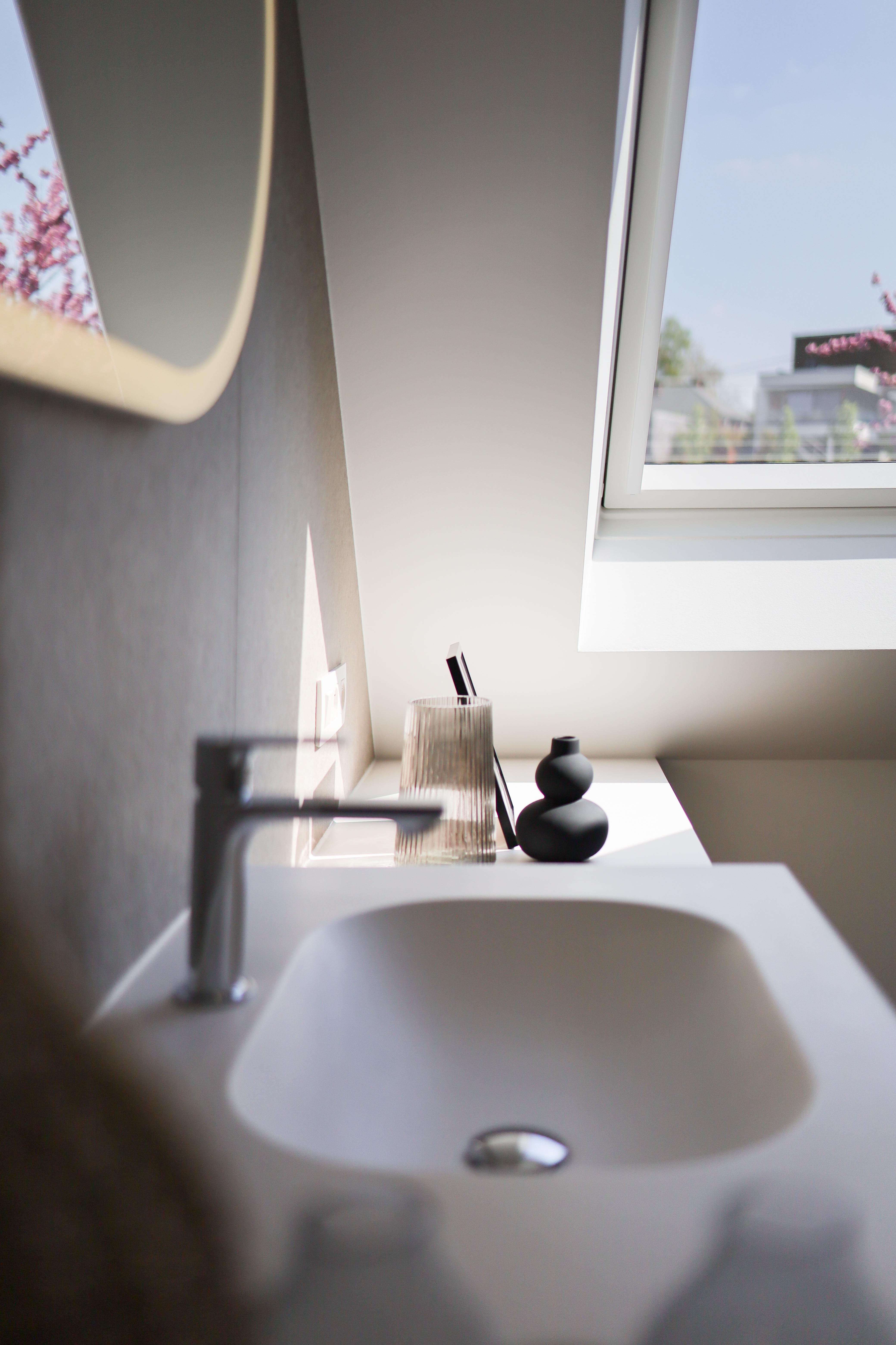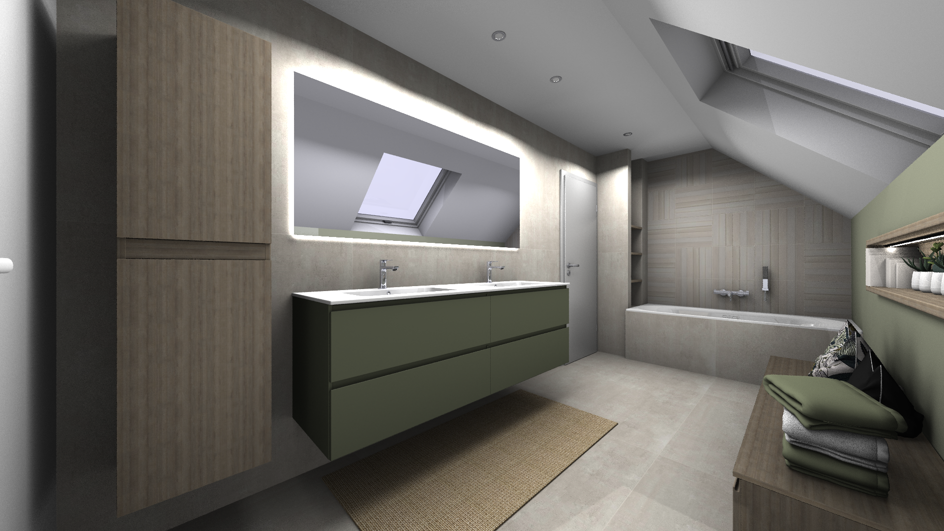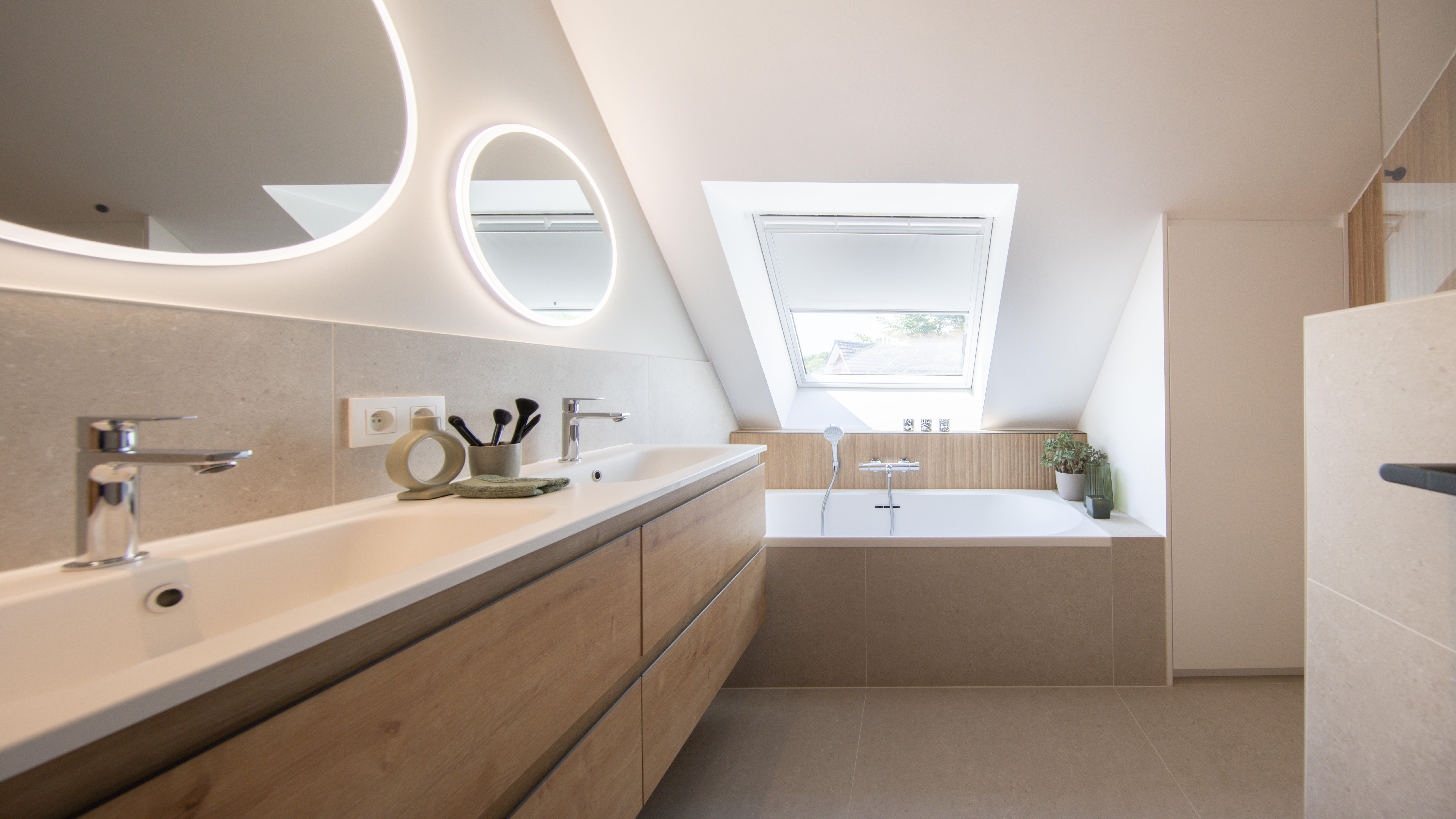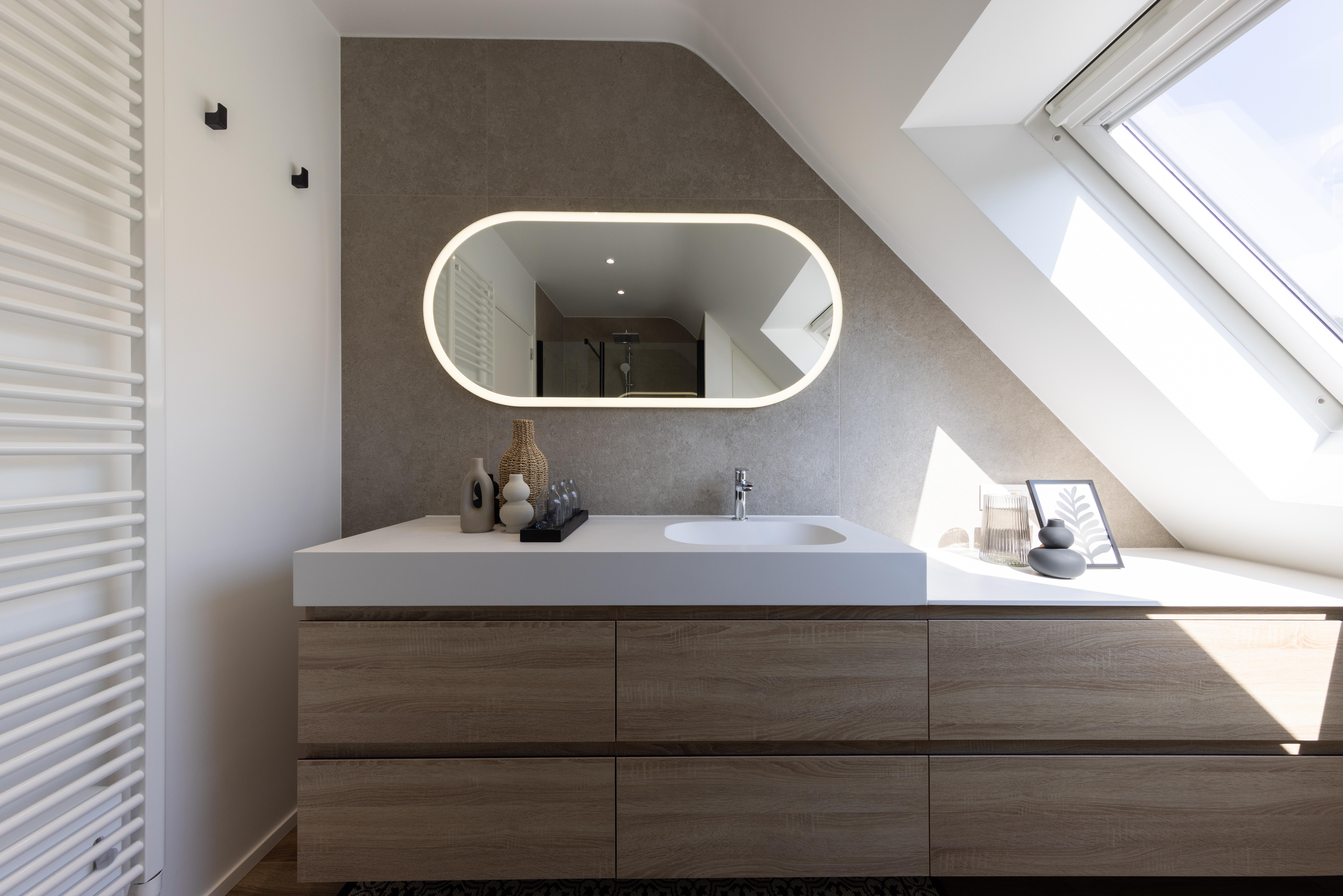 Salle de bains aux lignes épurées, qui reçoit une superbe lumière naturelle depuis la fenêtre de toit. Des rangements intégrés sur mesure, épousant la pente du toit, pour allier fonctionnalité et discrétion. Le tout dans une palette douce de bois clair et d'un ton sable minéral, pour une ambiance à la fois chaleureuse et...