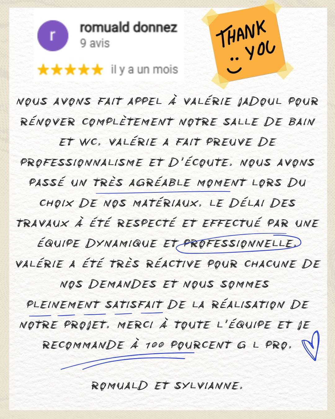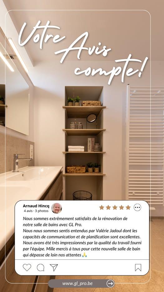 Tous nos projets de transformation et de rénovation de salle de bain sont menés à bien grâce au professionnalisme et au savoir-faire de notre équipe coordonnée par Valérie Jadoul. De la conception des plans au choix des décorations, nous nous occupons de tout ! En confiant votre projet de salle de bain à GL Pro, vous êtes certain d’avoir une salle de bain clé sur porte unique et qui répond à toutes vos attentes.