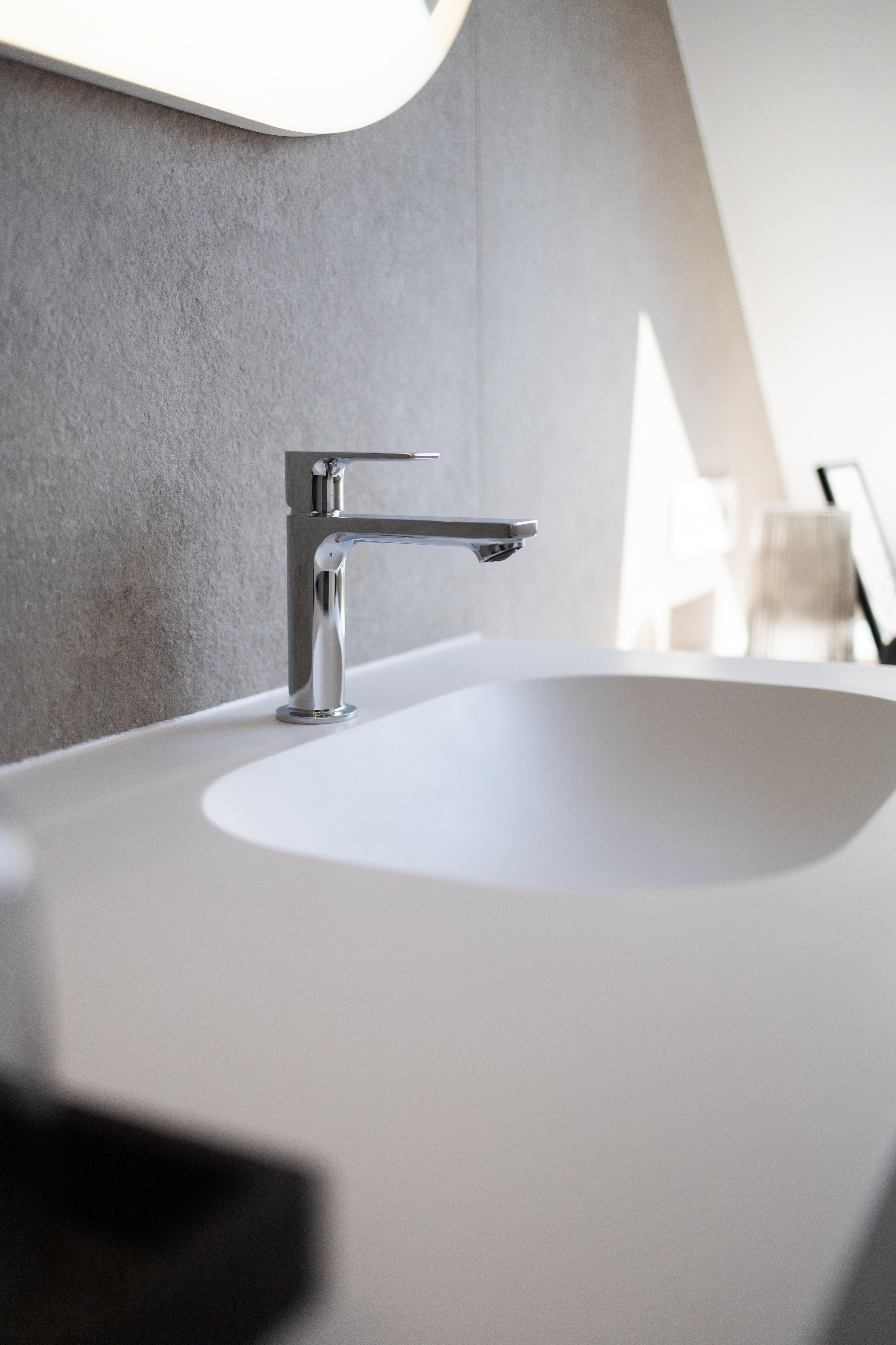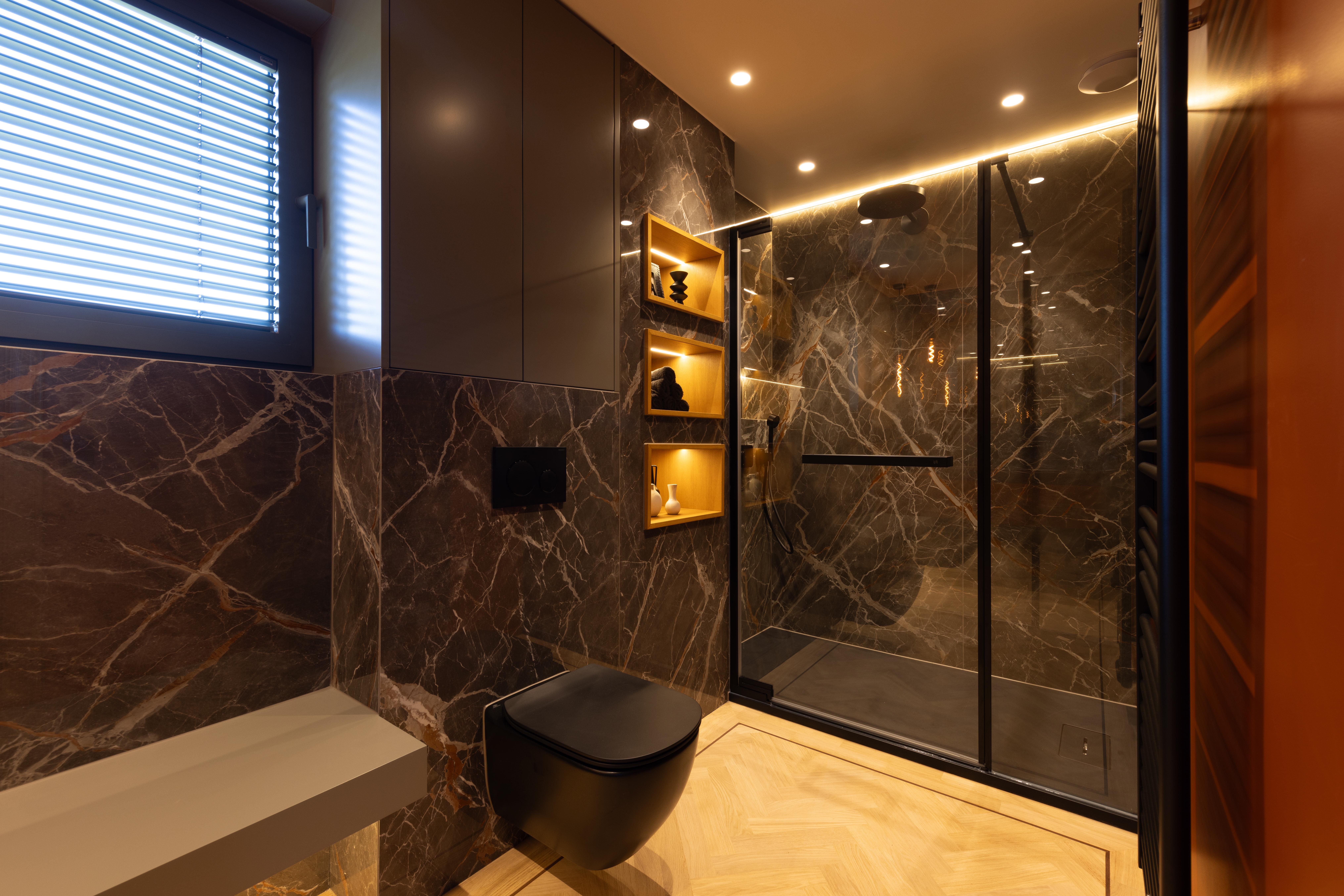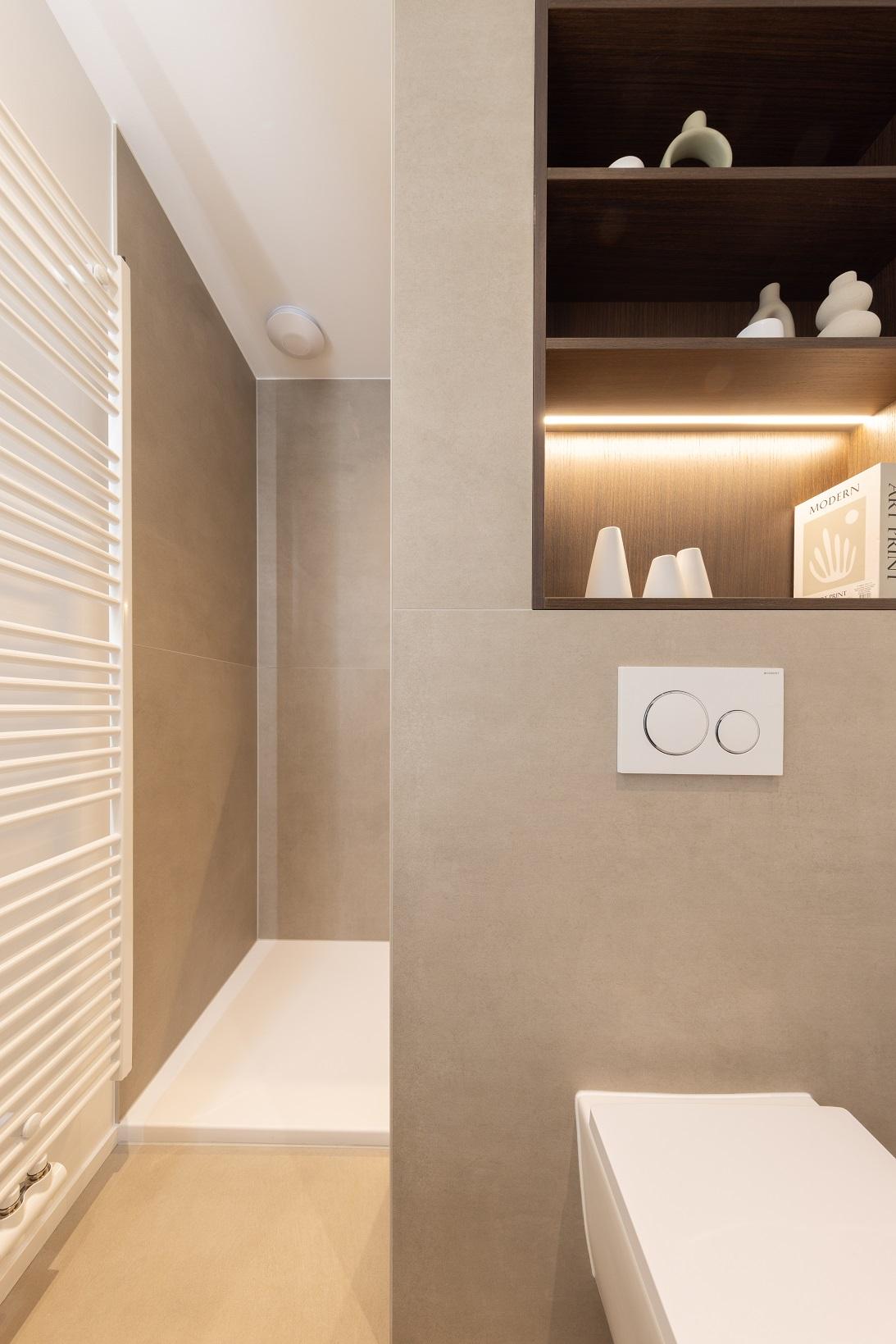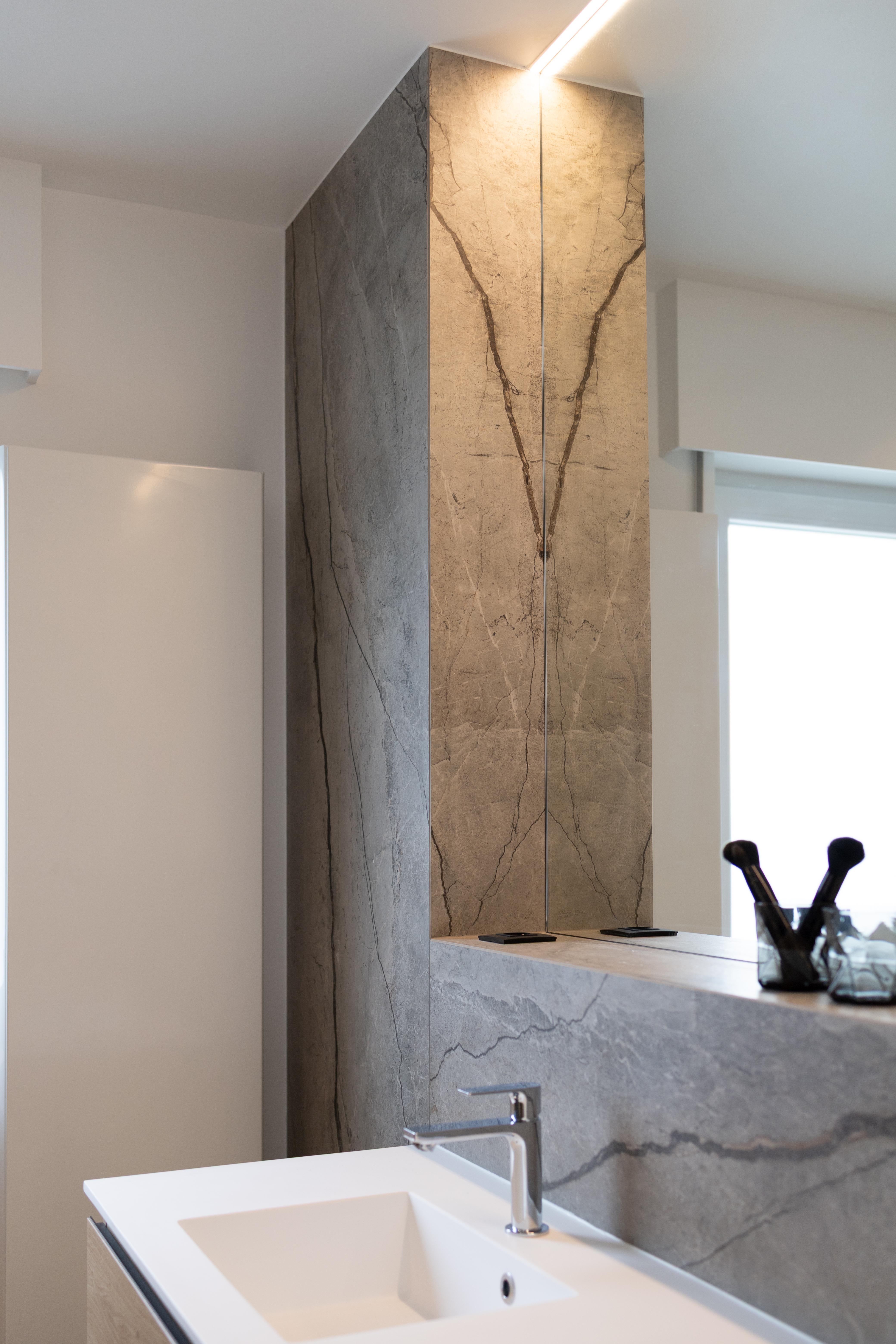 Dans ce projet, la forme géométrique de la paroi de douche et des différents caissons, utiles pour la dépose des produits douche, pour dissimuler l'aspect technique du wc et le passage des décharges, à permis de mettre en valeur cette salle de douche et de mettre à parts égales l’équilibre fonctionnel et l’impact visuel.