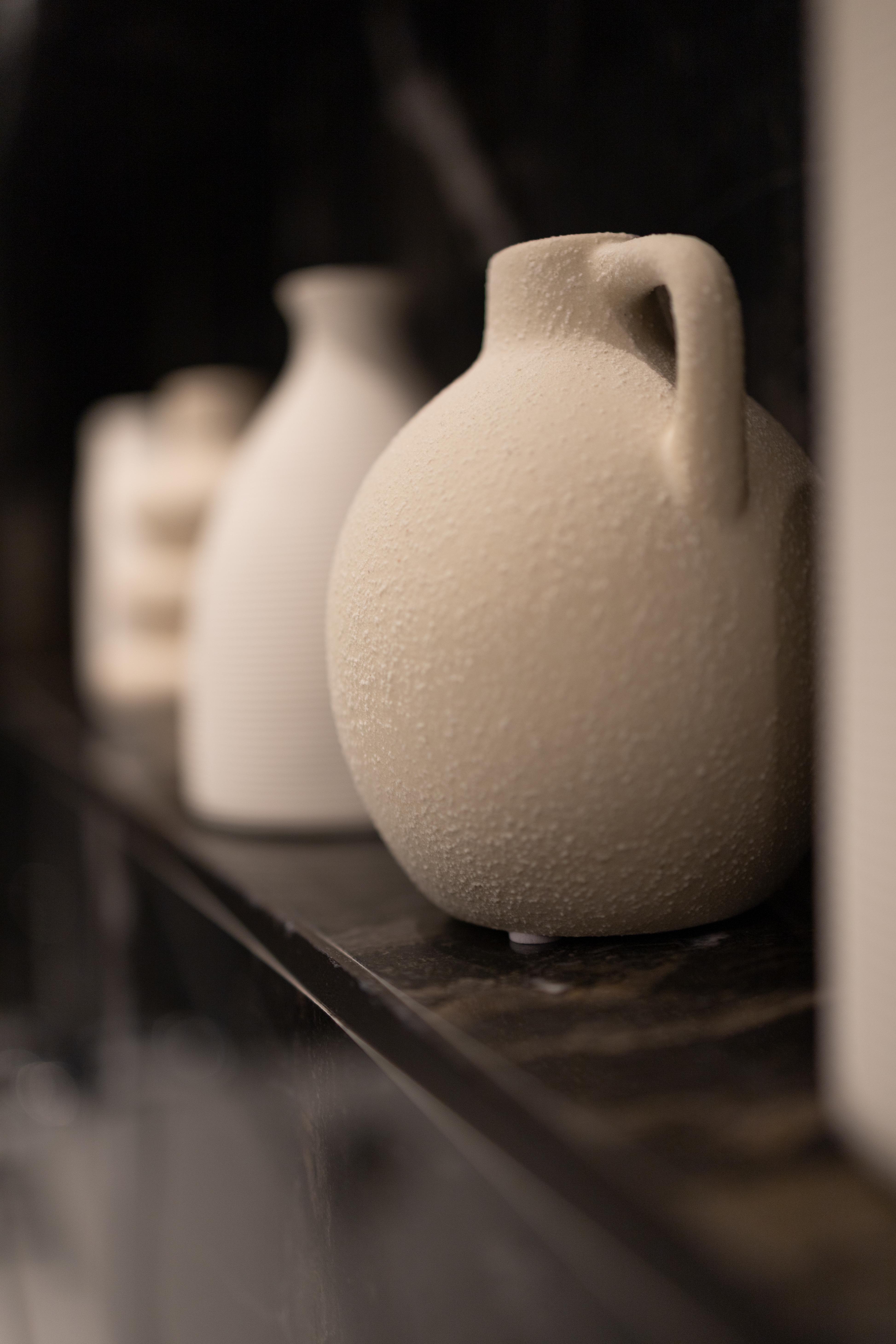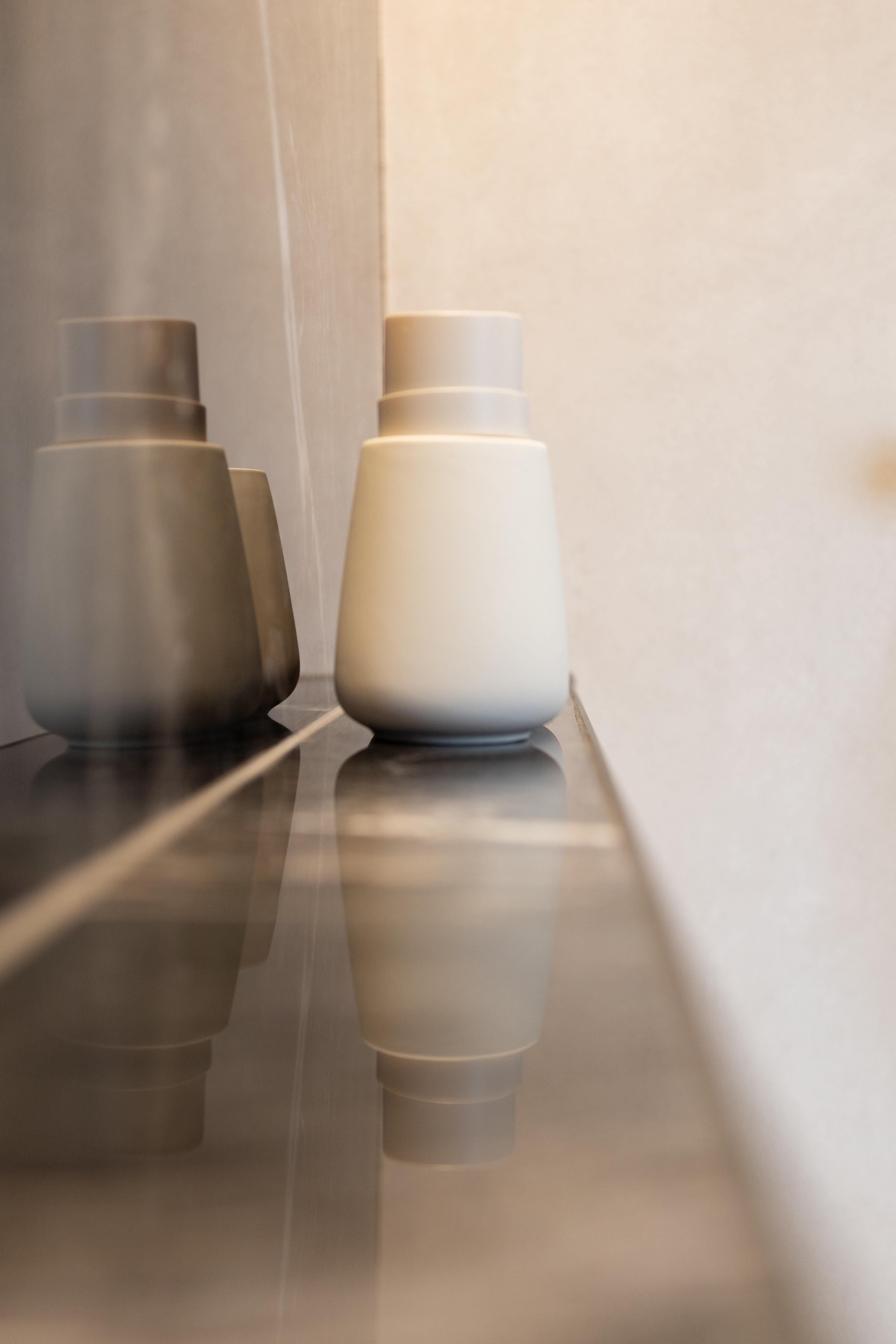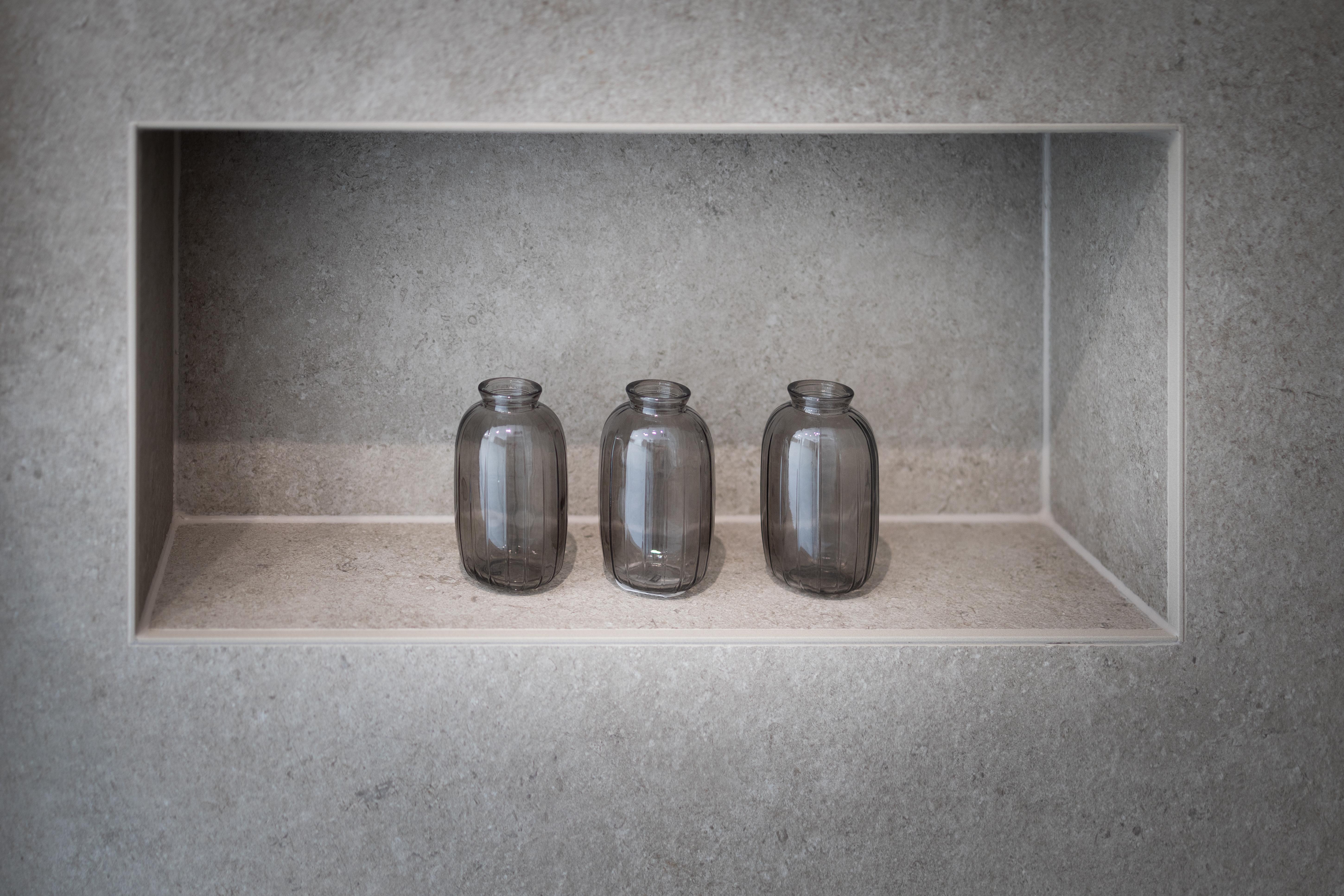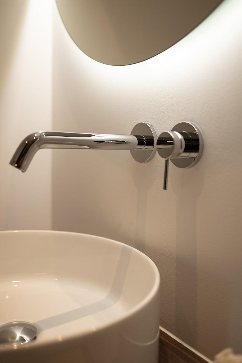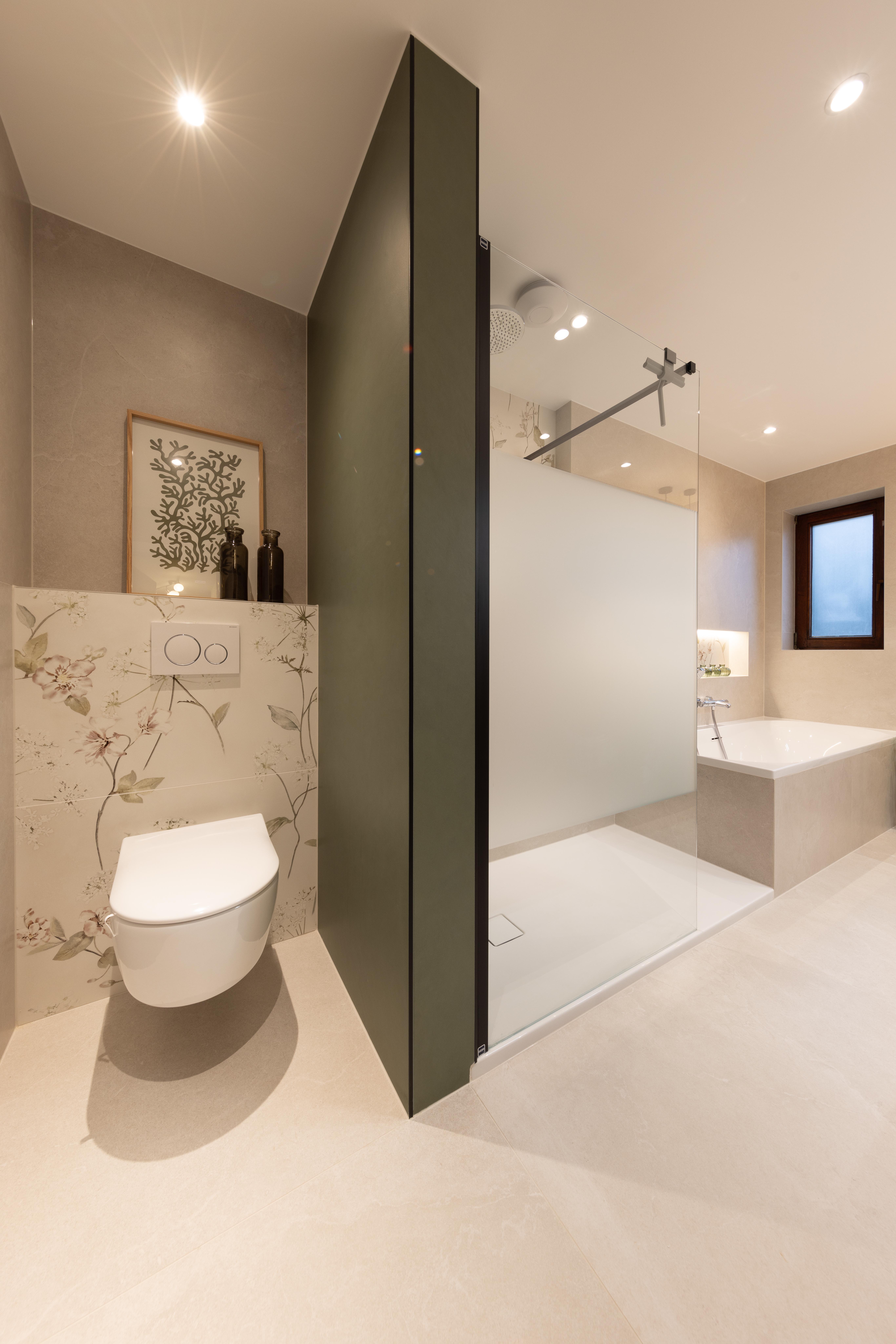 Dans ce projet, la forme géométrique de la paroi de douche et des différents caissons, utiles pour la dépose des produits douche, pour dissimuler l'aspect technique du wc et le passage des décharges, à permis de mettre en valeur cette salle de douche et de mettre à parts égales l’équilibre fonctionnel et l’impact visuel.