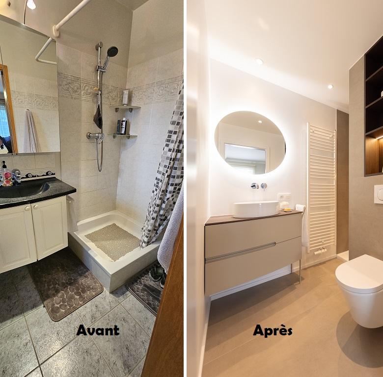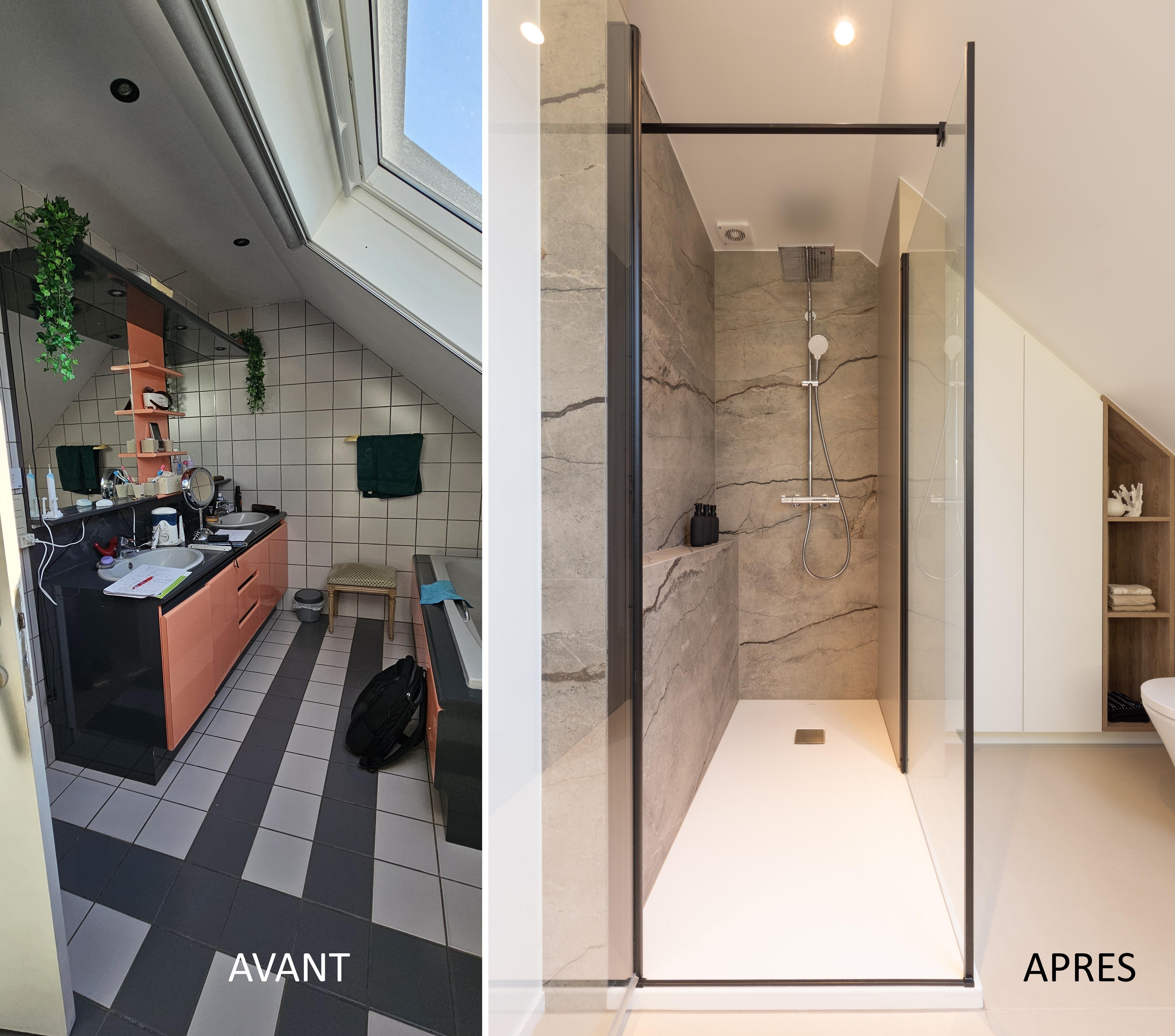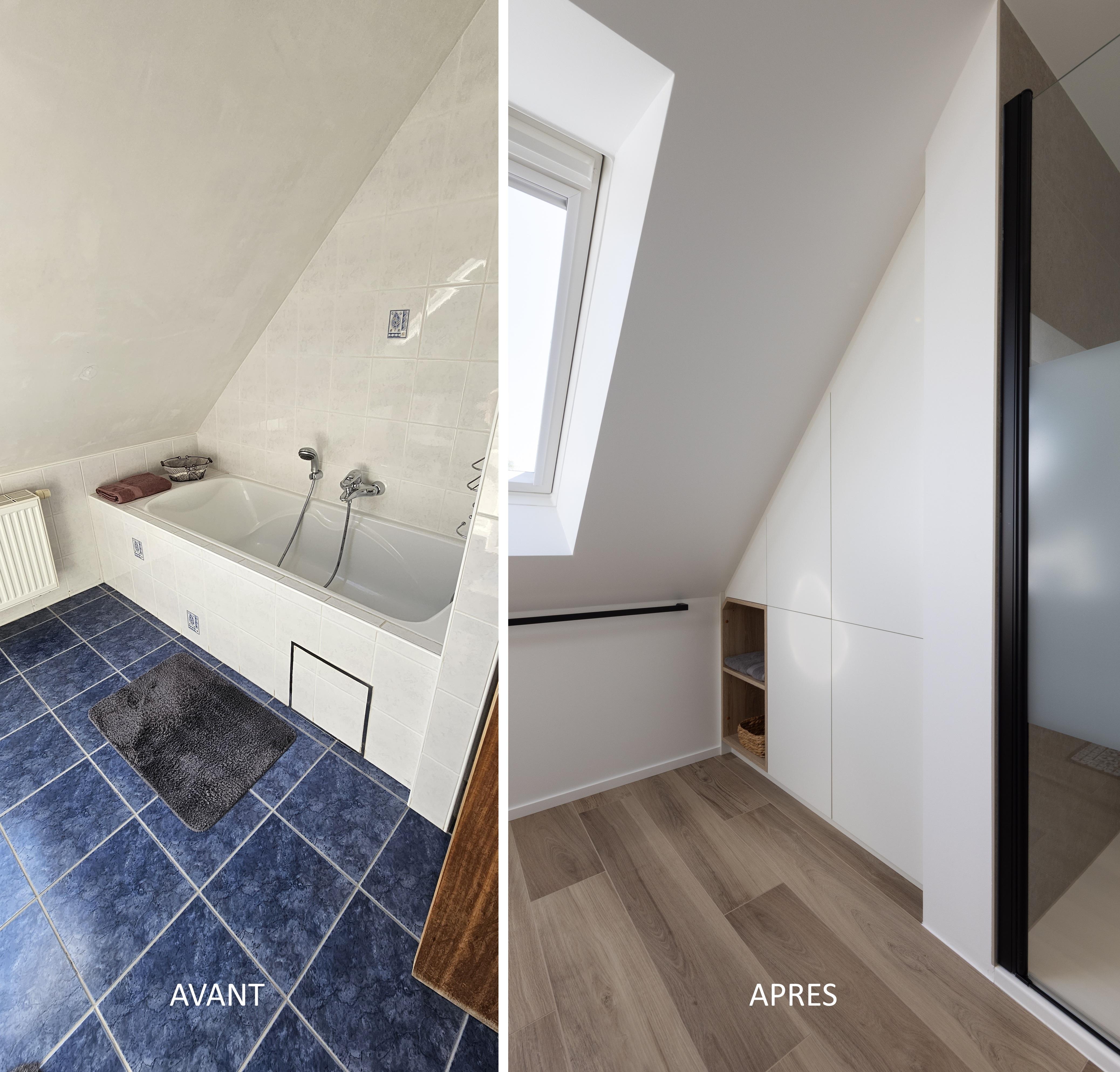 Deux projets d'espace d'eaux réalisés dans des petites pièces avec en plus la contrainte des pentes de toit. L'ajout de Velux a permis de gagner de la hauteur. Les tonalités claires accentuent l'apport de luminosité. Et finalement, les 2 pièces ont de quoi ravir les propriétaires !