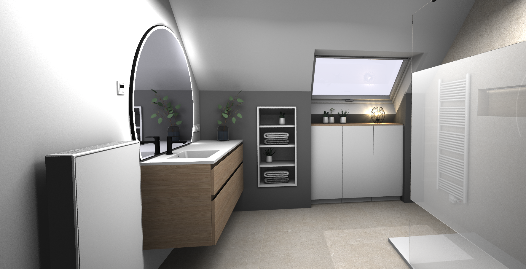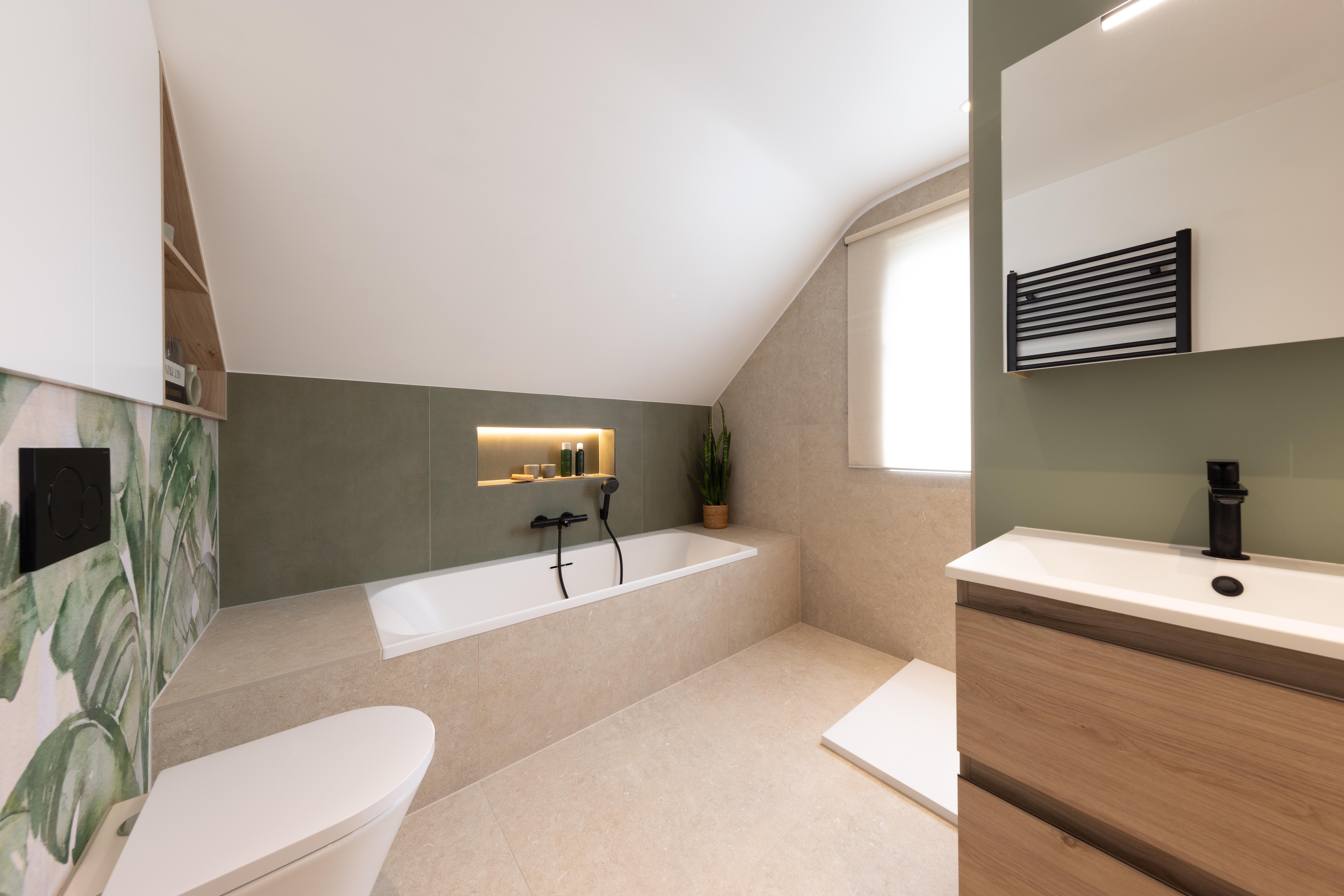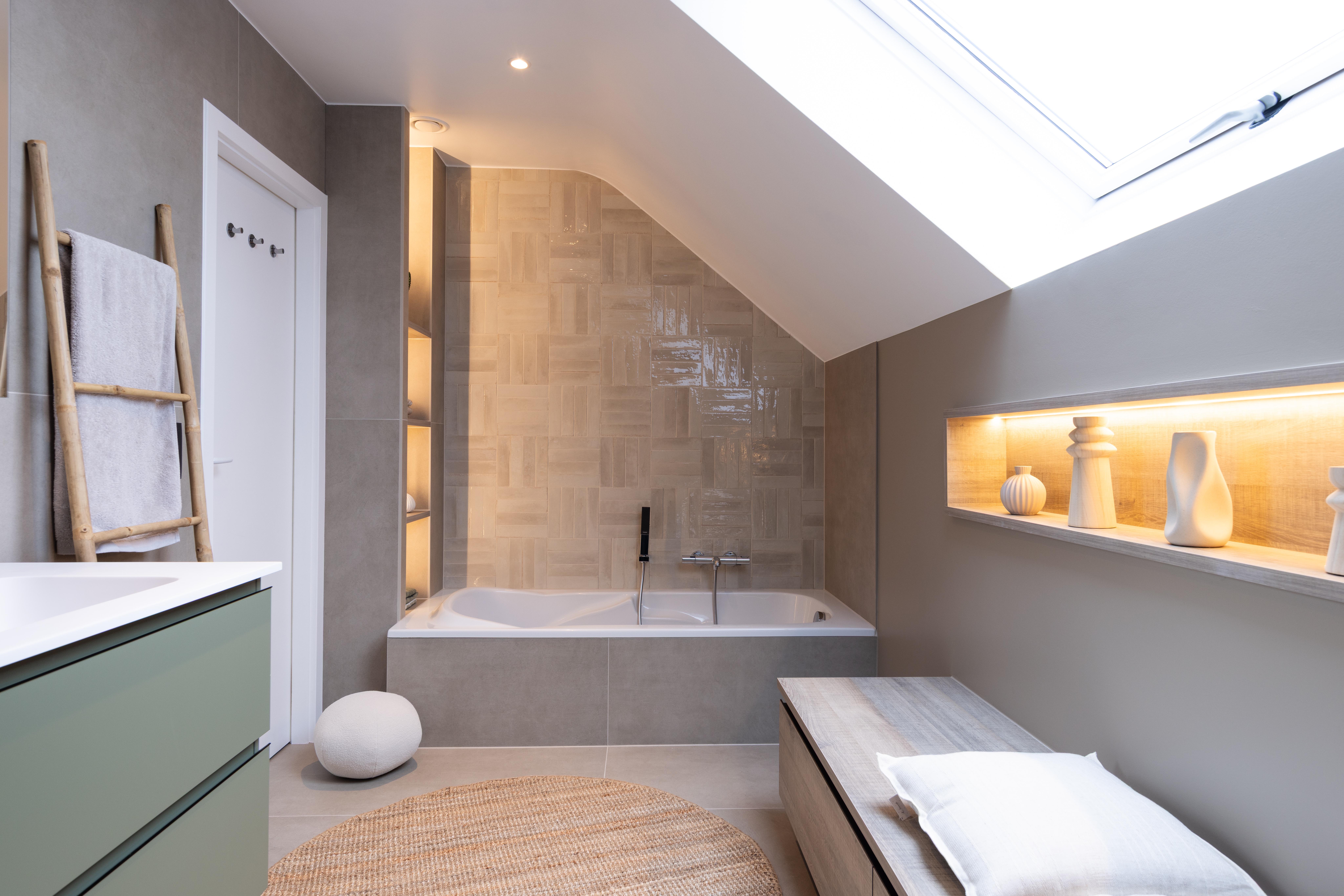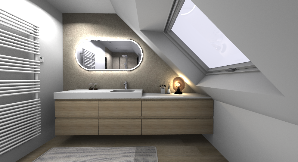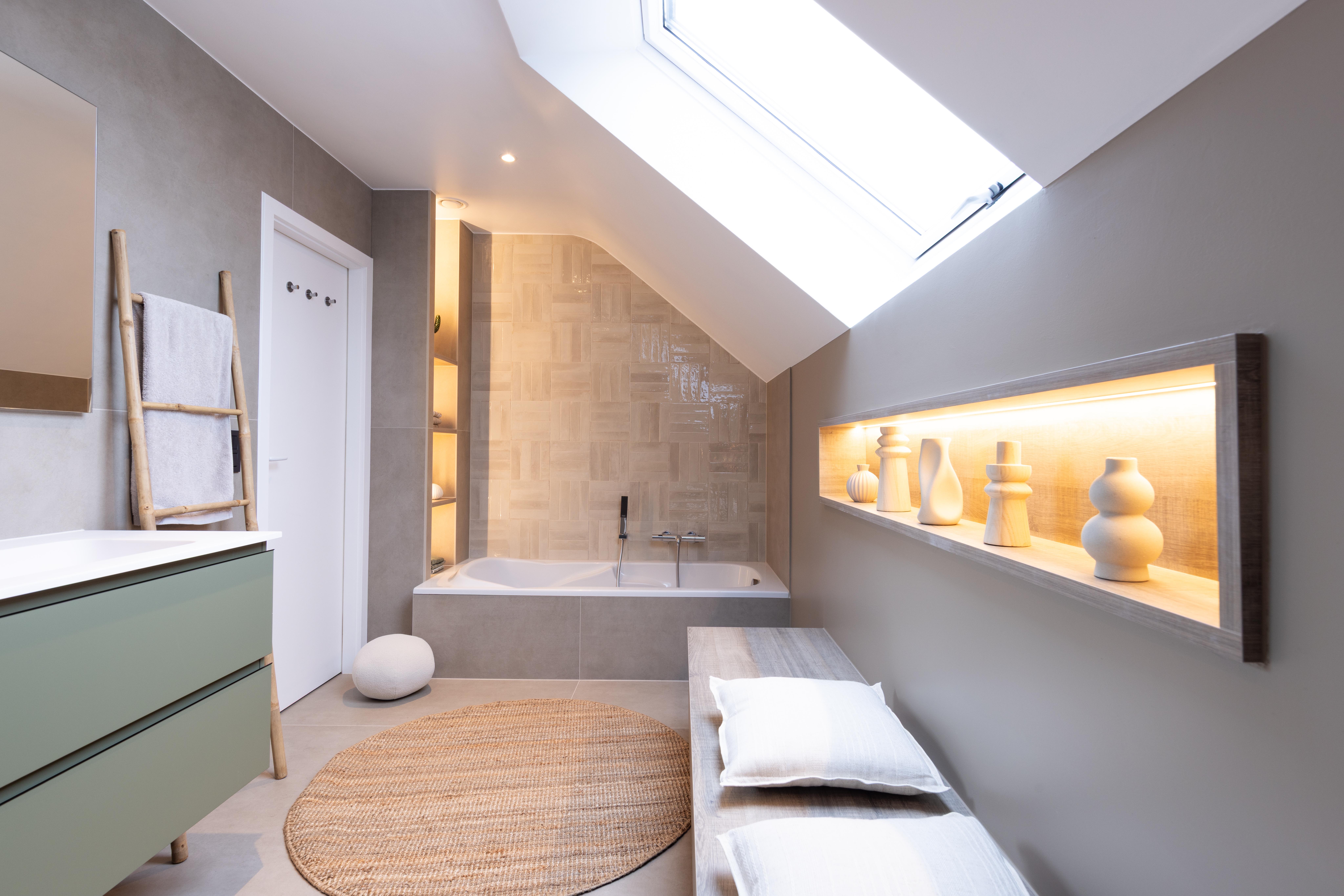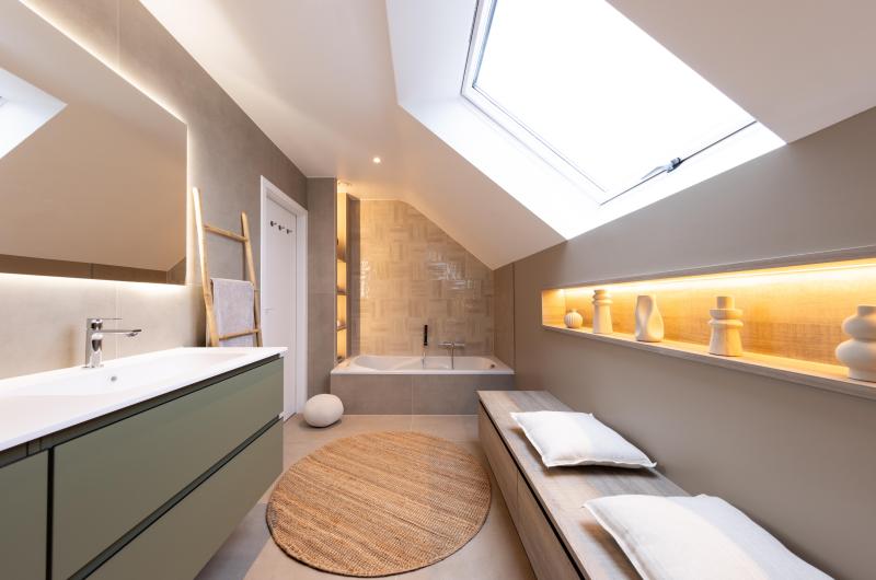 Le plafond mansardé, souvent perçu comme une contrainte, devient ici un atout charme, souligné par une baignoire en alcôve parfaitement intégrée sous la fenêtre de toit. Les tons naturels créent une ambiance apaisante et contemporaine. Un espace pensé pour ralentir, respirer, et profiter pleinement de son chez-soi.