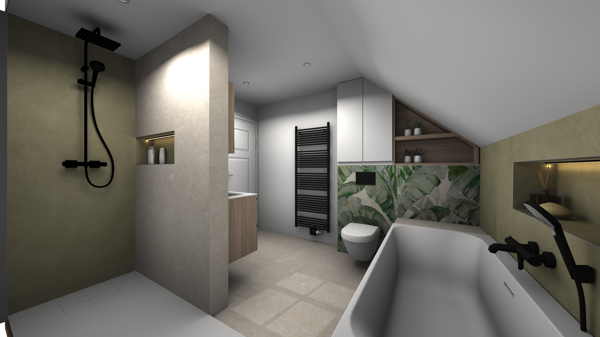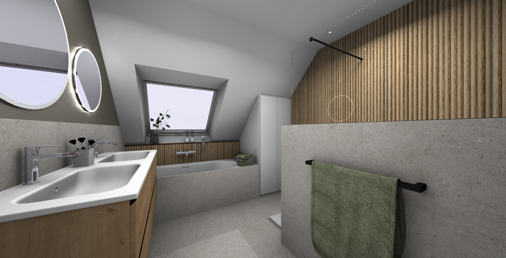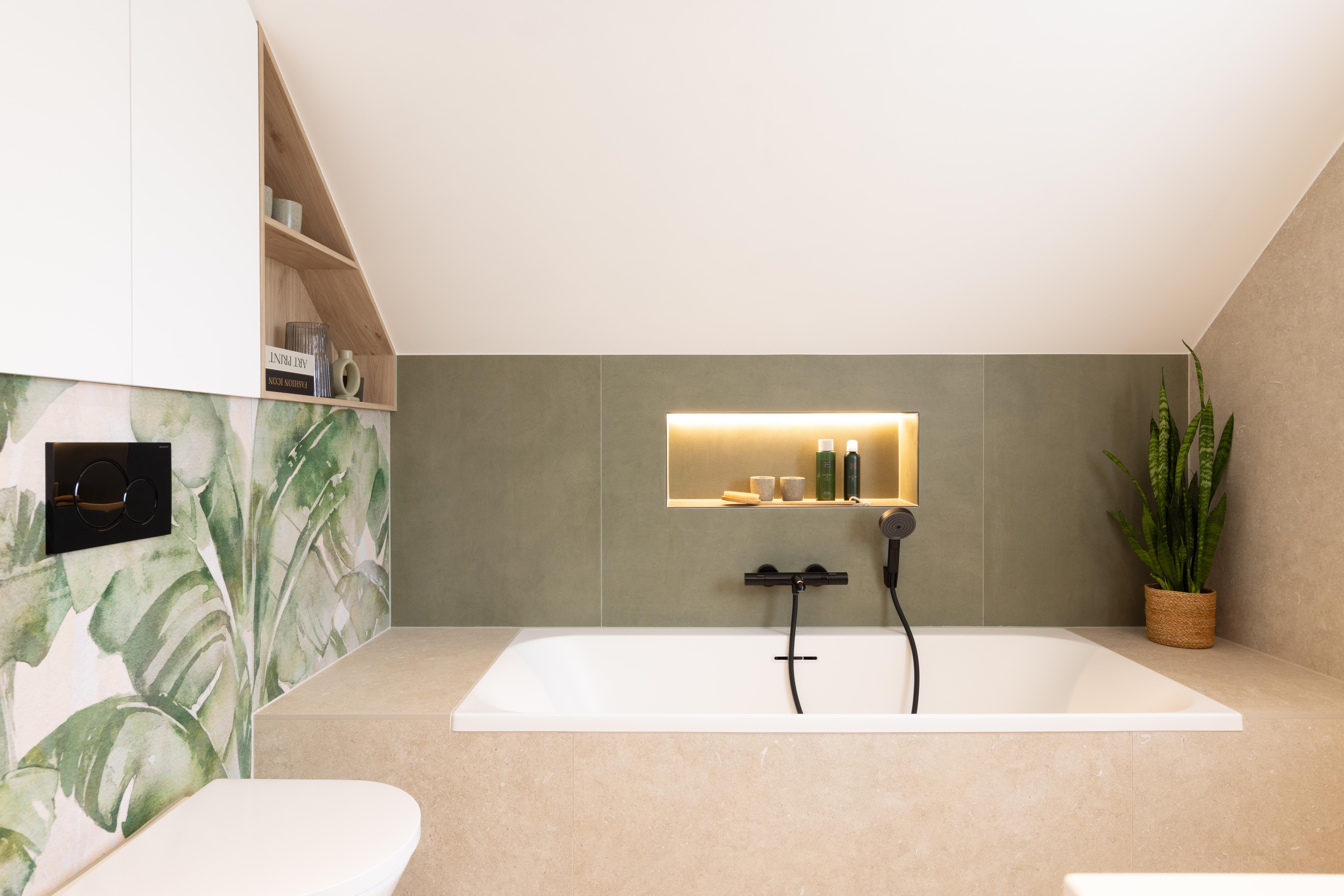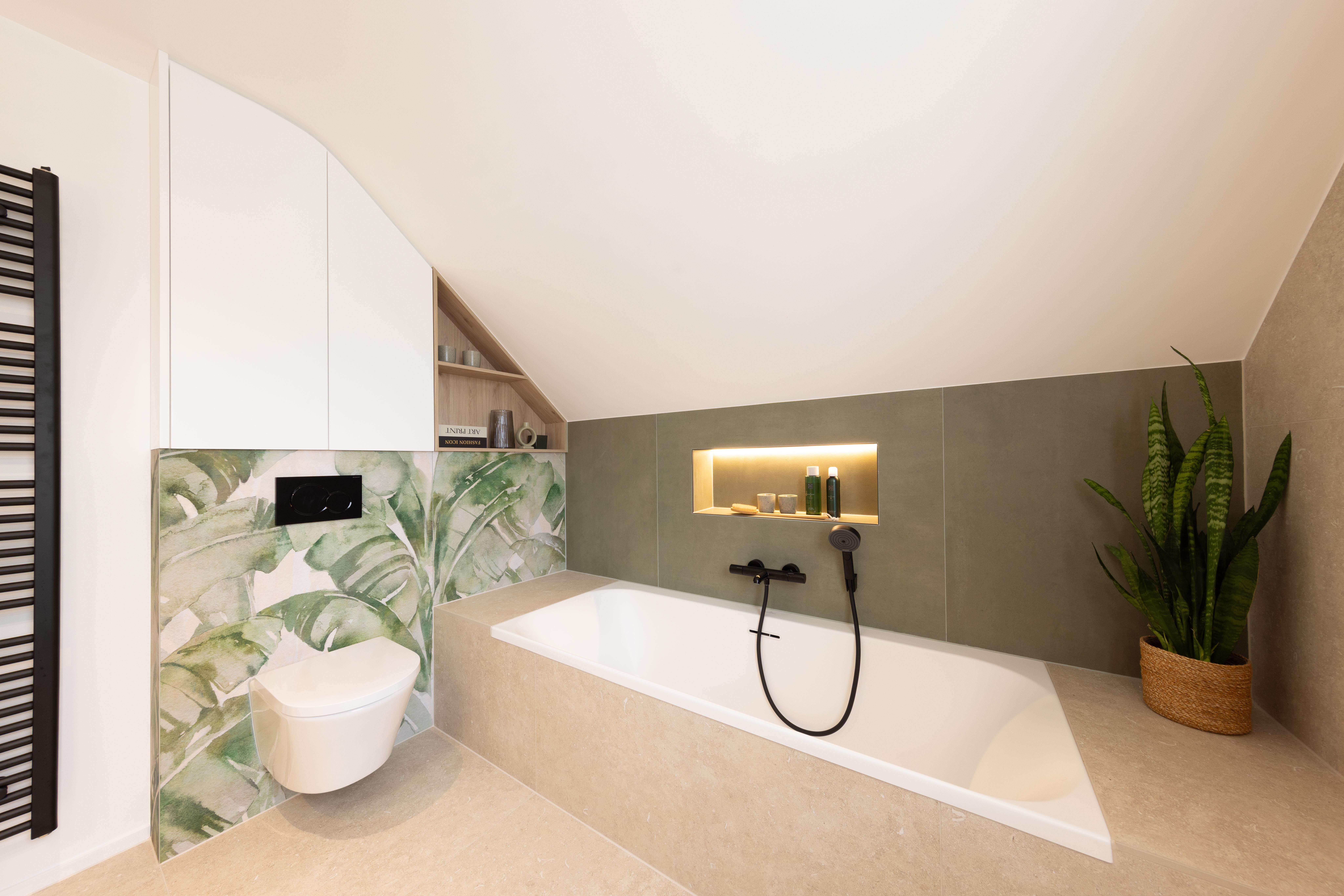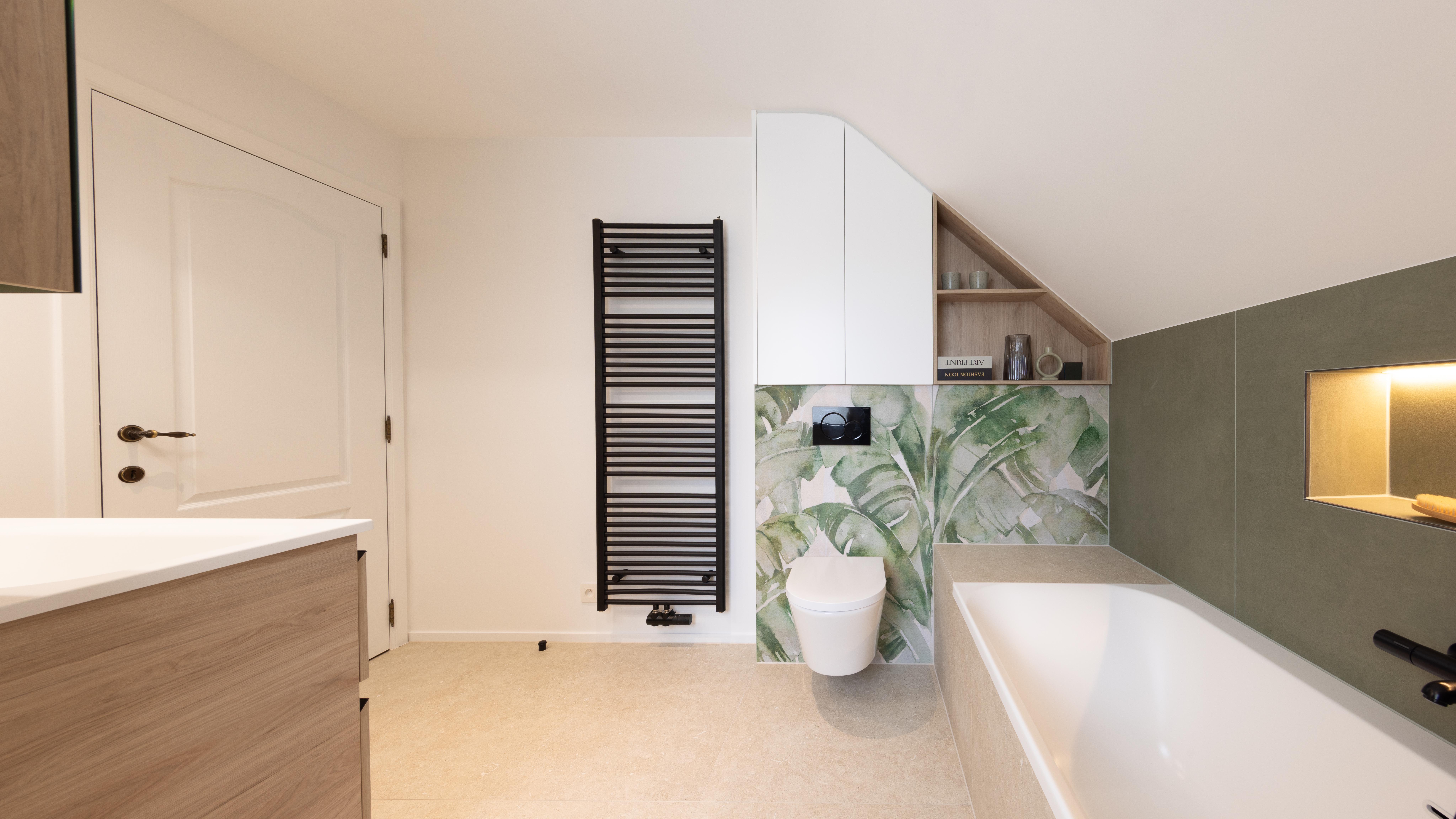 Le plafond mansardé, souvent perçu comme une contrainte, devient ici un atout charme, souligné par une baignoire en alcôve parfaitement intégrée sous la fenêtre de toit. Les tons naturels créent une ambiance apaisante et contemporaine. Un espace pensé pour ralentir, respirer, et profiter pleinement de son chez-soi.