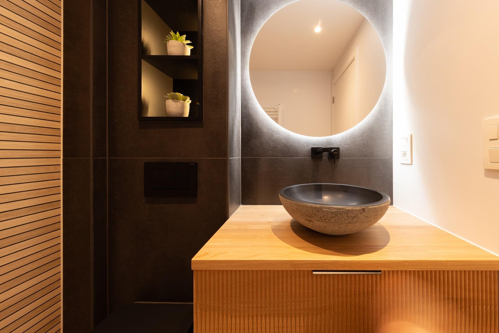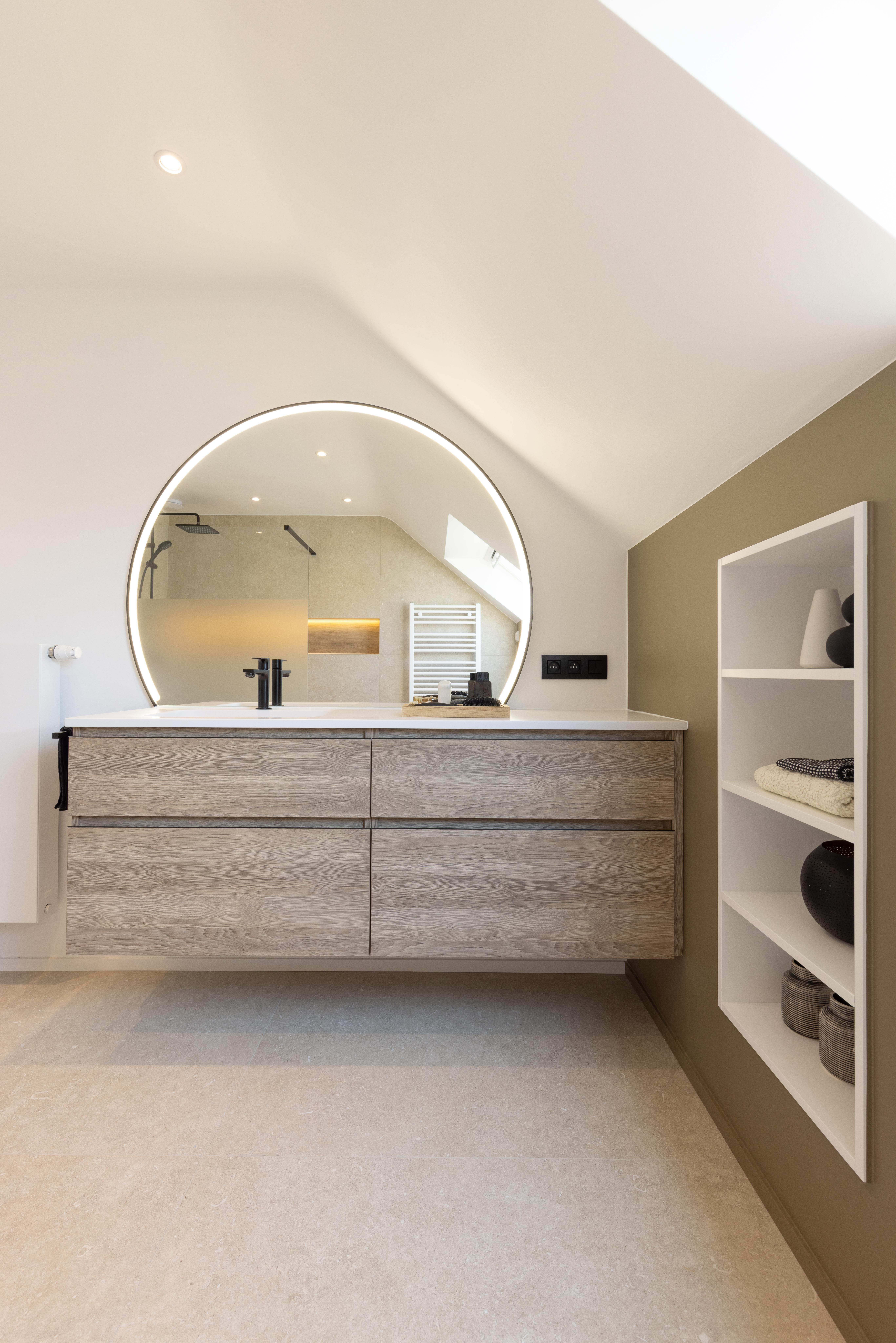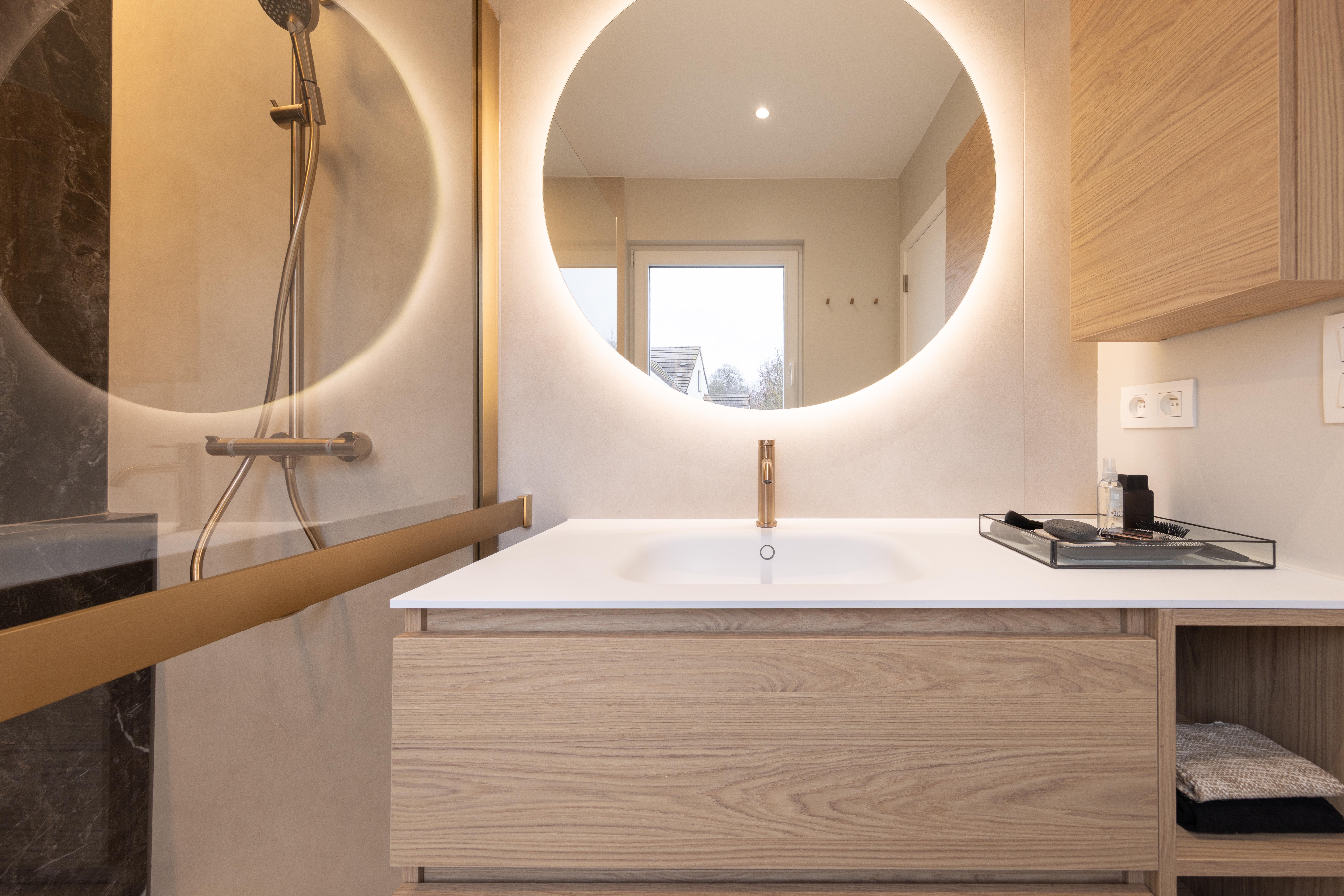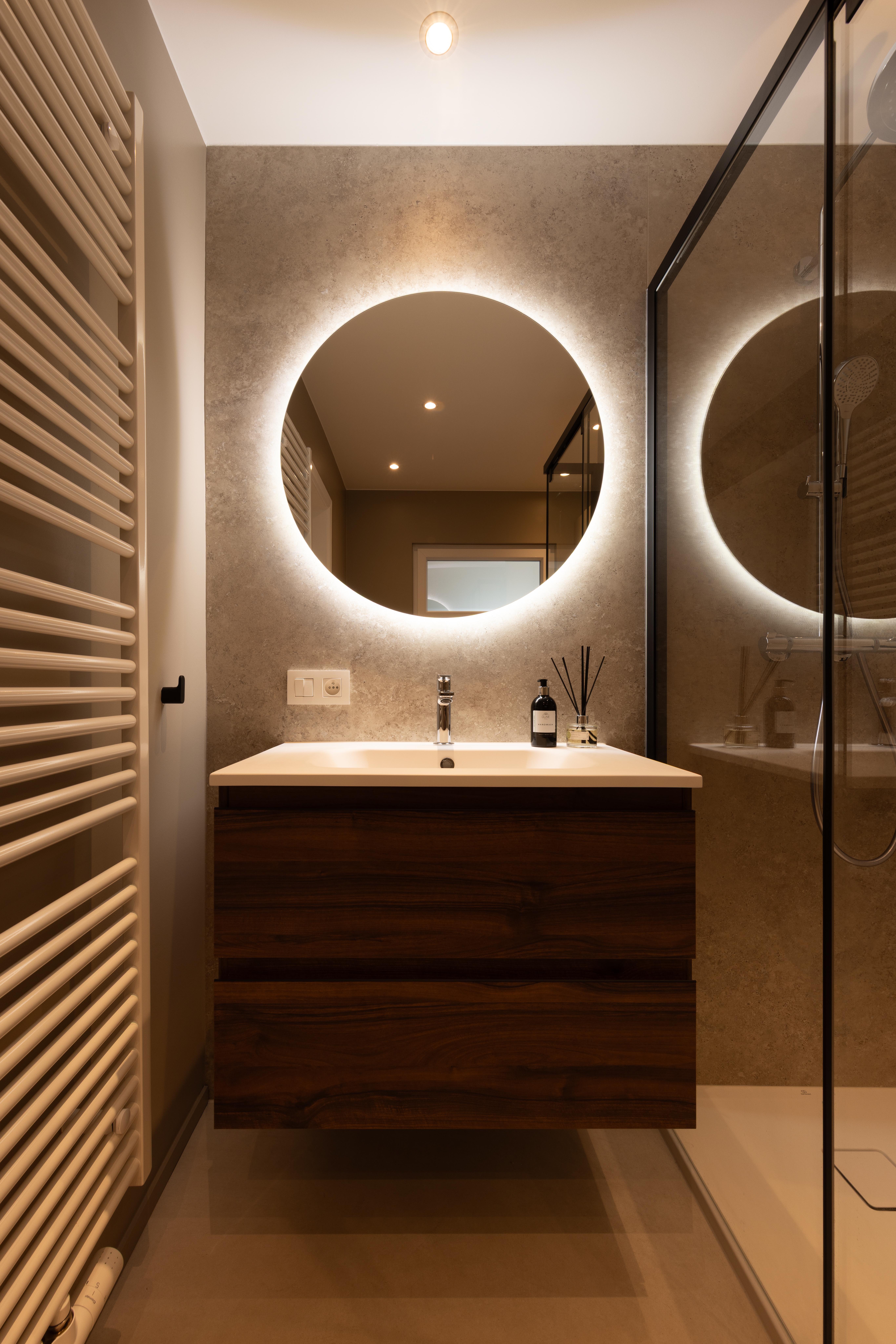 Une salle de bains pensée comme un refuge contemporain. La chaleur du bois dialogue avec la minéralité des murs, tandis que le noir graphique de la verrière de douche signe l’espace avec caractère. Le miroir rond rétroéclairé devient une pièce maîtresse, diffusant une lumière douce qui enveloppe le volume et sublime les matières.