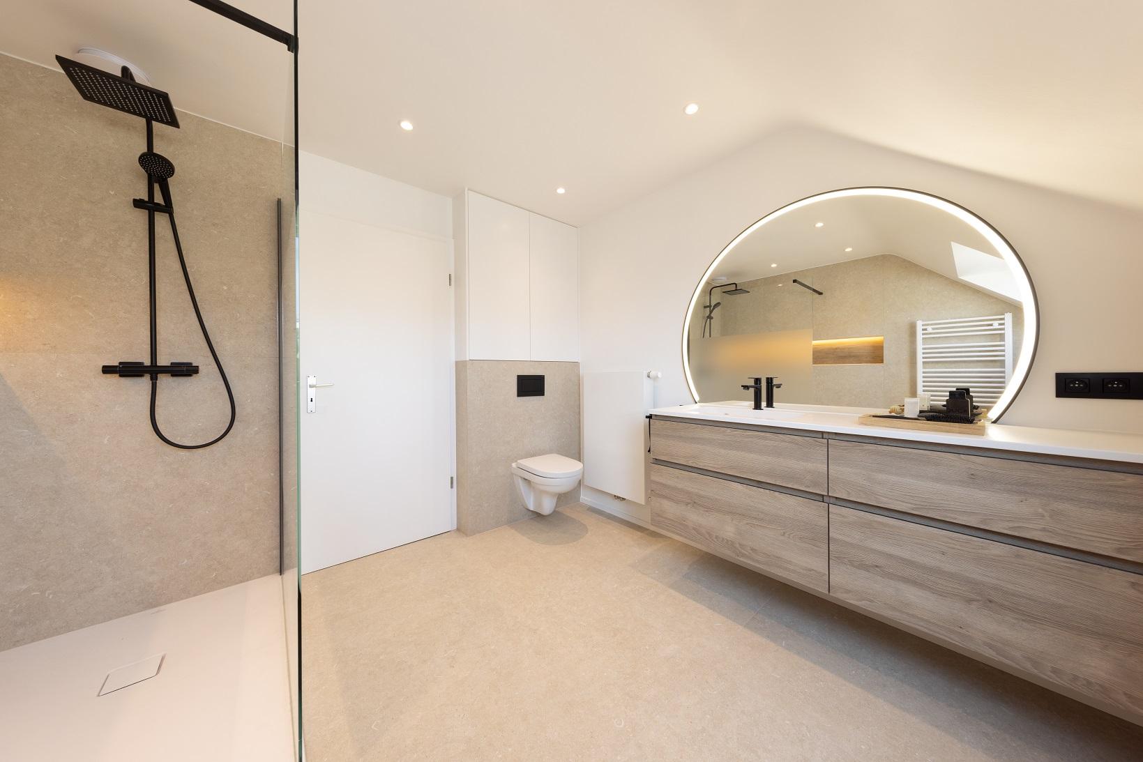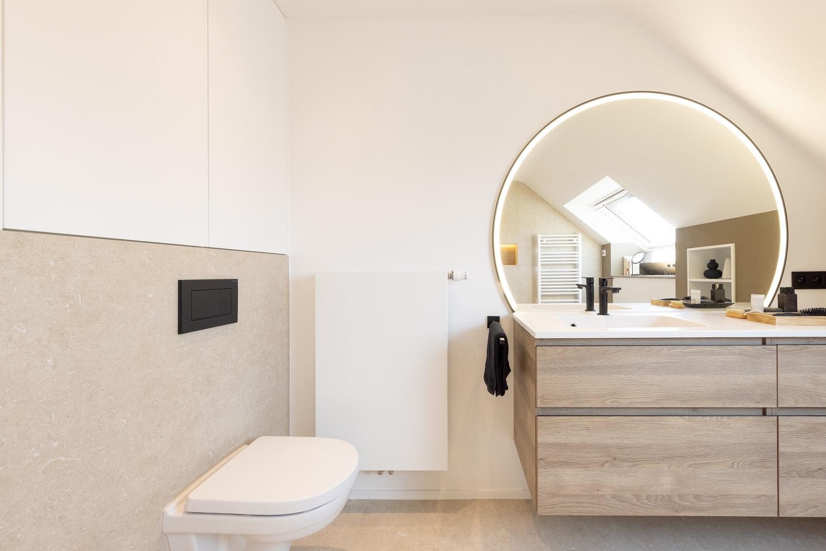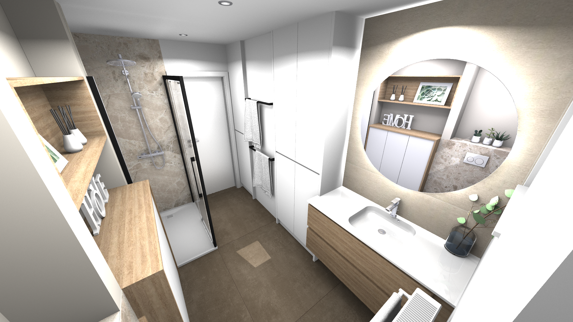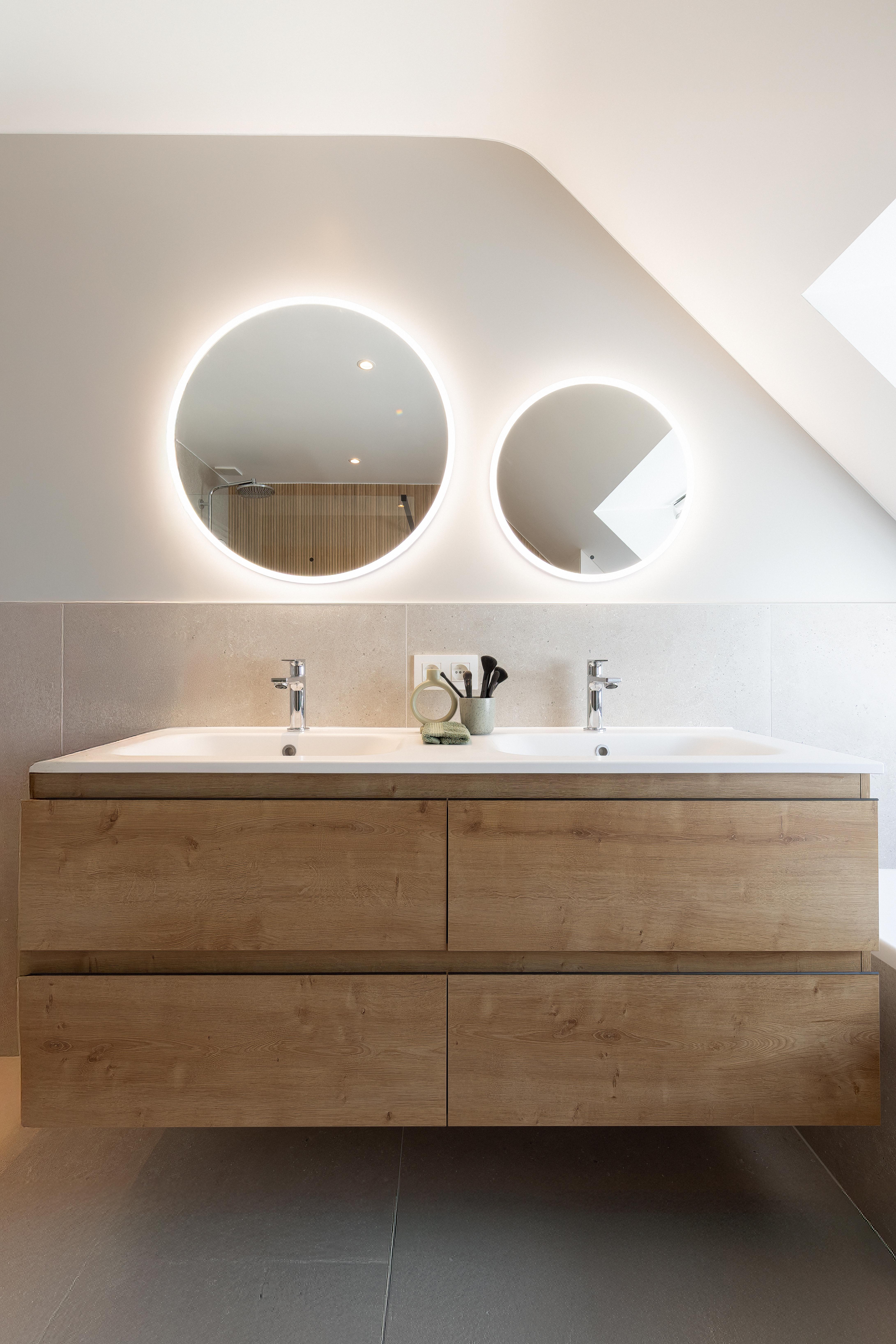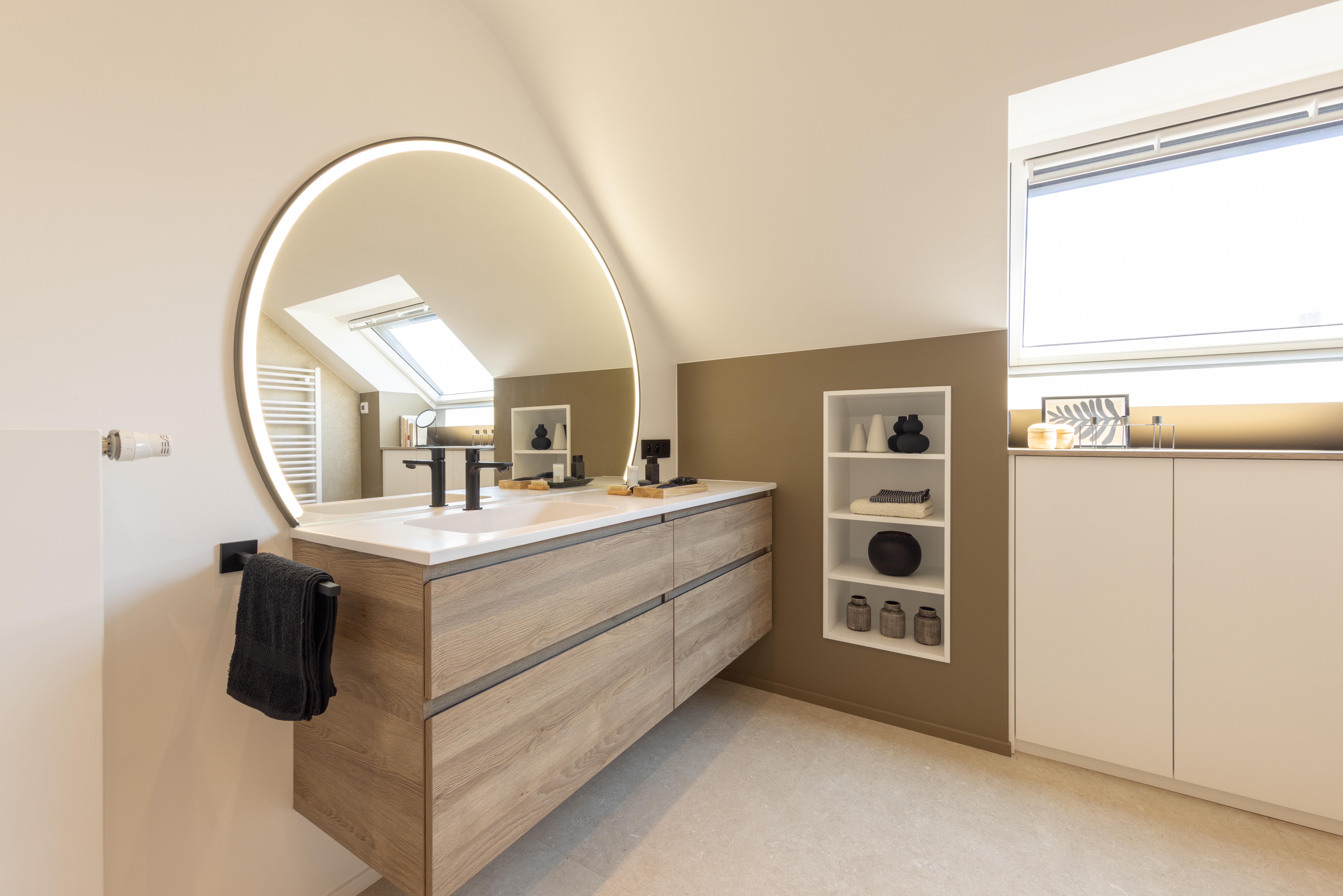 Une salle de bains pensée comme un refuge contemporain. La chaleur du bois dialogue avec la minéralité des murs, tandis que le noir graphique de la verrière de douche signe l’espace avec caractère. Le miroir rond rétroéclairé devient une pièce maîtresse, diffusant une lumière douce qui enveloppe le volume et sublime les matières.