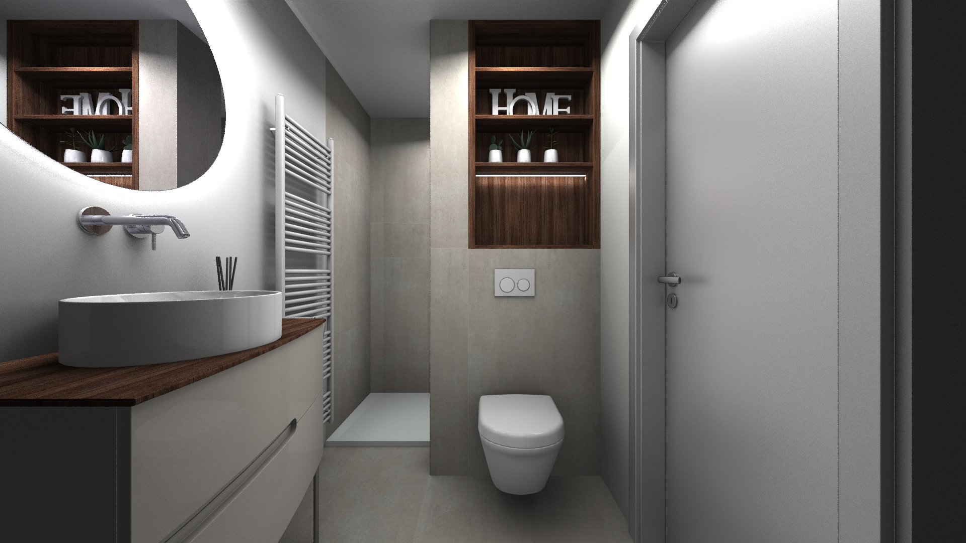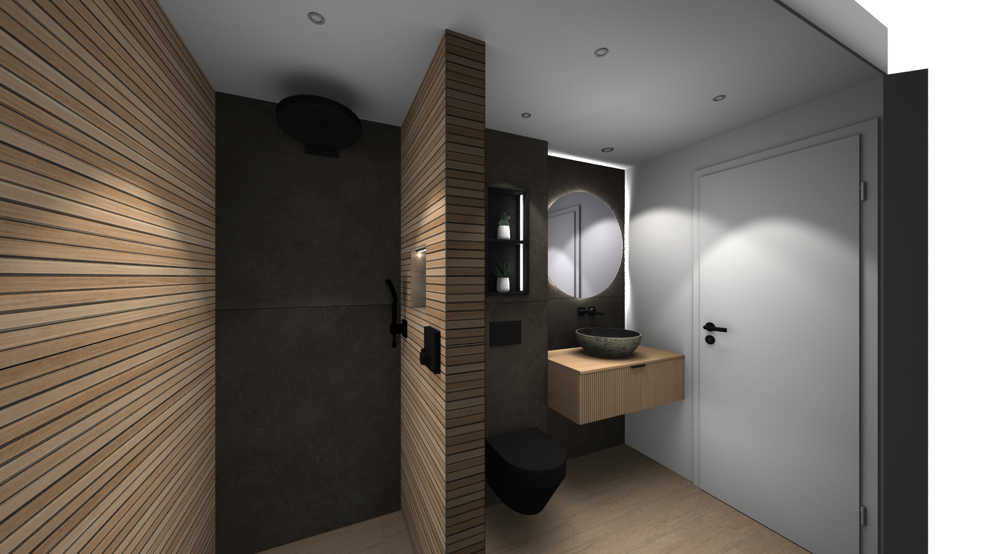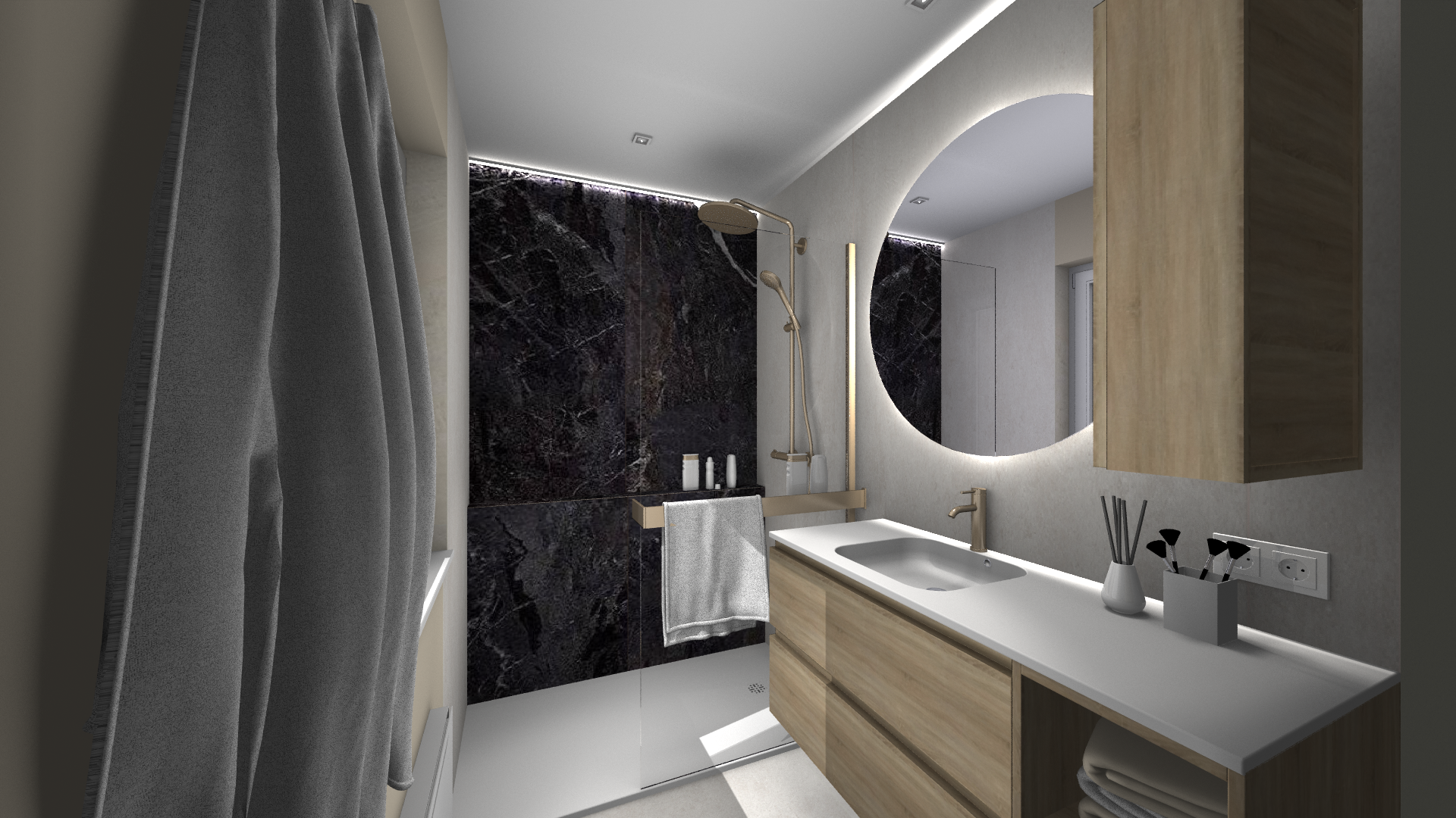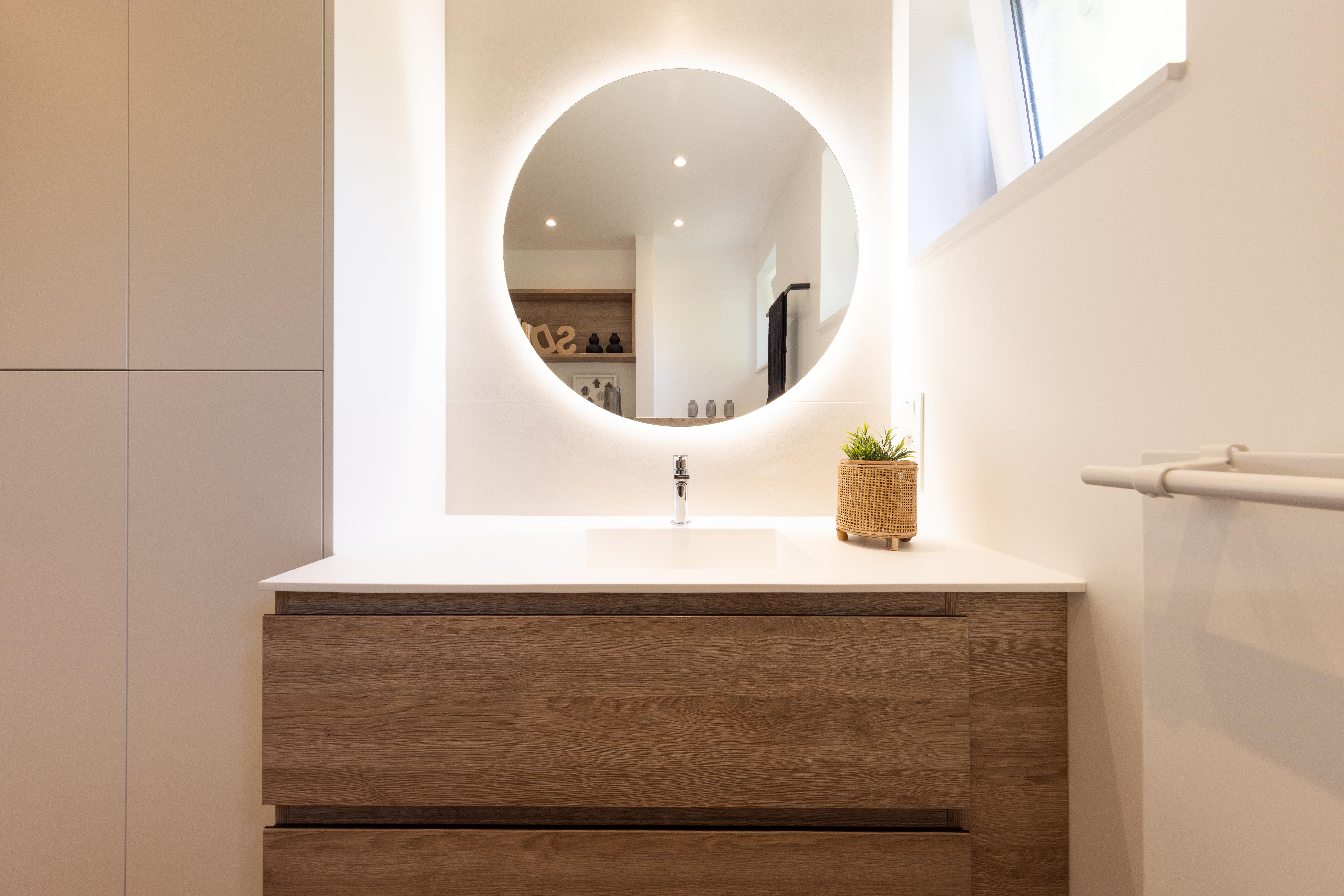 Une salle de bains pensée comme un refuge contemporain. La chaleur du bois dialogue avec la minéralité des murs, tandis que le noir graphique de la verrière de douche signe l’espace avec caractère. Le miroir rond rétroéclairé devient une pièce maîtresse, diffusant une lumière douce qui enveloppe le volume et sublime les matières.