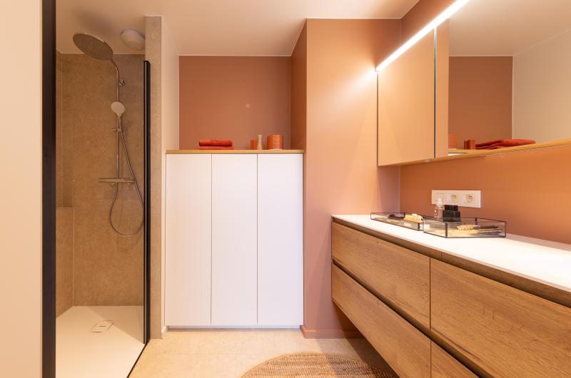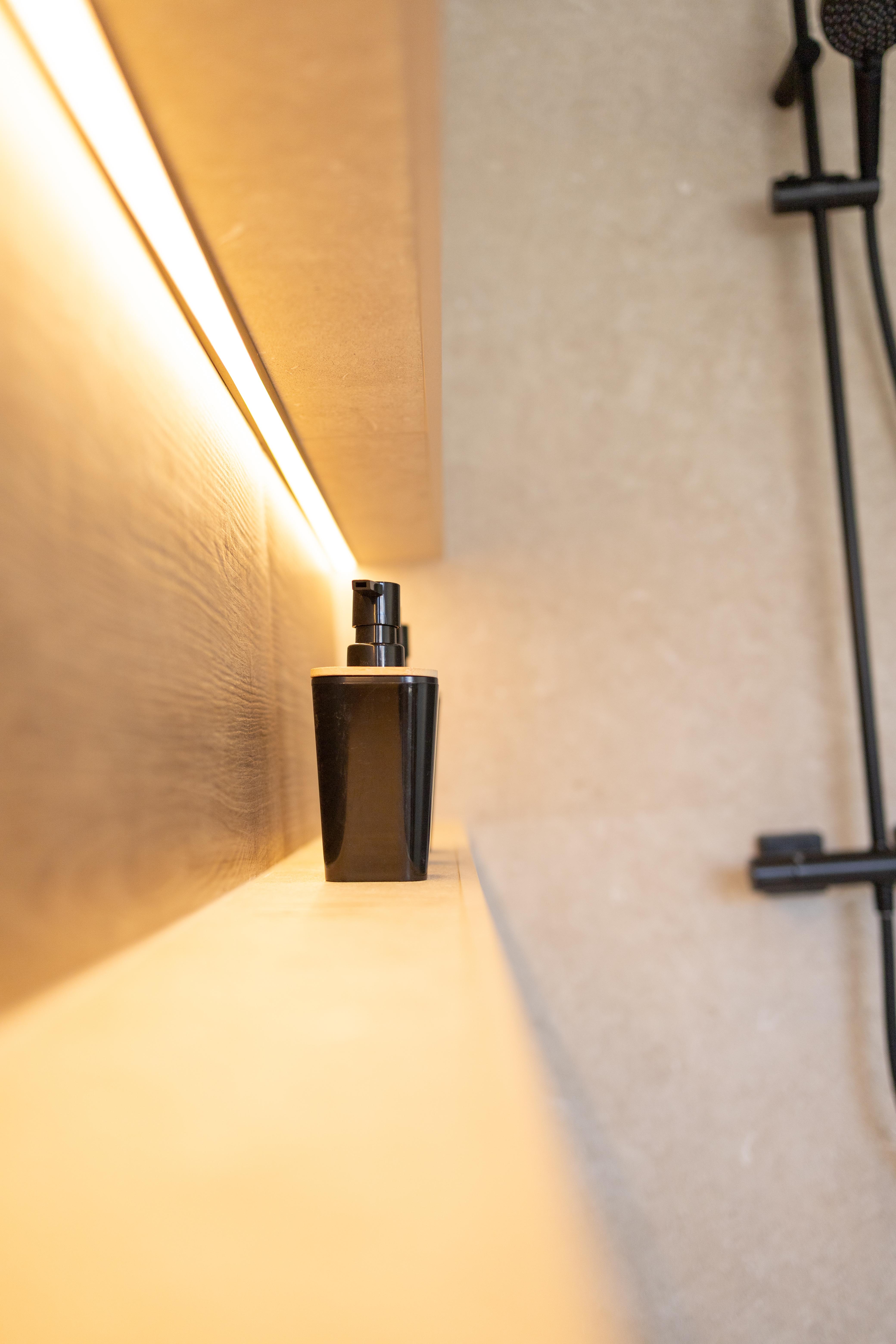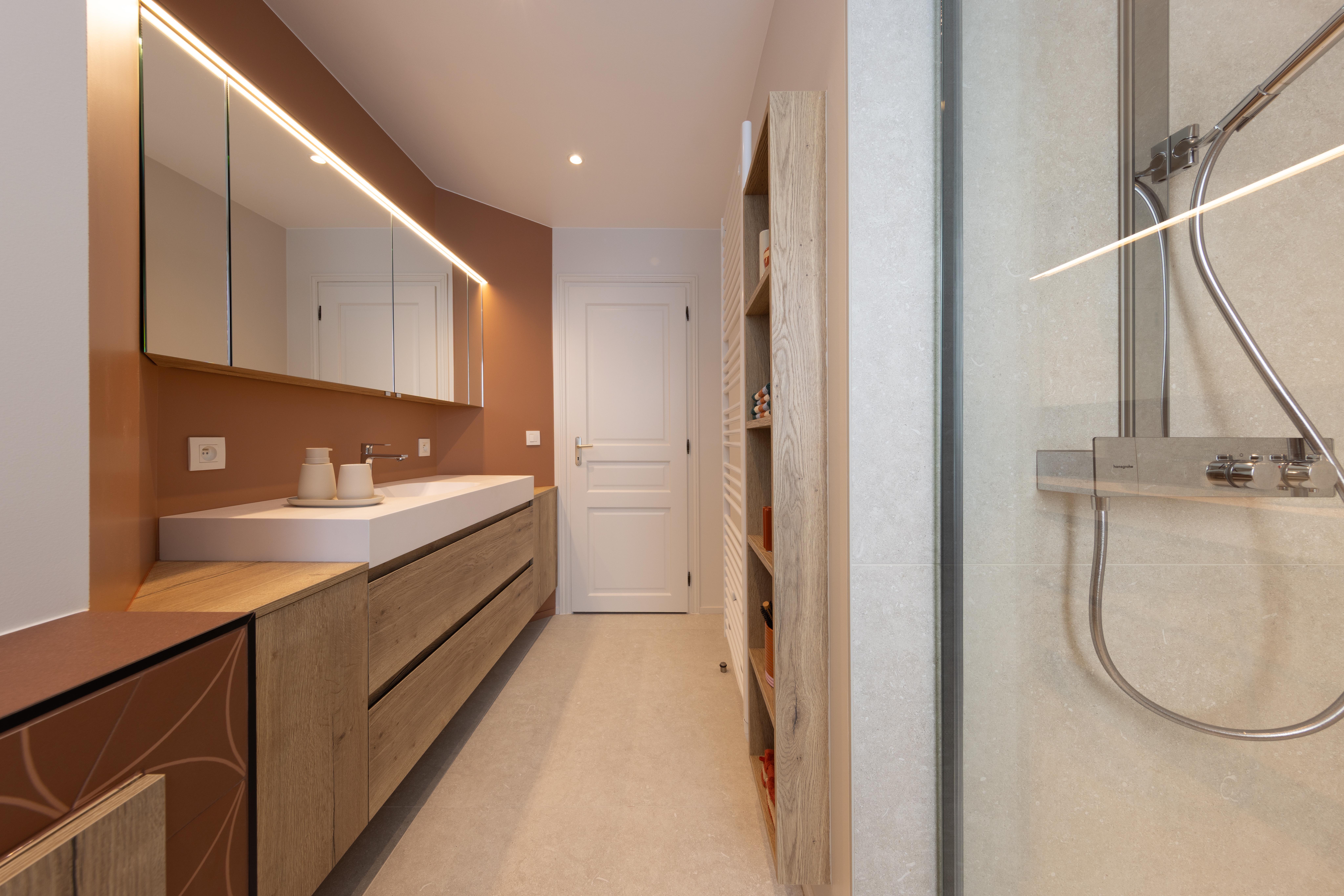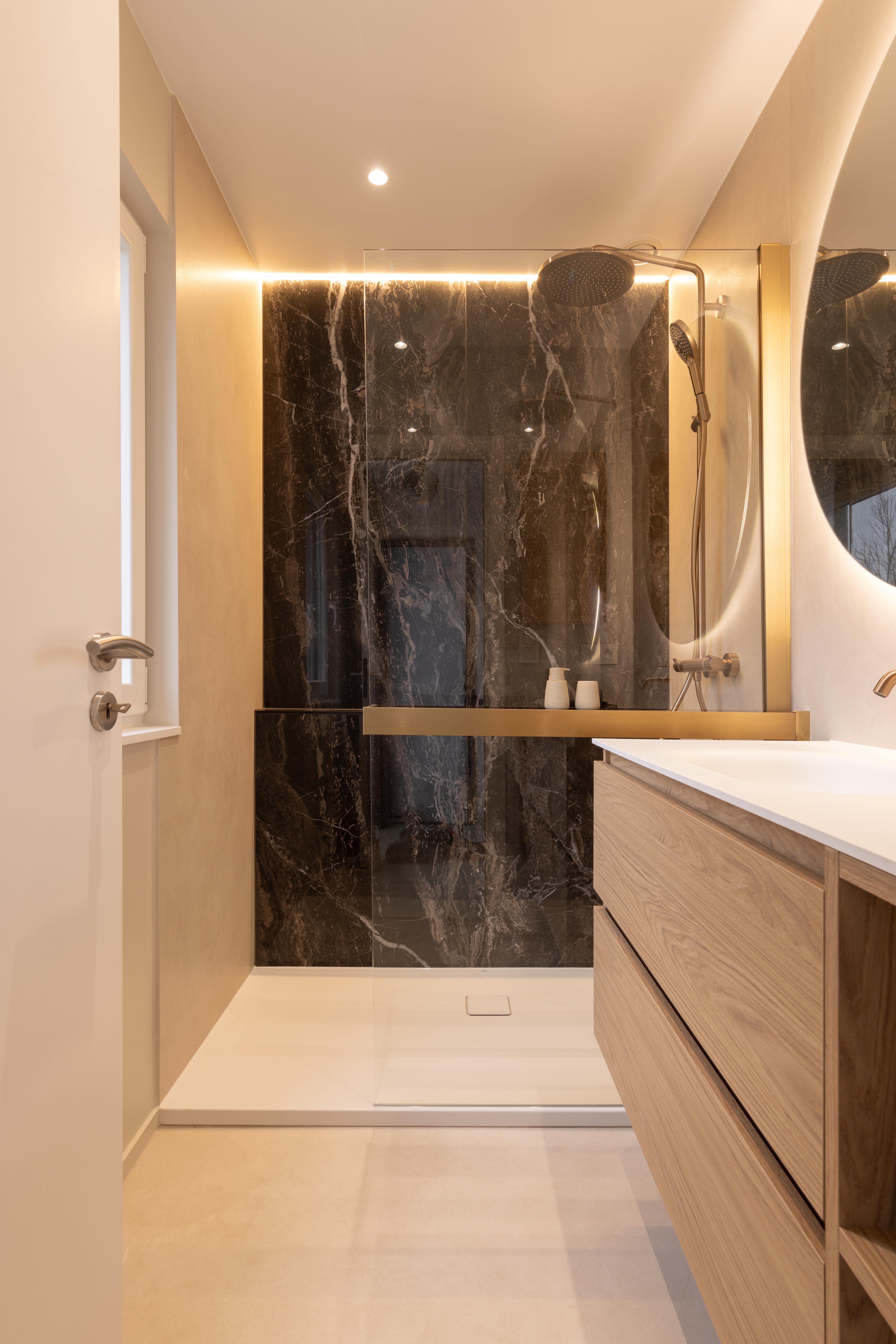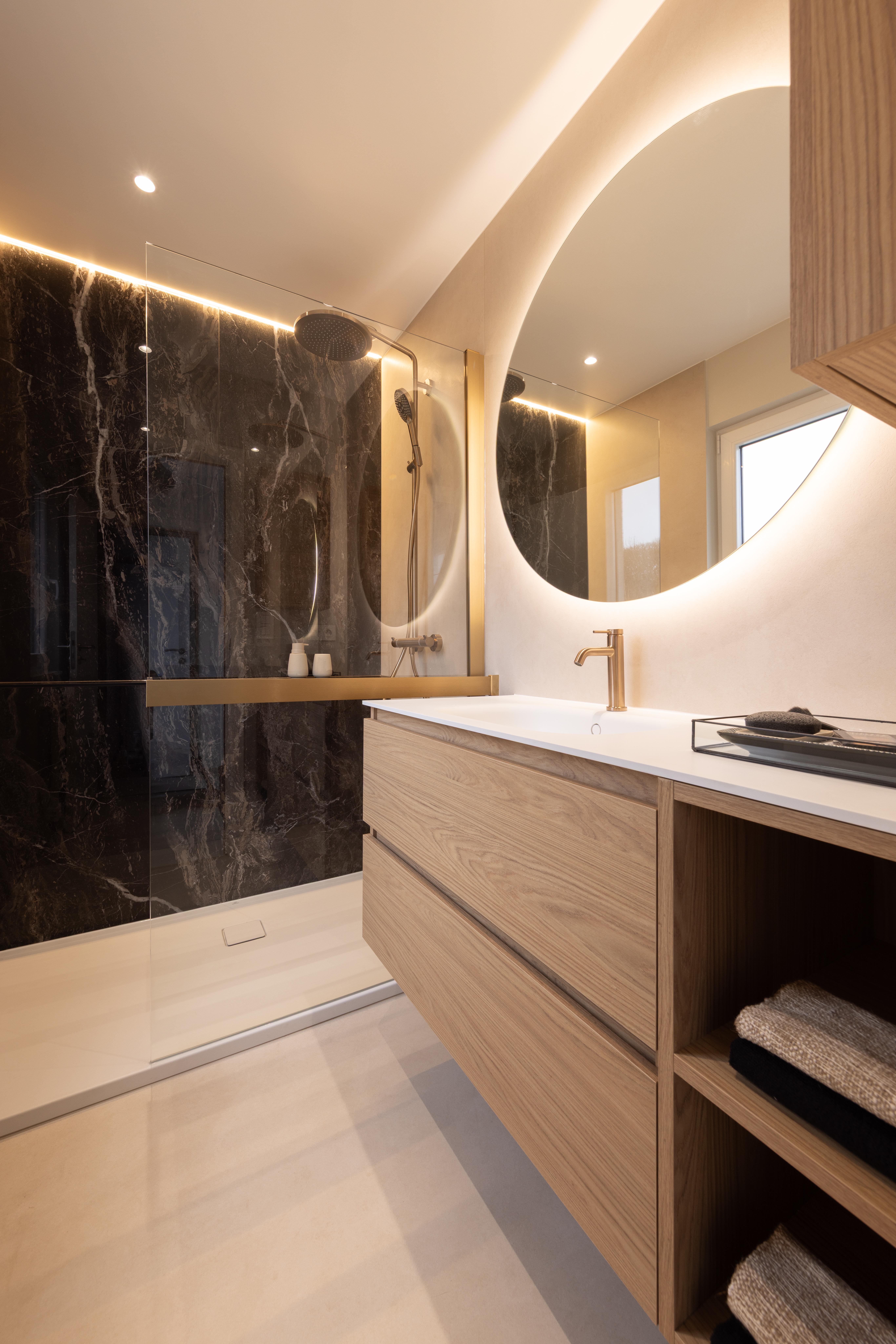 Projet dans lequel il était important d'apporter des éléments lumineux pour mettre en valeur chaque zone. La douche est éclairée de manière subtile et apporte une atmosphère très chaleureuse. Une salle de bains design et chaleureuse, comme on les aime !
