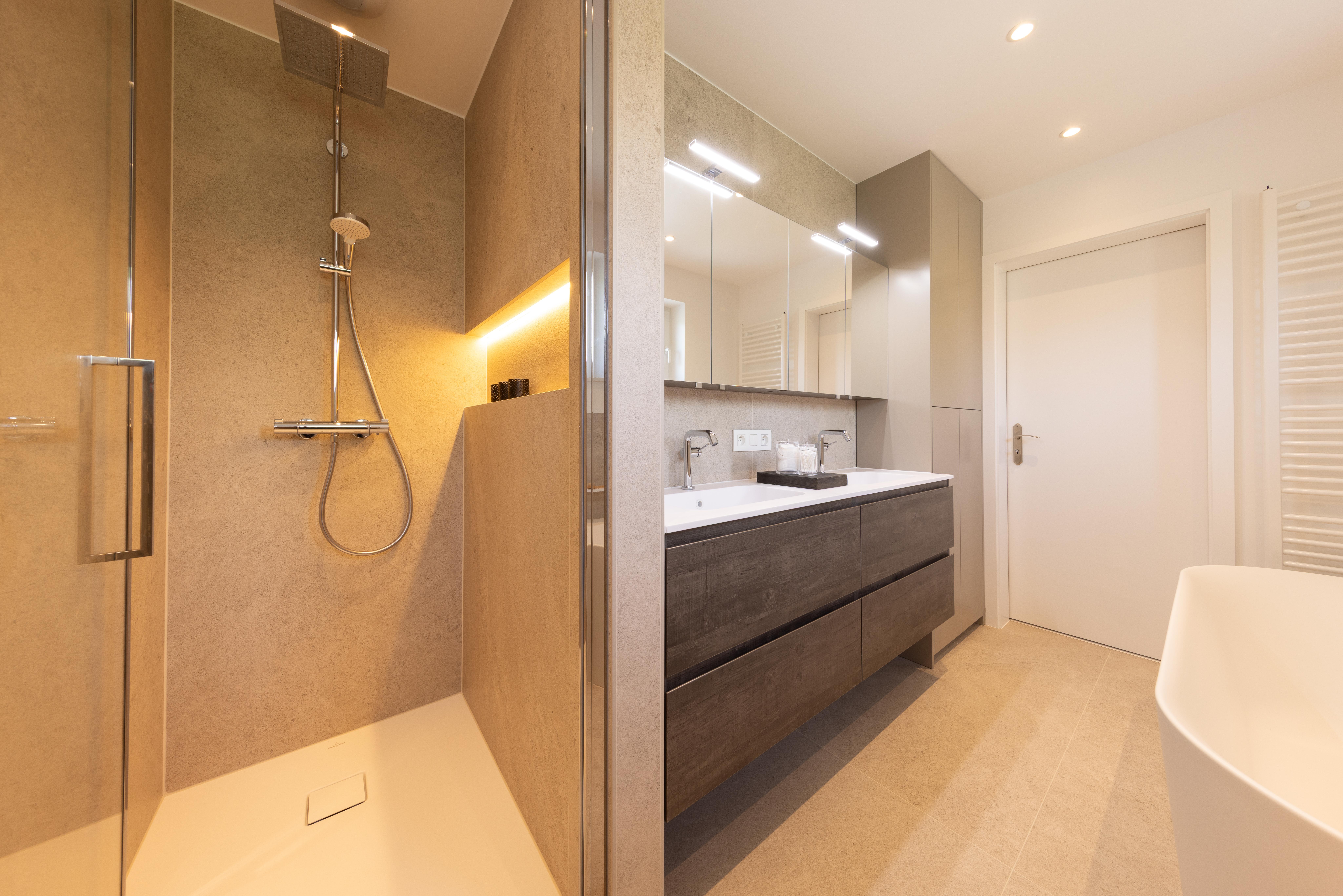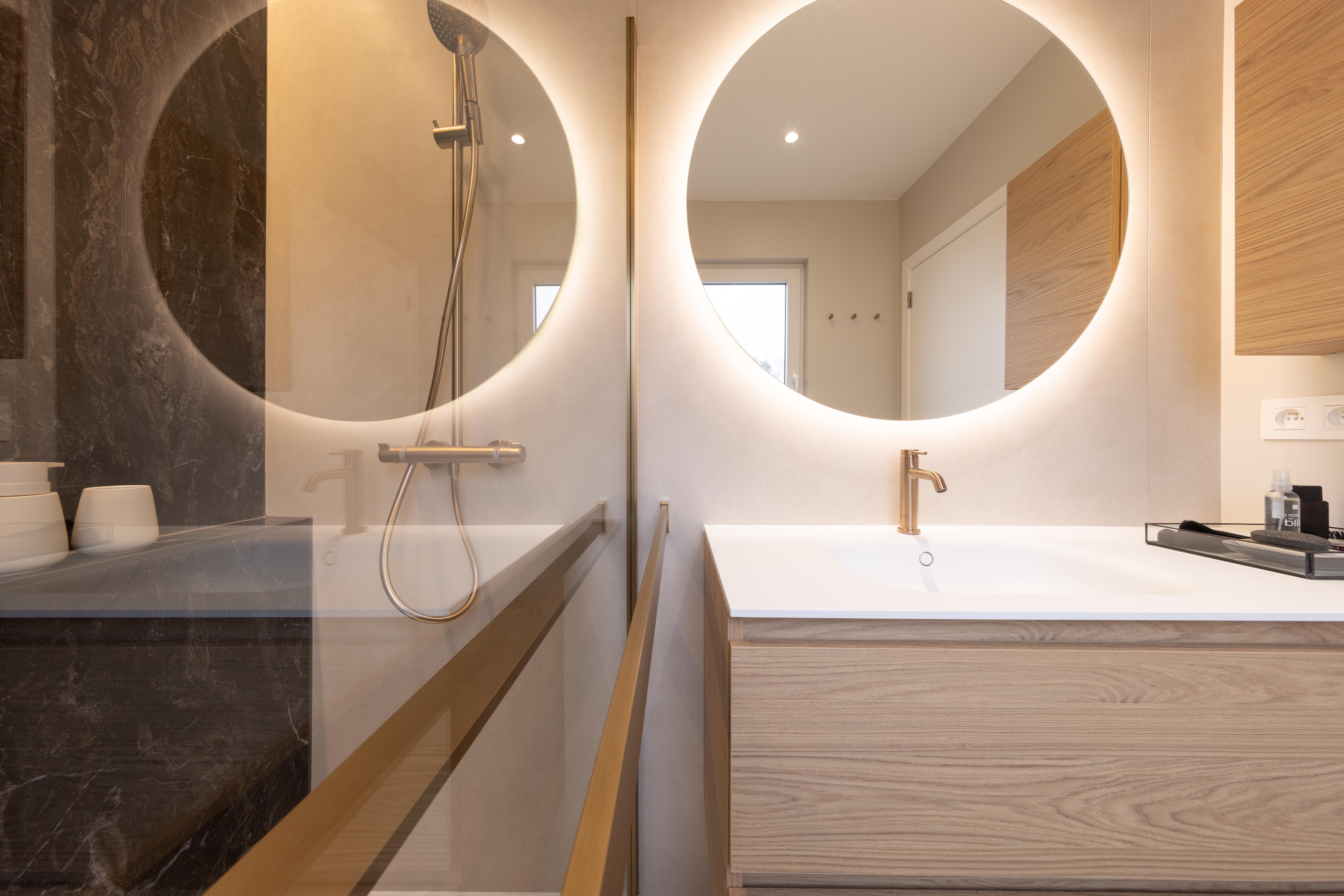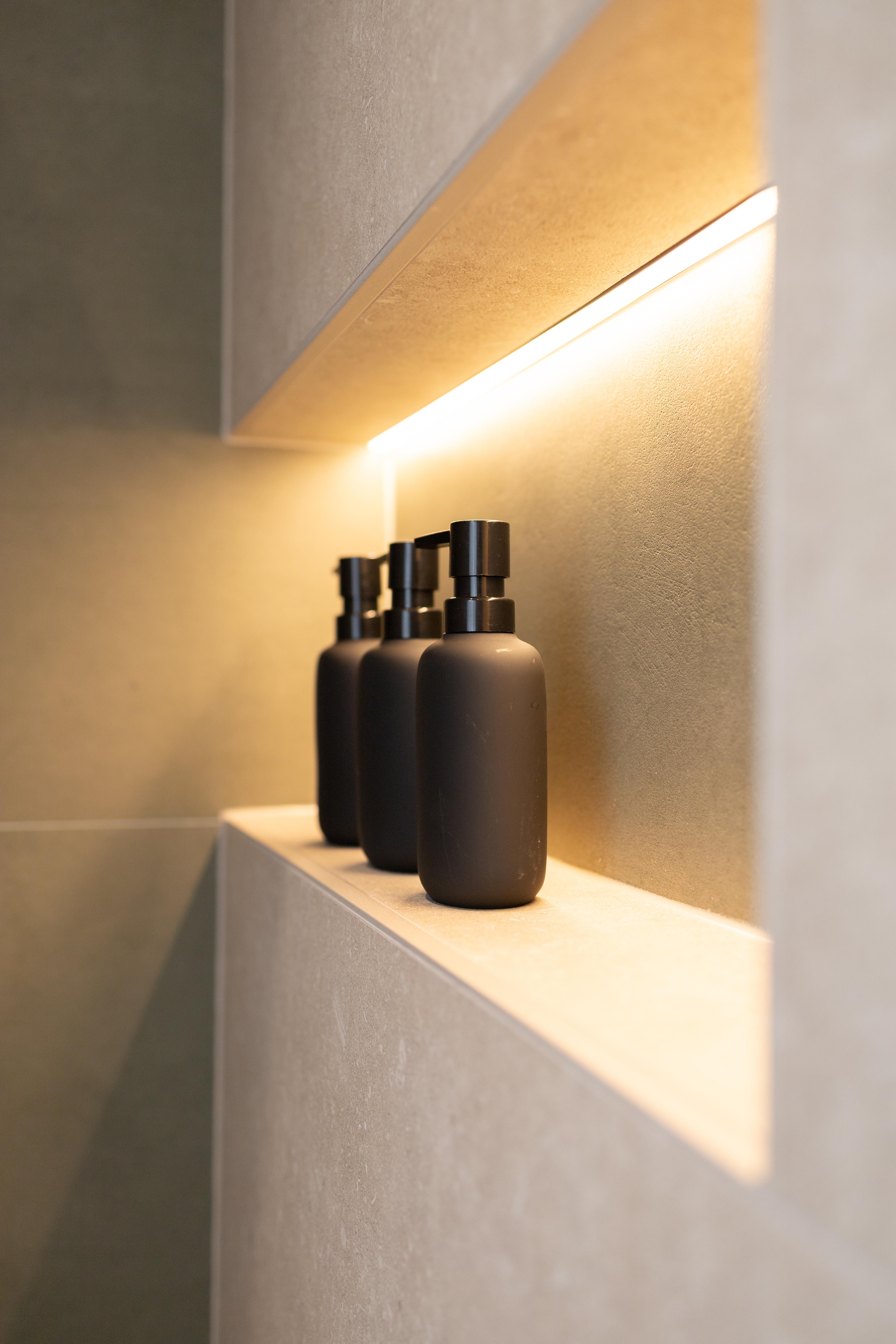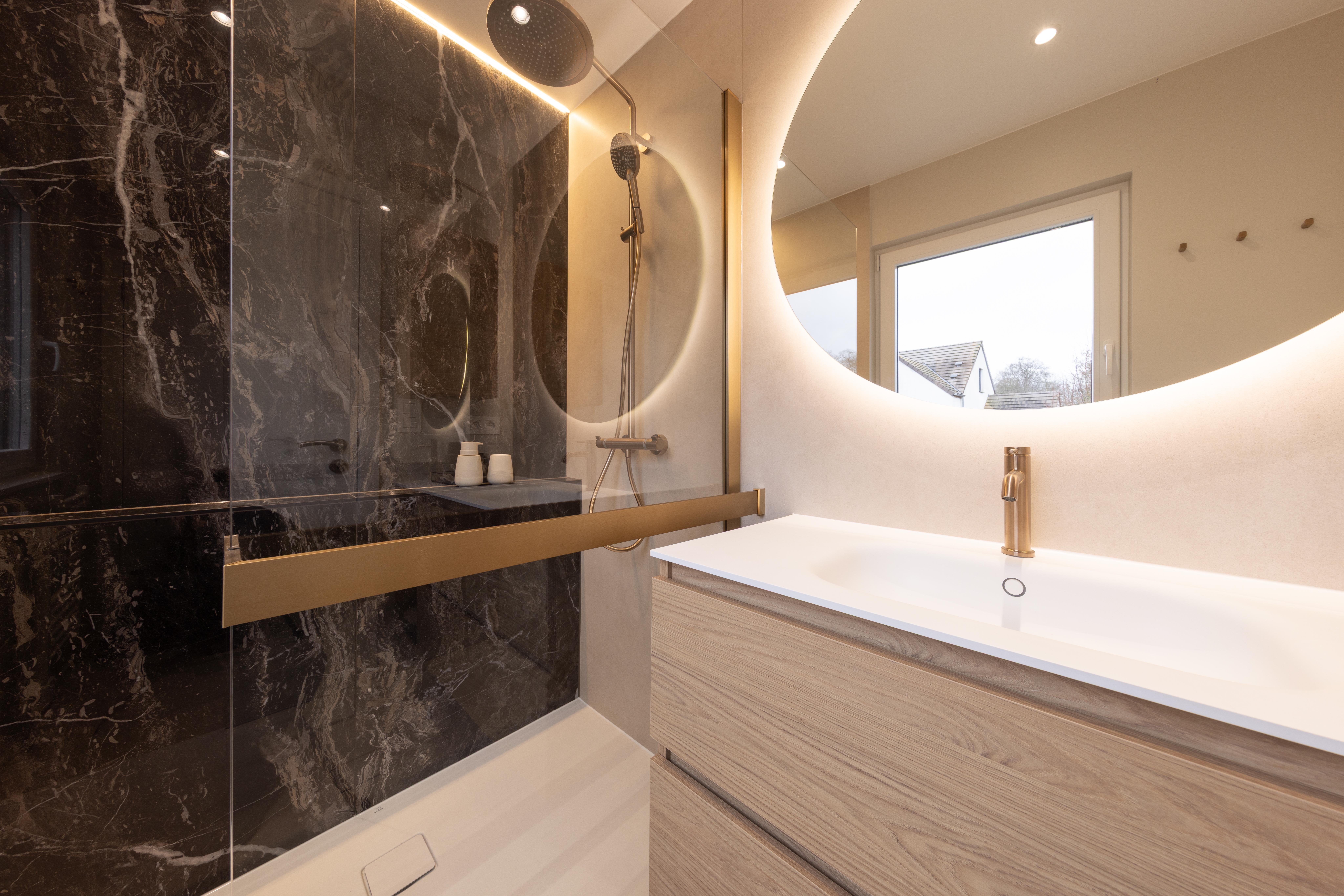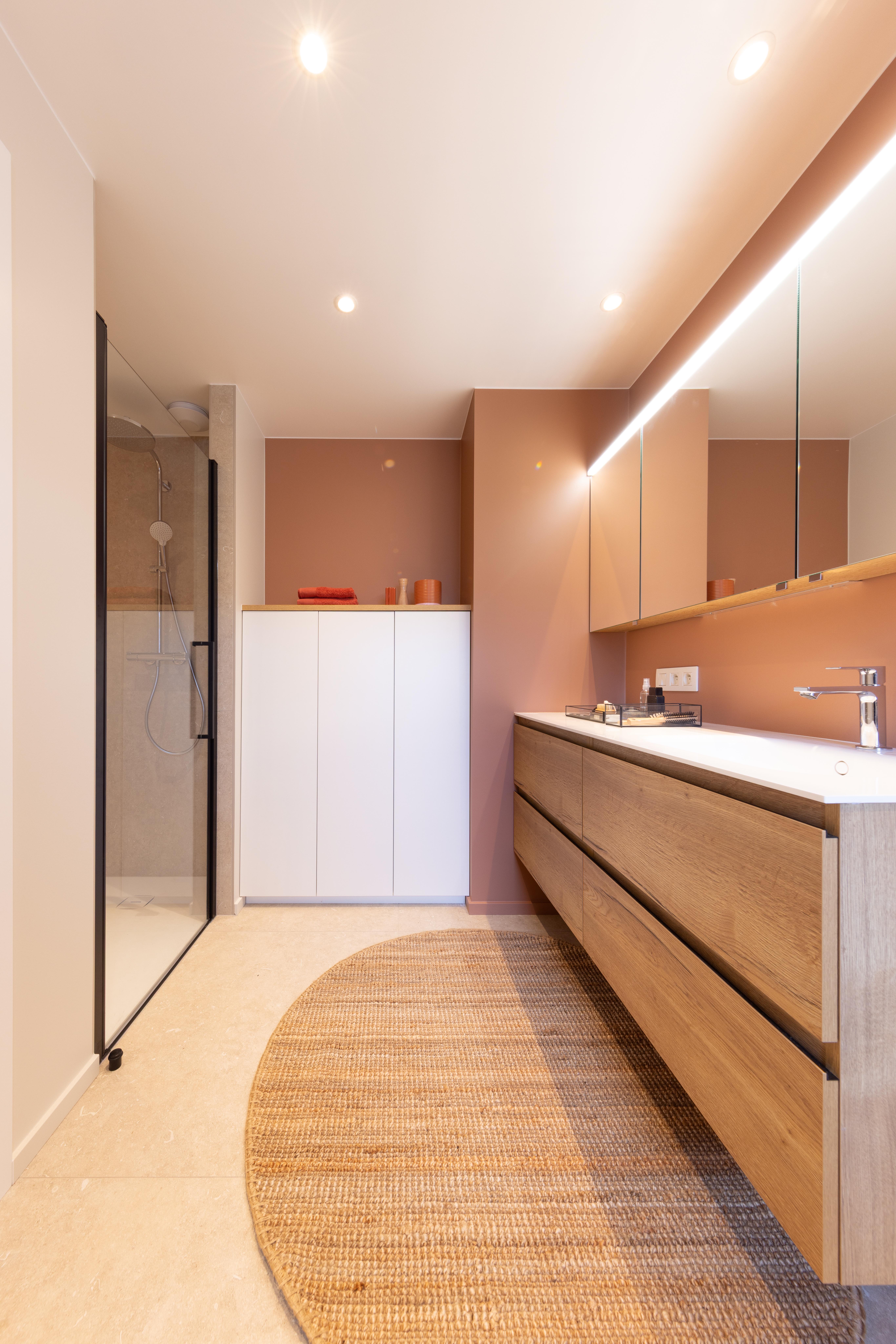 Projet dans lequel il était important d'apporter des éléments lumineux pour mettre en valeur chaque zone. La douche est éclairée de manière subtile et apporte une atmosphère très chaleureuse. Une salle de bains design et chaleureuse, comme on les aime !