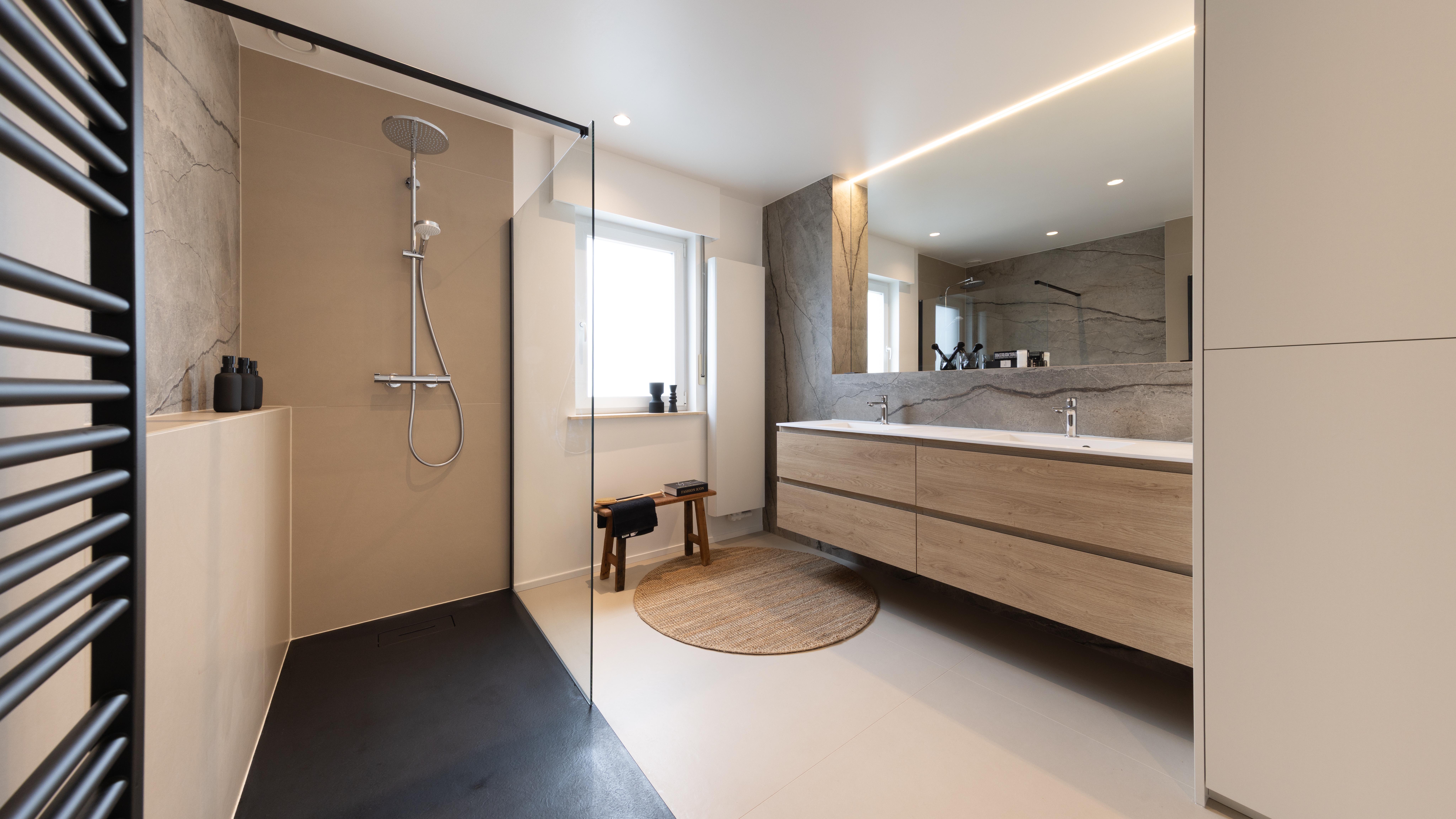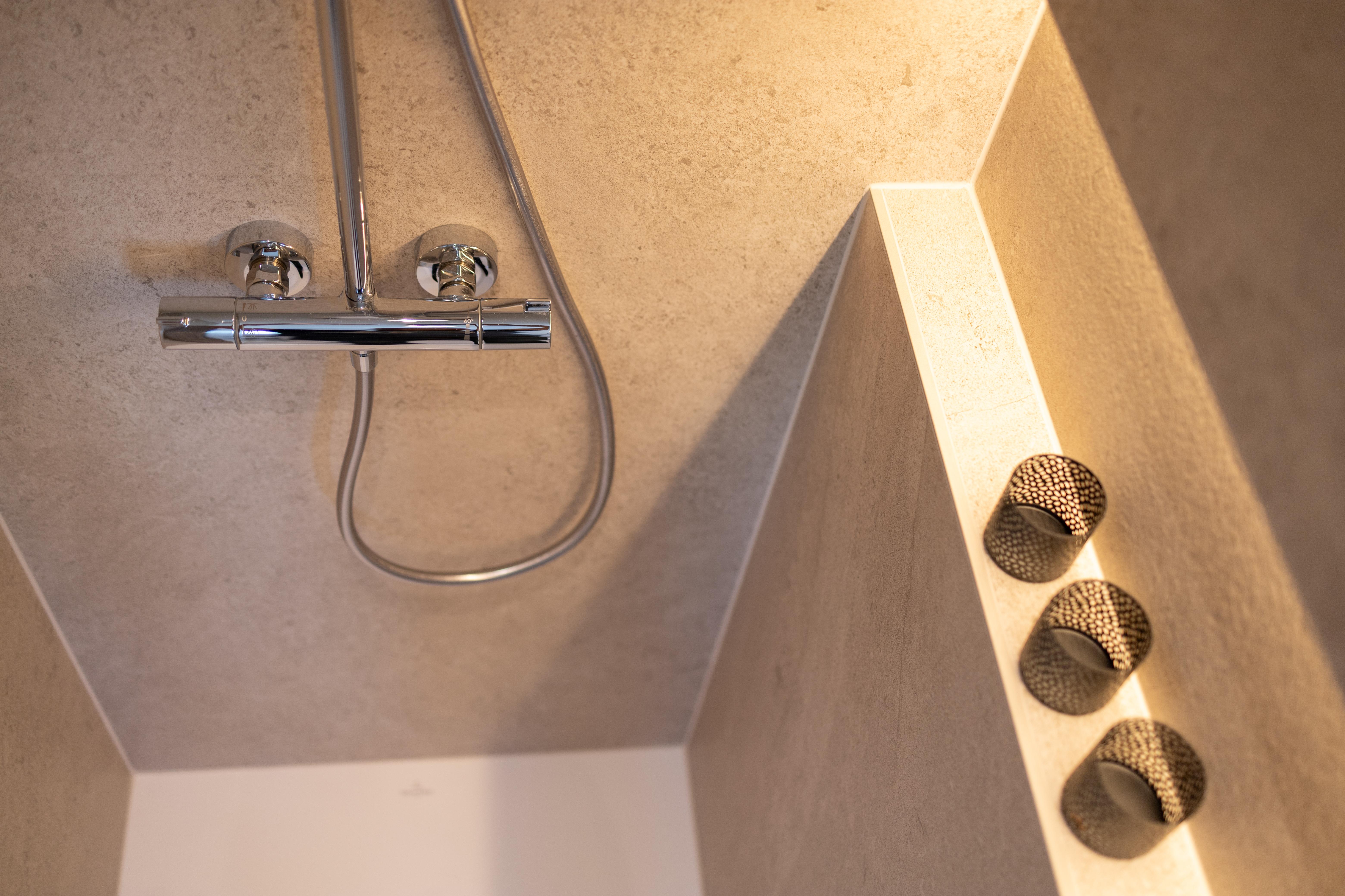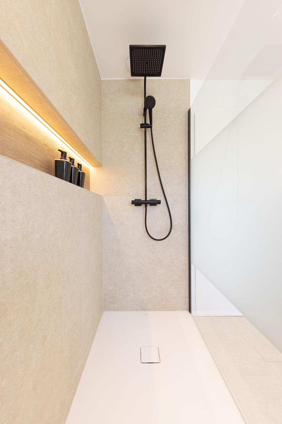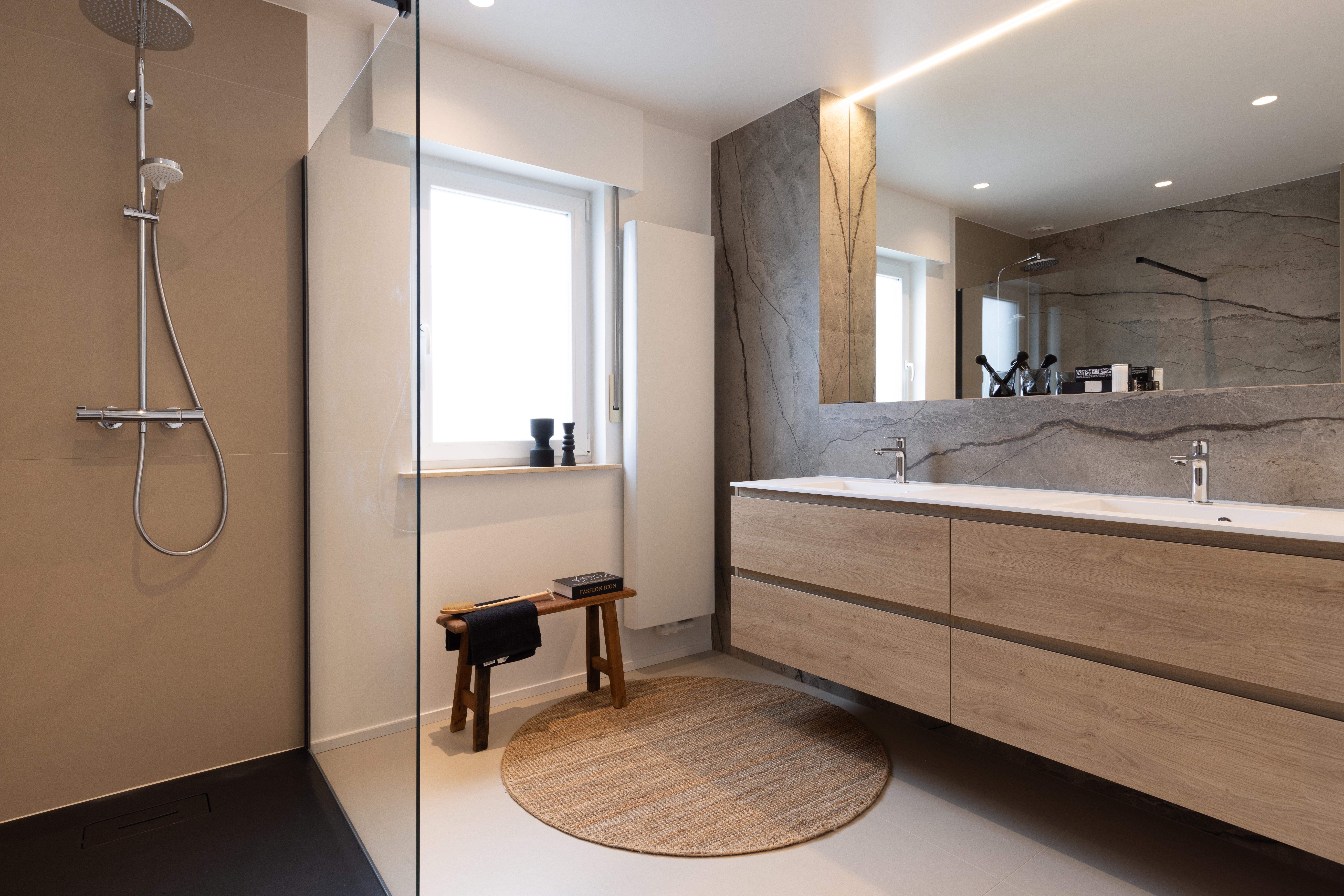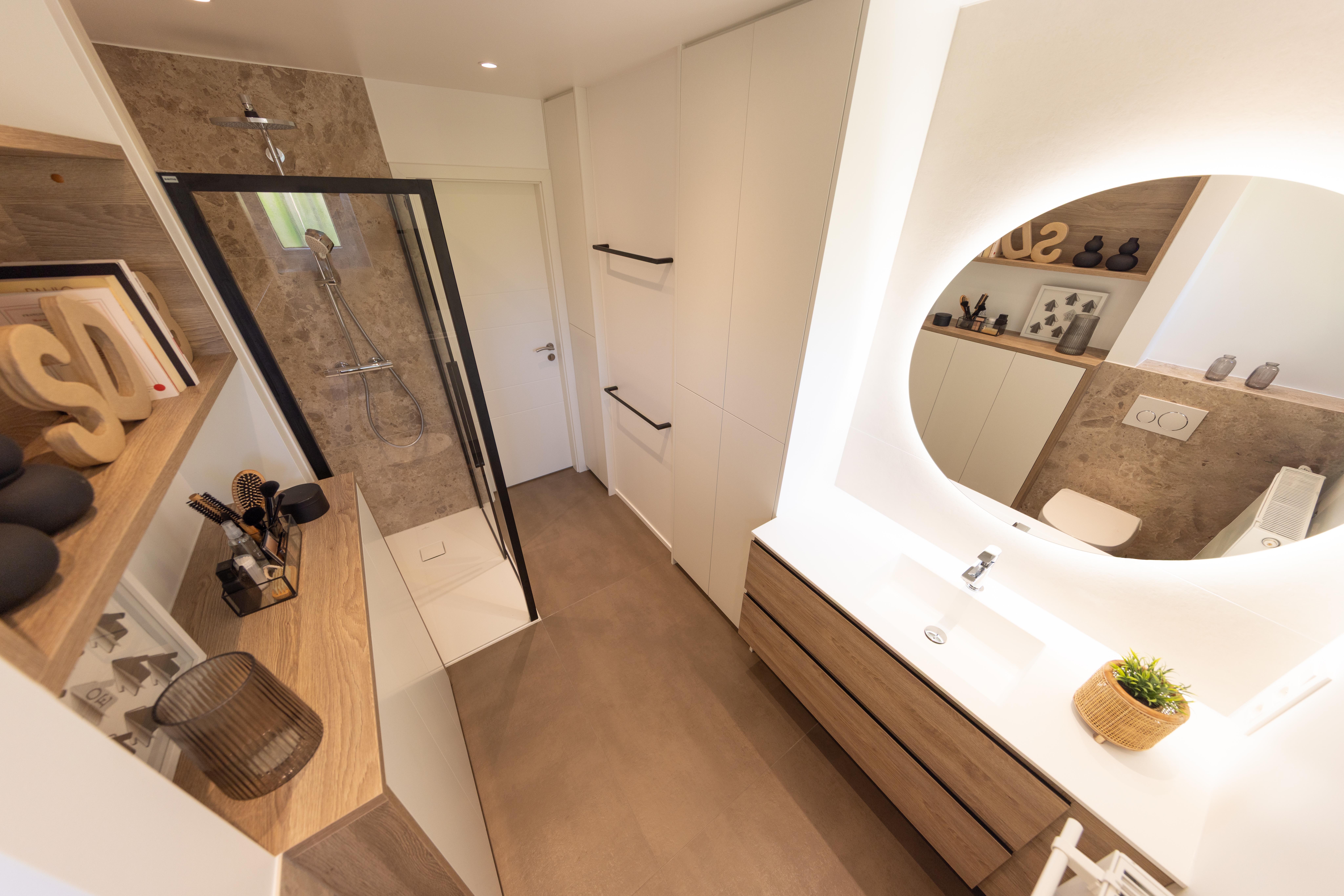 Projet dans lequel il était important d'apporter des éléments lumineux pour mettre en valeur chaque zone. La douche est éclairée de manière subtile et apporte une atmosphère très chaleureuse. Une salle de bains design et chaleureuse, comme on les aime !