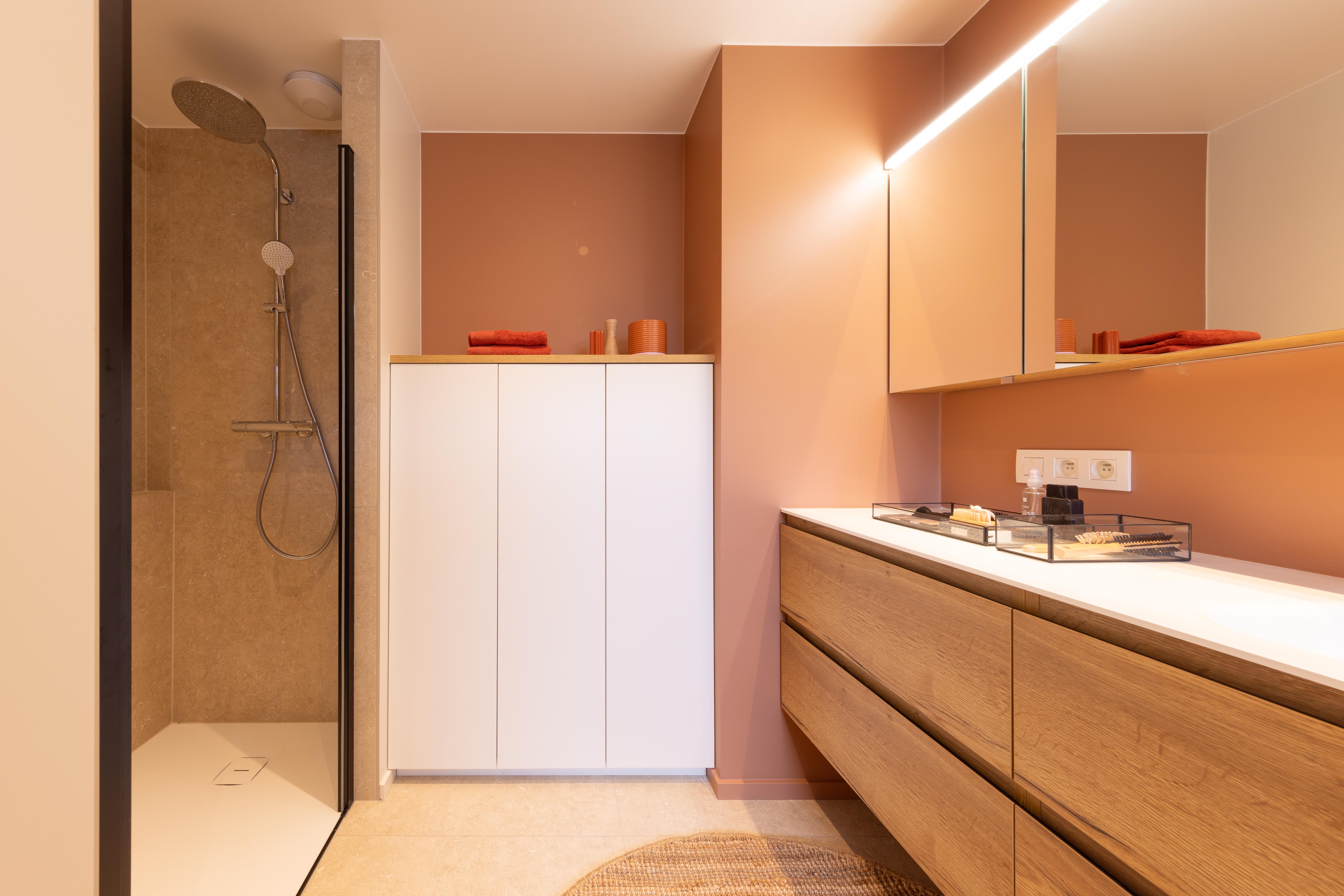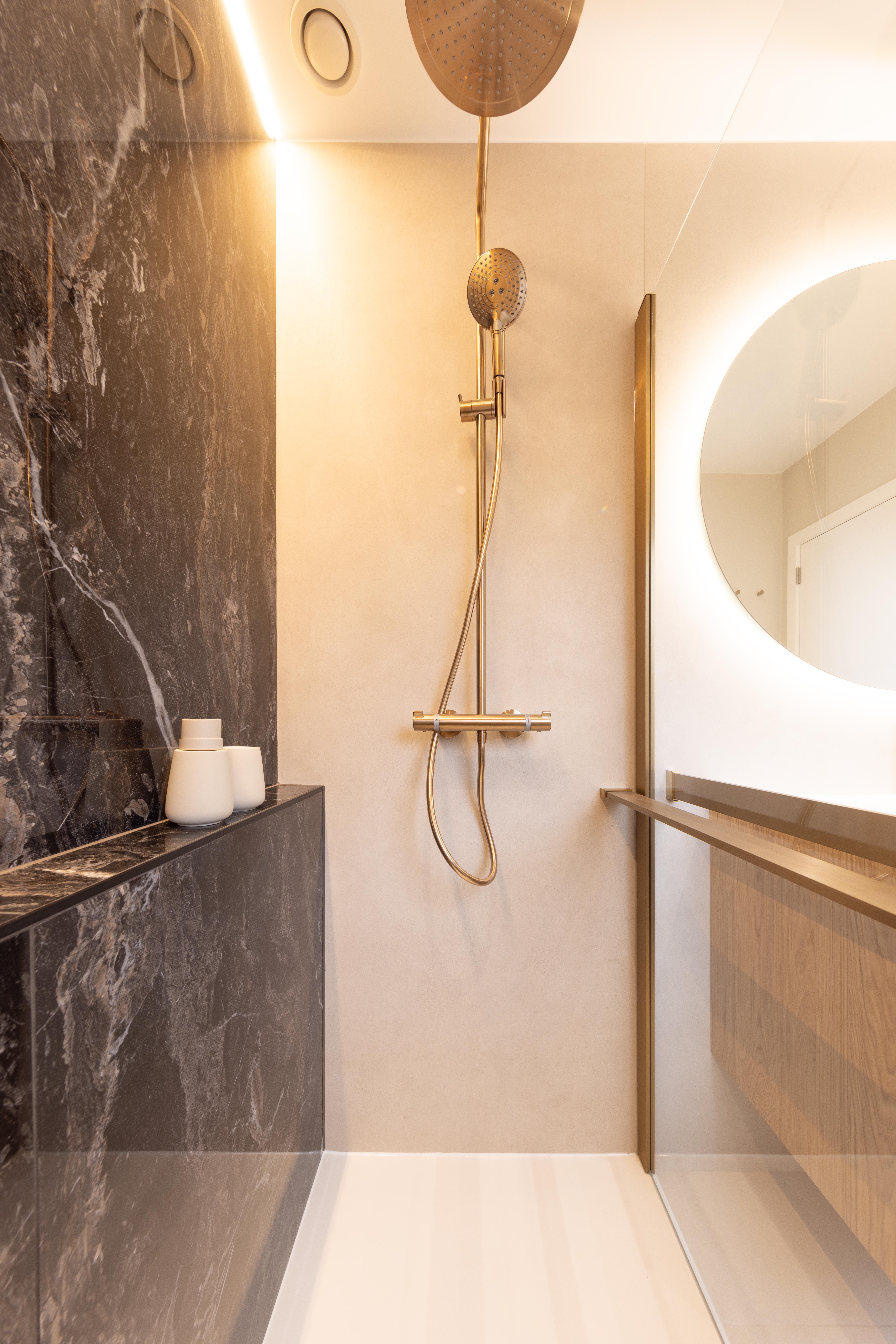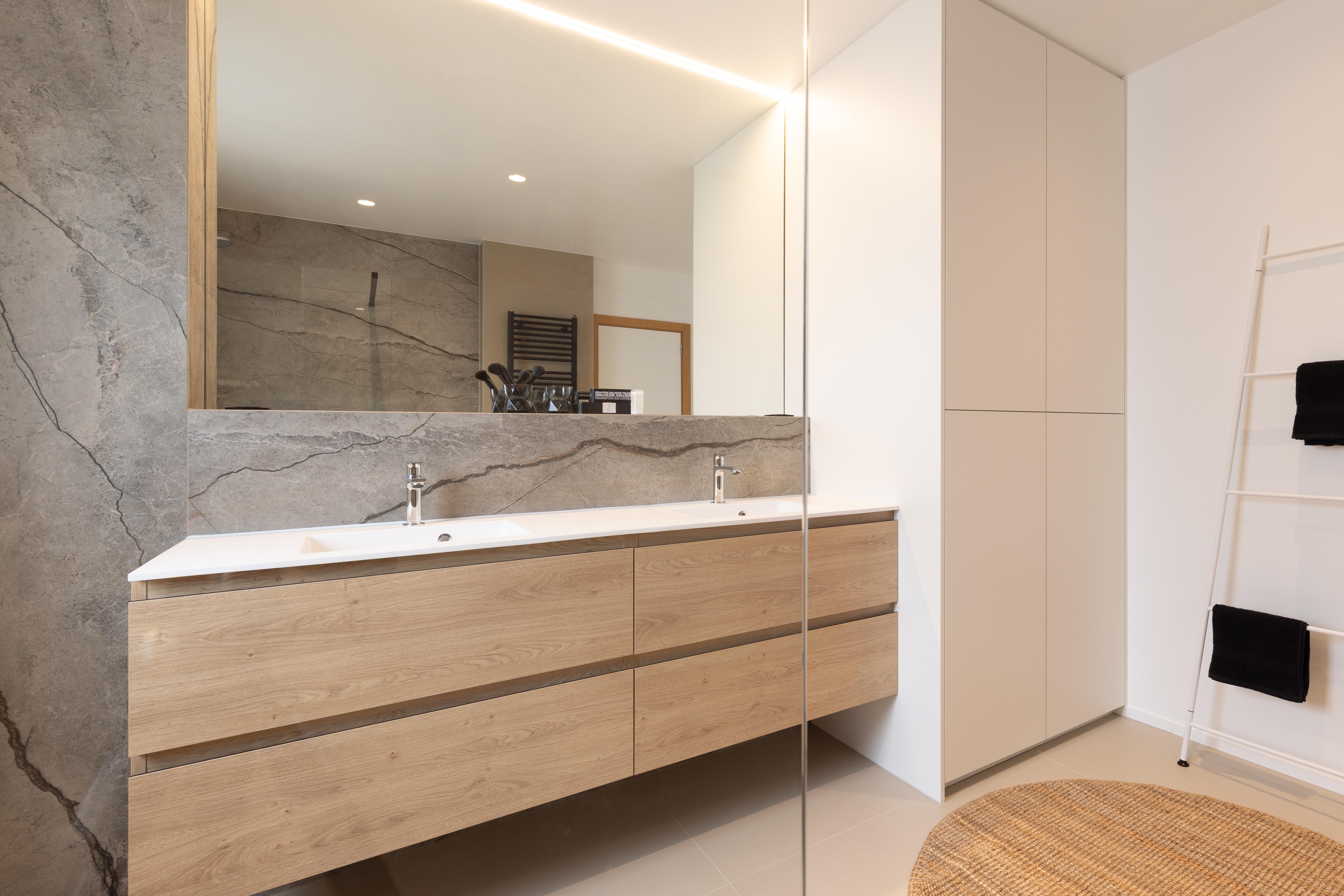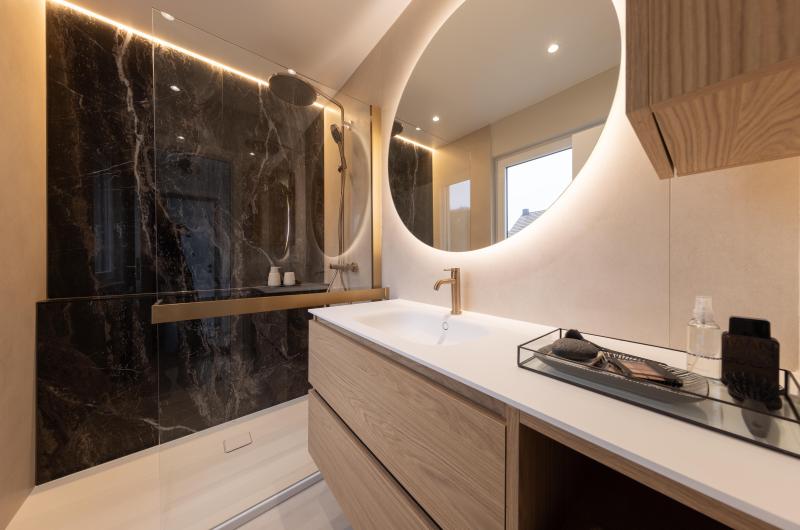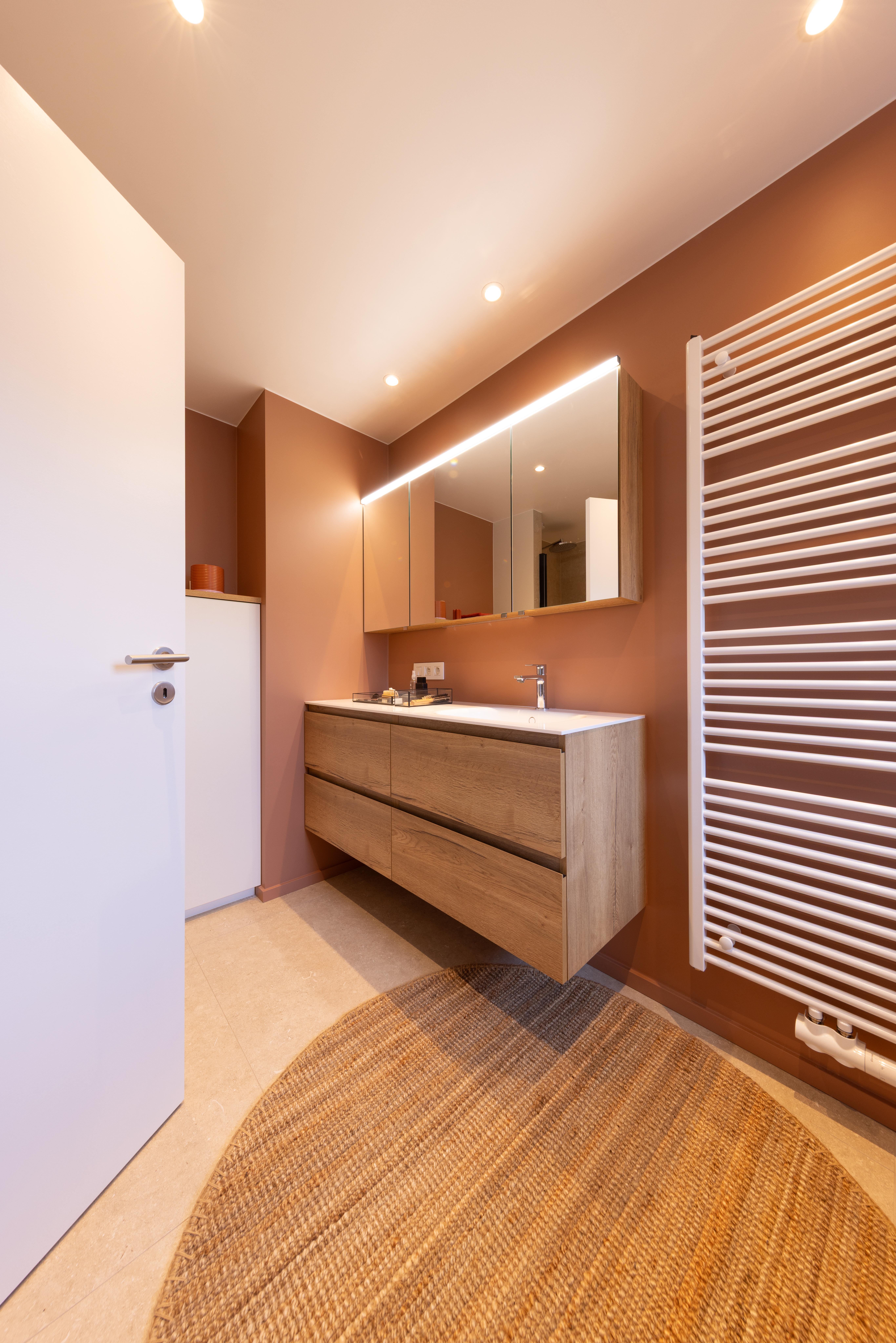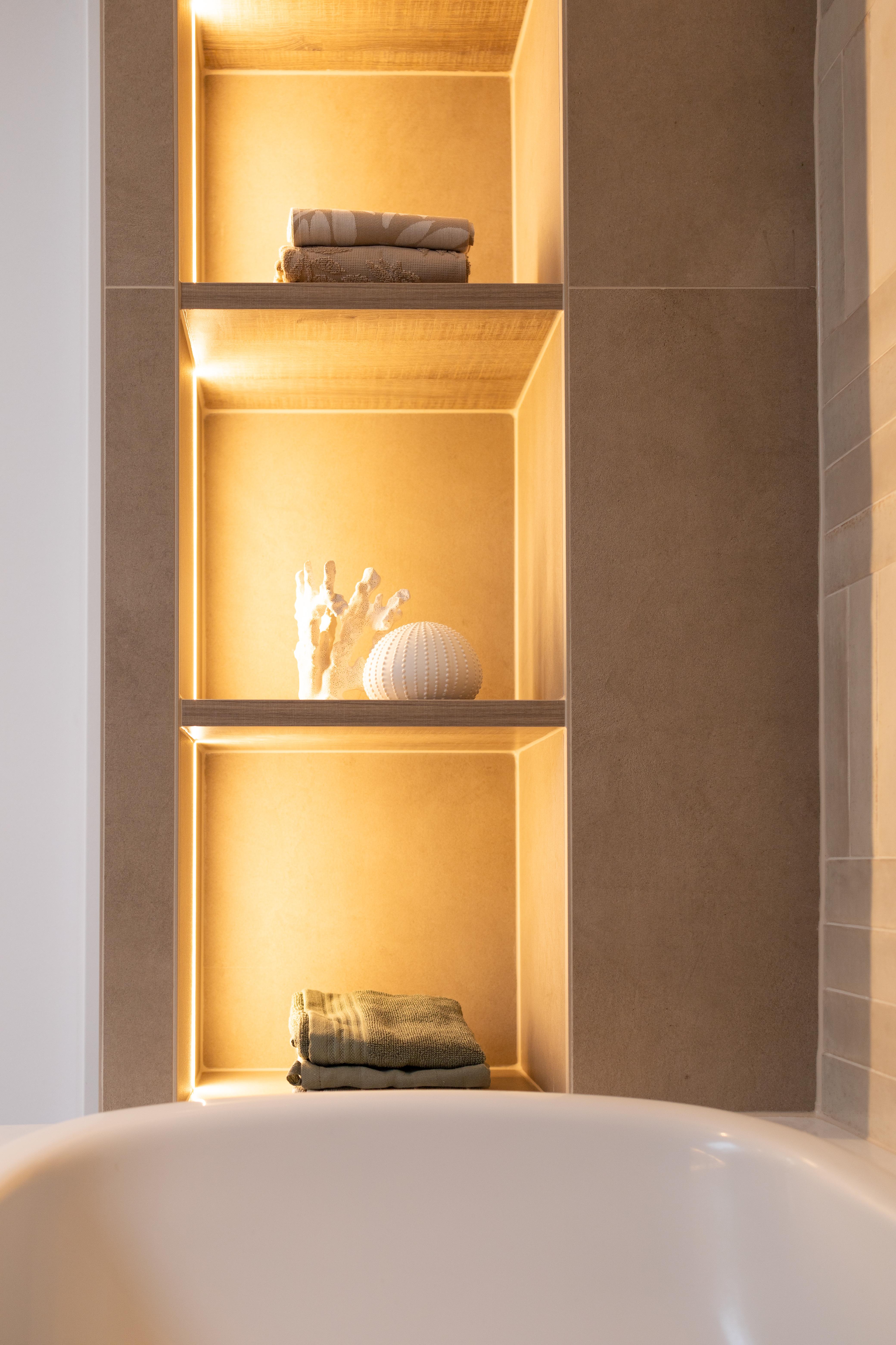 Projet dans lequel il était important d'apporter des éléments lumineux pour mettre en valeur chaque zone. La douche est éclairée de manière subtile et apporte une atmosphère très chaleureuse. Une salle de bains design et chaleureuse, comme on les aime !
