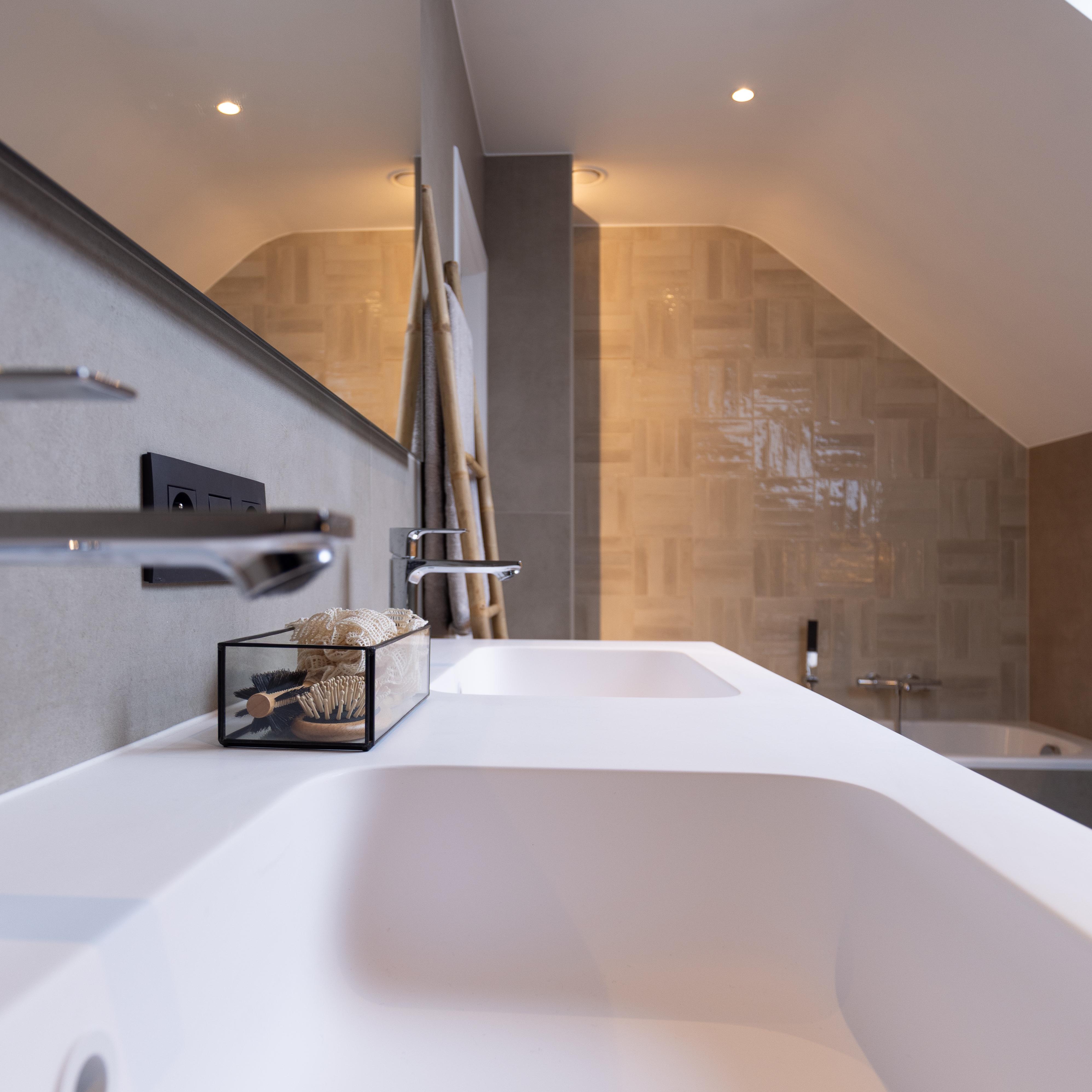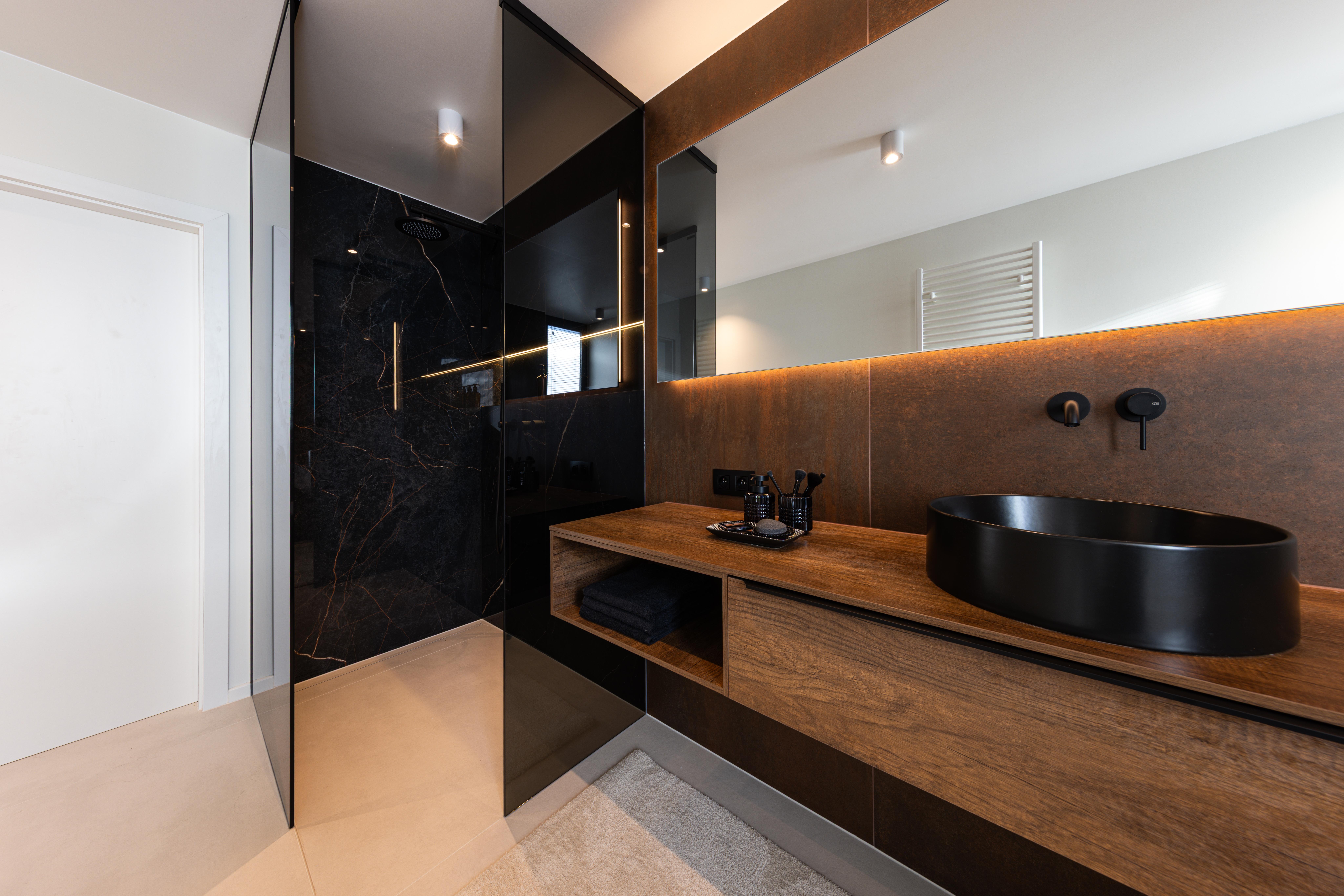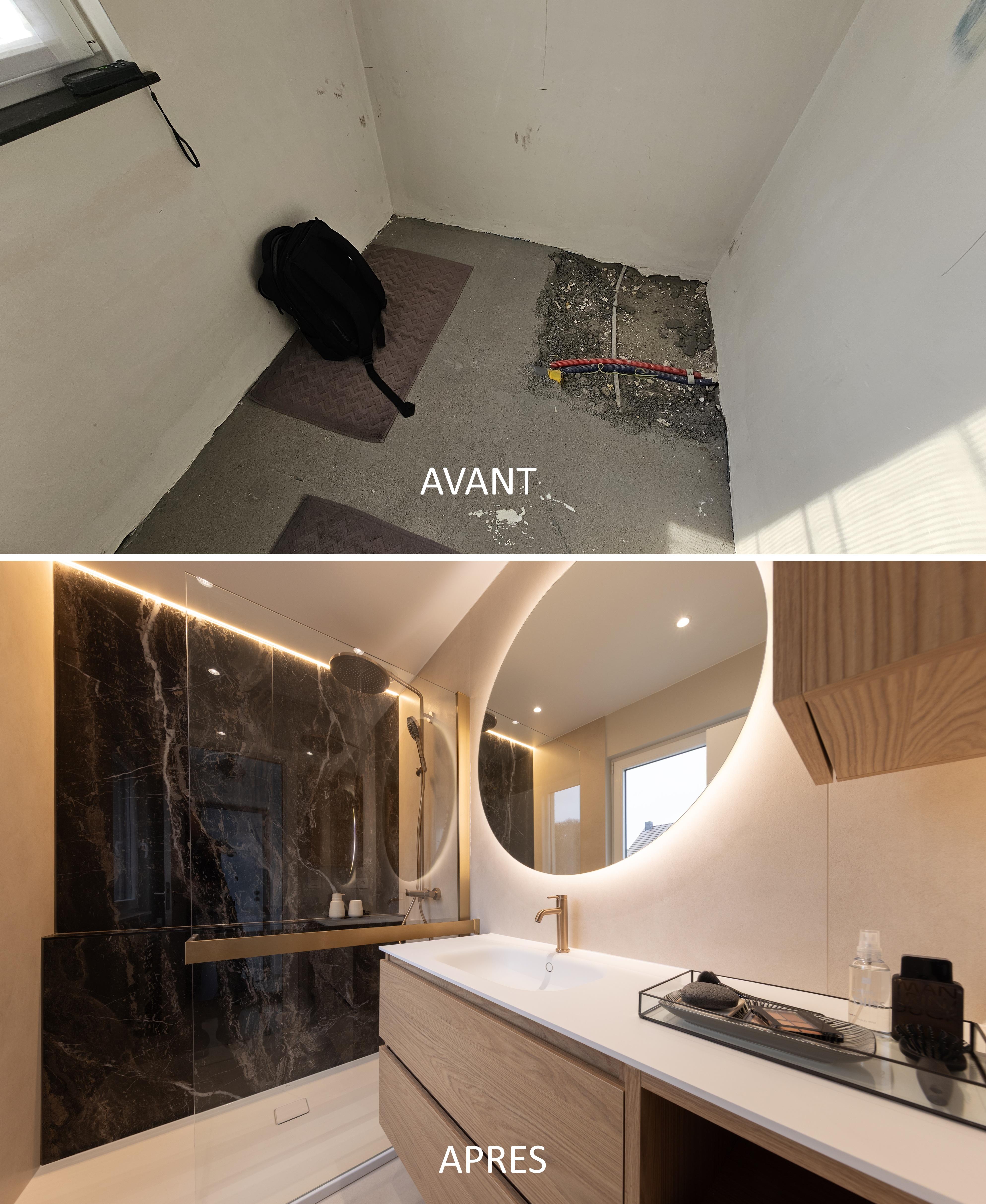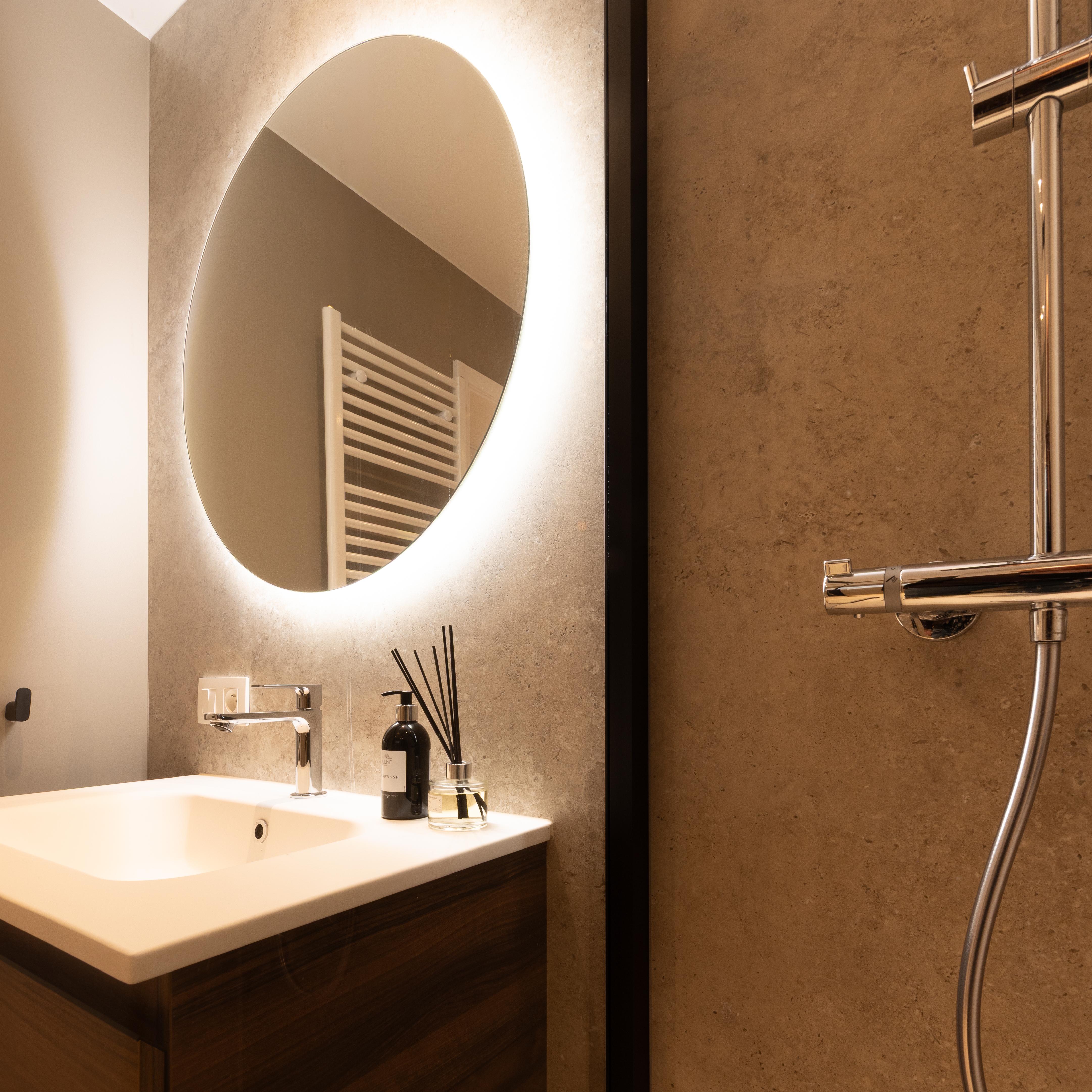 Projet dans lequel il était important d'apporter des éléments lumineux pour mettre en valeur chaque zone. La douche est éclairée de manière subtile et apporte une atmosphère très chaleureuse. Une salle de bains design et chaleureuse, comme on les aime !