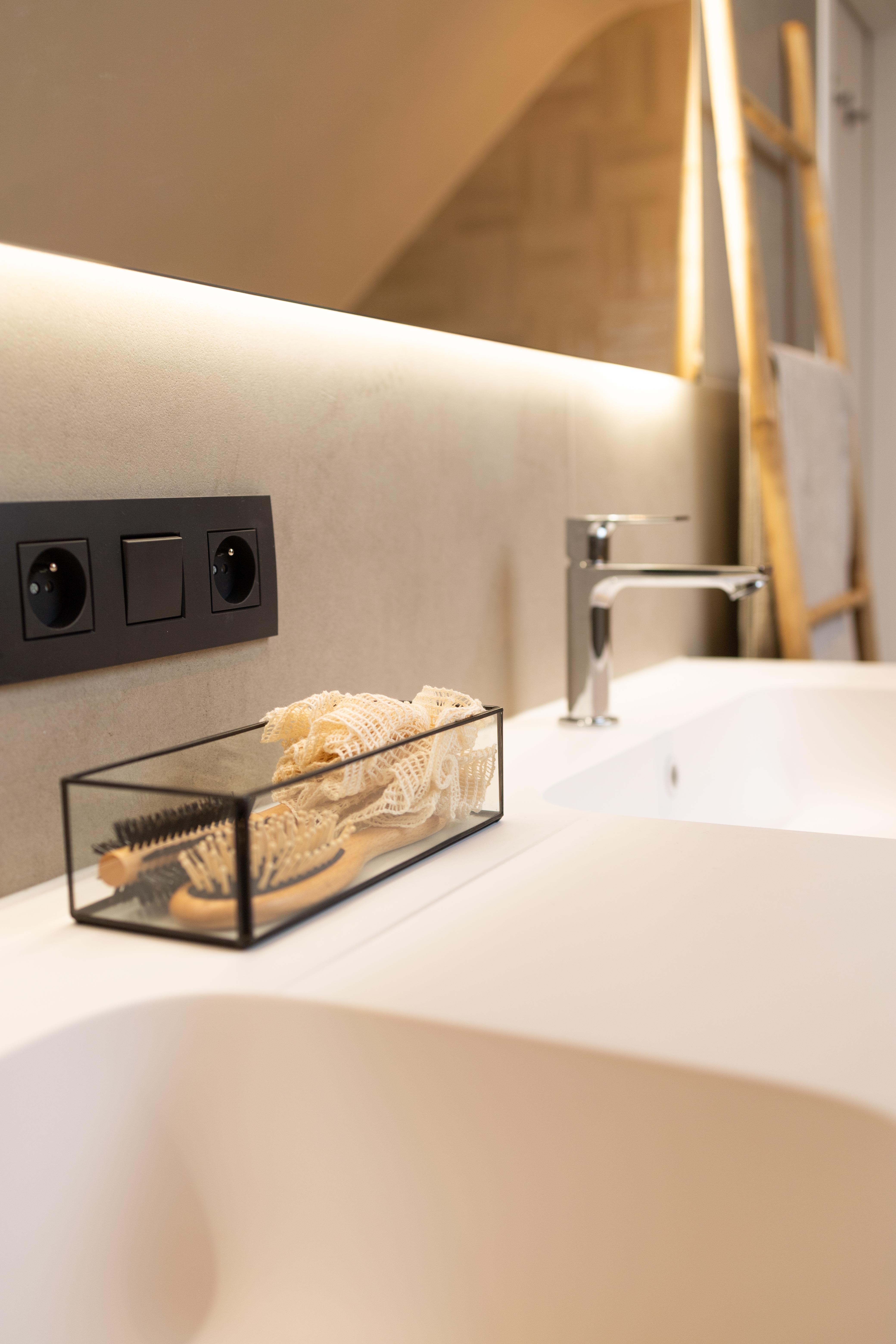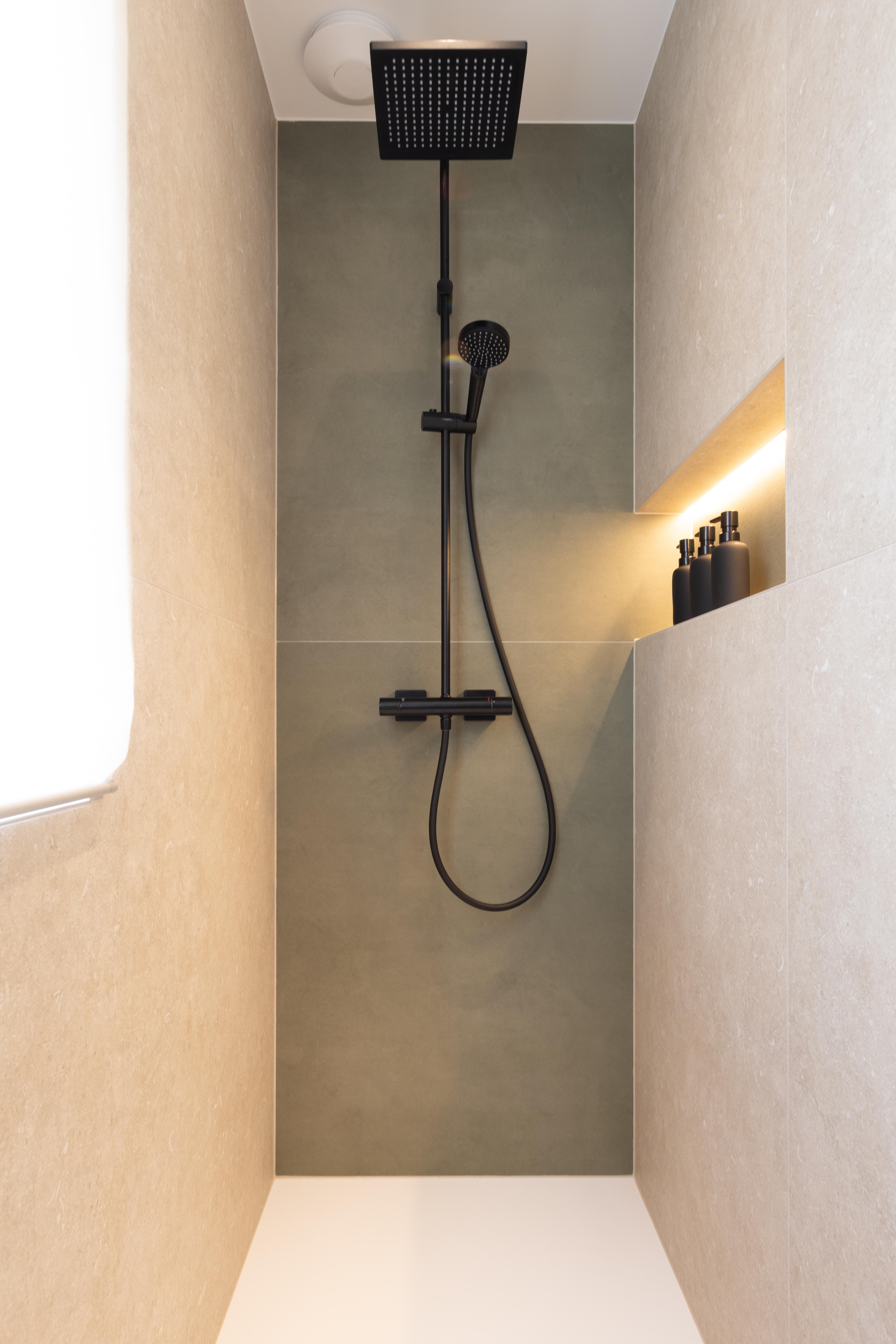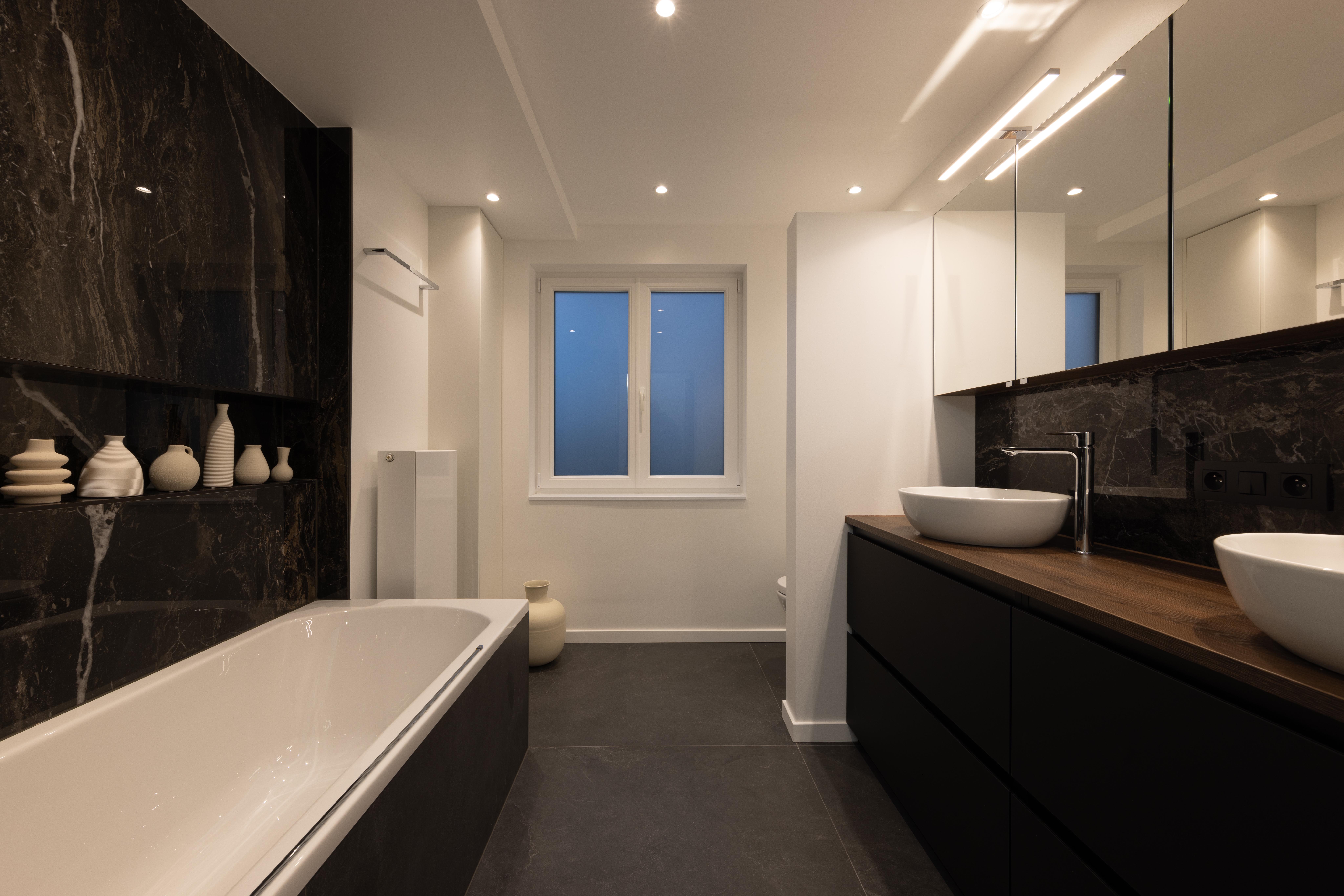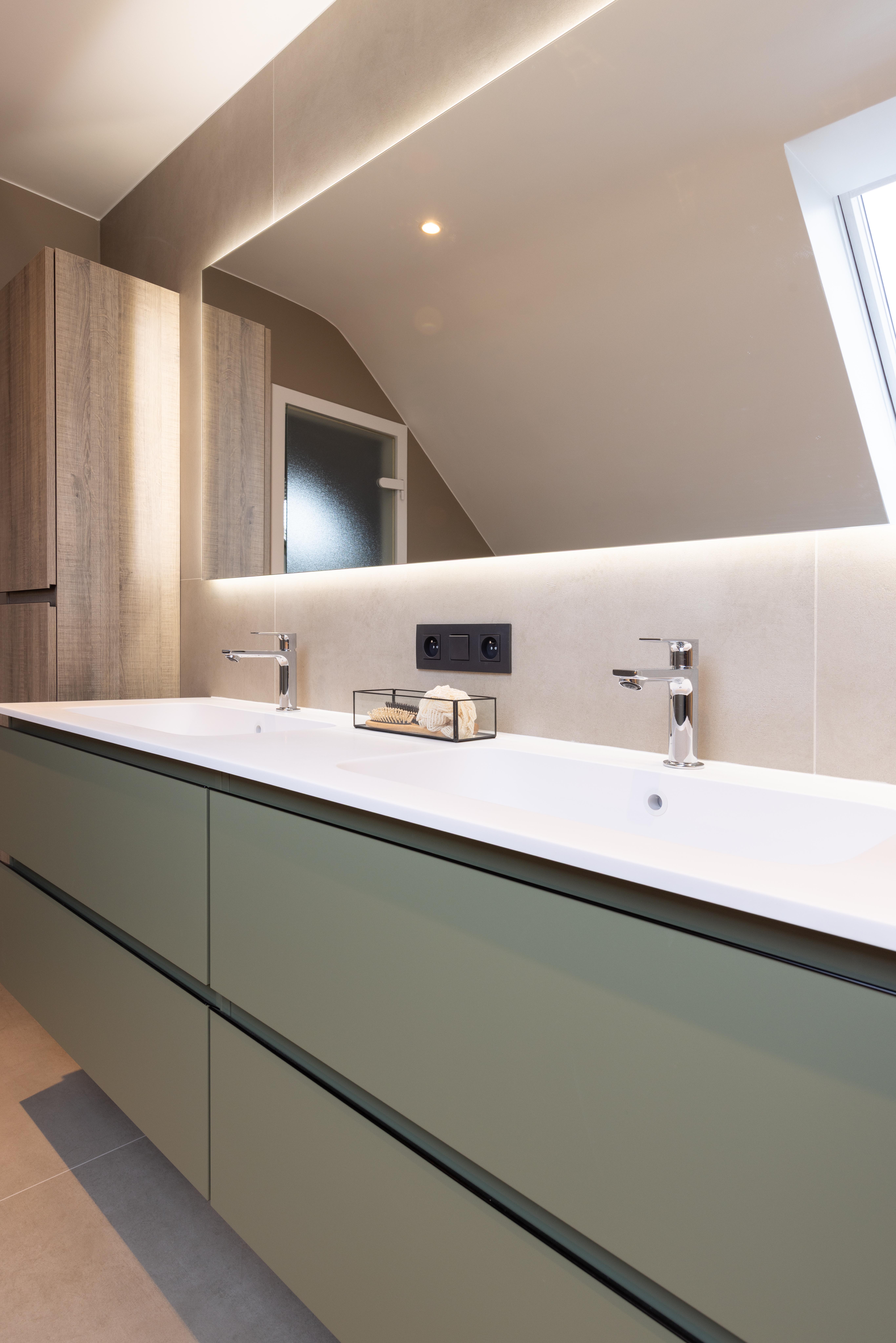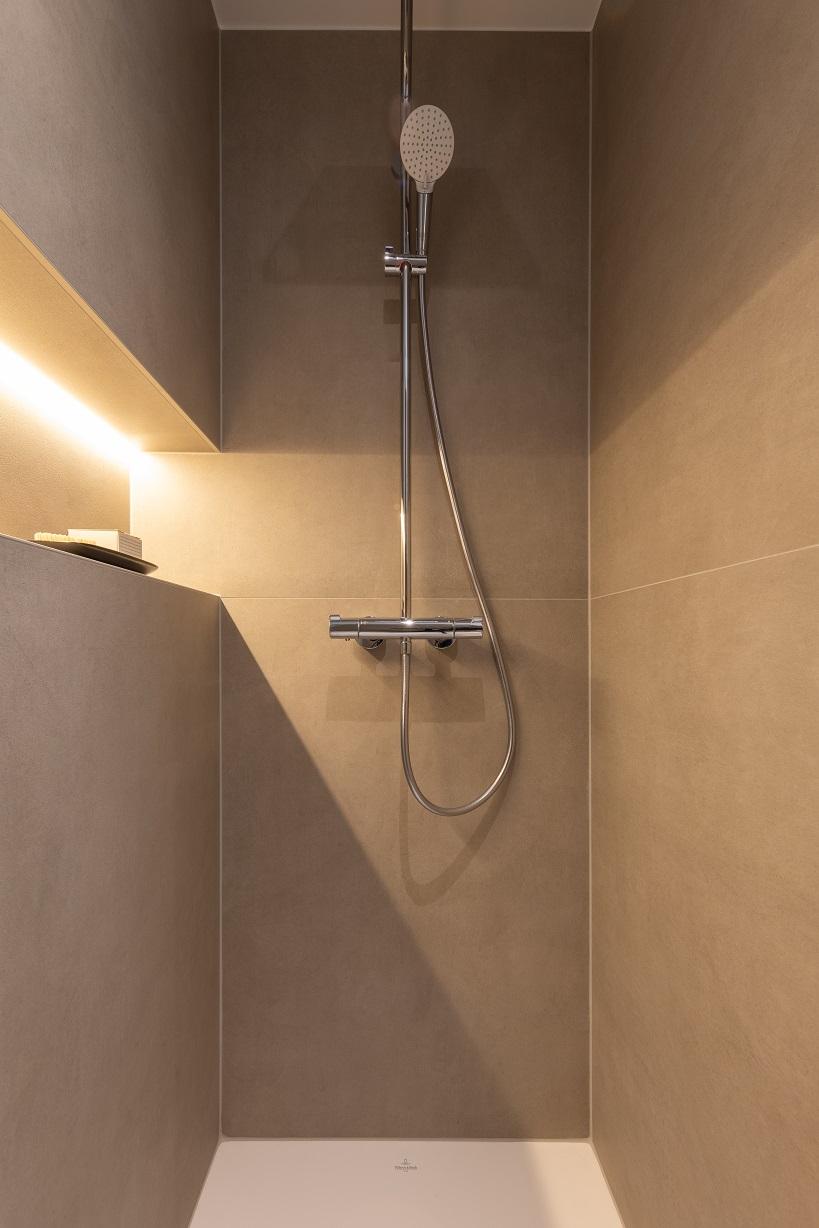 Projet dans lequel il était important d'apporter des éléments lumineux pour mettre en valeur chaque zone. La douche est éclairée de manière subtile et apporte une atmosphère très chaleureuse. Une salle de bains design et chaleureuse, comme on les aime !