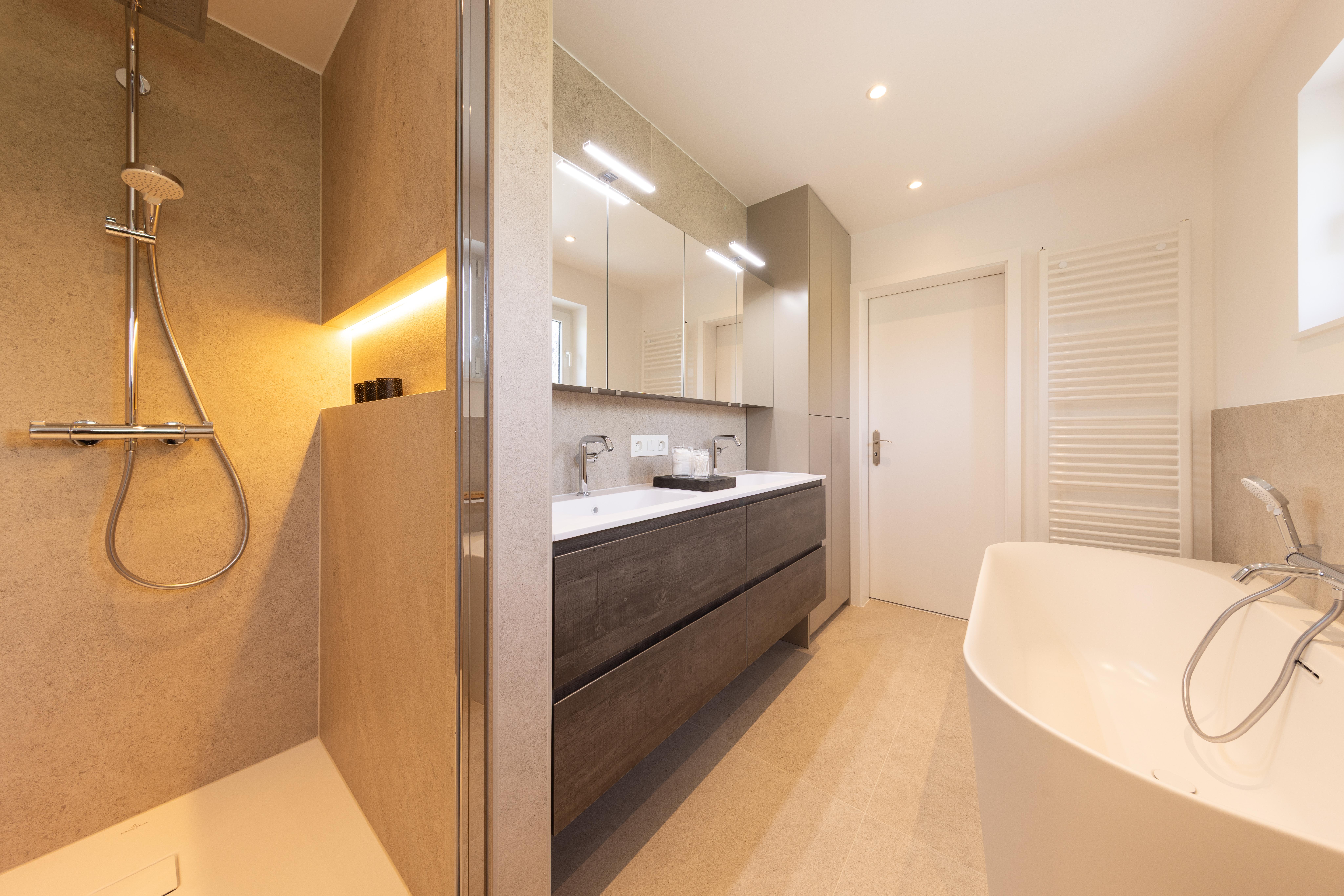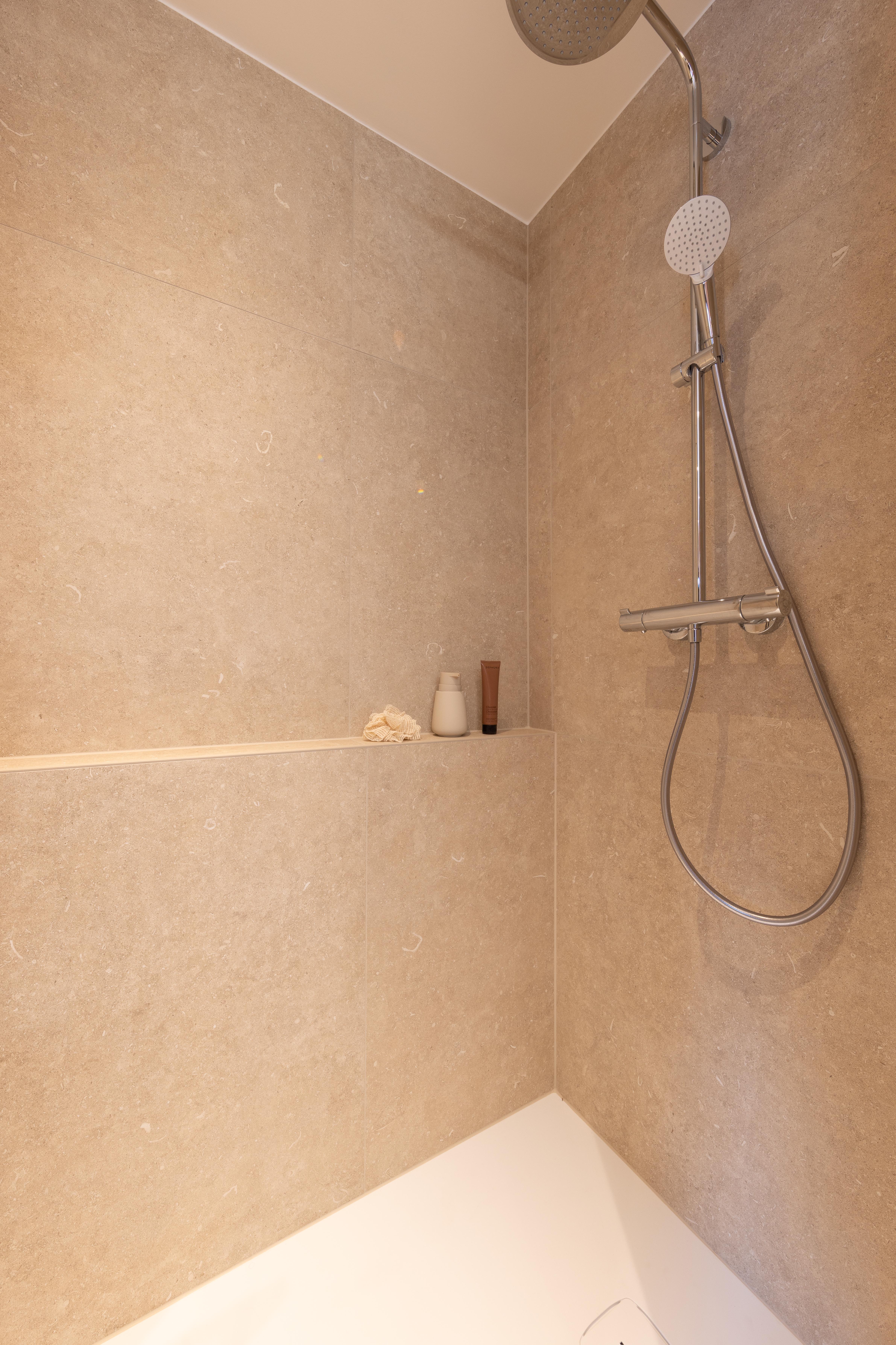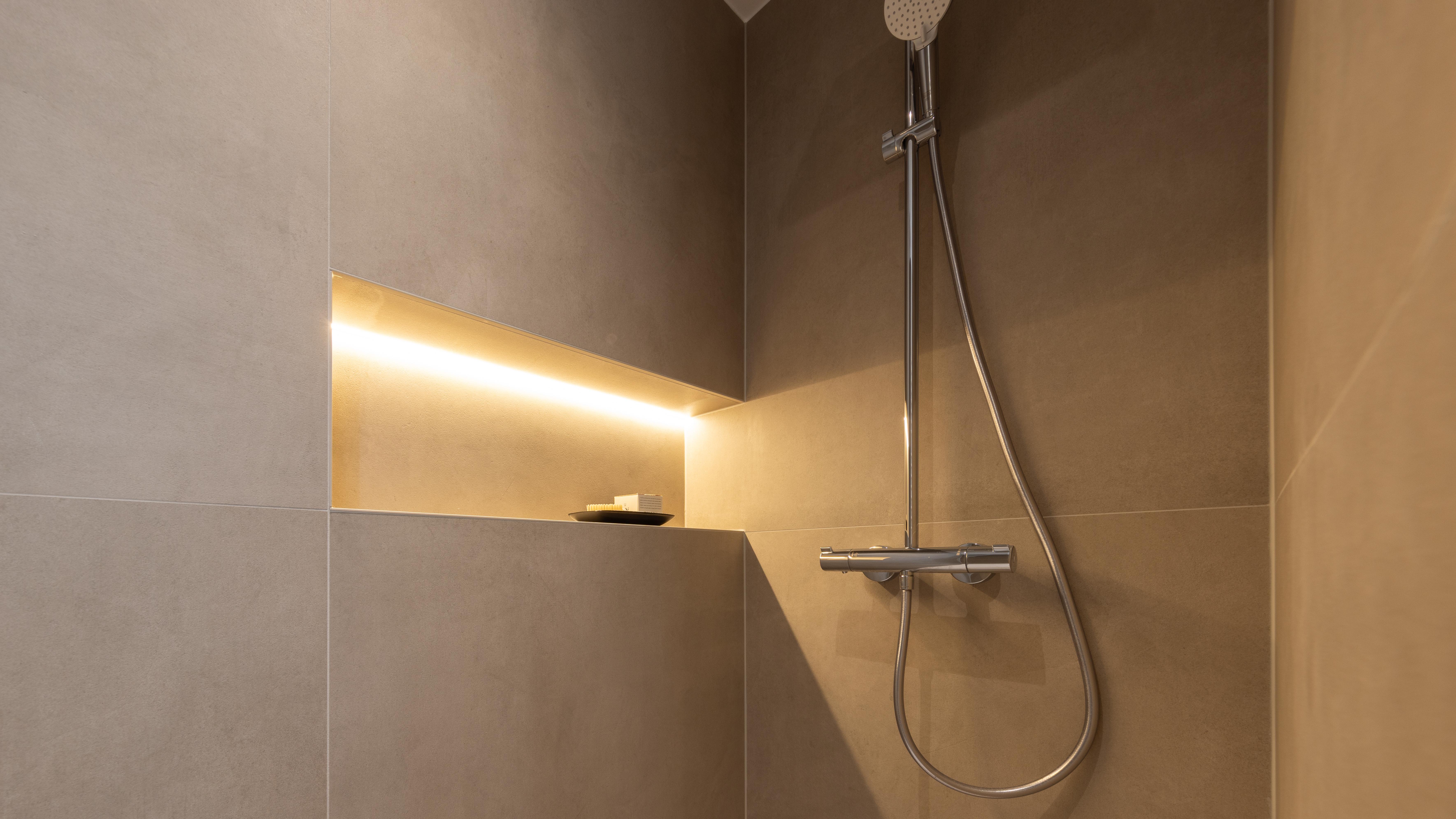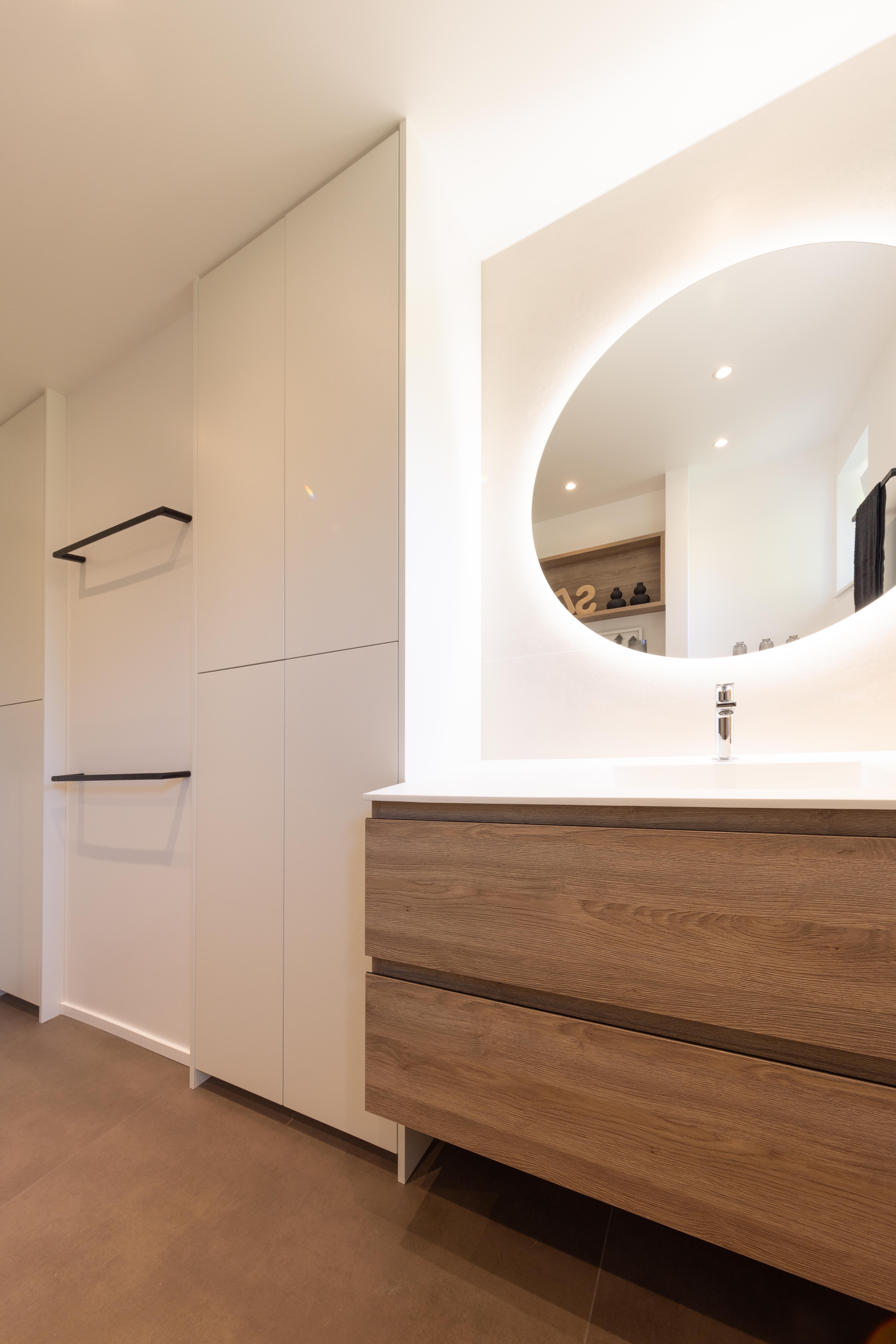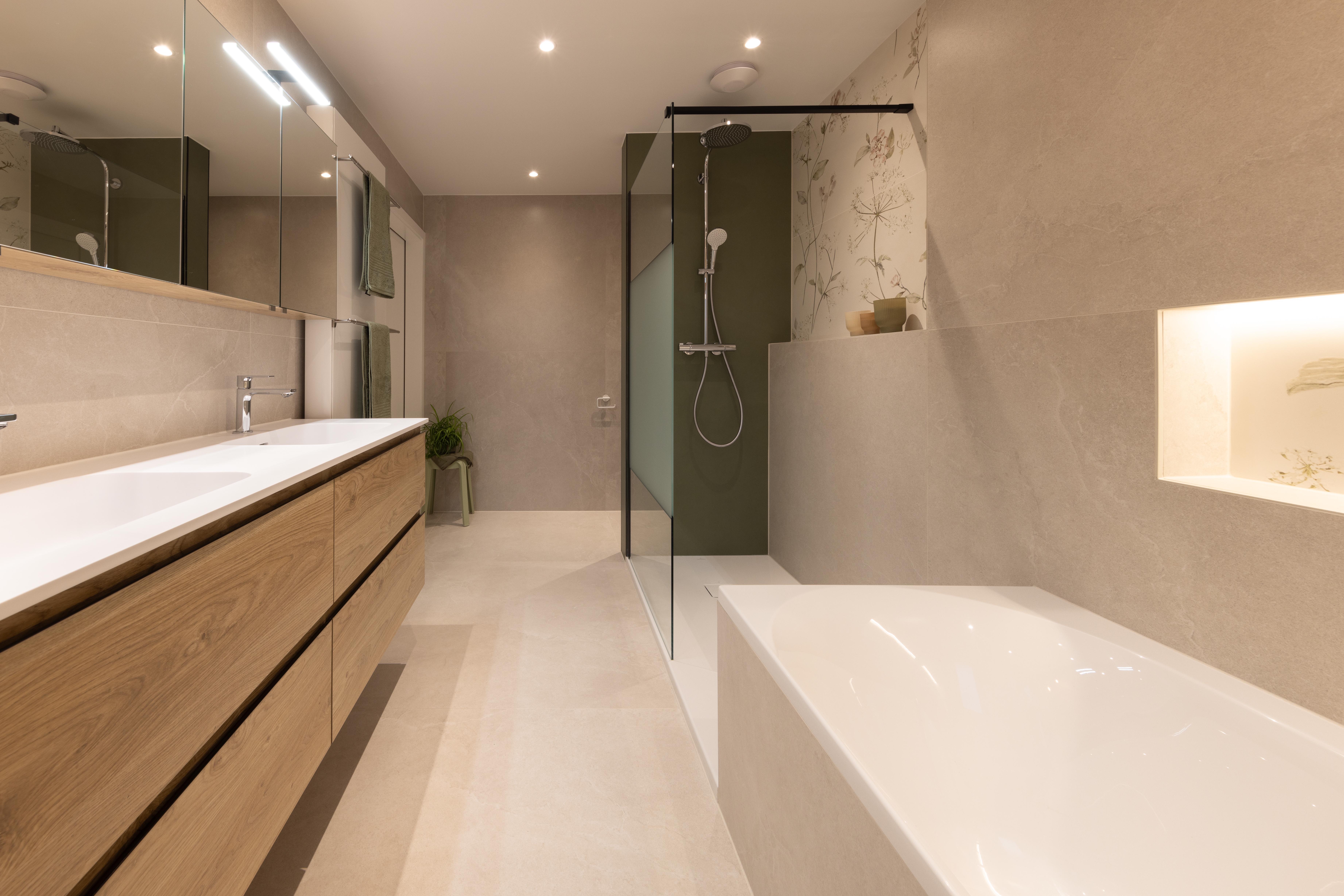 Projet dans lequel il était important d'apporter des éléments lumineux pour mettre en valeur chaque zone. La douche est éclairée de manière subtile et apporte une atmosphère très chaleureuse. Une salle de bains design et chaleureuse, comme on les aime !