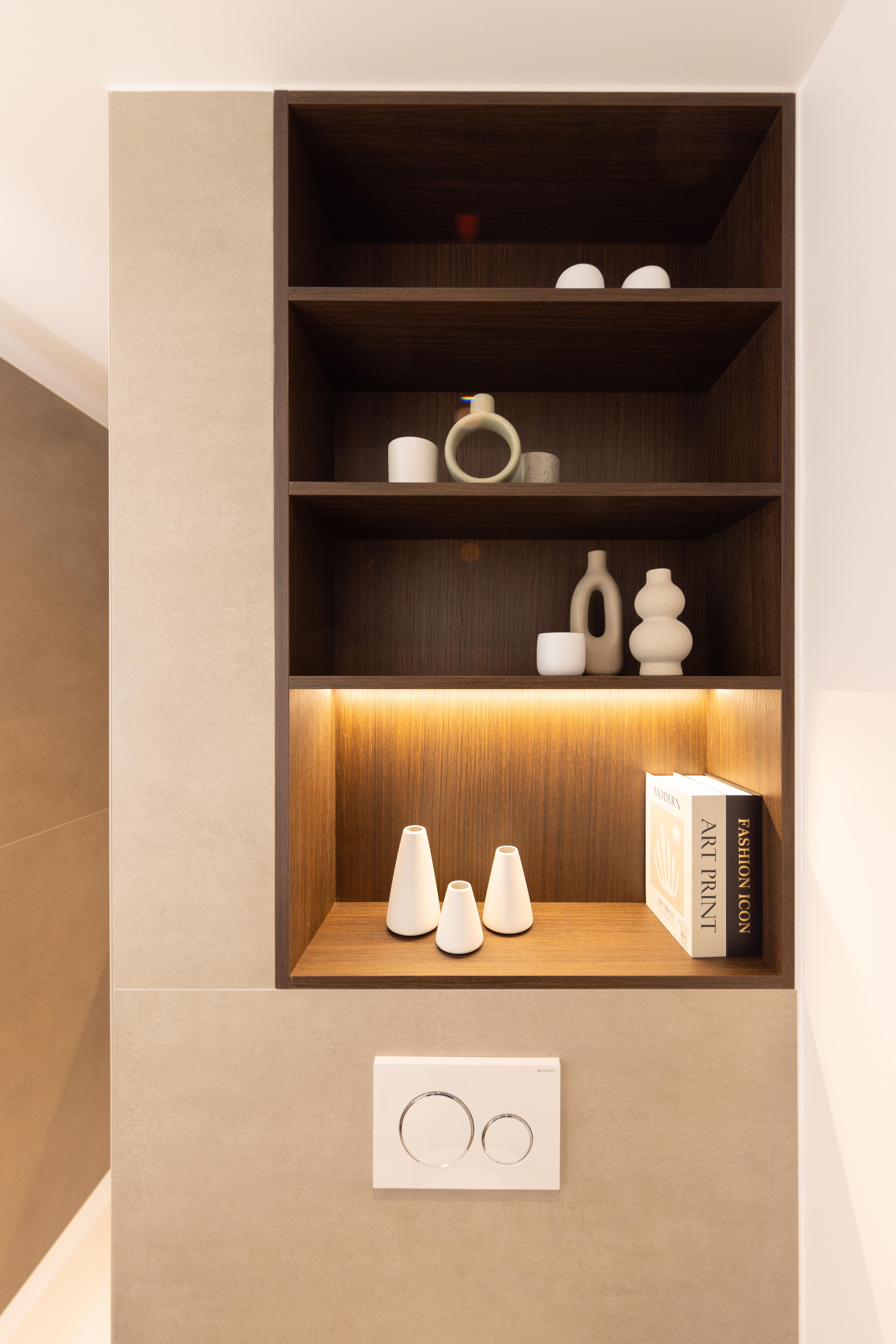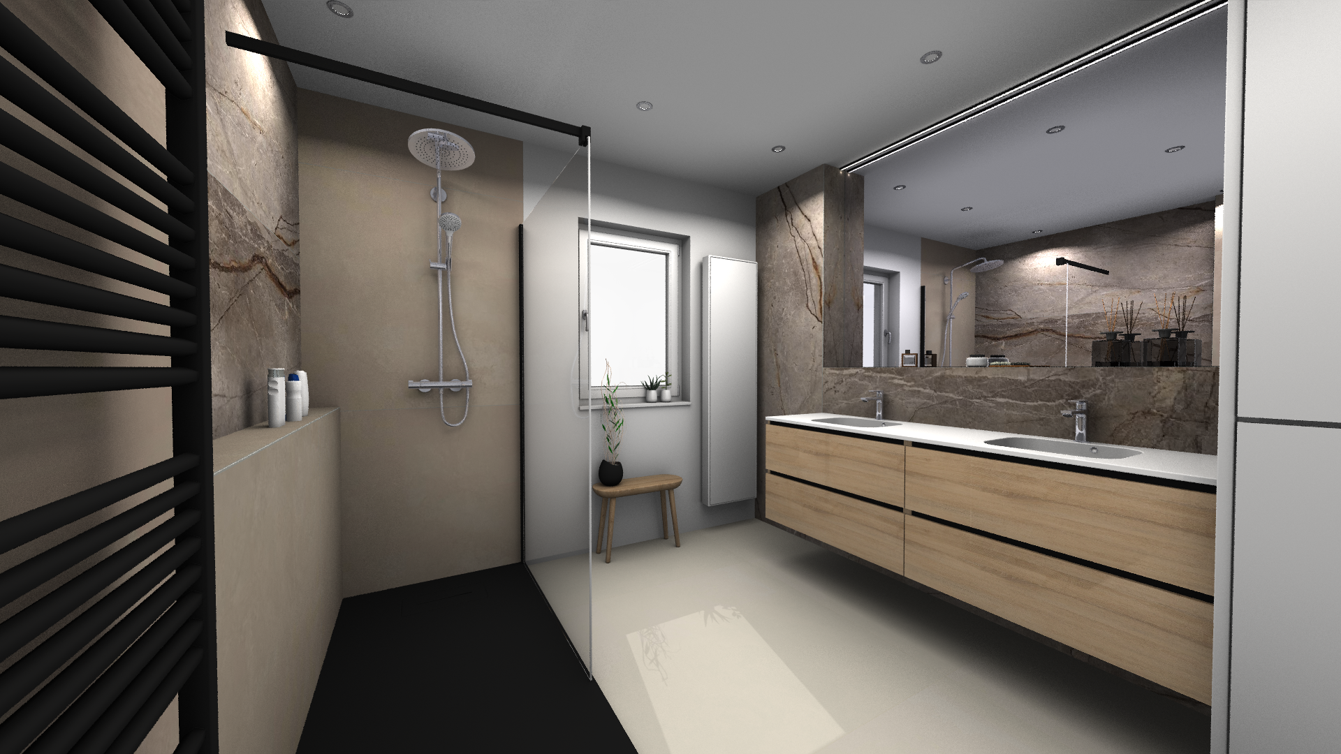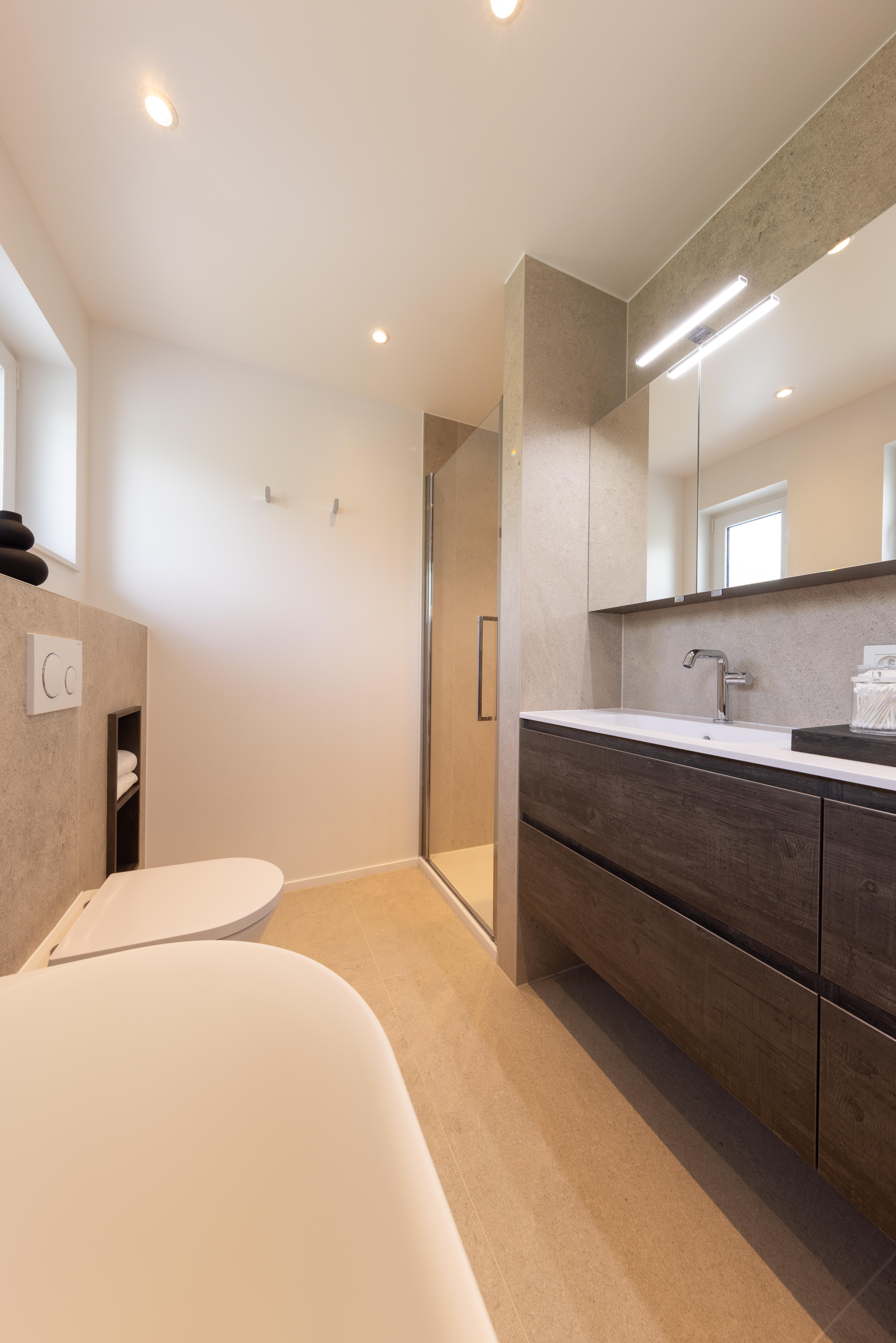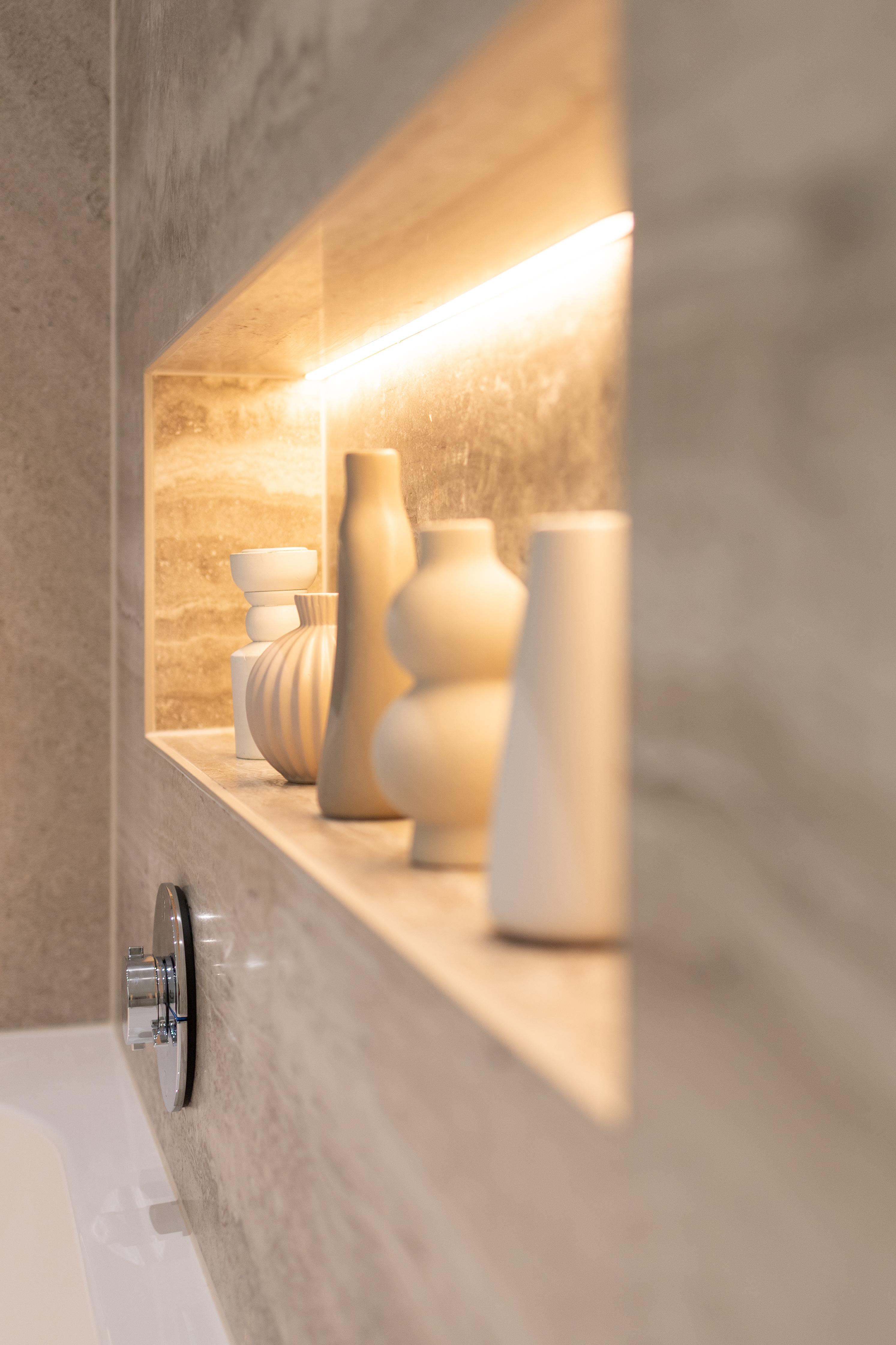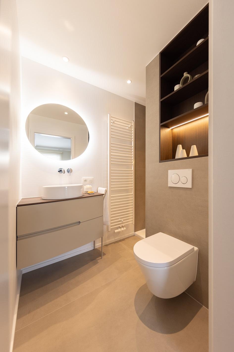 Projet dans lequel il était important d'apporter des éléments lumineux pour mettre en valeur chaque zone. La douche est éclairée de manière subtile et apporte une atmosphère très chaleureuse. Une salle de bains design et chaleureuse, comme on les aime !