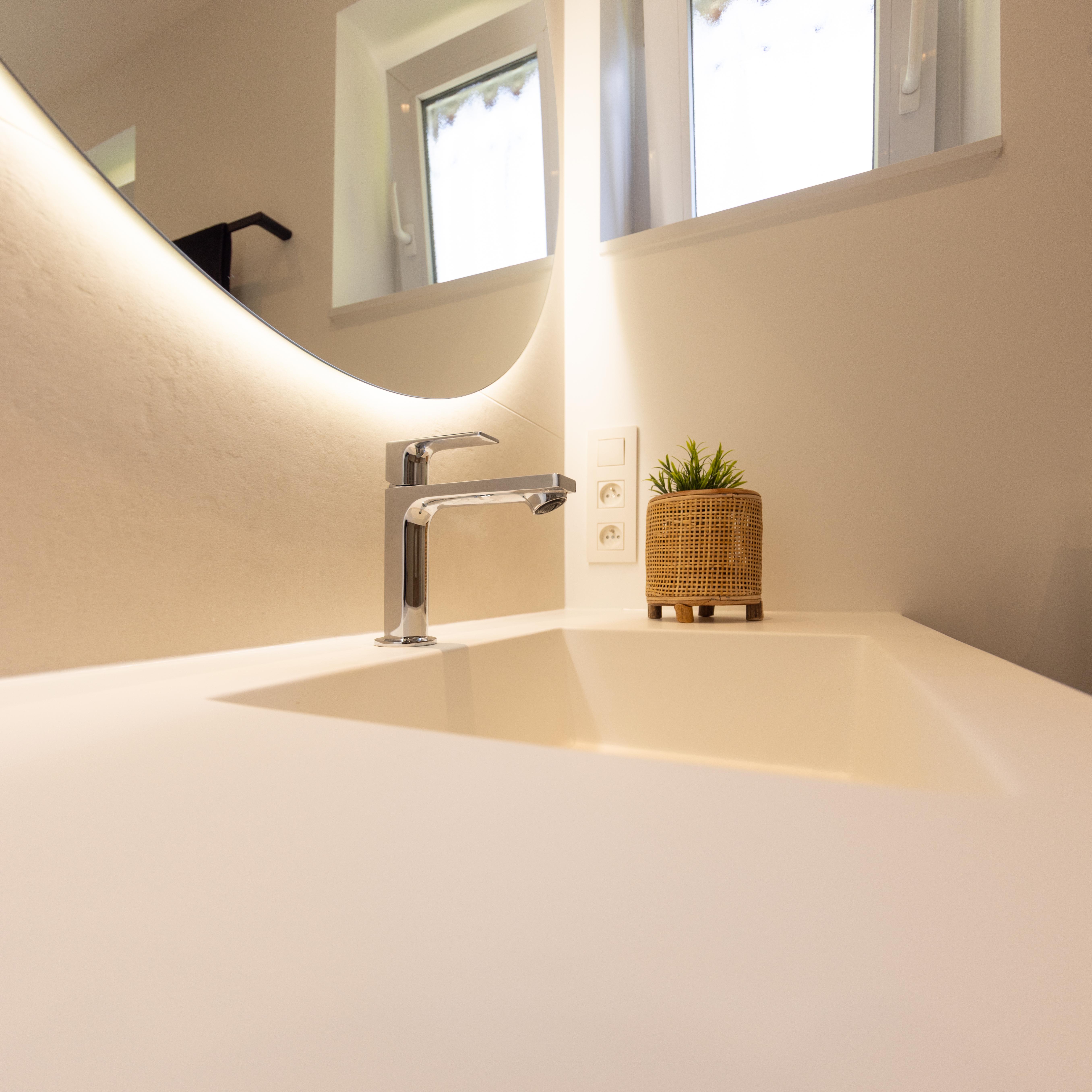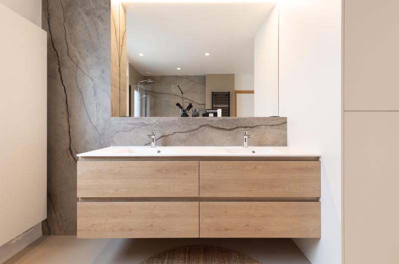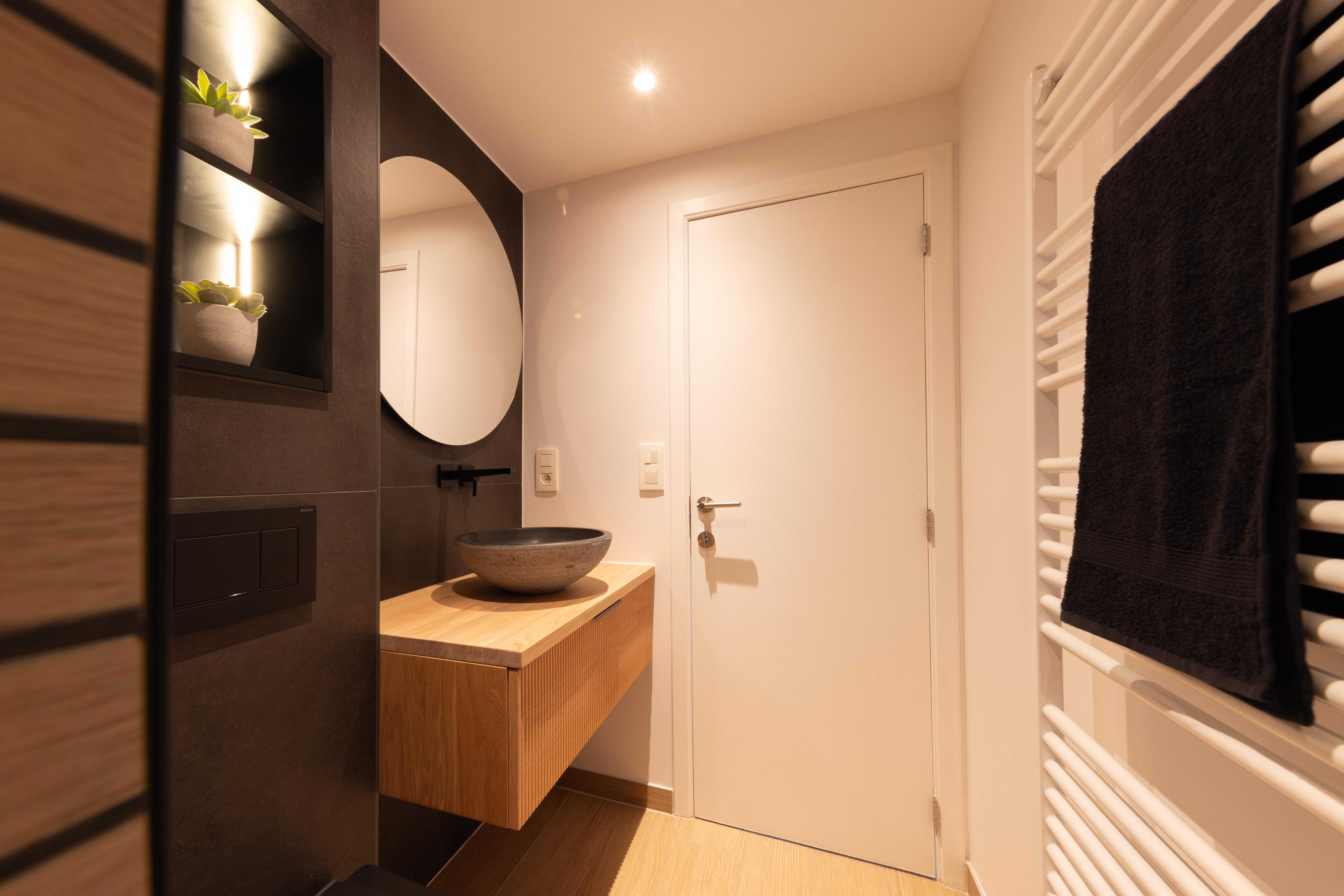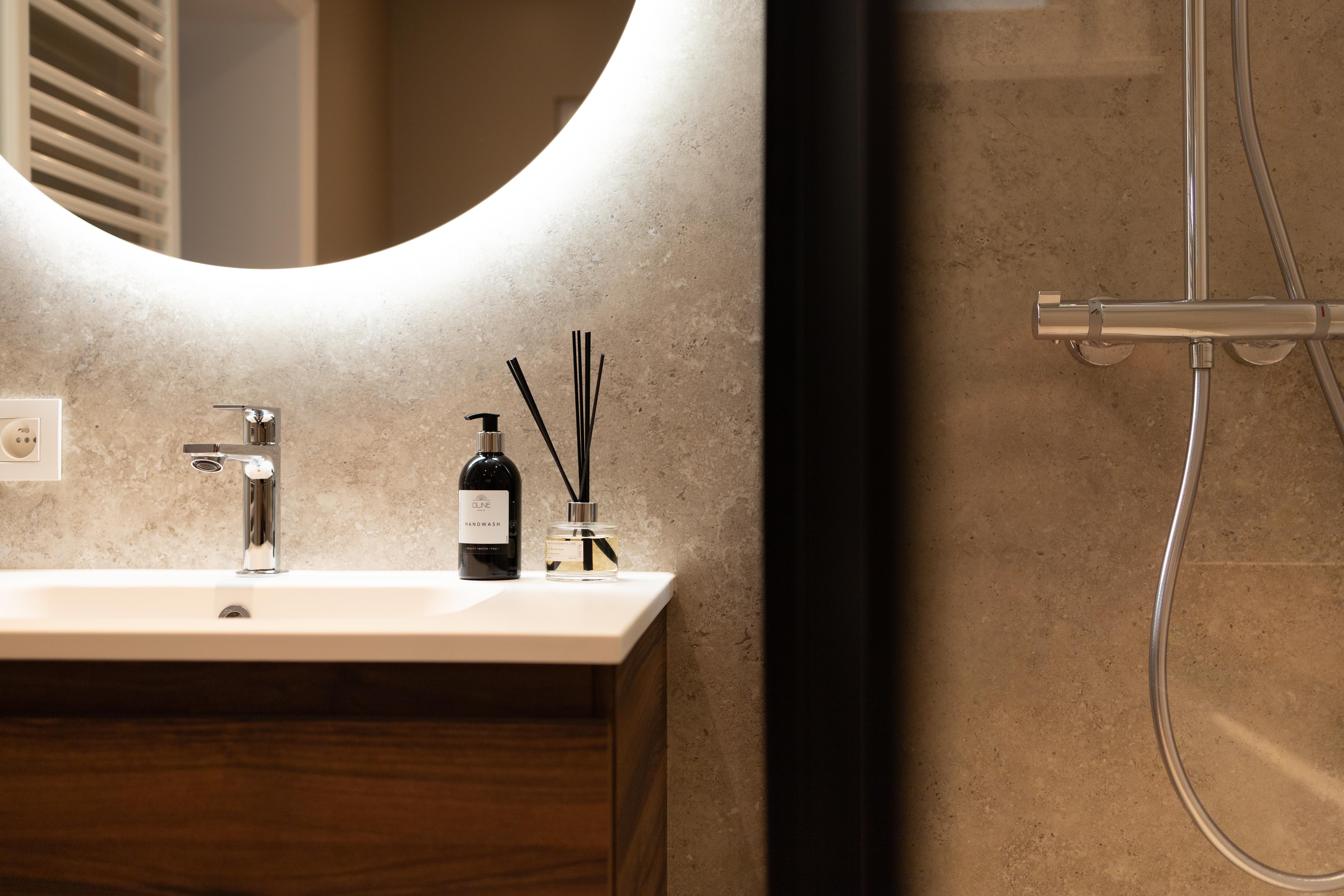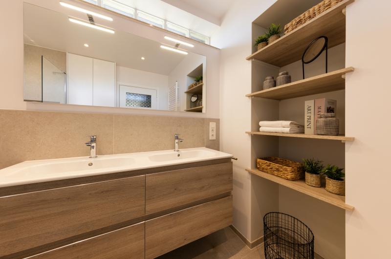Une salle de bains où on a privilégié un mobilier aux lignes épurées, couleurs douces, lumières chaudes et tamisées pour créer un espace de détente et de relaxation. Vous pourrez repartir ressourcé et plein d'énergie !