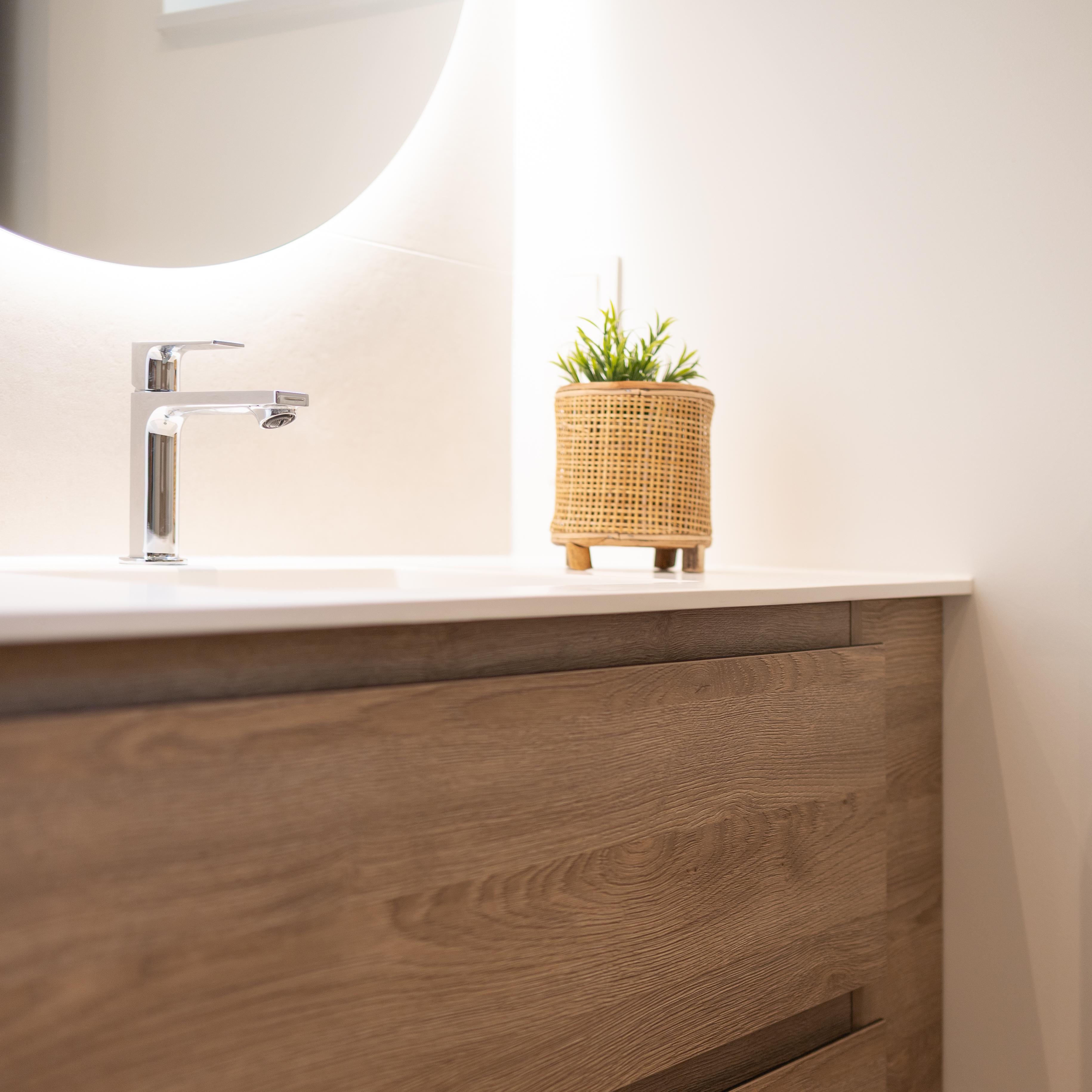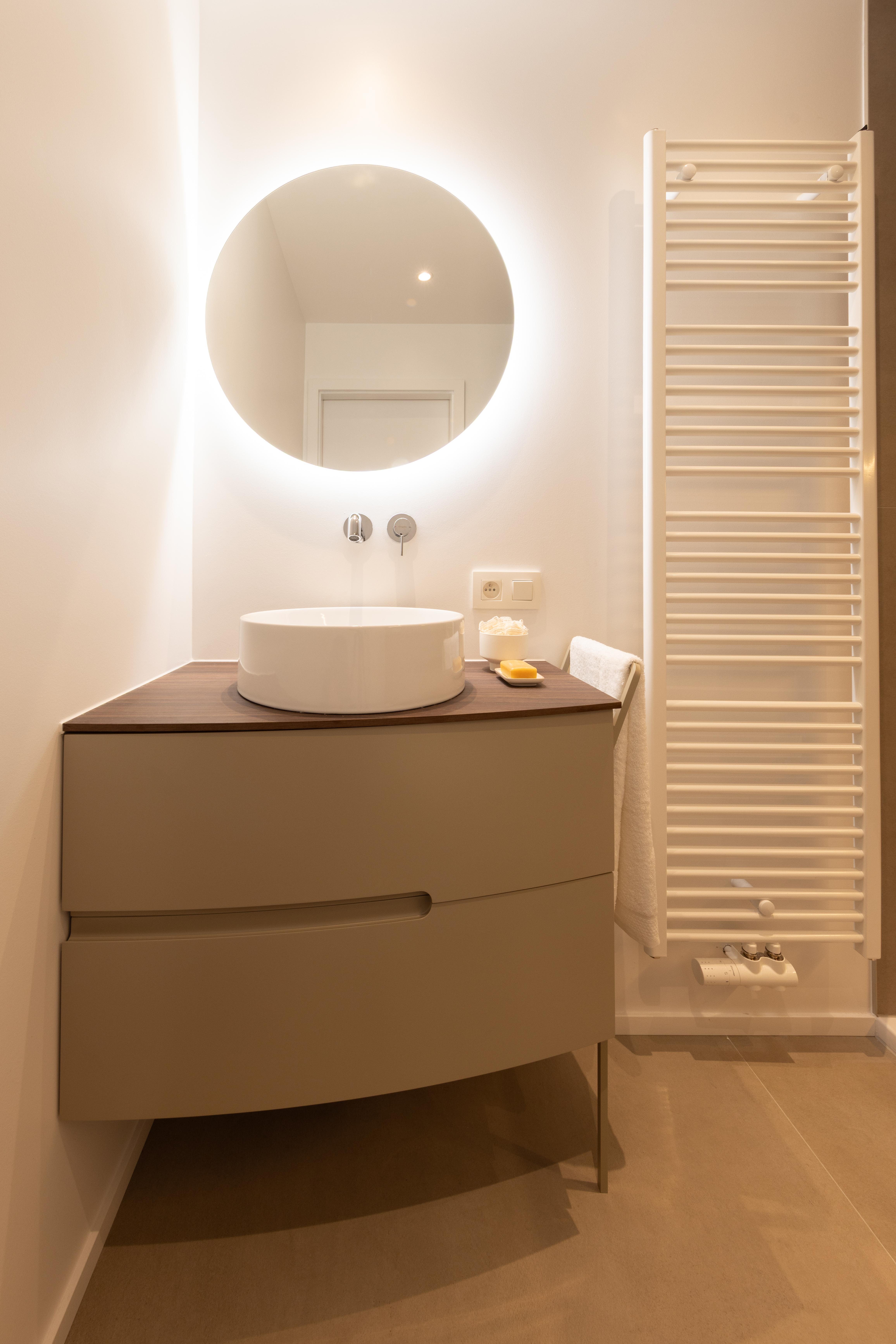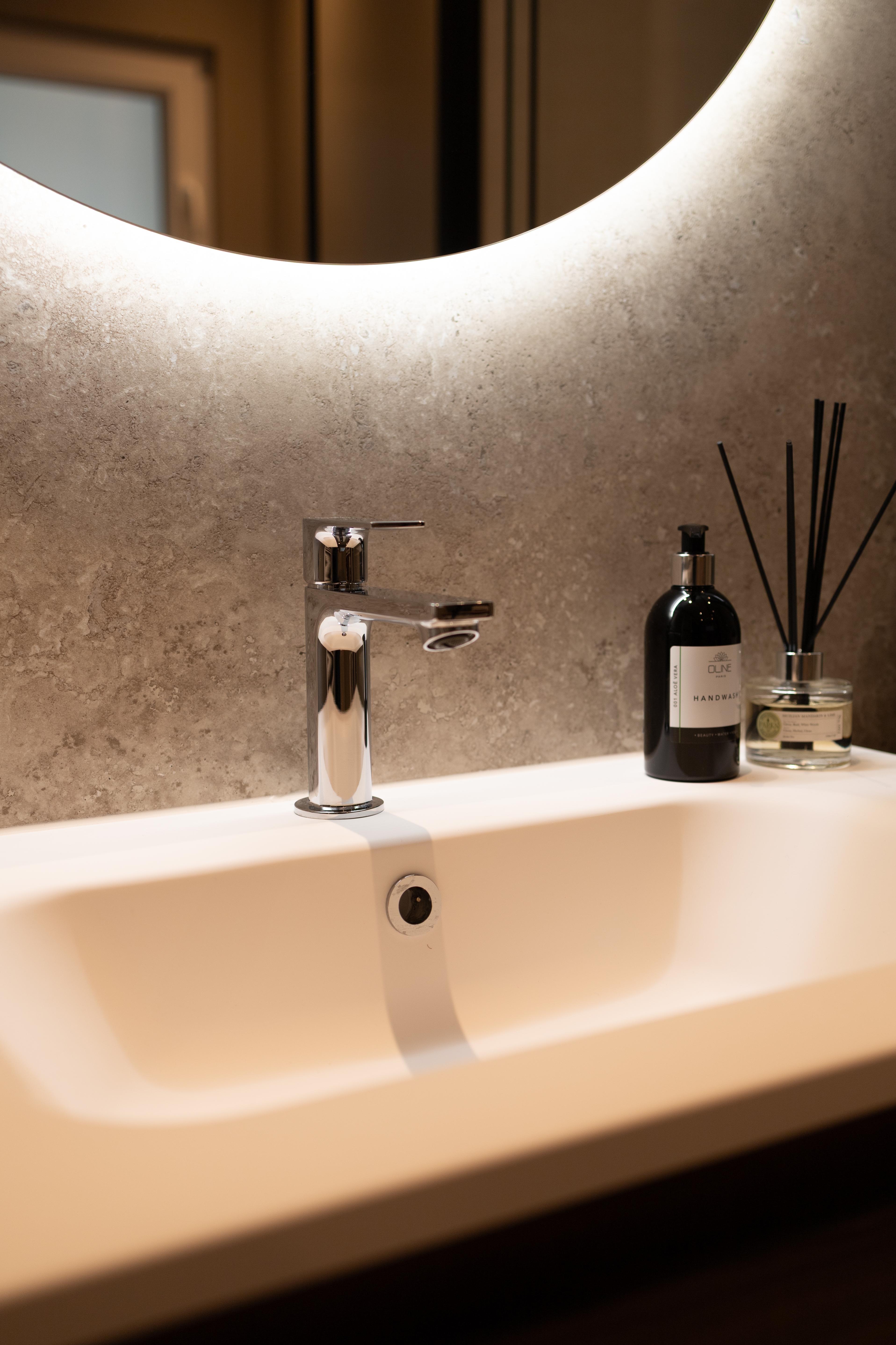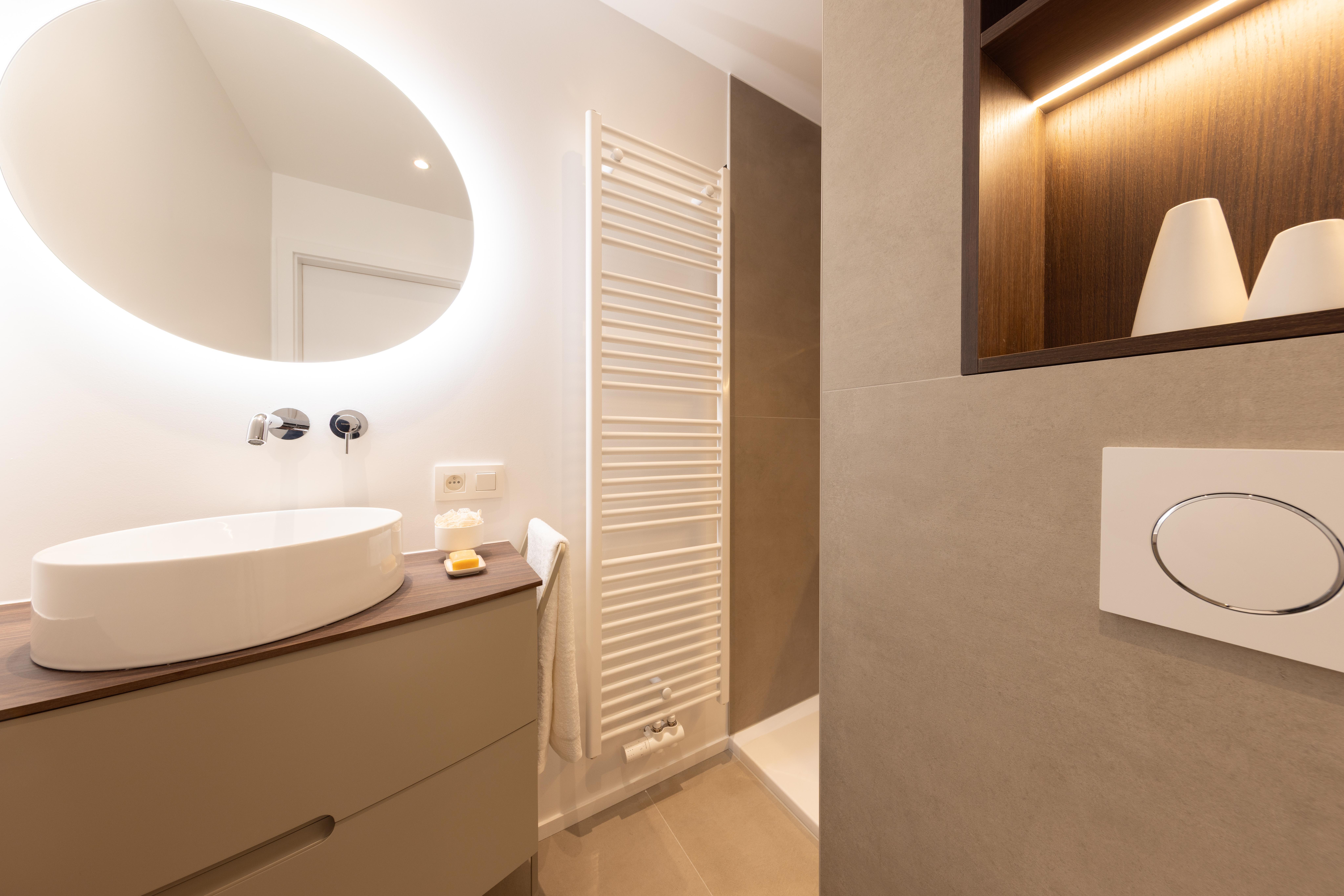 Une salle de bains où on a privilégié un mobilier aux lignes épurées, couleurs douces, lumières chaudes et tamisées pour créer un espace de détente et de relaxation. Vous pourrez repartir ressourcé et plein d'énergie !