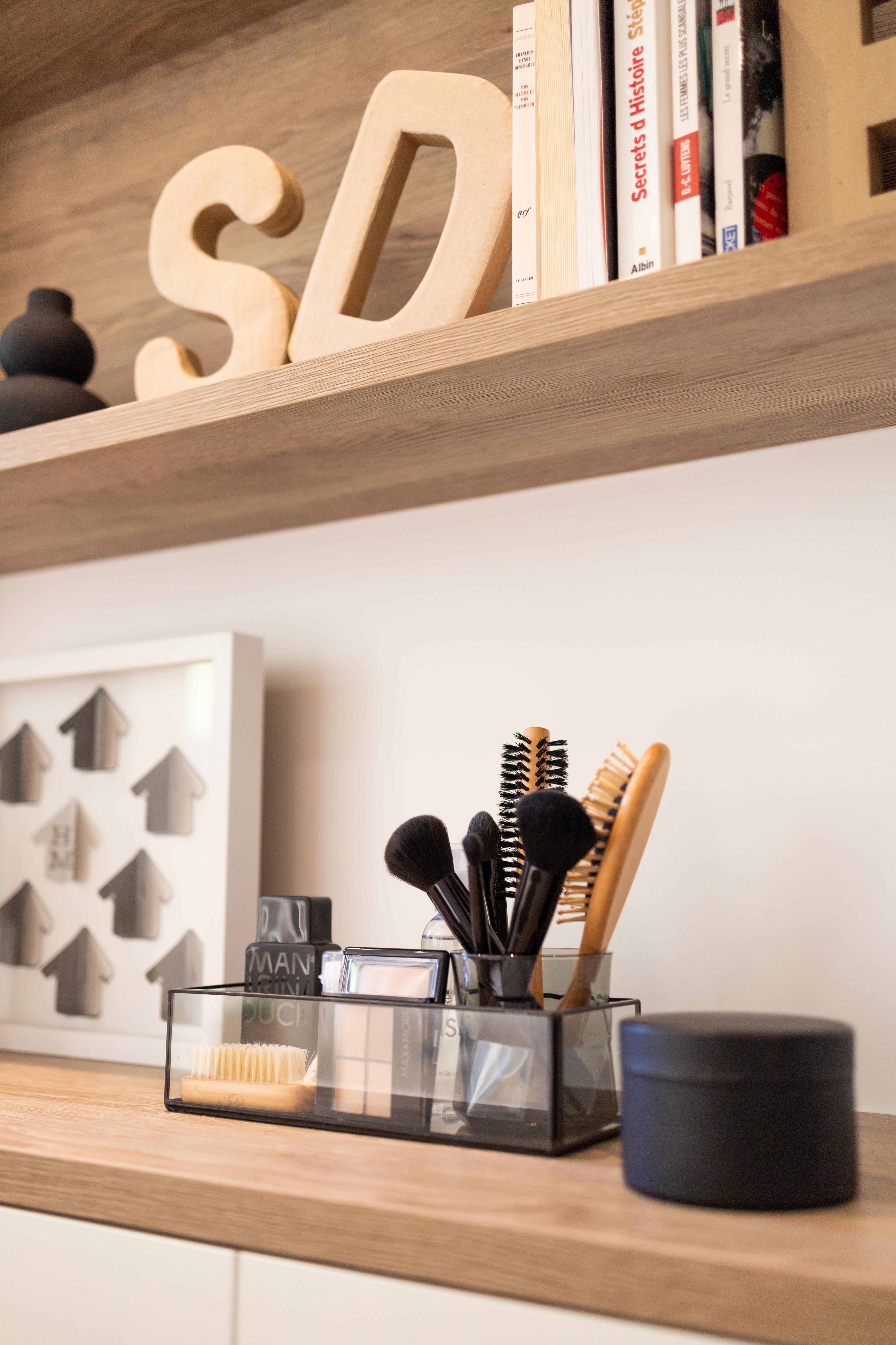 Dans cette salle de bains, nous avons opté pour l'ajout d'une coiffeuse. Un ensemble de meubles complémentaires coordonnés qui donne un parfait équilibre à cette salle de bains. Nous, on adore !