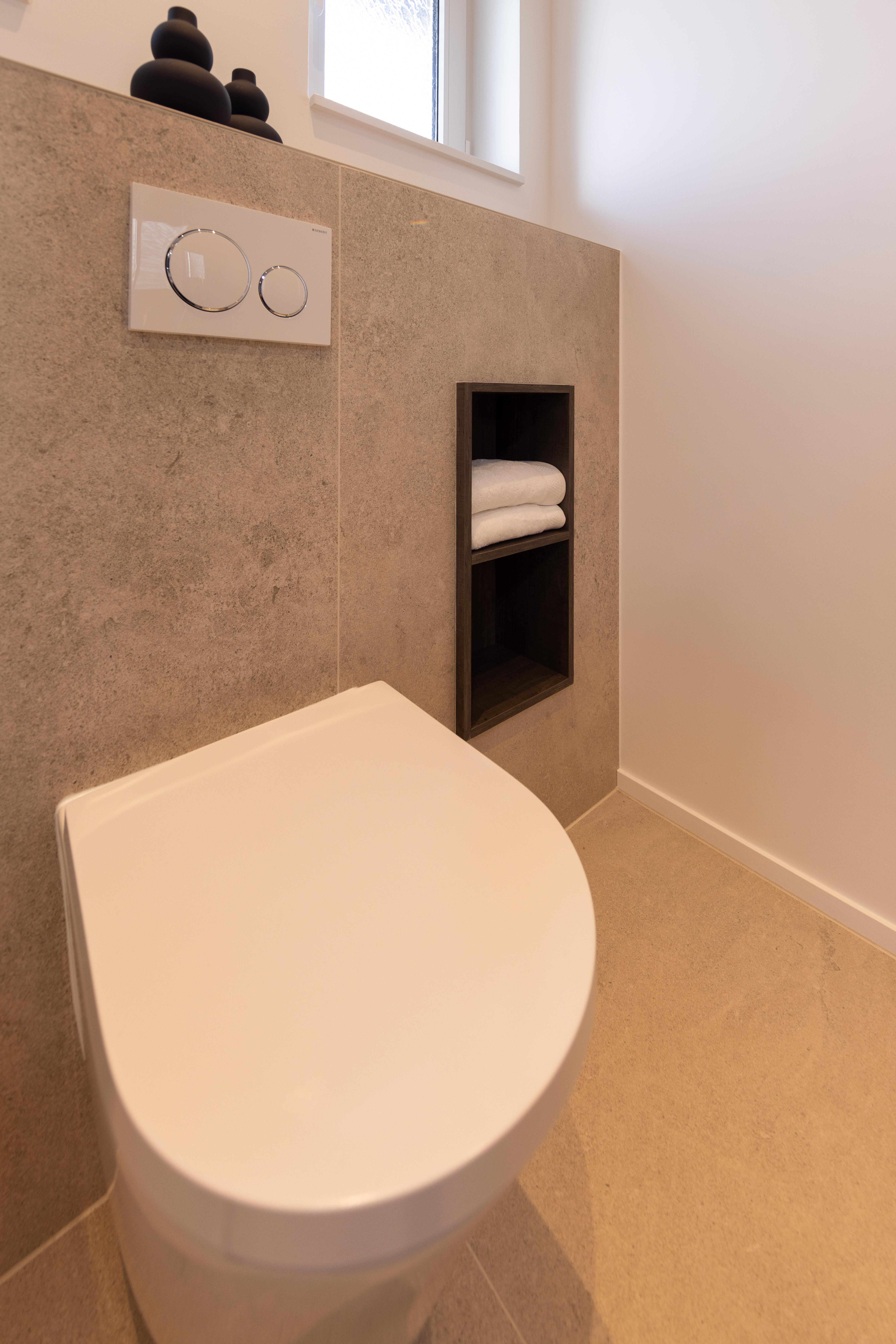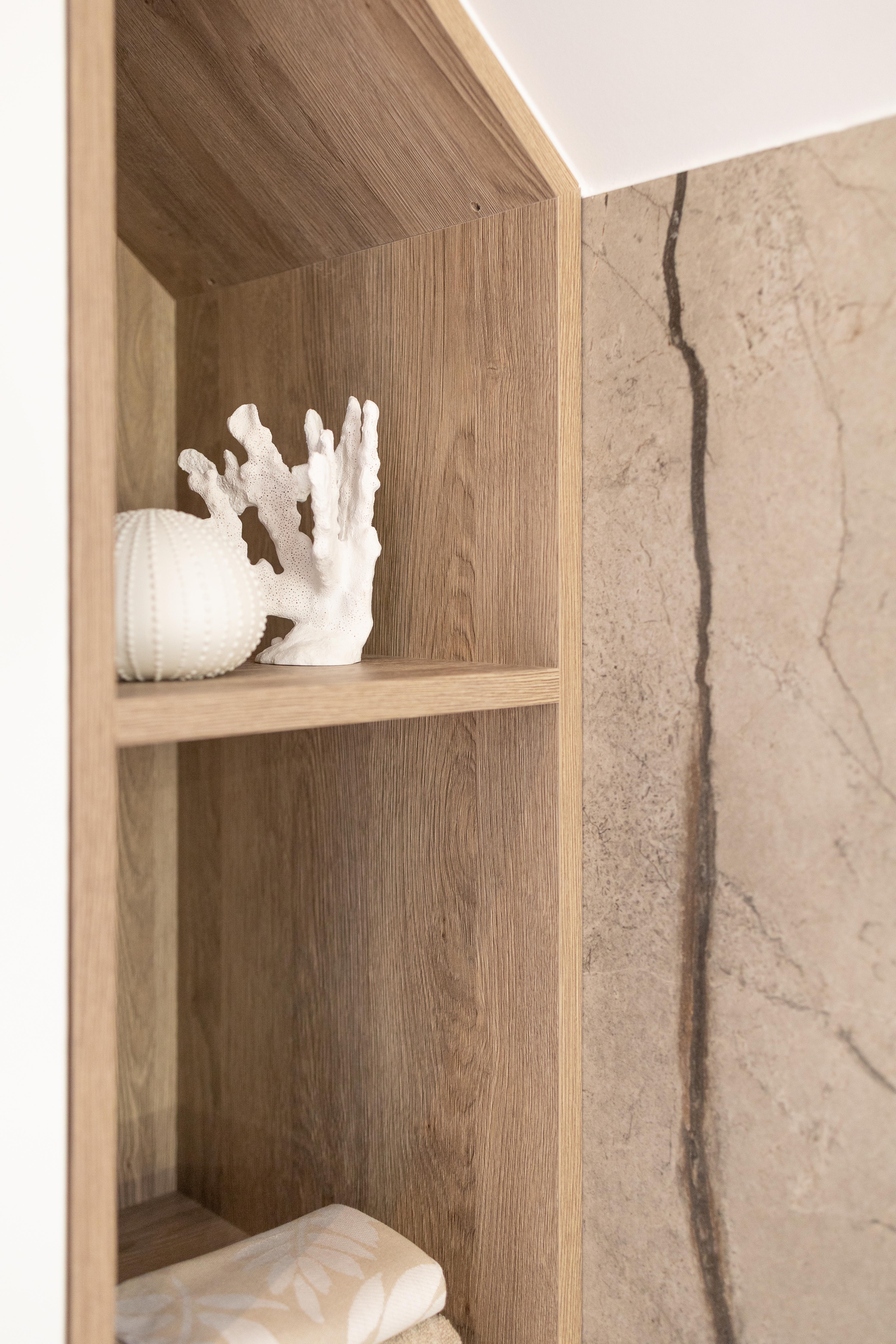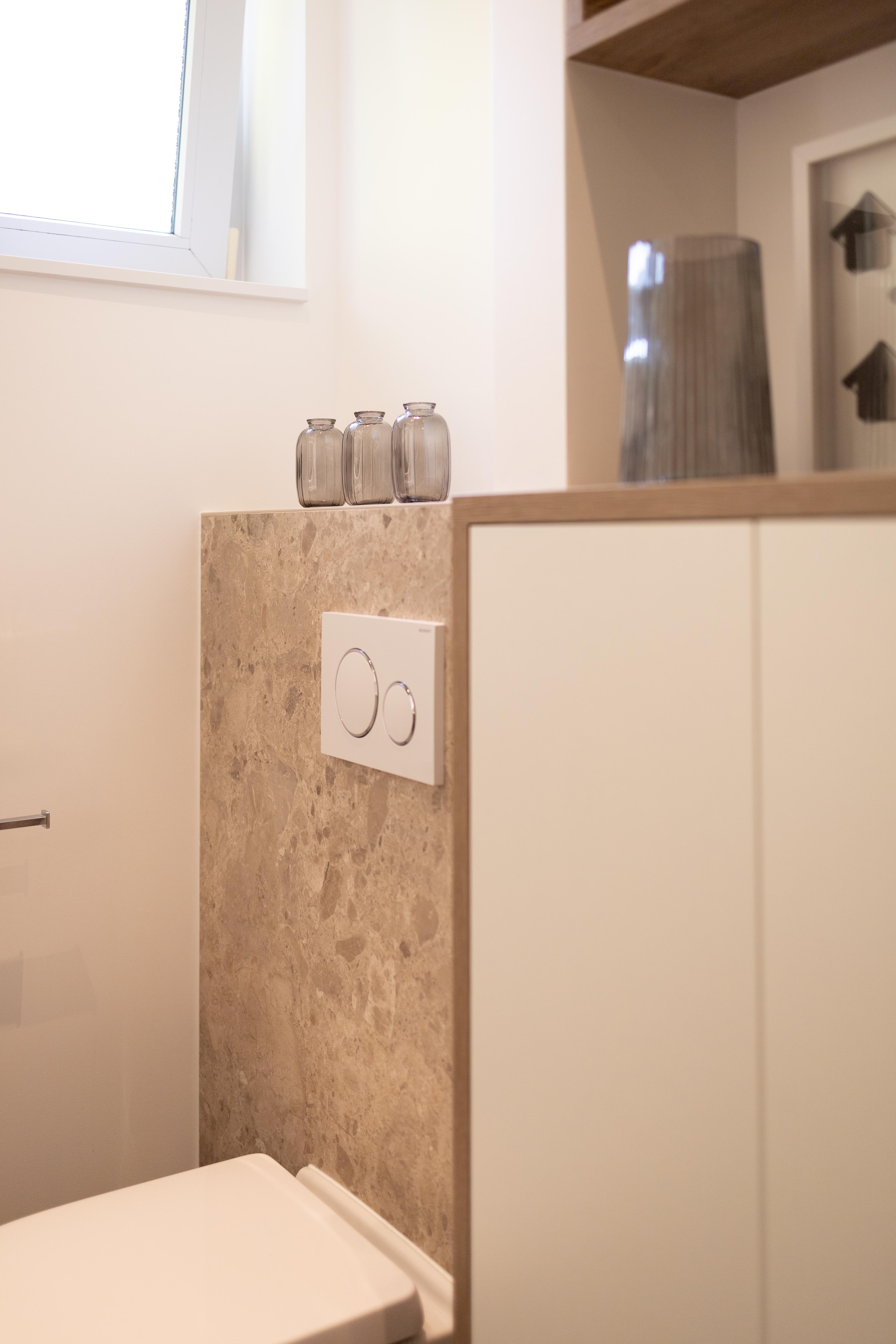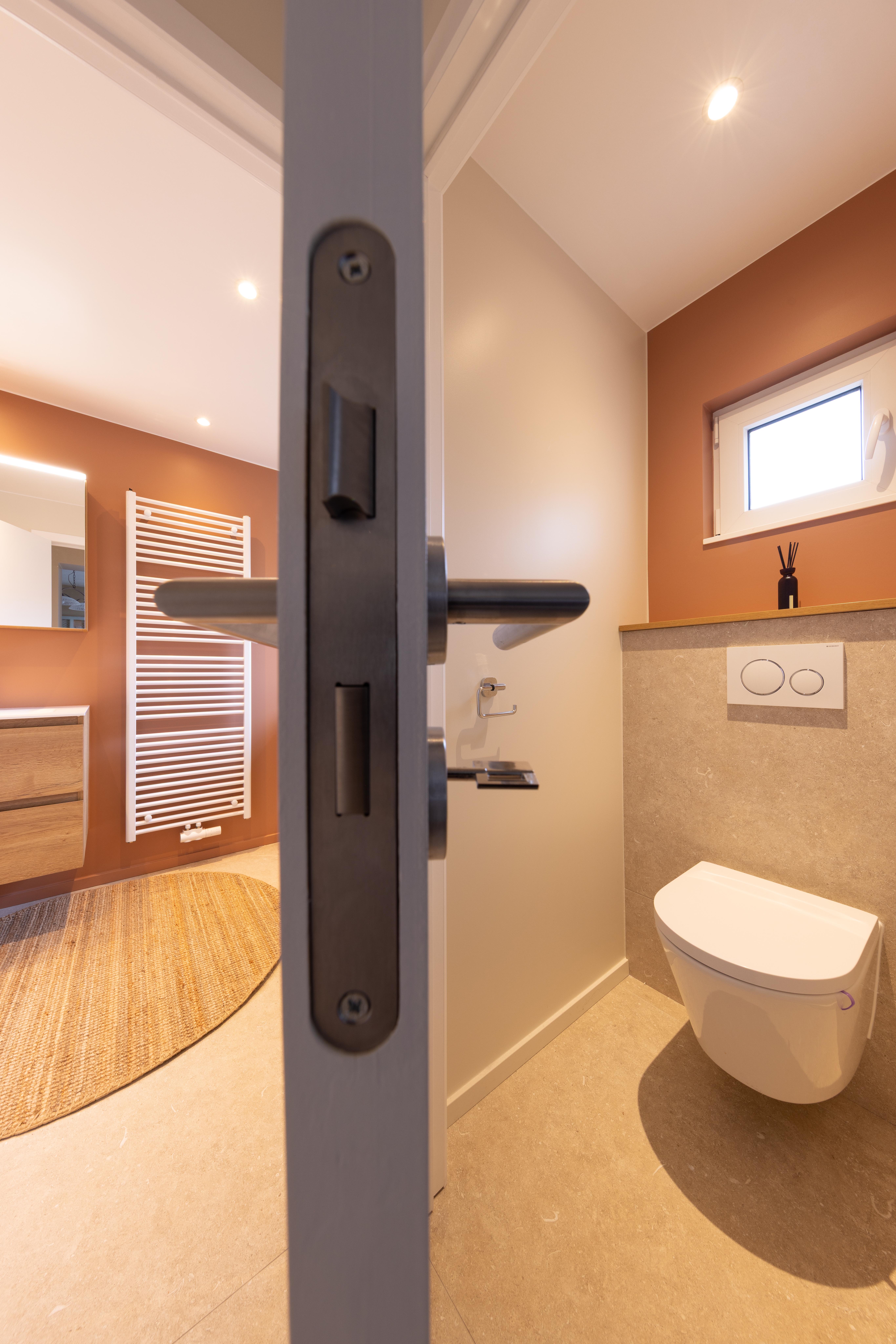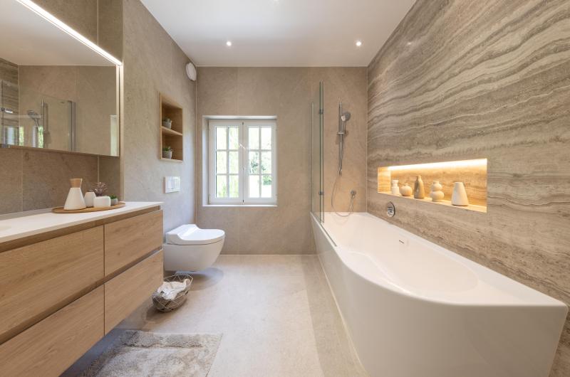 Cette salle de bains allie l'authenticité et la chaleur de la pierre naturelle. Les matériaux nobles utilisés rendent ce projet élégant, naturel et solide. Équilibre de matériaux plus que jamais intemporel ! Découverte également du wc "invités"