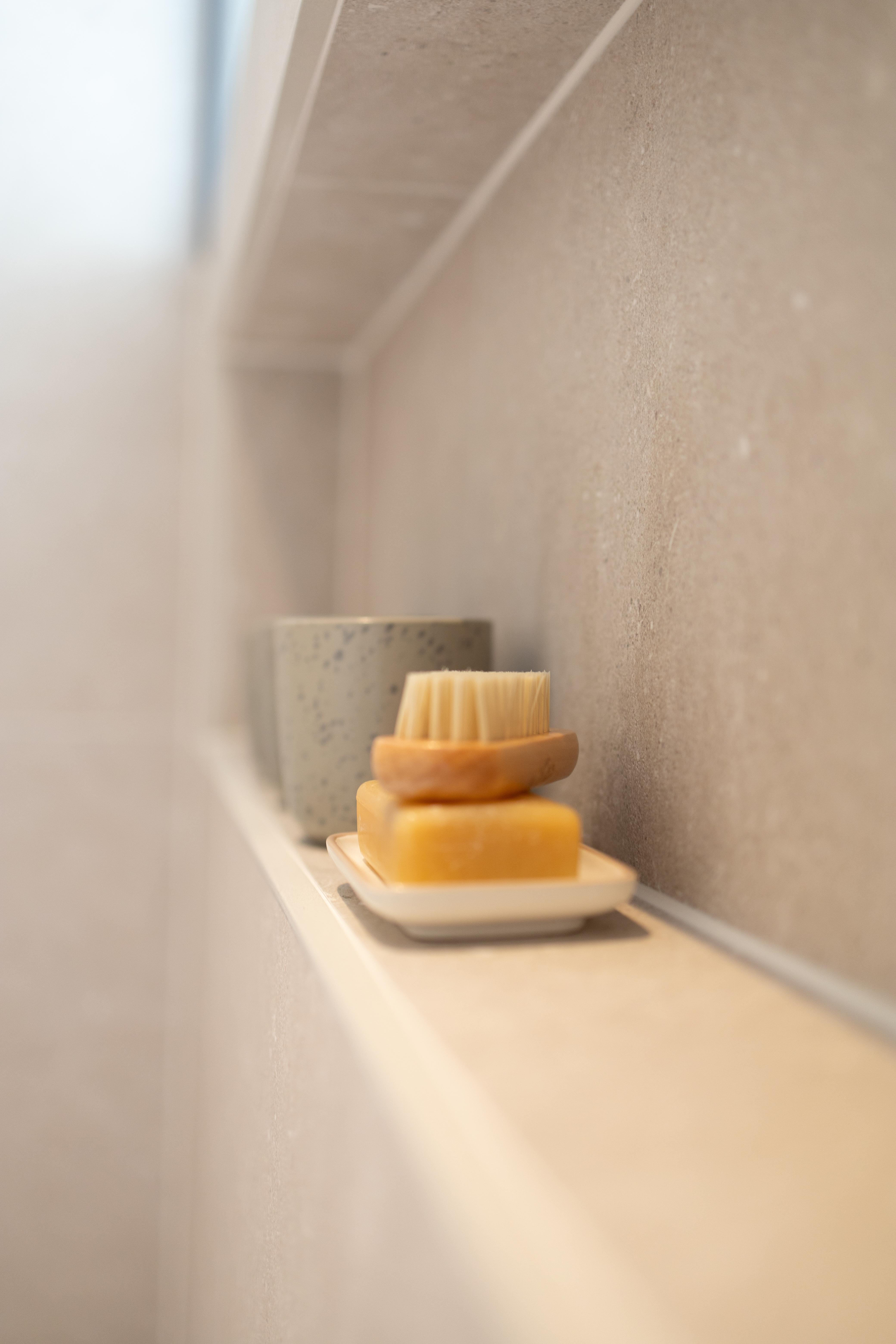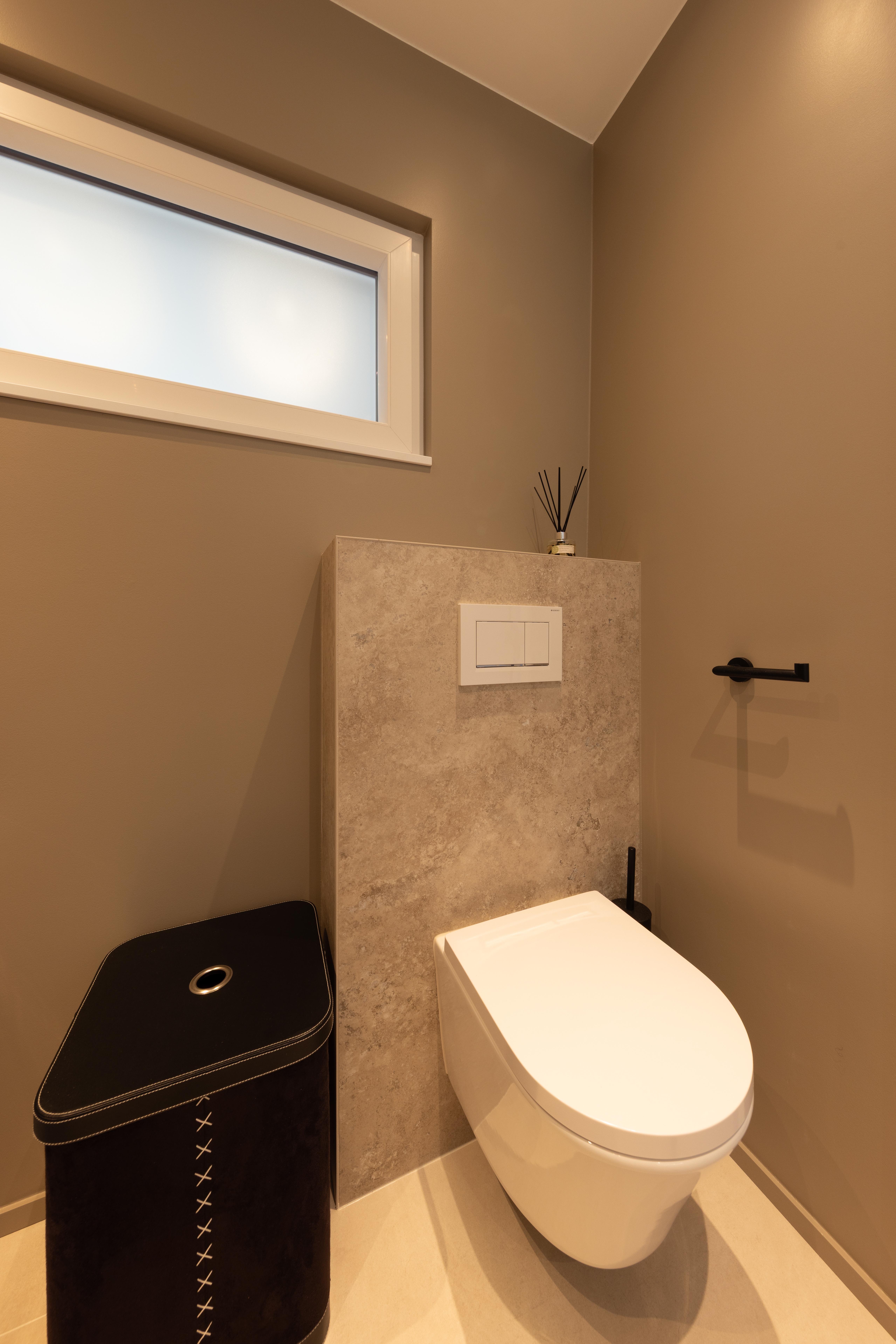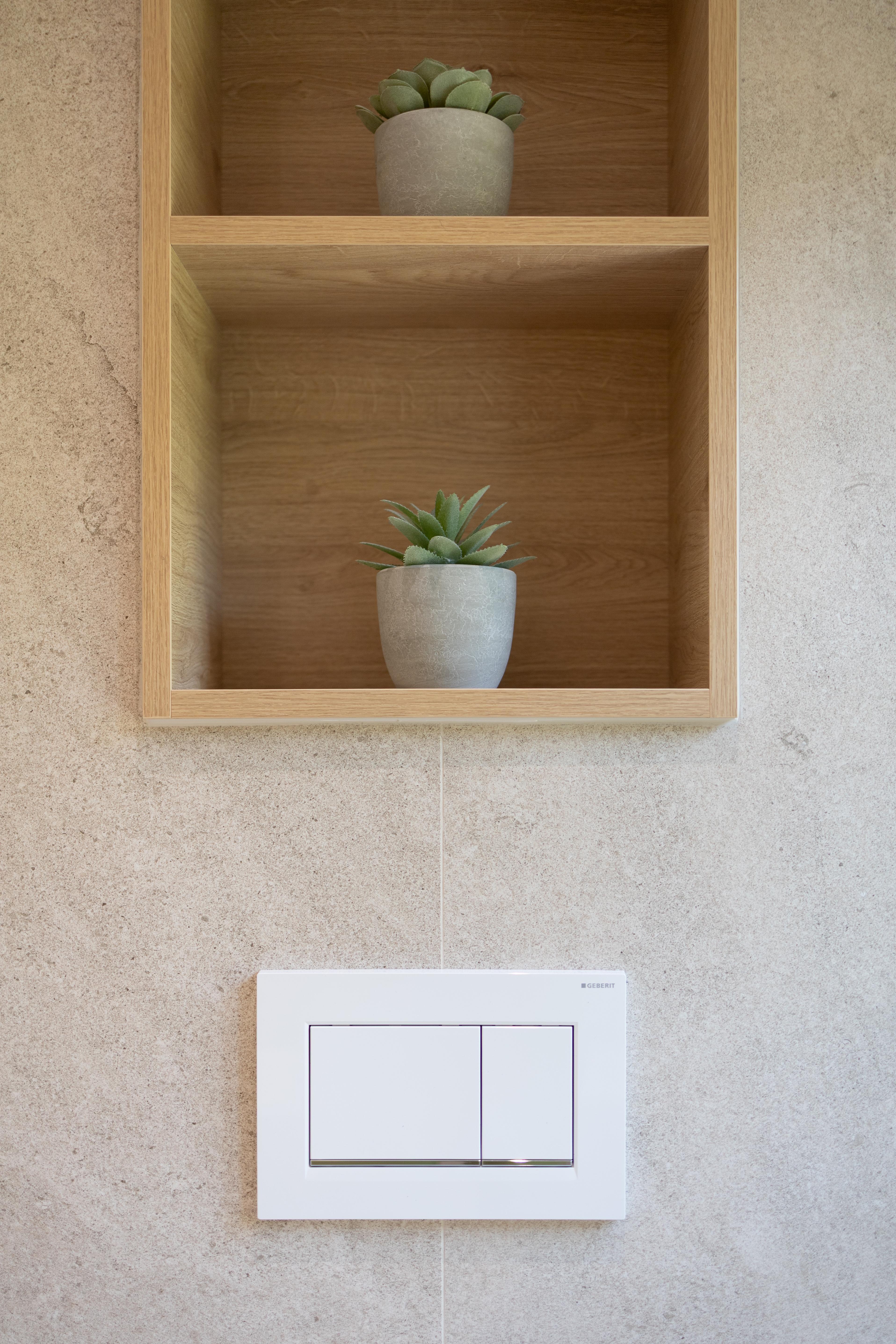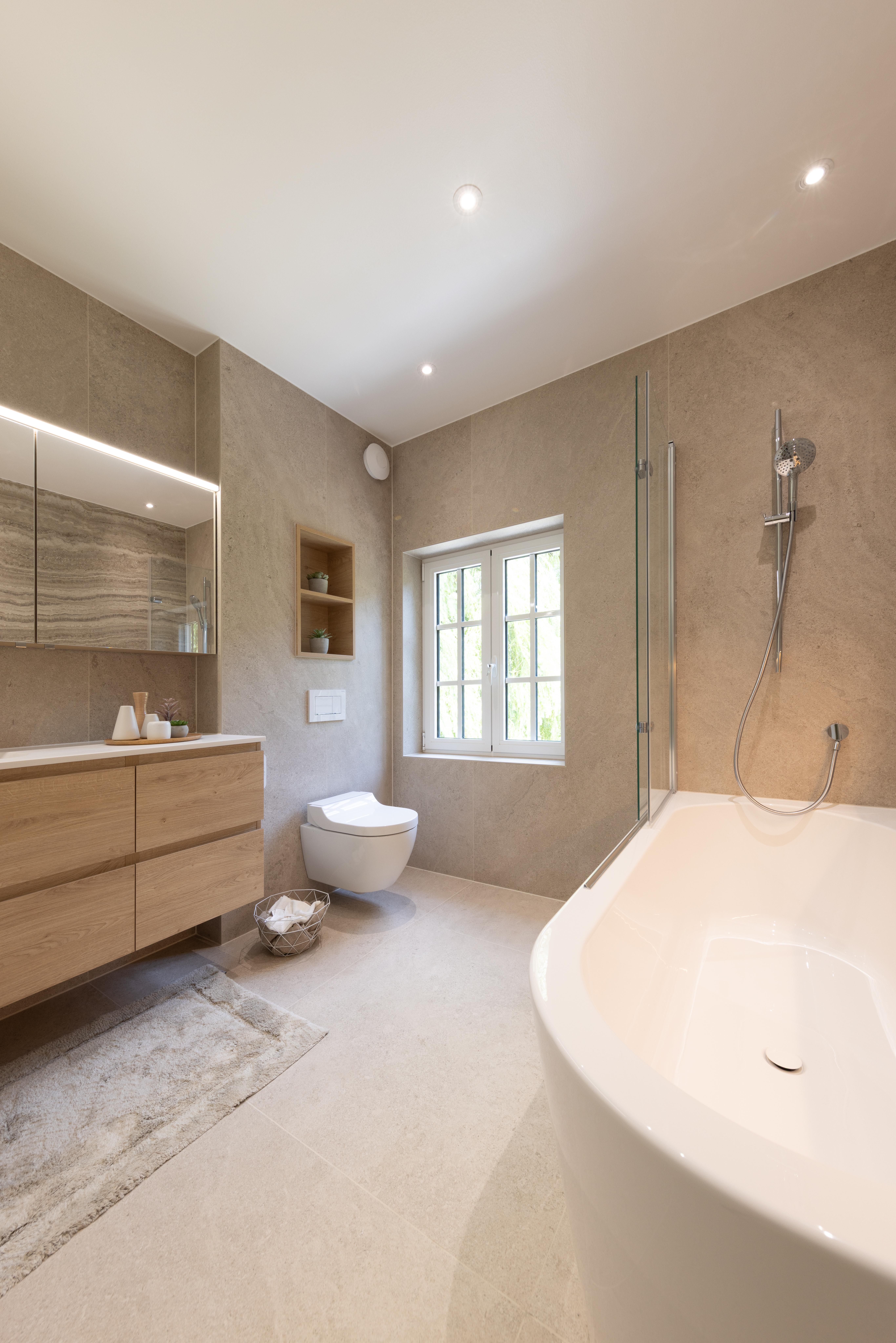 Cette salle de bains allie l'authenticité et la chaleur de la pierre naturelle. Les matériaux nobles utilisés rendent ce projet élégant, naturel et solide. Équilibre de matériaux plus que jamais intemporel ! Découverte également du wc "invités"