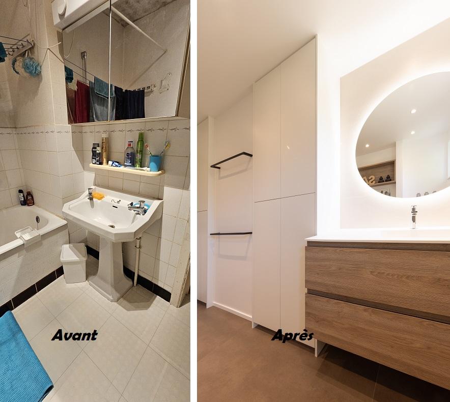 Projet qui allie le pratique, le design et l'harmonieux. Pour optimiser l’espace nous avons placé le bain sous la fenêtre, laissant la place à un grand meuble de rangement sur mesures. La composition du meuble vasque, au design moderne, permet de s'asseoir. Les miroirs donnent de la perspective au volume.