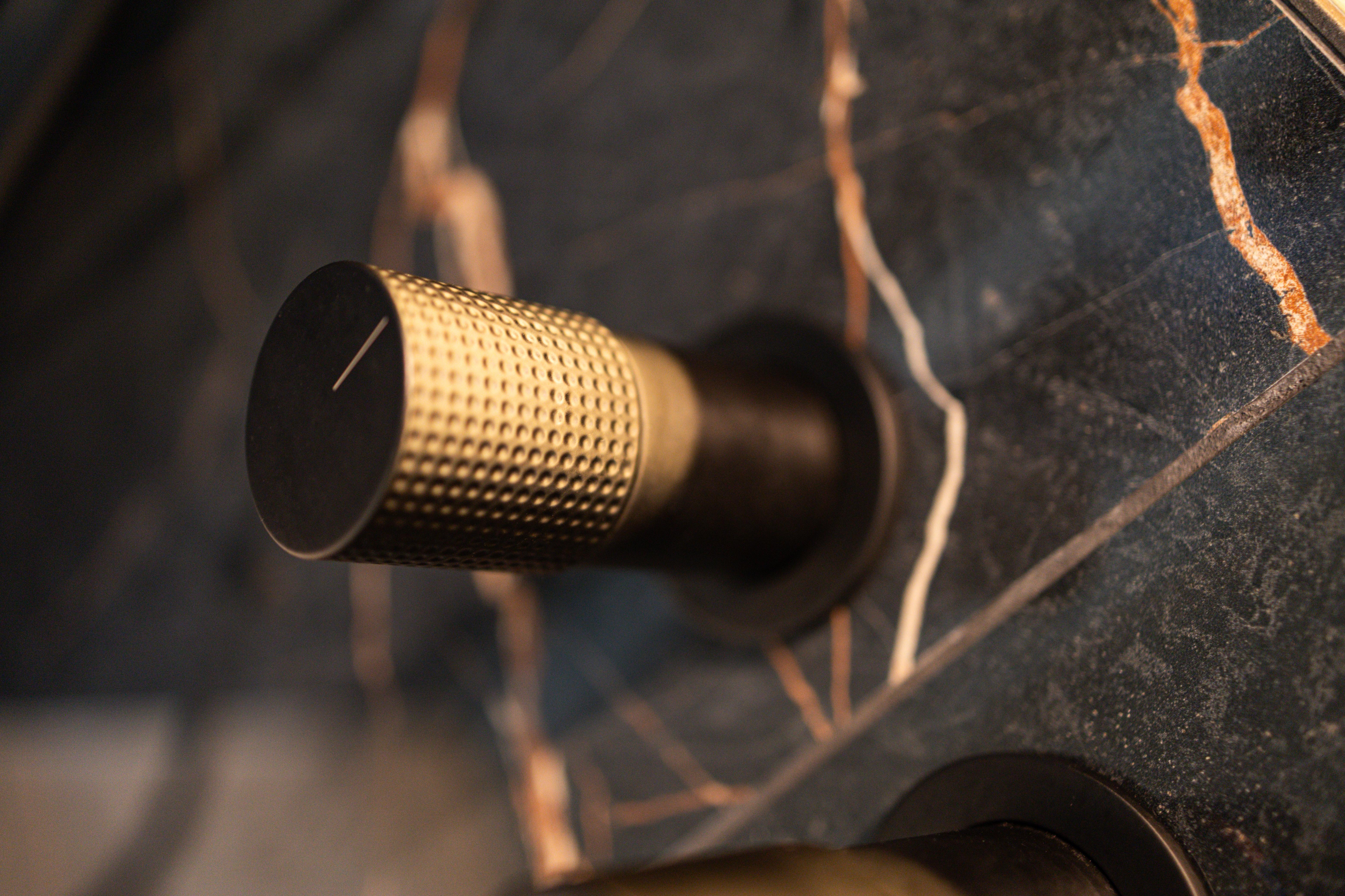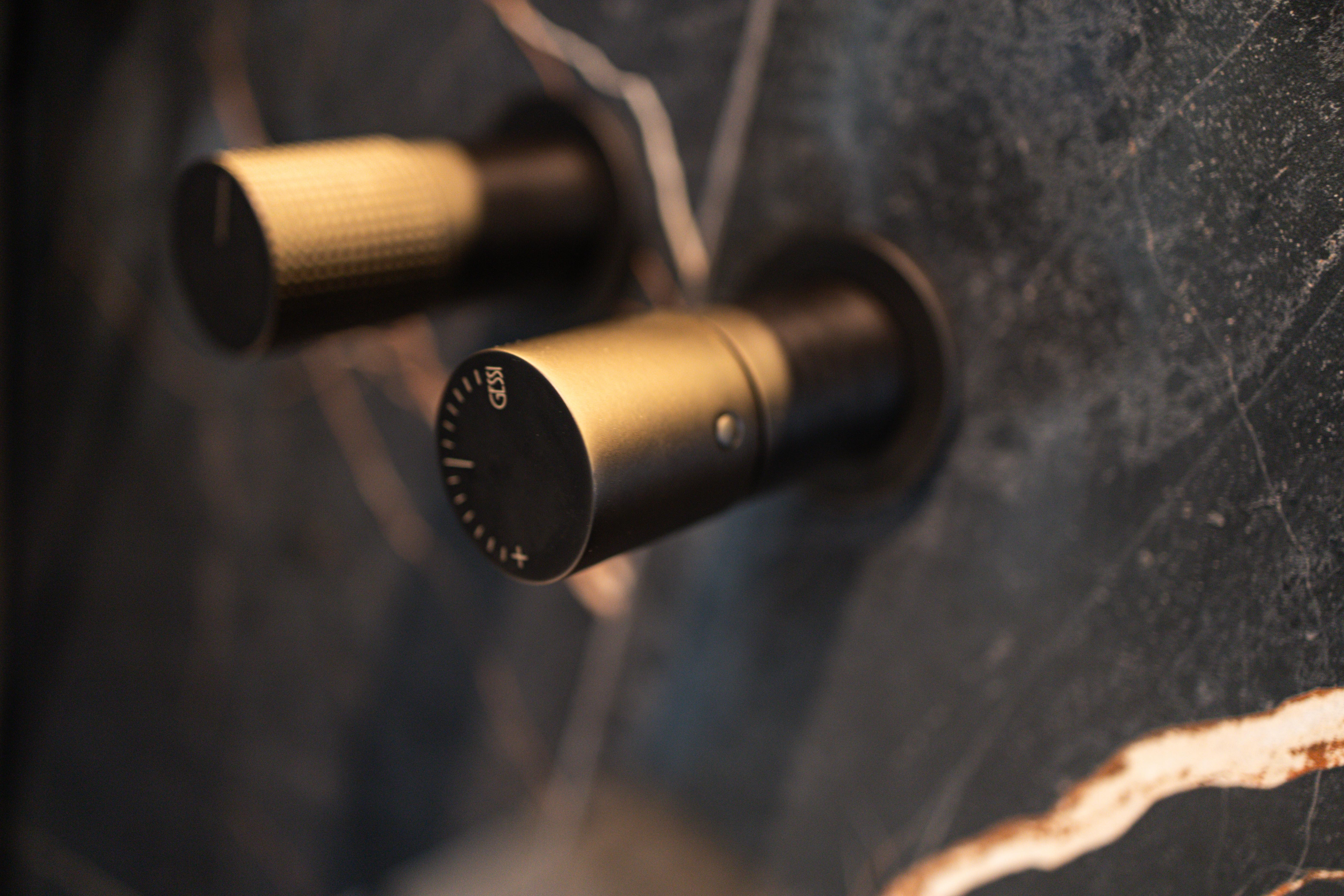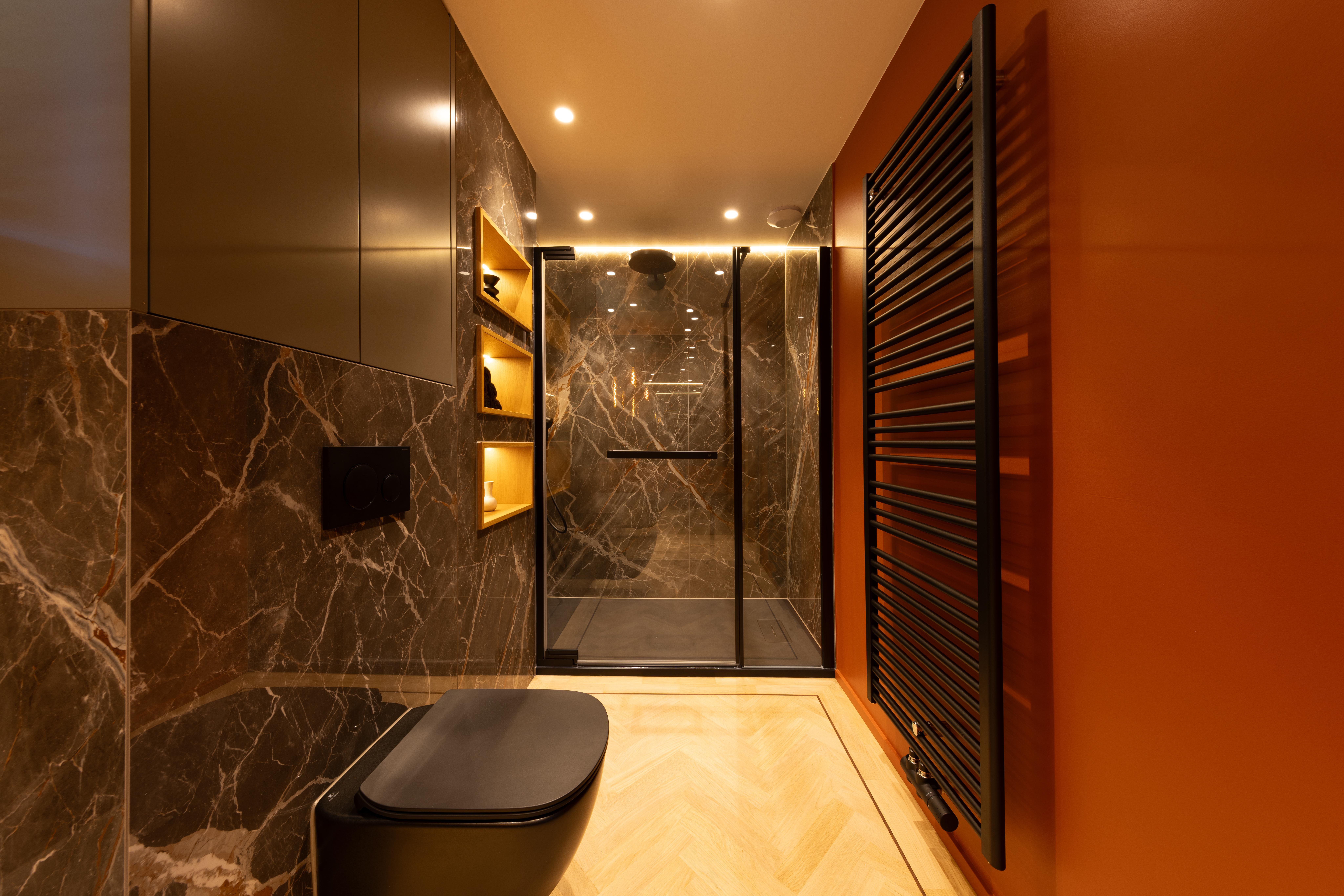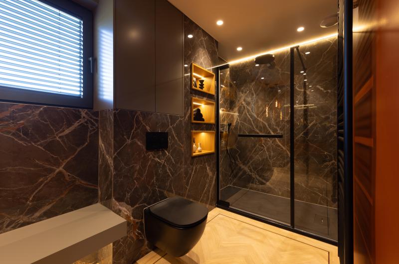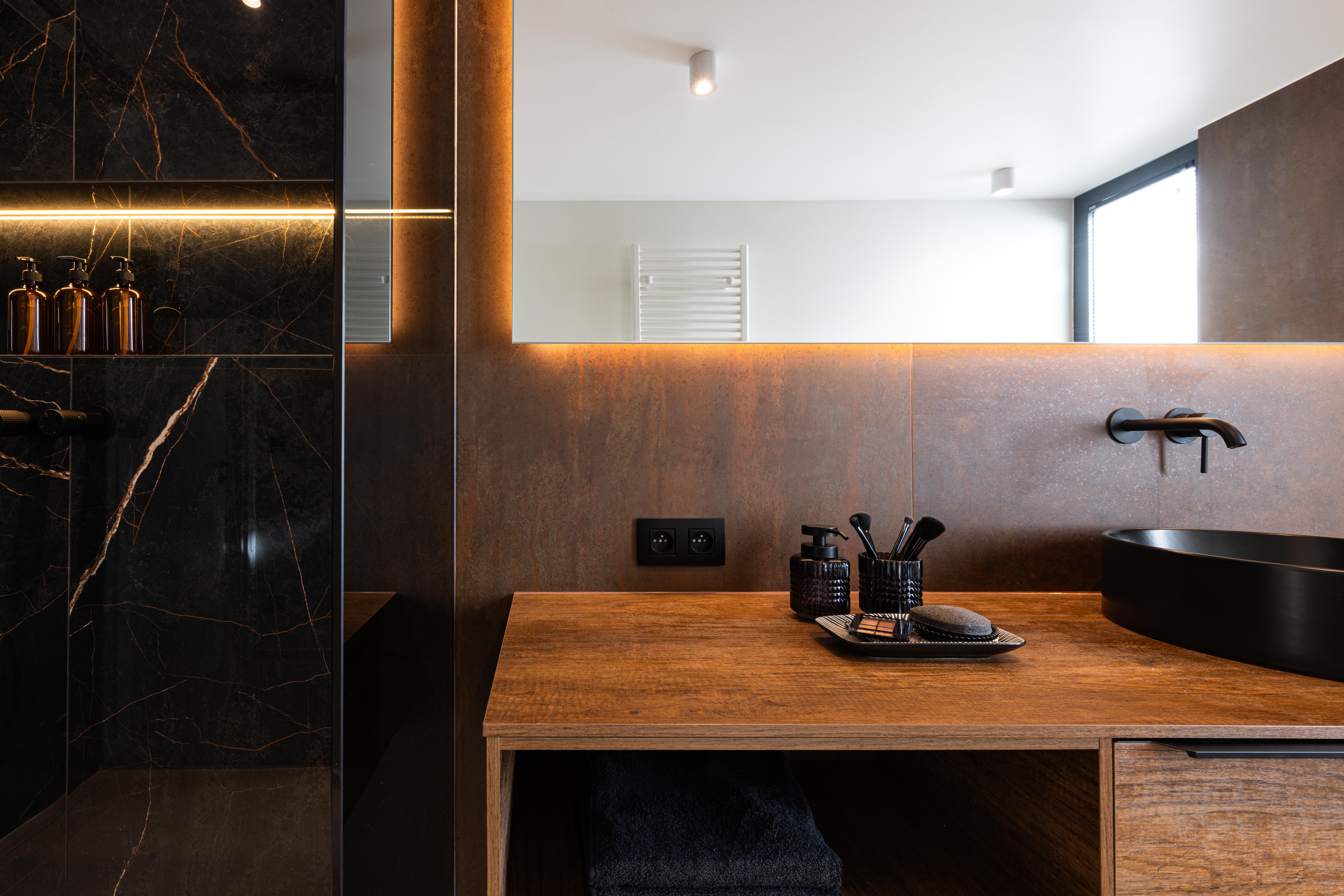 Salle de douche aux teintes foncées