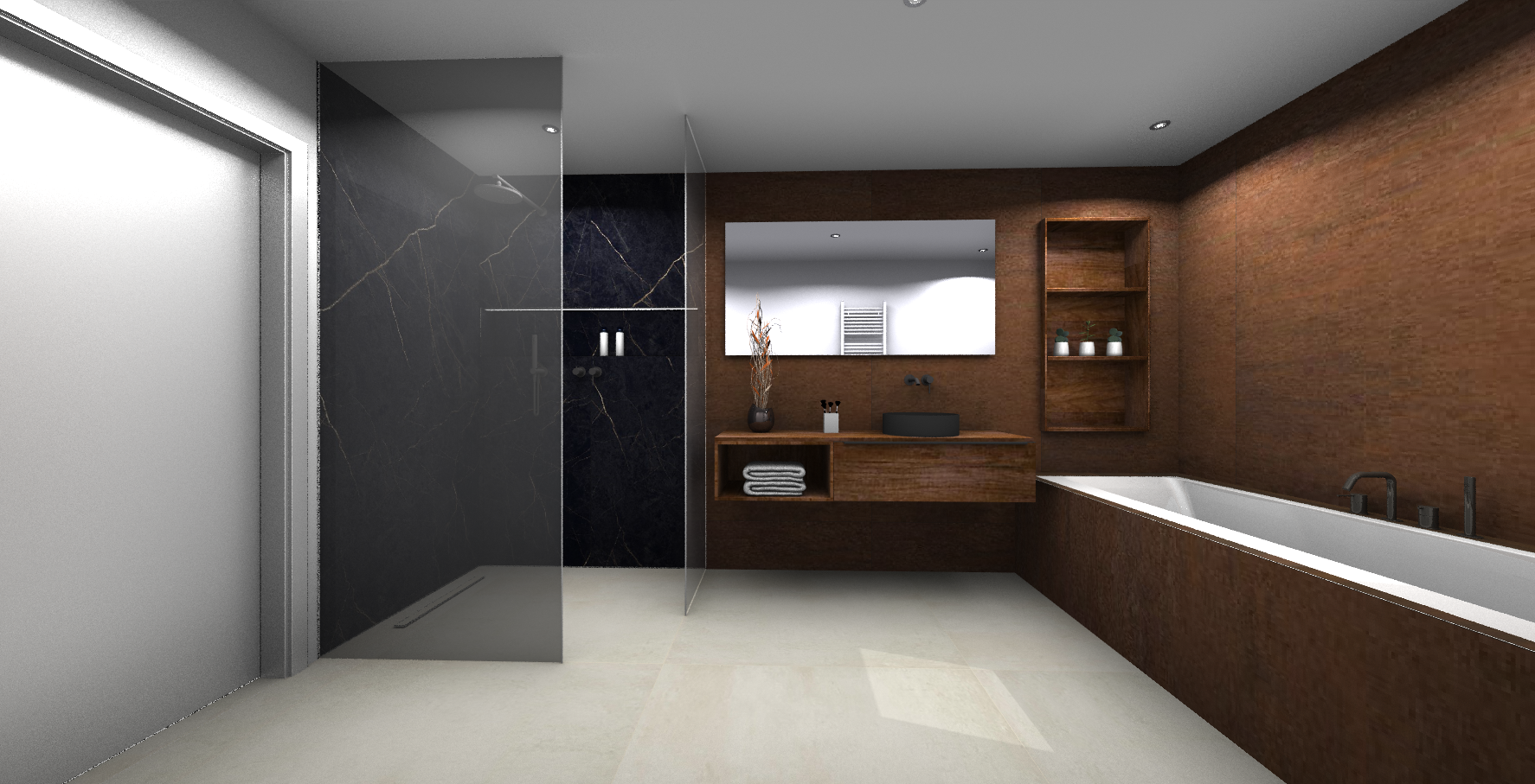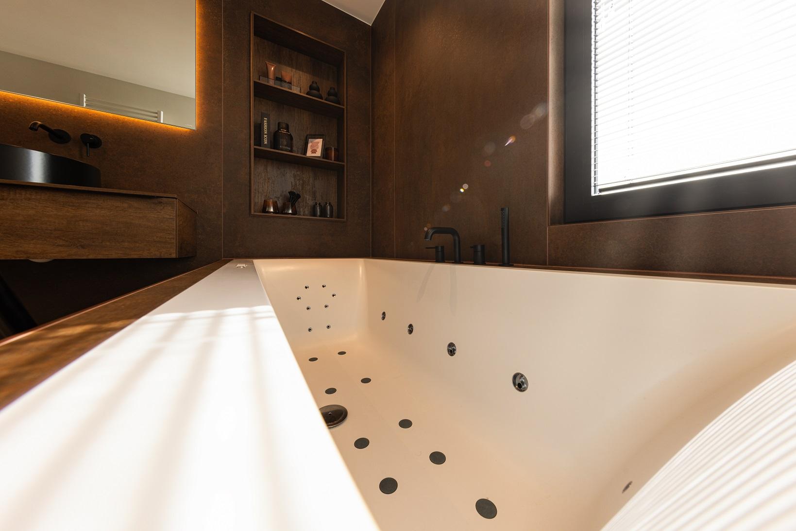 Projet dans une pièce, aux lignes obliques, mise en valeur pas la disposition du bain. La douche et son carrelage aux effets METALLIQUE donne une touche simple et élégante, en totale symbiose avec les coloris chaud du bois.