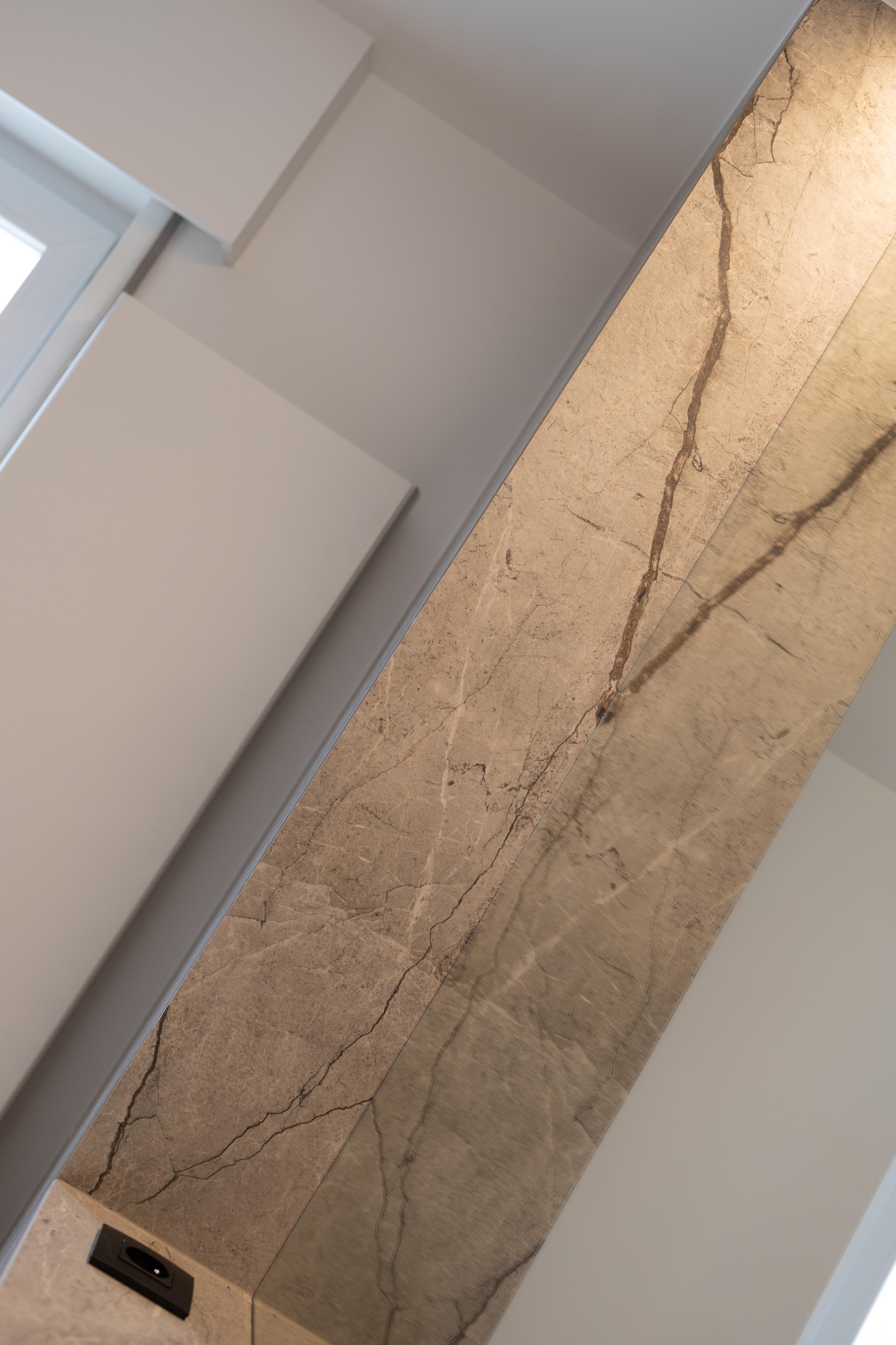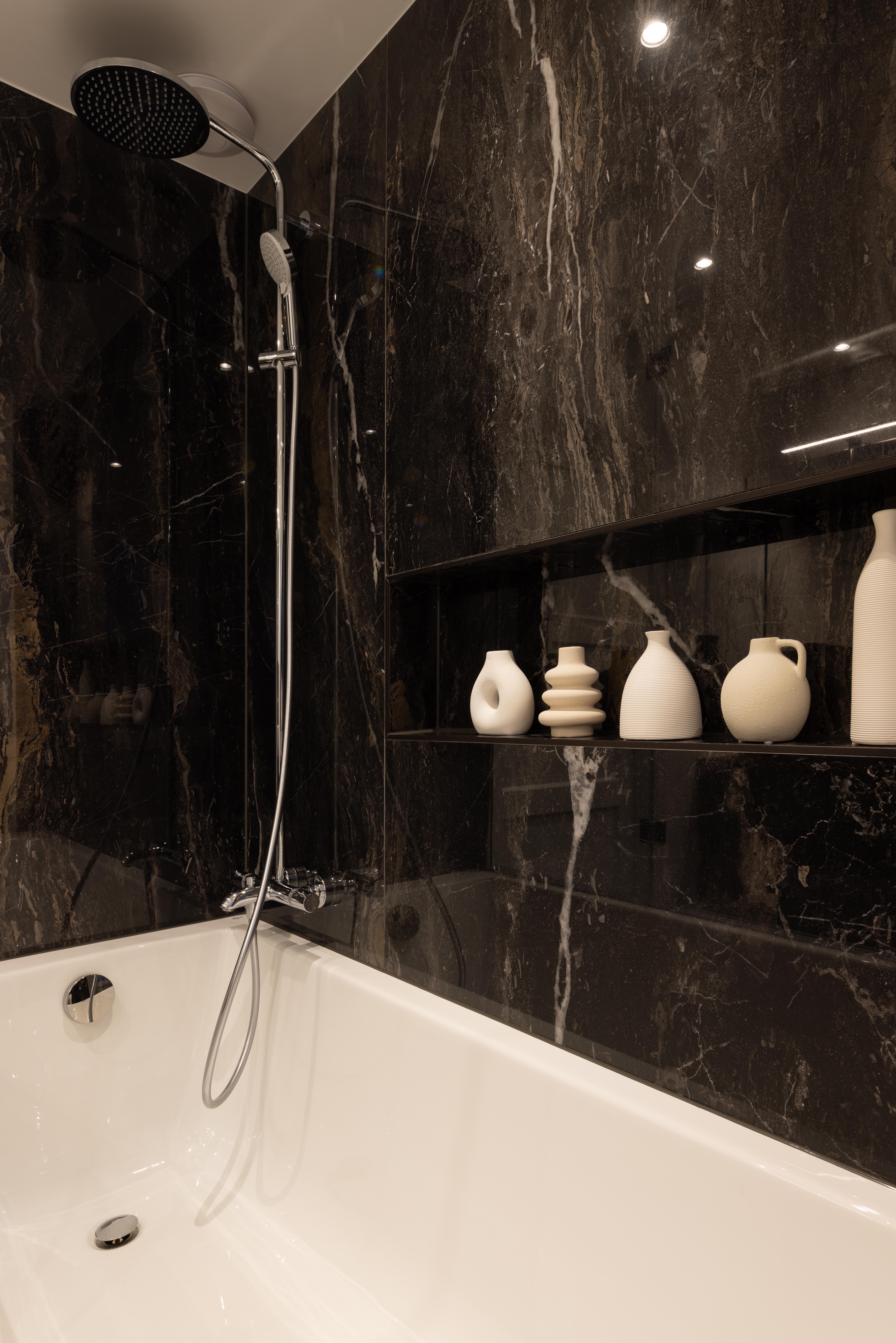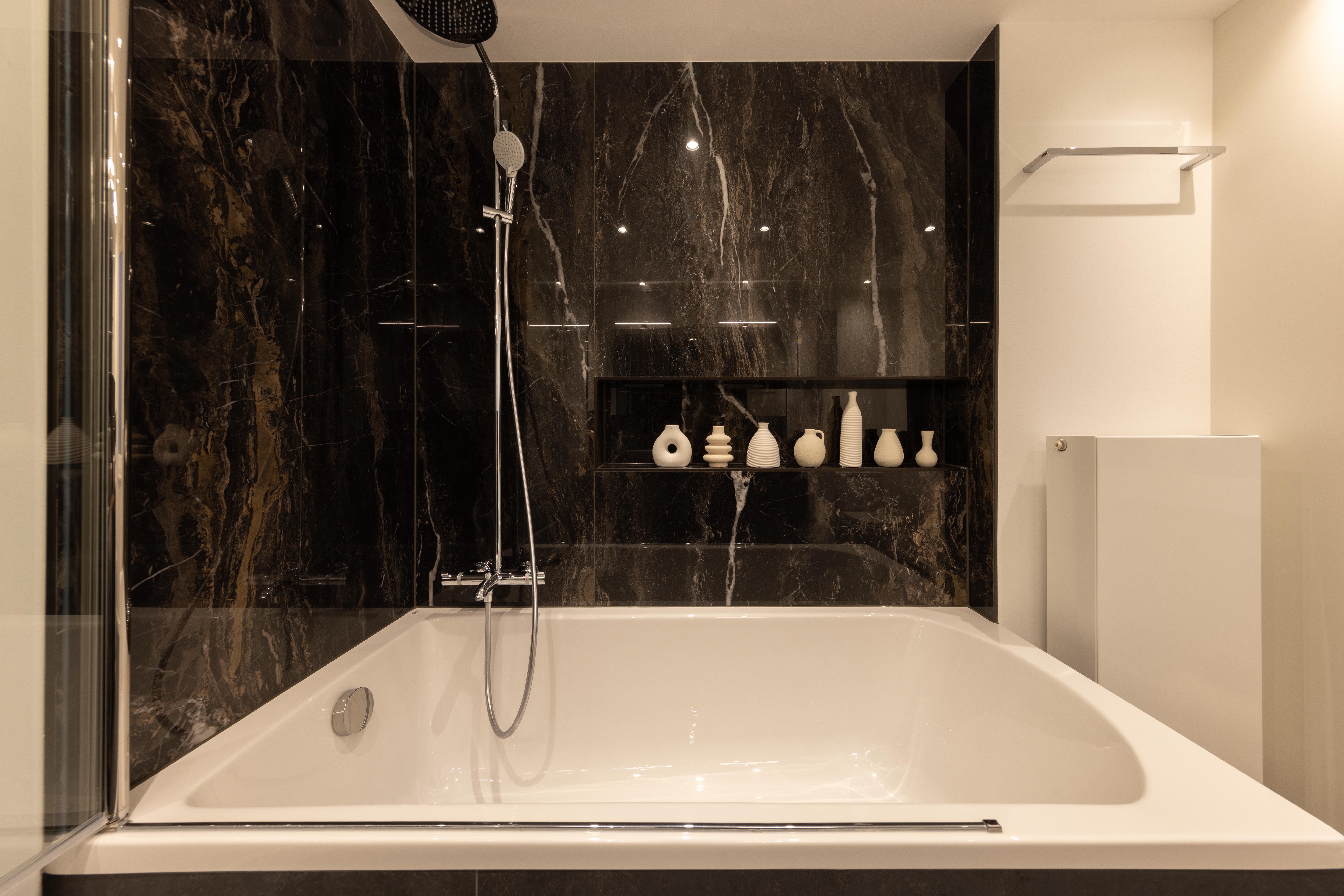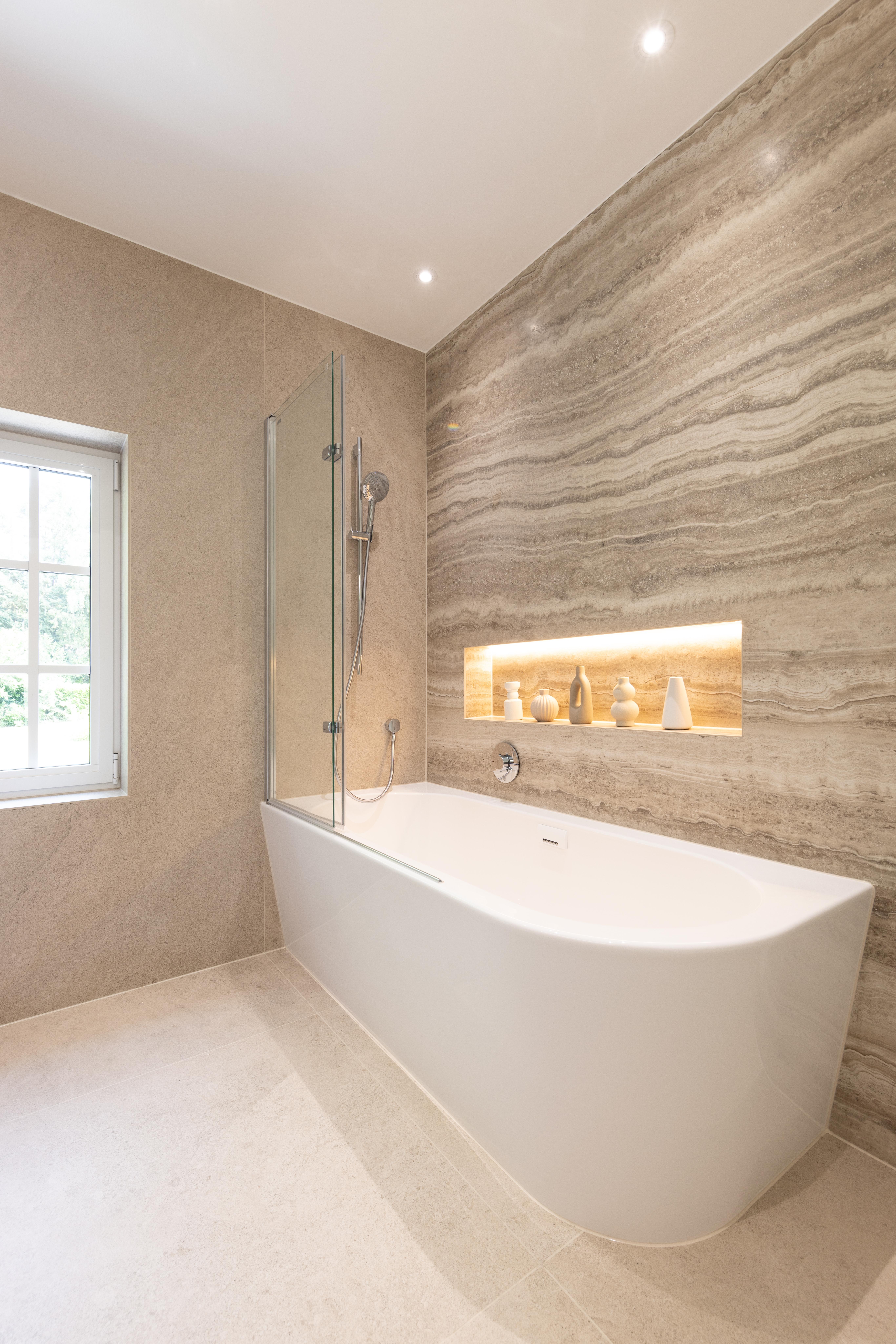 Voici une magnifique salle de bains où le client a choisi d’opter pour un élégant bain/douche. Le tout est sublimé par le carrelage KERLITE ALLURE OROBICO GLOS qui apporte une touche de sophistication et de modernité à l'ensemble.