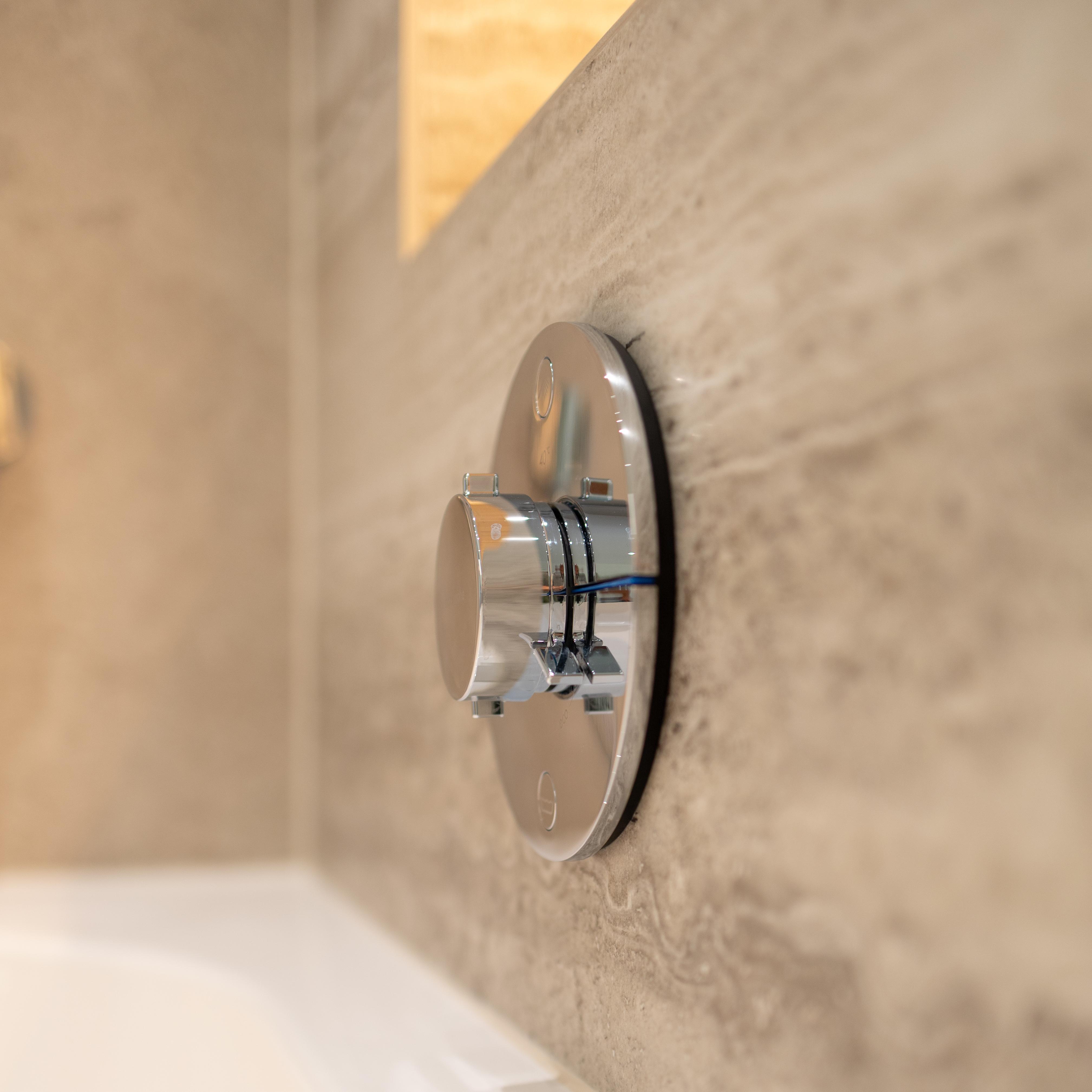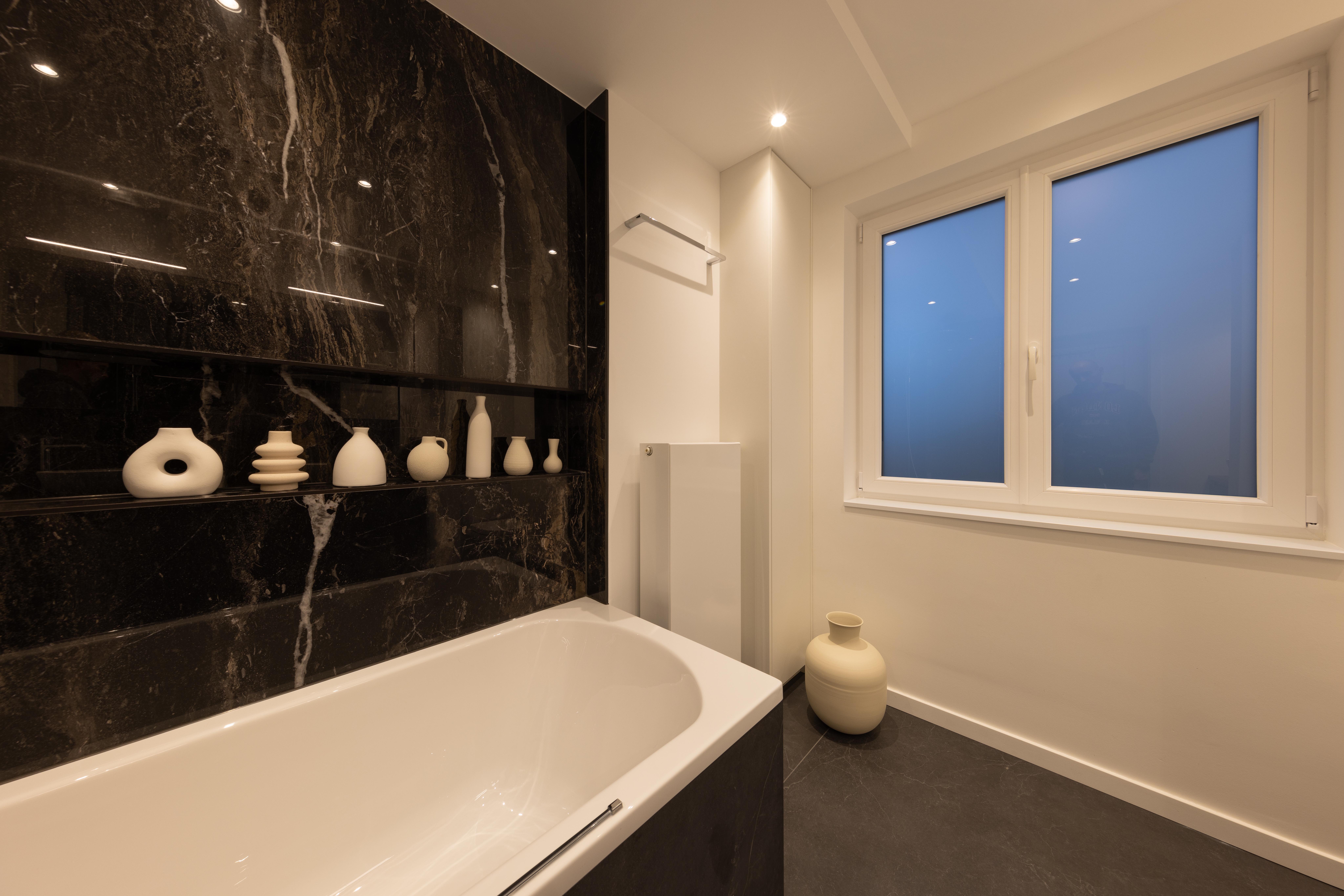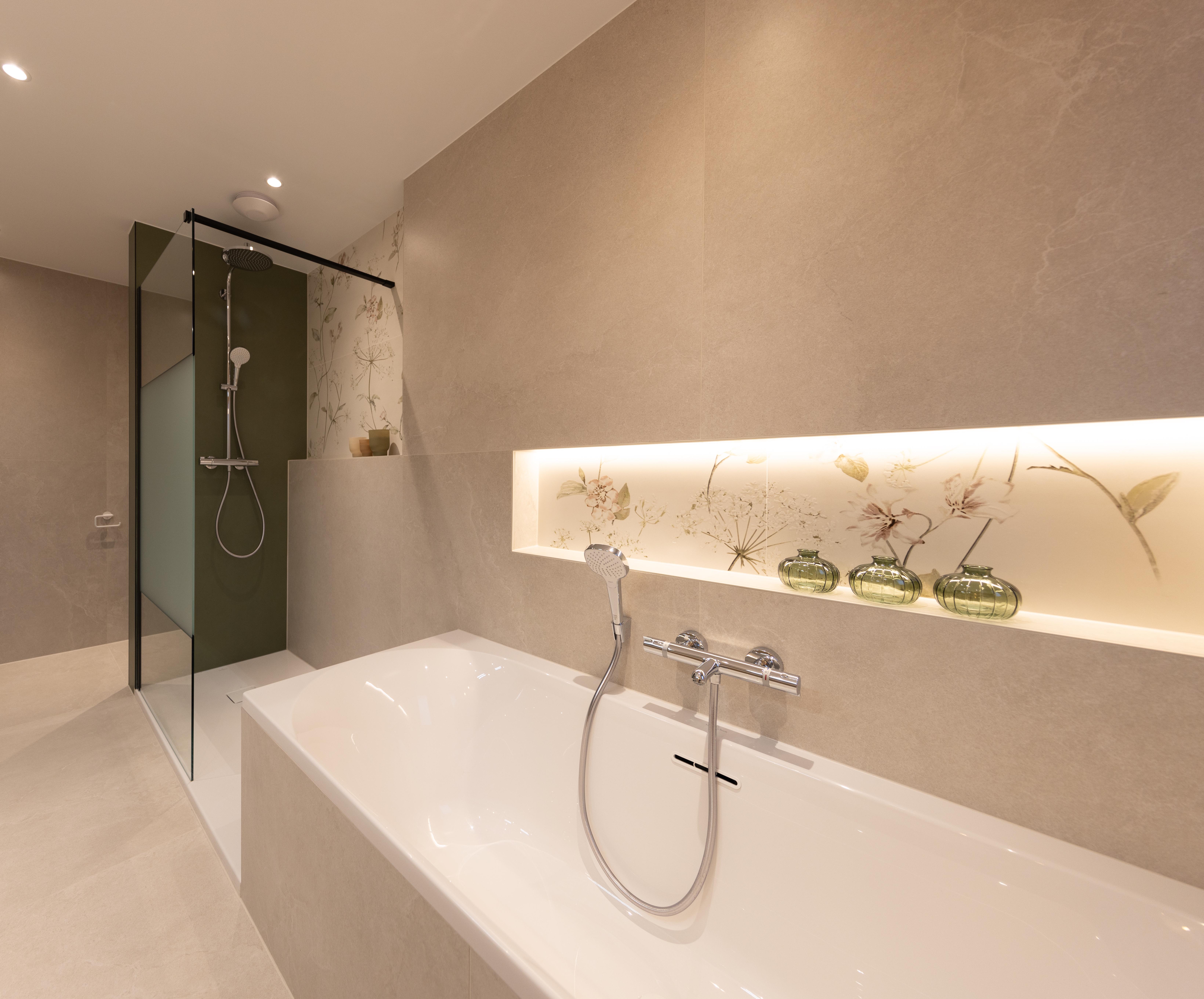 Voici une magnifique salle de bains où le client a choisi d’opter pour un élégant bain/douche. Le tout est sublimé par le carrelage KERLITE ALLURE OROBICO GLOS qui apporte une touche de sophistication et de modernité à l'ensemble.