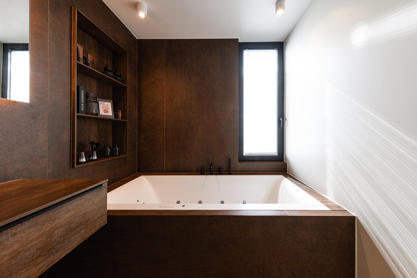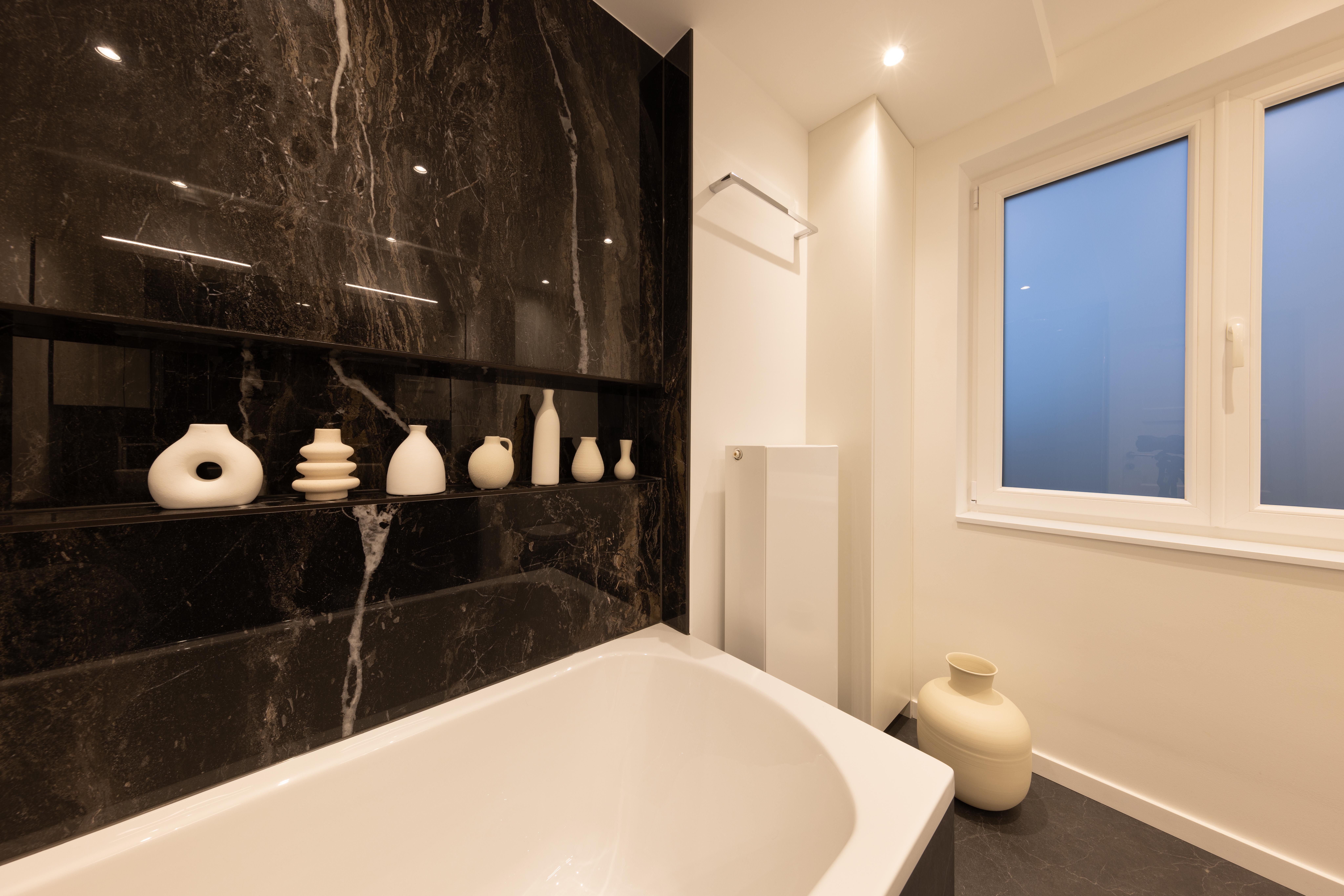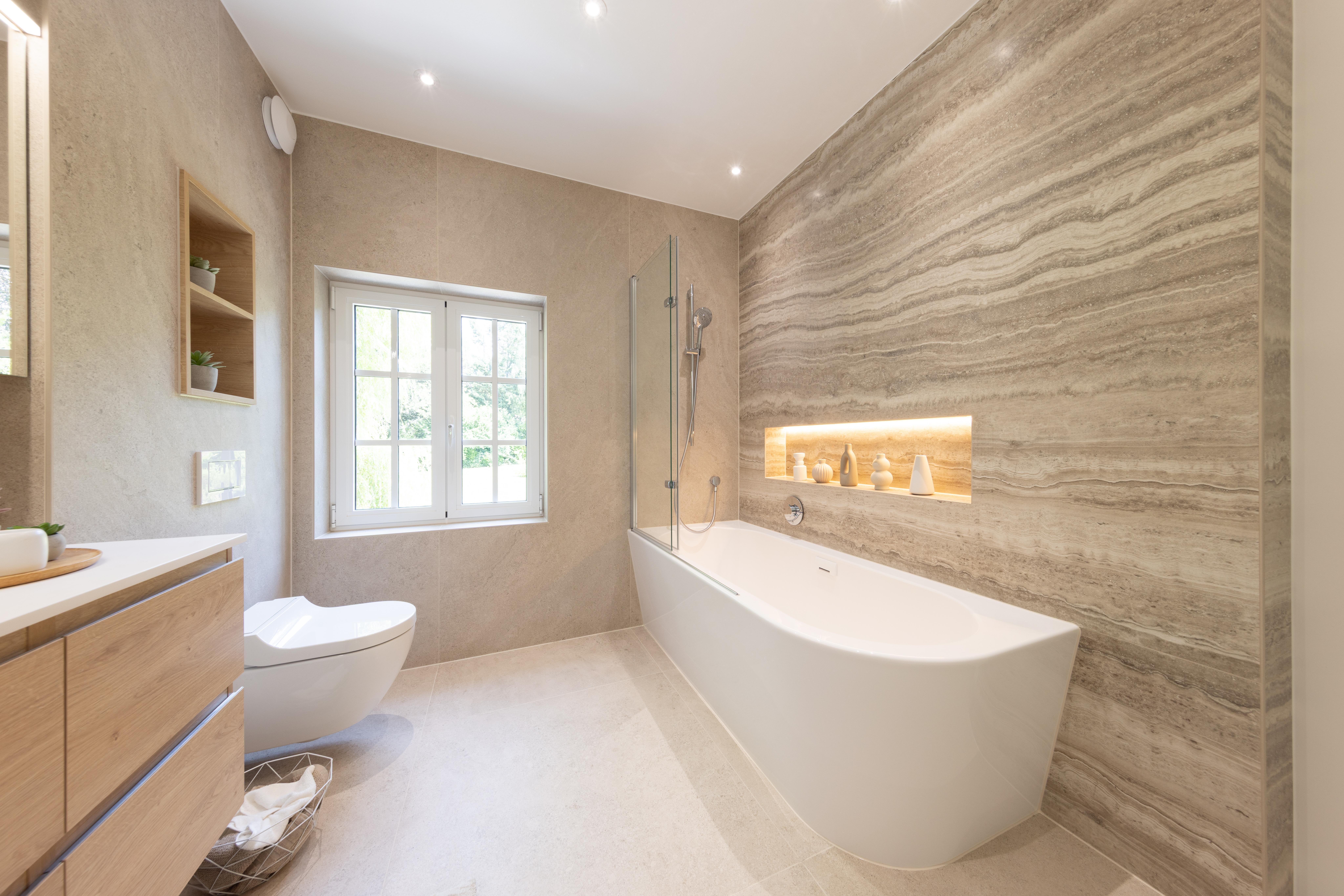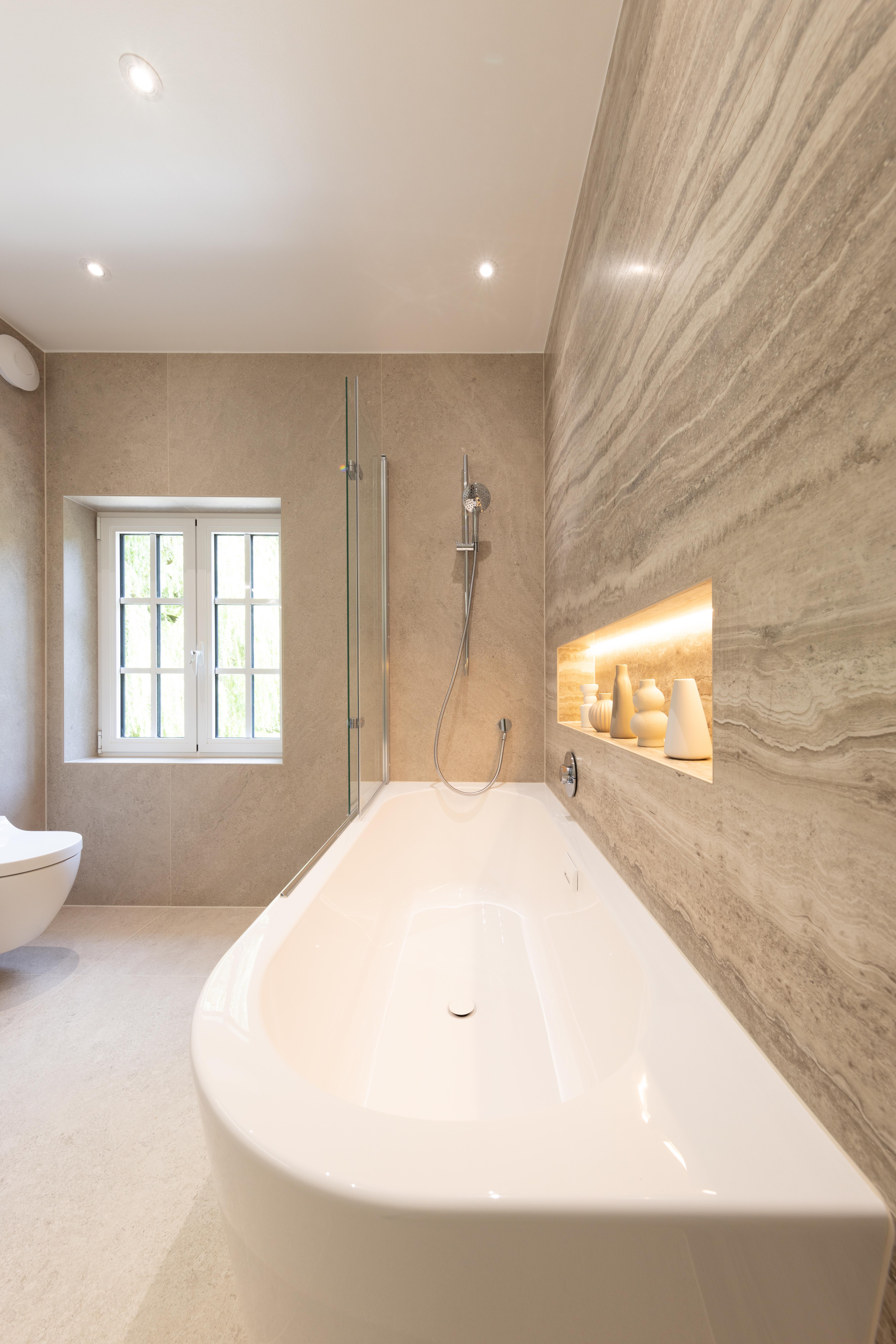 Voici une magnifique salle de bains où le client a choisi d’opter pour un élégant bain/douche. Le tout est sublimé par le carrelage KERLITE ALLURE OROBICO GLOS qui apporte une touche de sophistication et de modernité à l'ensemble.