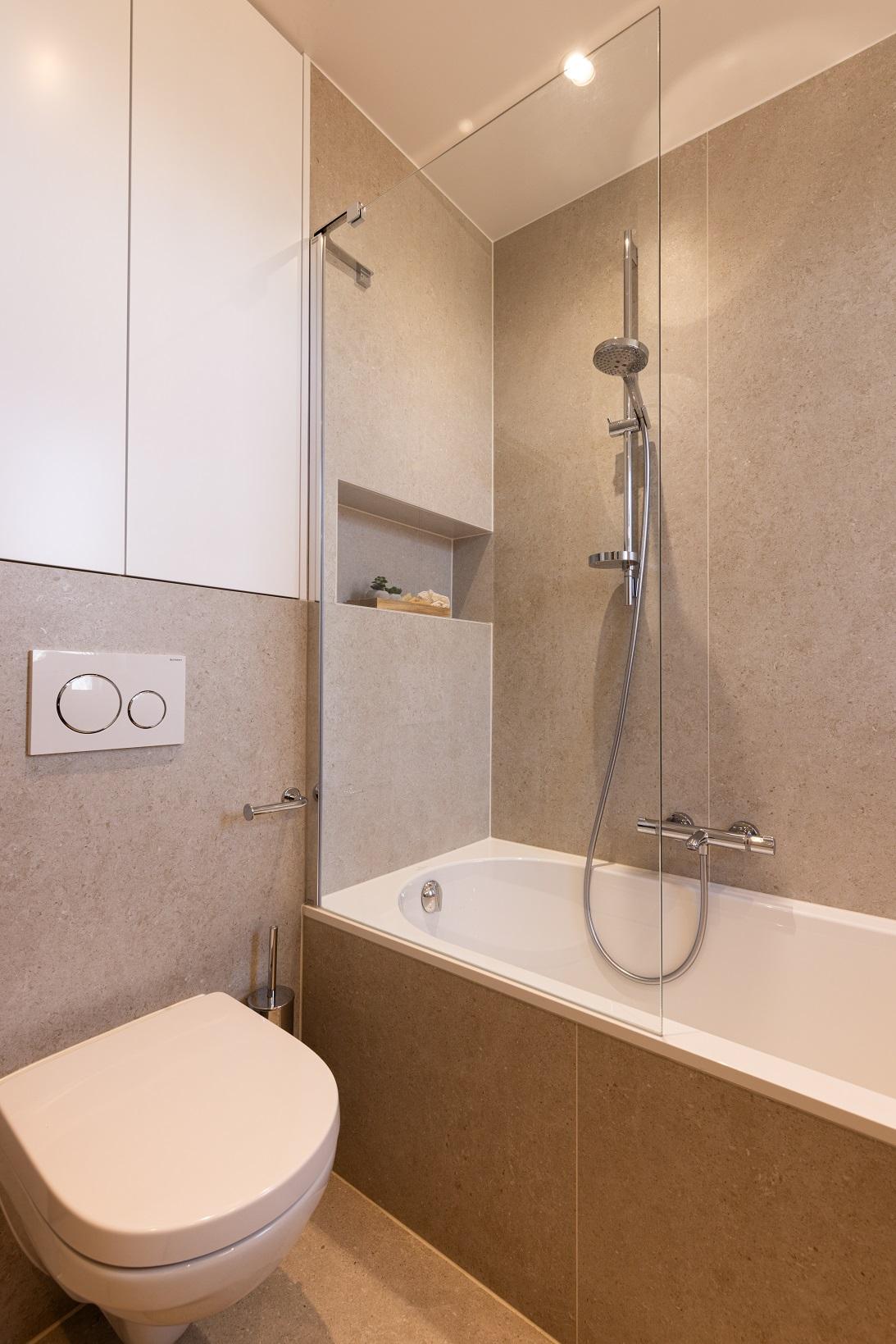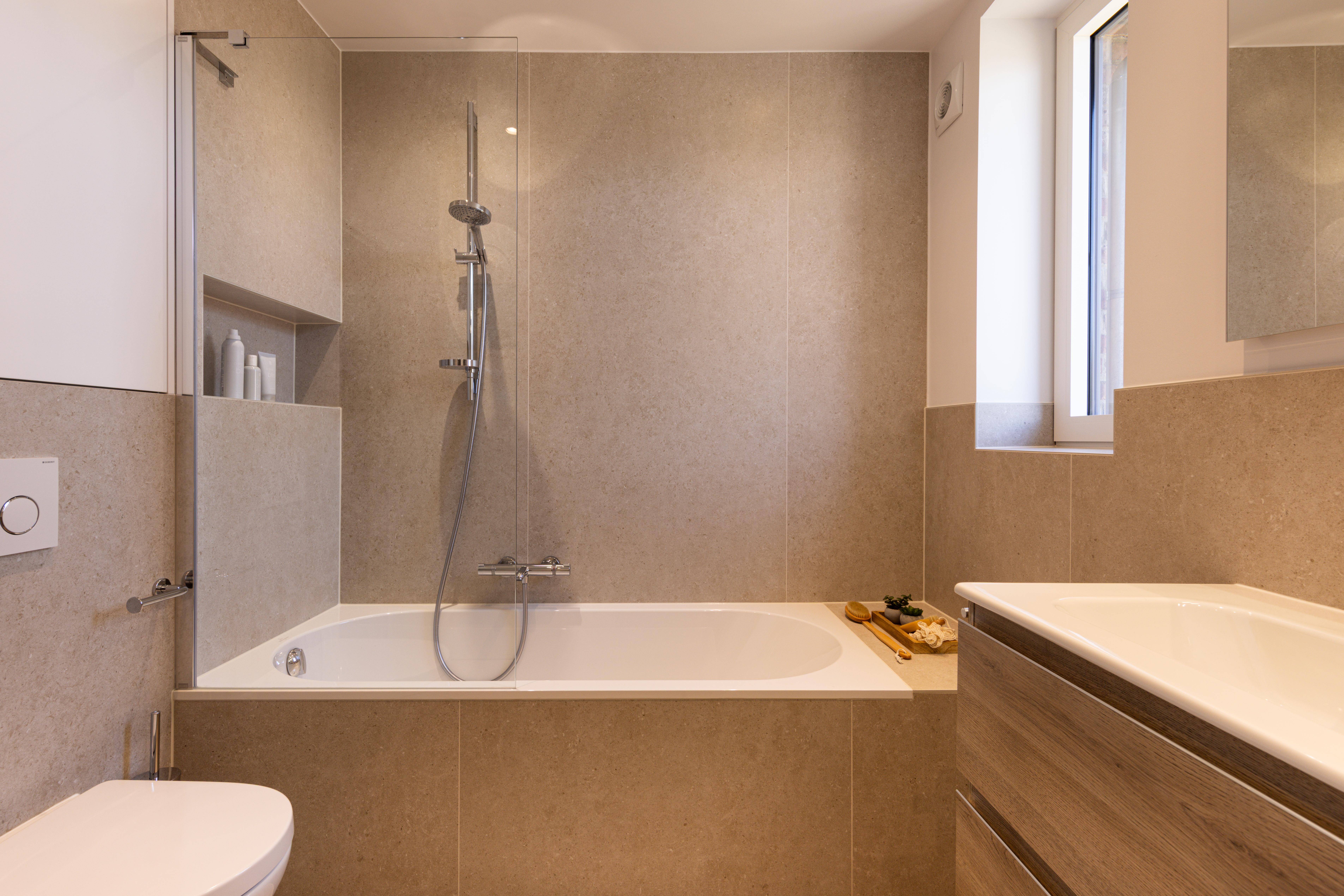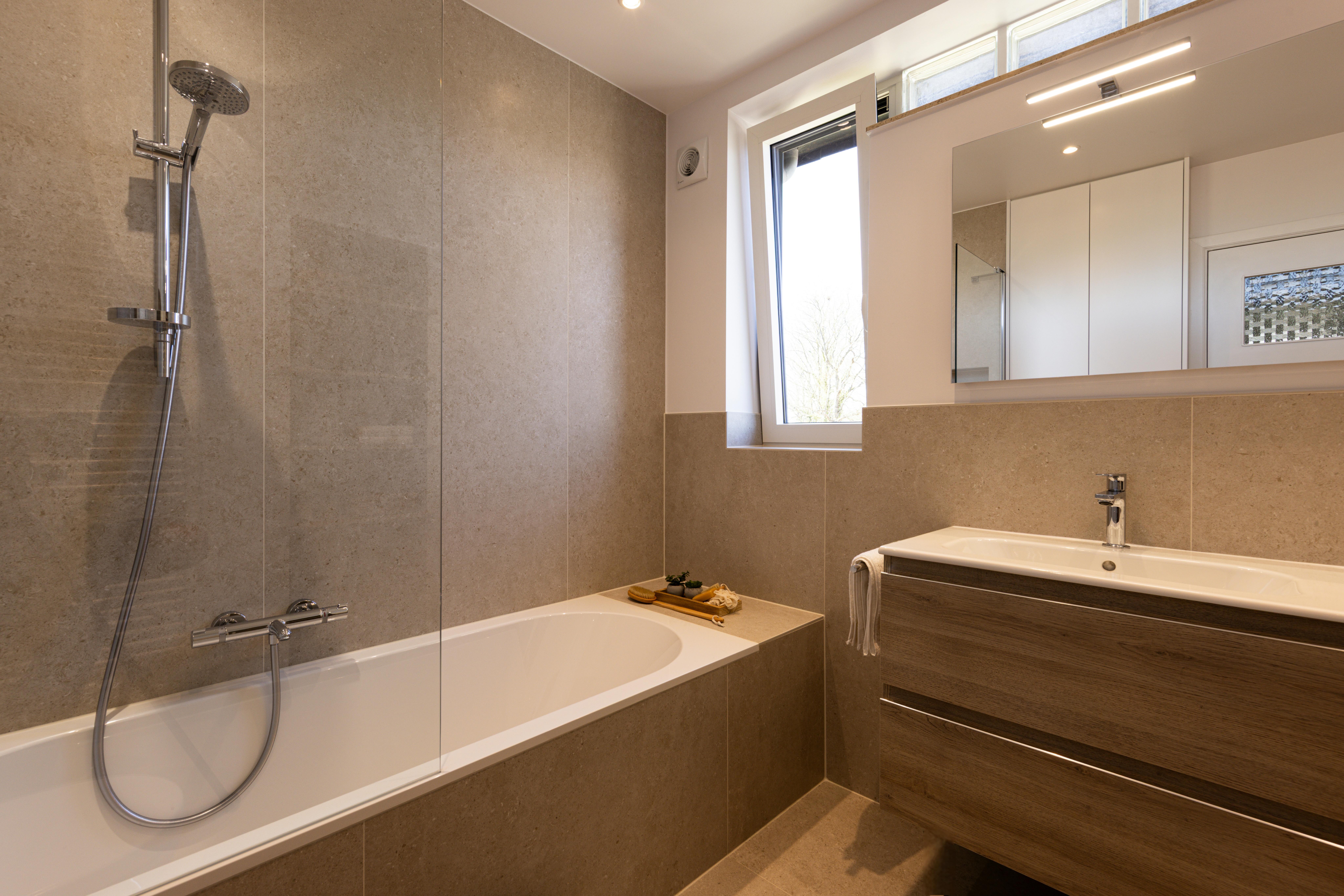 Dans la salle de bains, votre cœur balance entre la douche et la baignoire ? Vous ne disposez pas de la place dans votre salle de bains ? Vous pouvez opter comme dans ce projet d'une baignoire/douche. Vous bénéficiez alors du confort de la baignoire, qui offre des moments de relaxation incomparable et de la praticité de la douche.