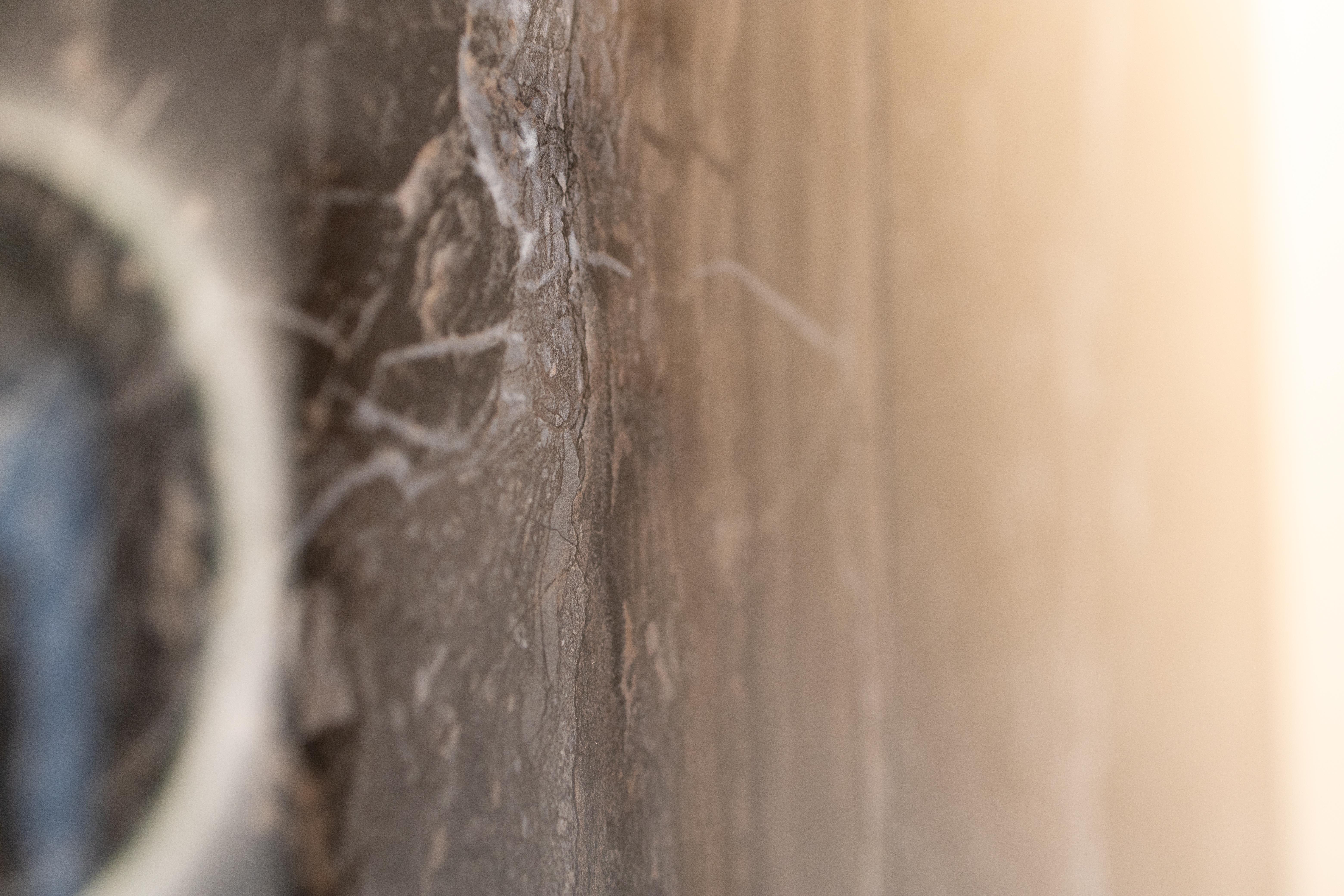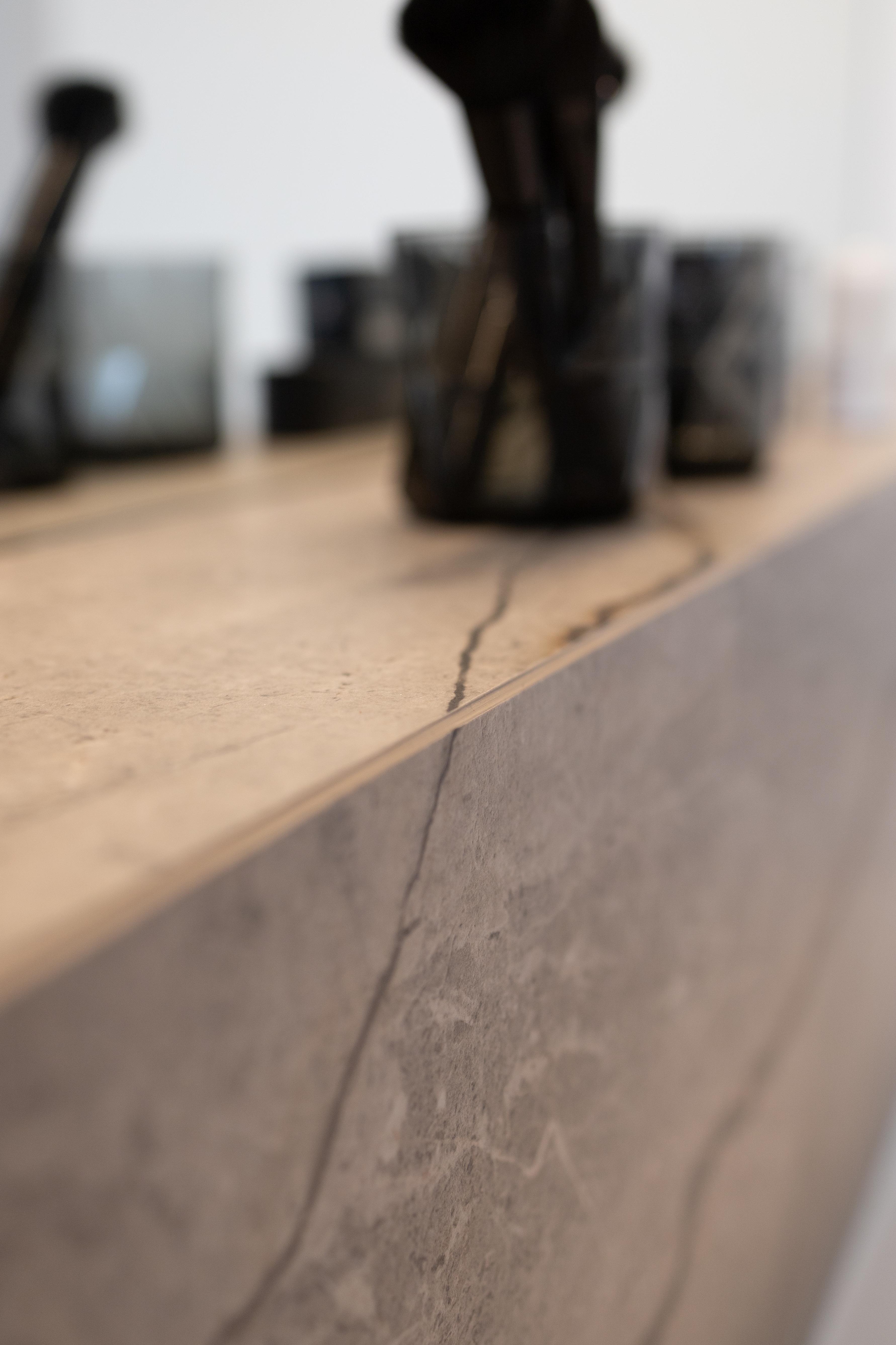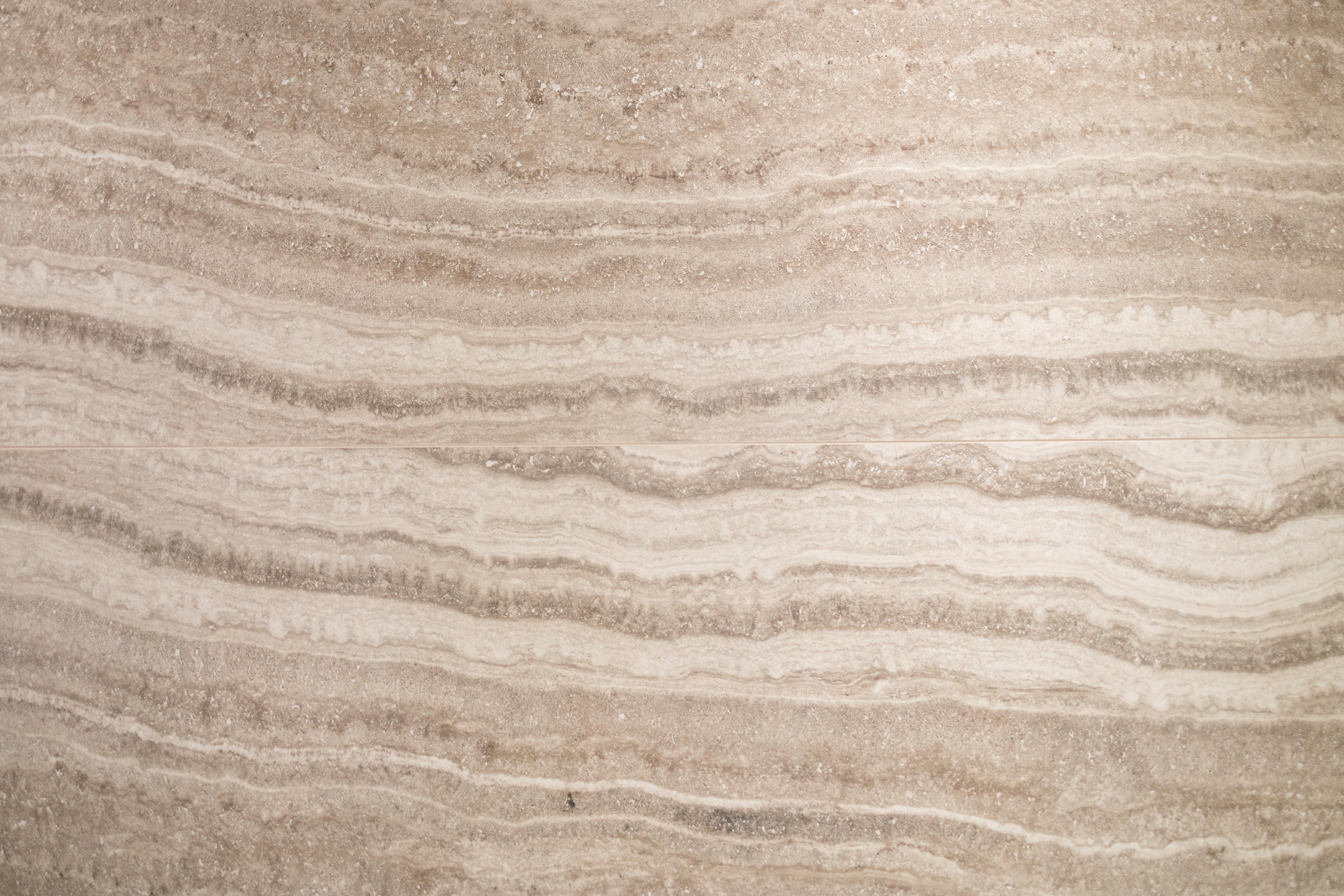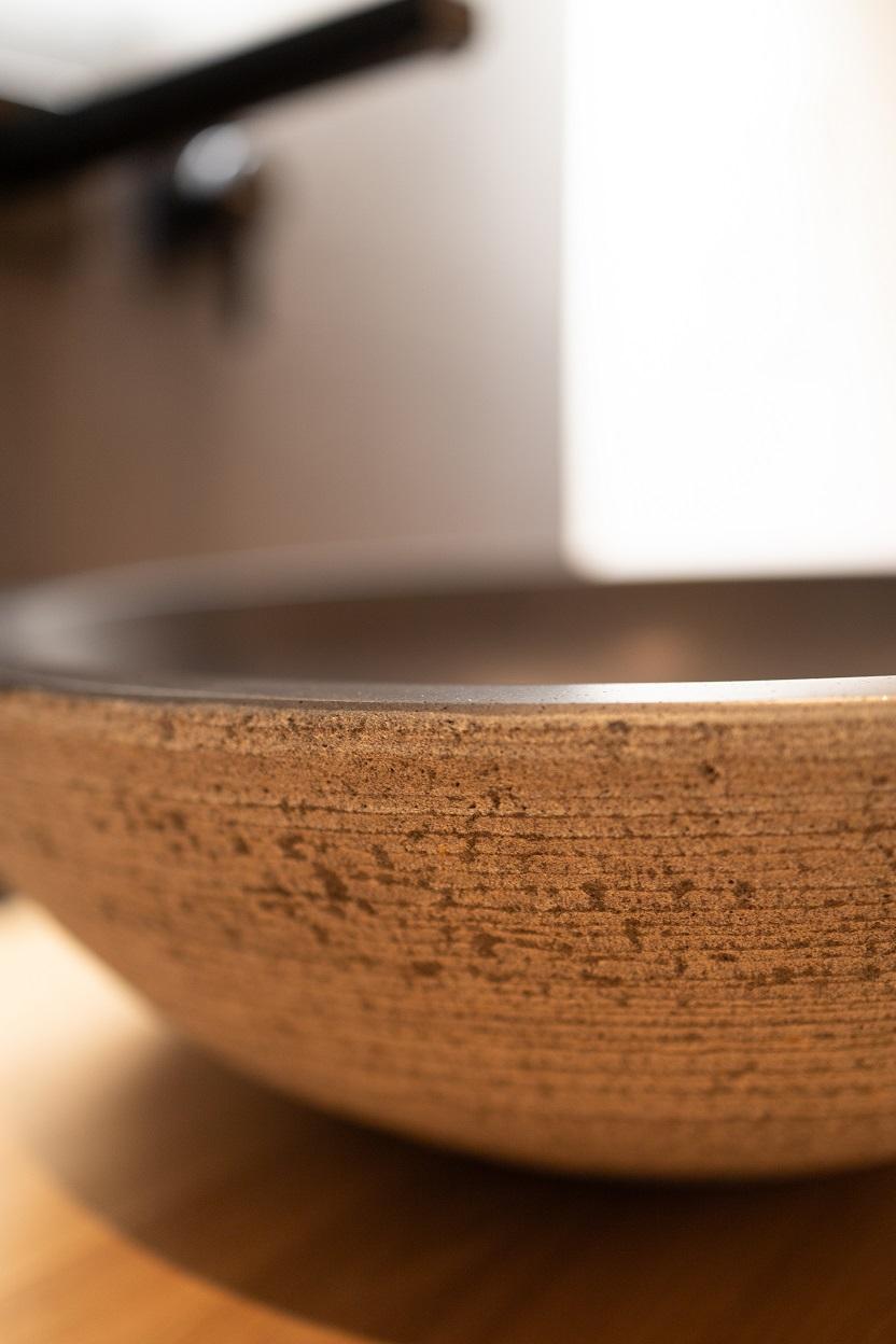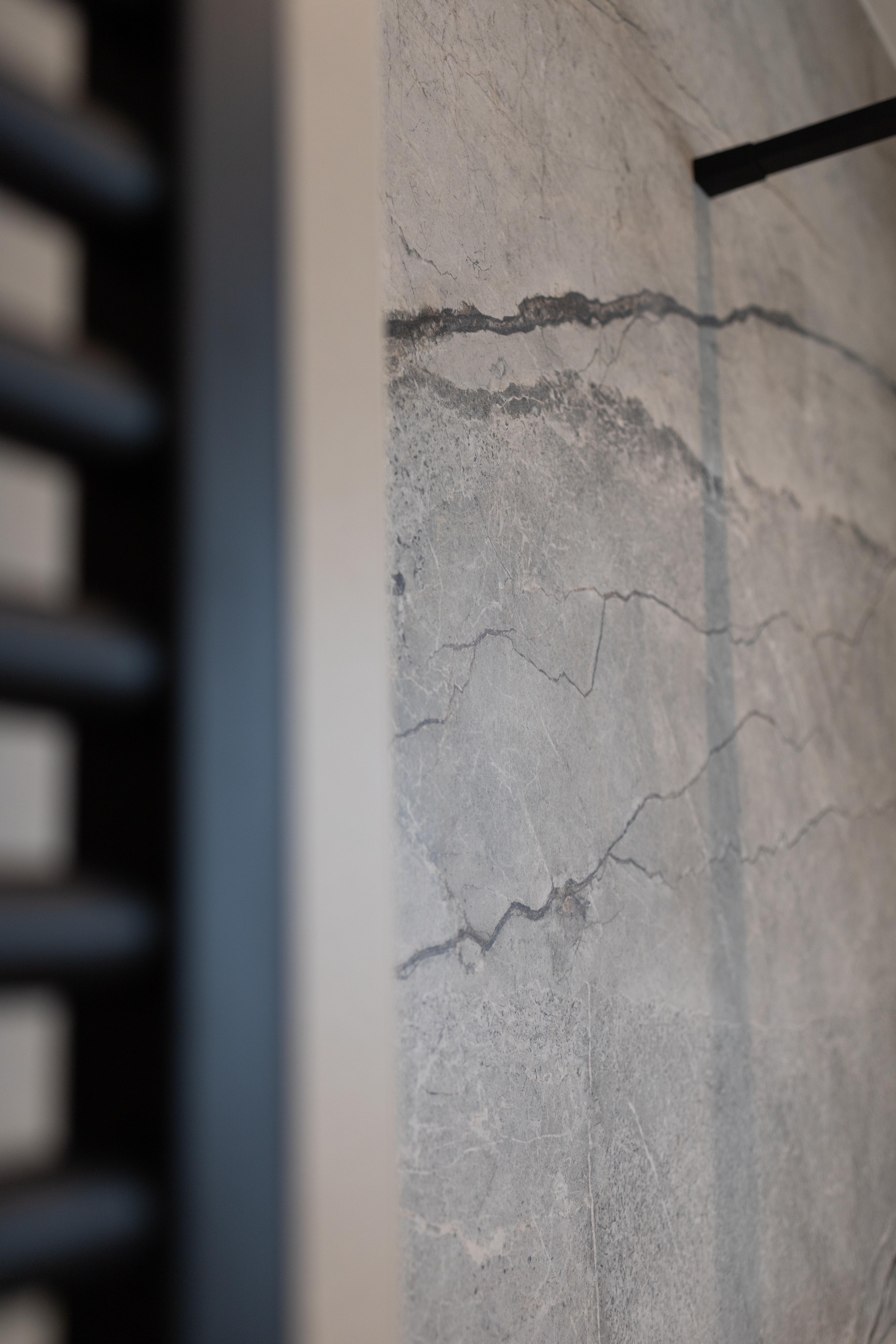 Salle de bain au design "moderne" obtenu avec le choix du carrelage qui présente une surface soigneusement rayée afin de recrée un tissu vivant (de fossiles et veines) qui donne à cet espace une personnalité énergique !