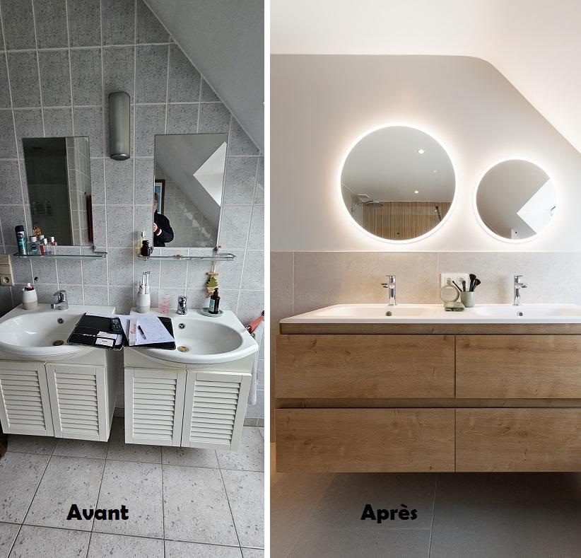 Dans ce projet, nous avons misé sur un grand miroir pour donner un visuel plus grand au volume. L'ajout d'une bande lumineuse renforce l’éclairage ambiant dans la pièce et rend l’atmosphère plus relaxant. Le grand meuble suspendu apporte un côté classe à cette magnifique salle de bains.
