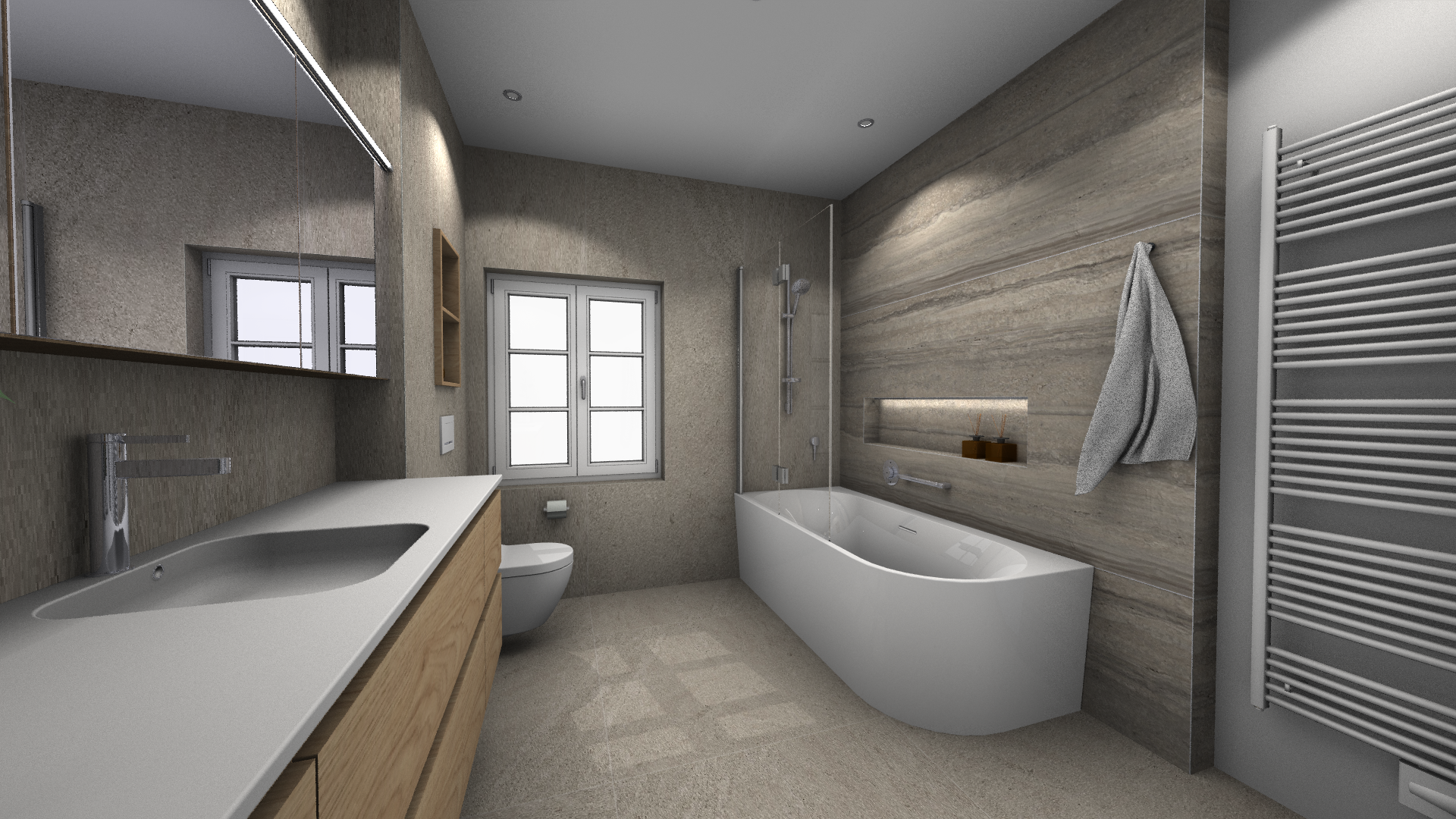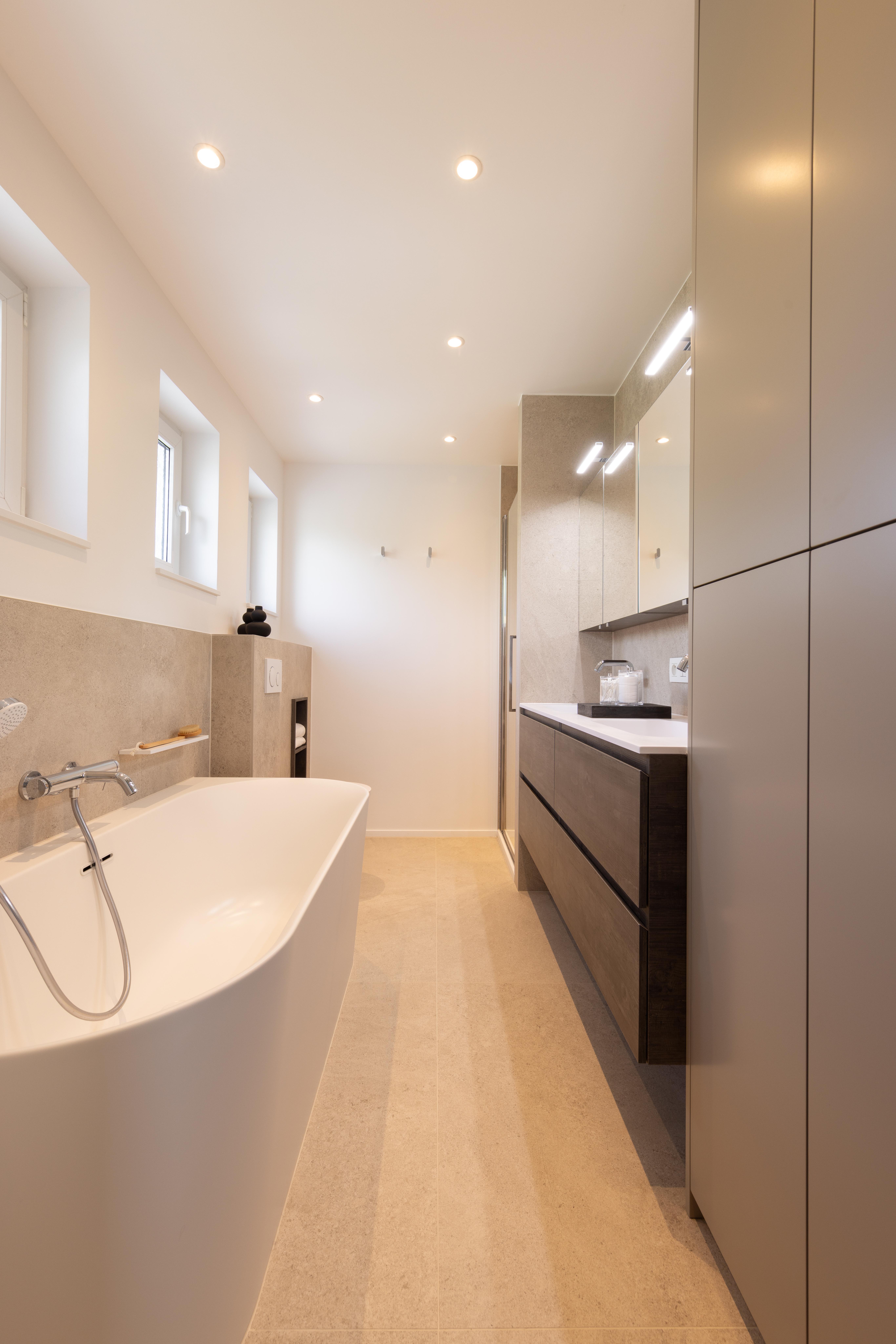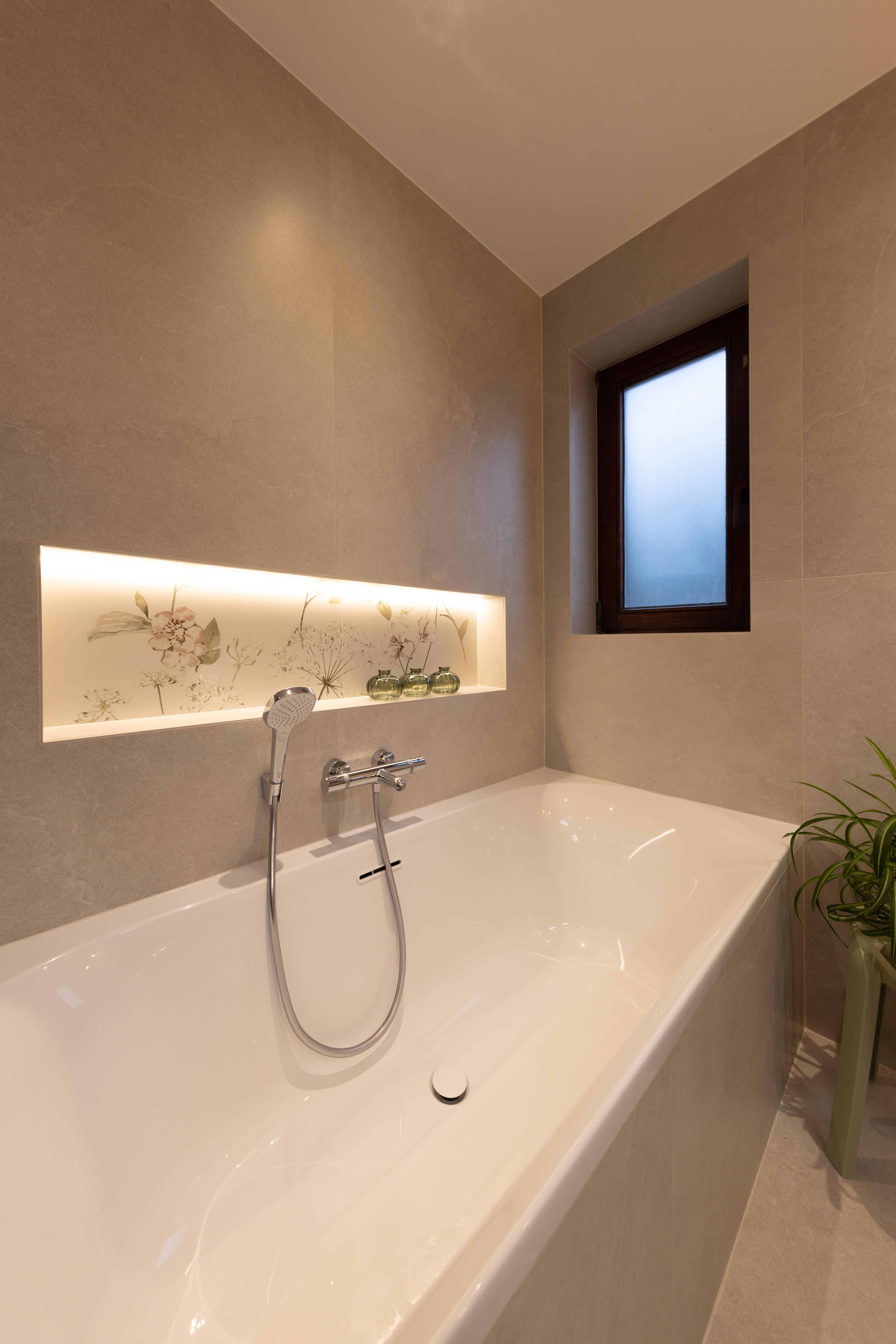 Dans ce projet, la baignoire posée en semi-îlot profite de la lumière naturelle. Pièce maîtresse de cette salle de bains, son design léger avec son habillage blanc dynamise le projet. Les lumières indirectes, le retour du mur sur lequel est posé le radiateur apporte un coin cosy au projet.