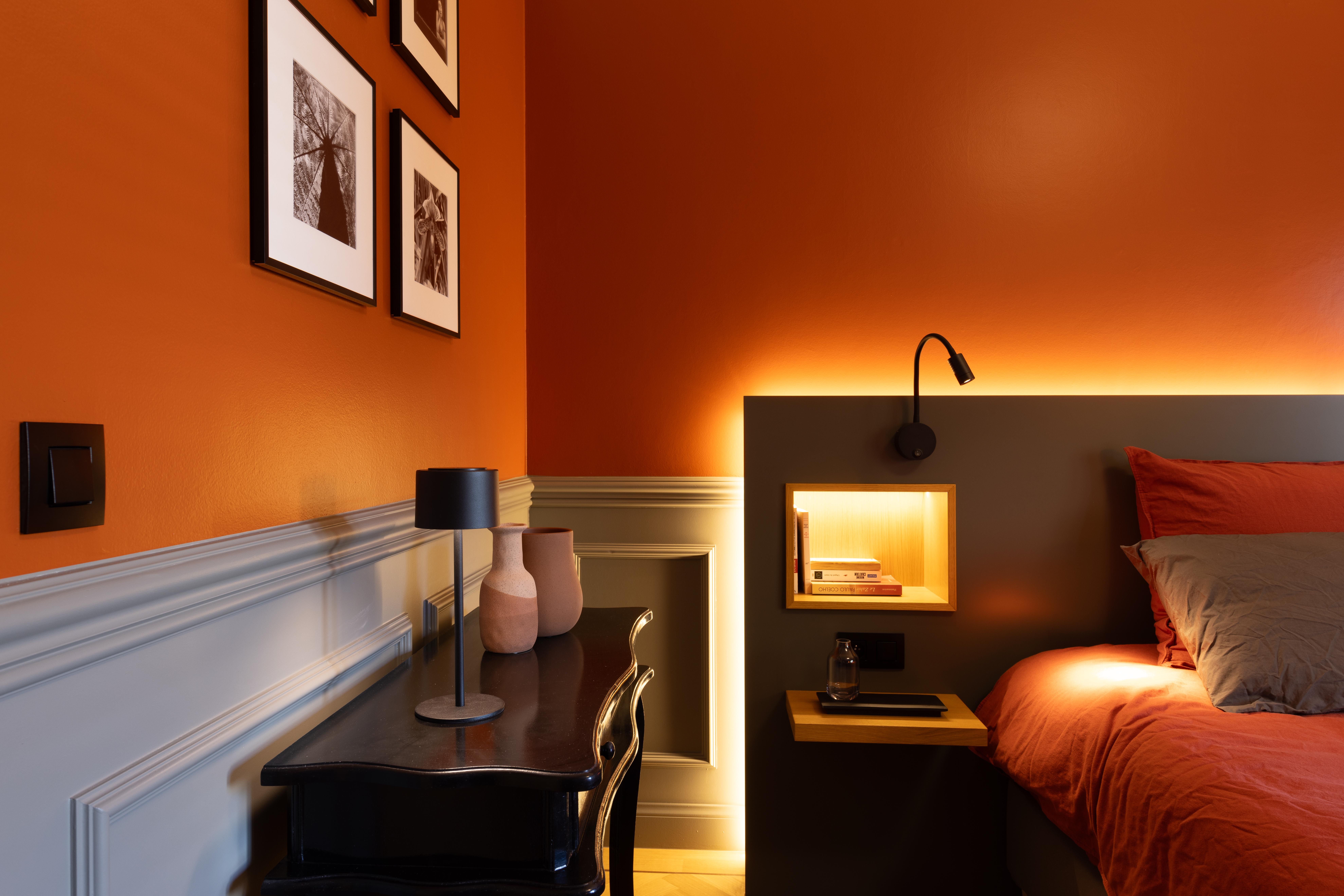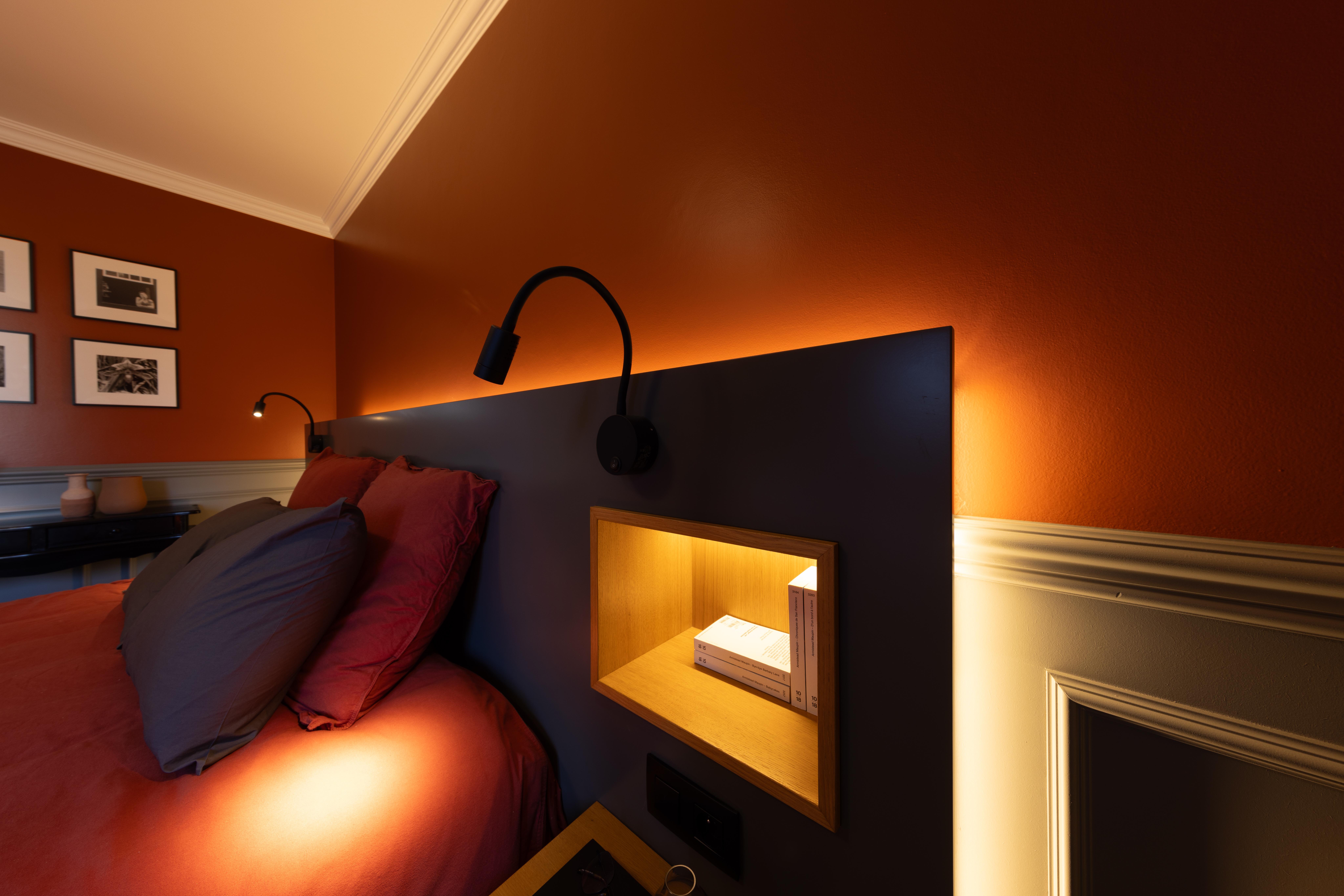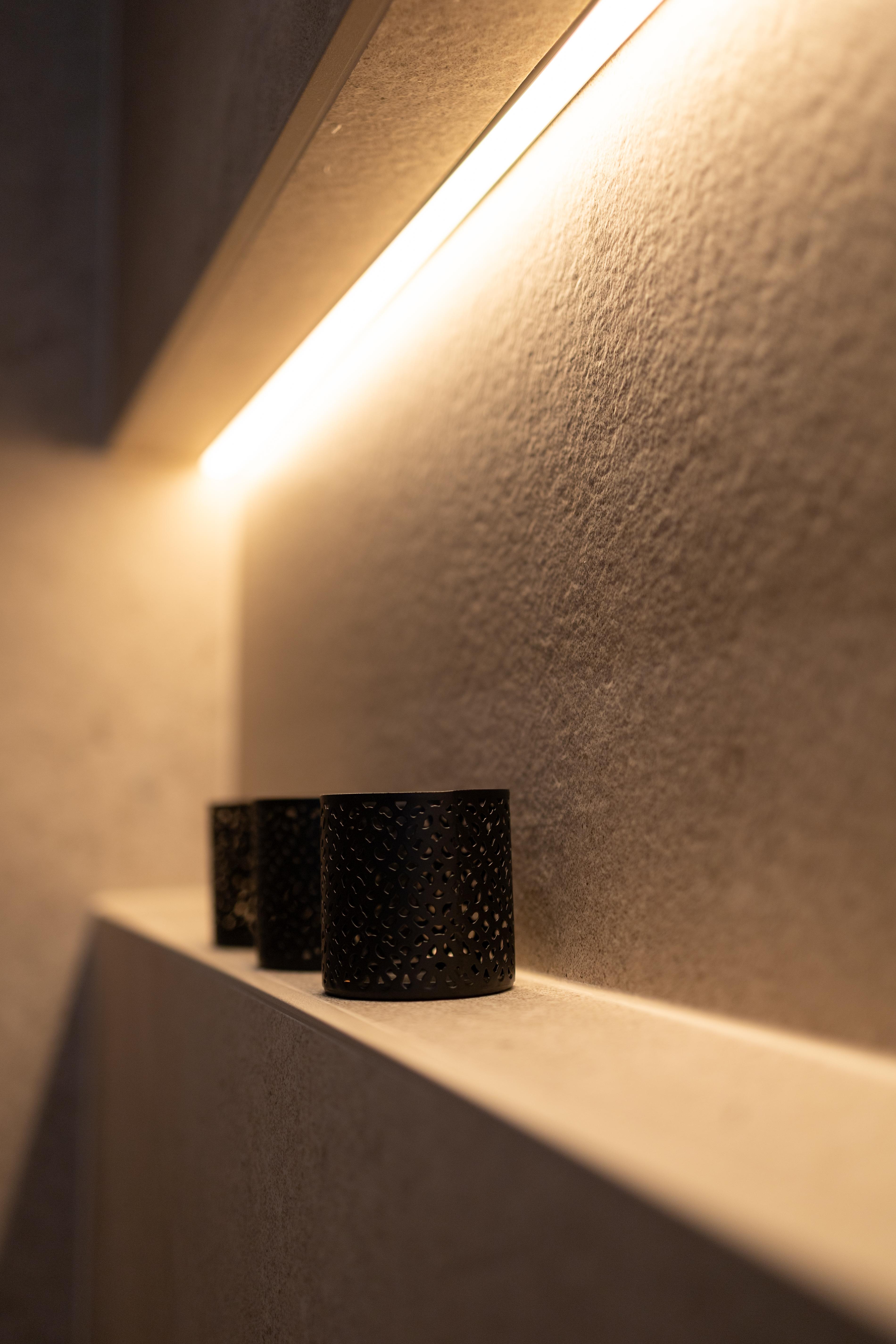 Dans ce projet l'éclairage indirect fait ressortir la couleur chaude et la structure du carrelage. Les sources de lumière sont “cachées” et la lumière est répandue efficacement dans toute la pièce.