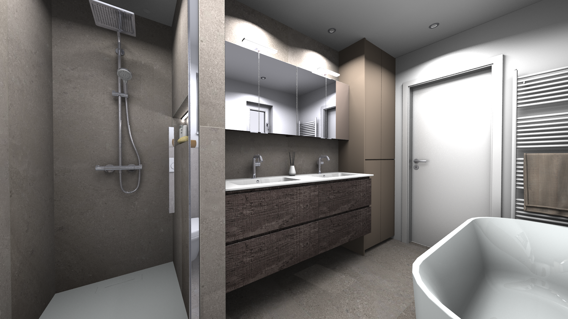 Salle de bains contemporaine "aux effets béton" rendue cosy par l'apport de quelques touches de bois qui font toute la différence.