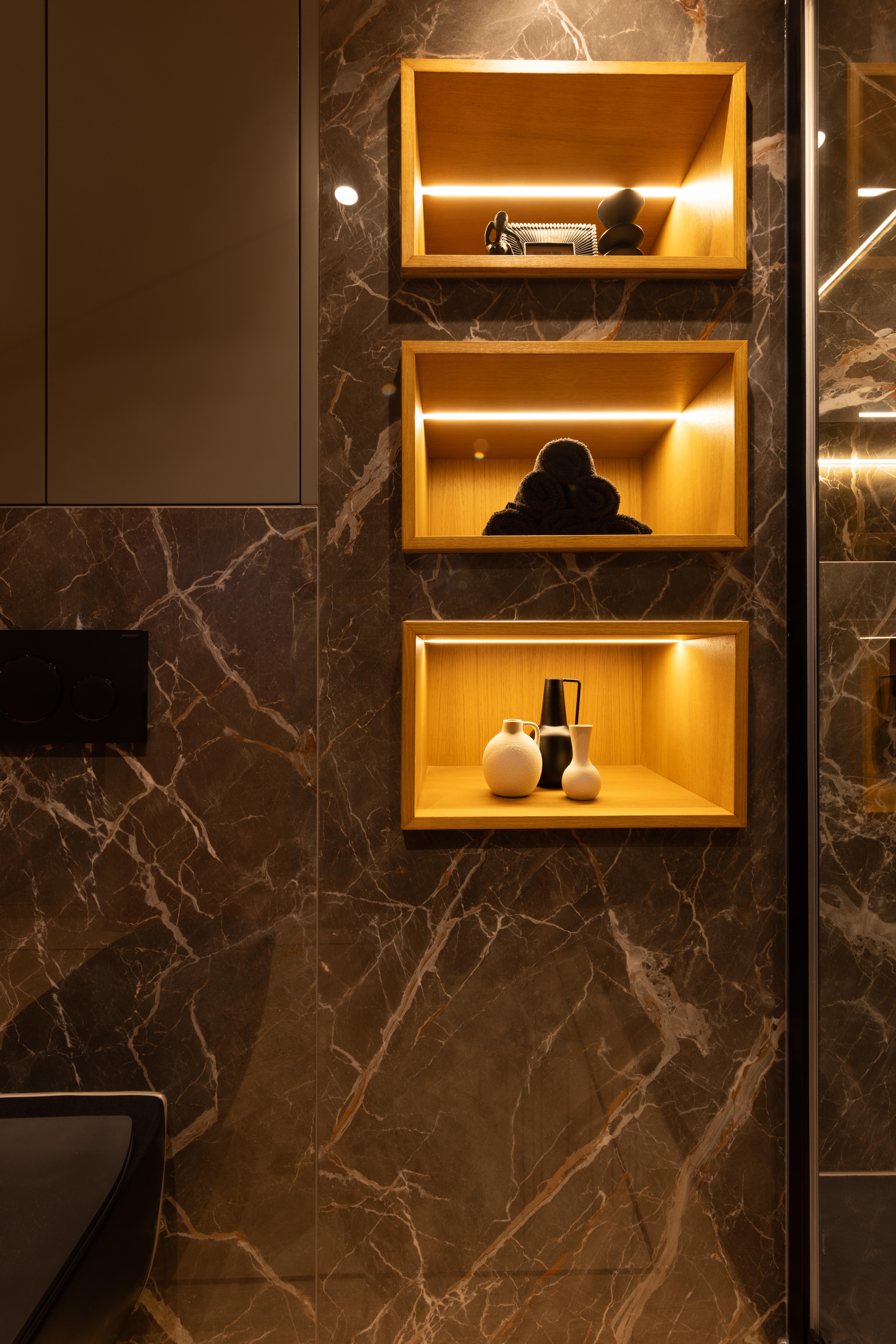 Le bois et le marbre se combinent parfaitement ensemble et cette belle combinaison apporte de la lumière et de la brillance dans la salle de bain.