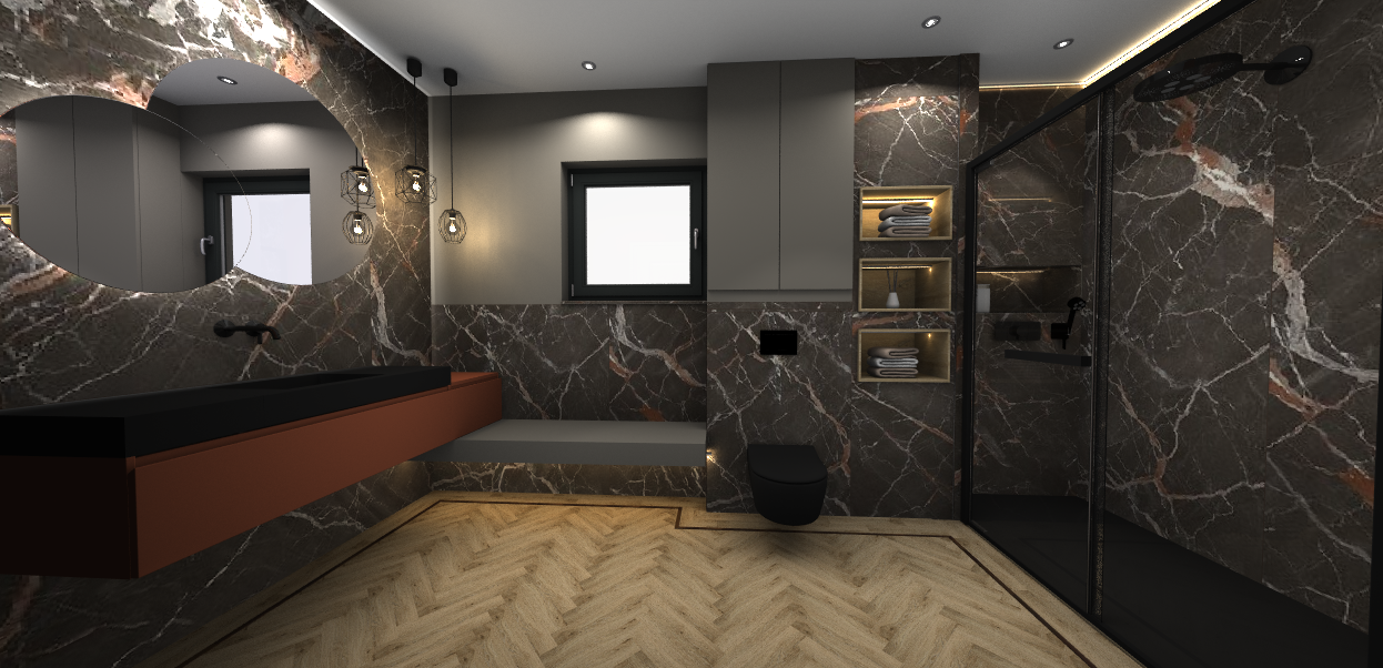 Salle de douche oscillant entre tradition et intemporalité grâce à des textures riche en nuances. L'ajout de l'effet marbre accentue le charme classique de ce projet.