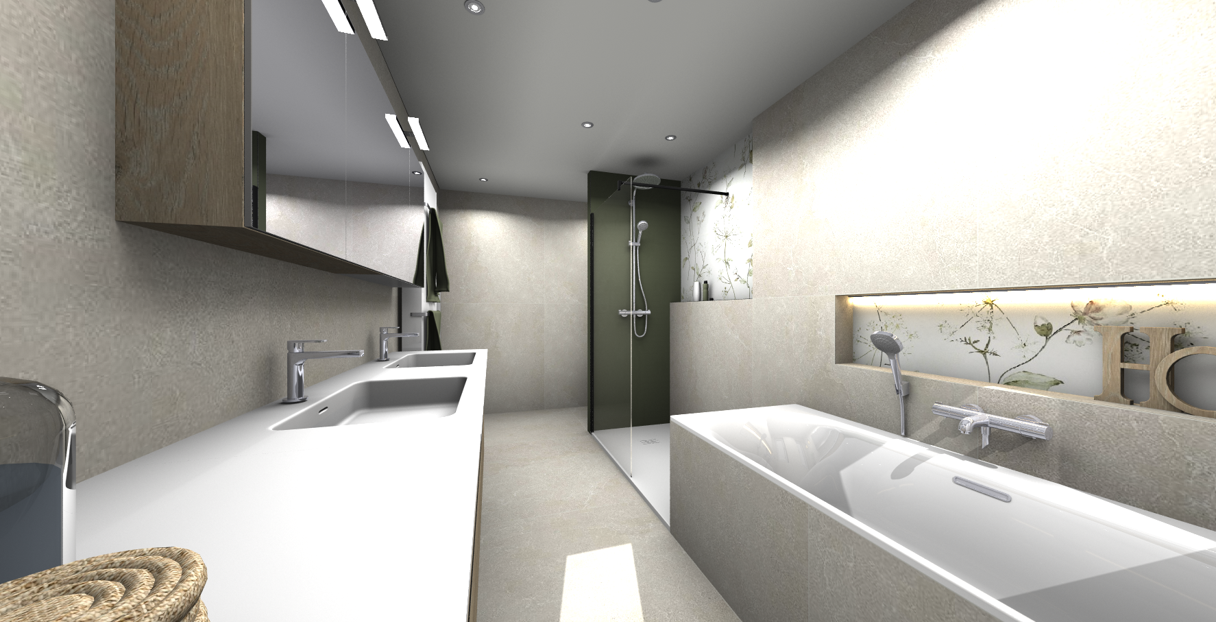 Pour faire écho à la nature, on retrouve dans ce projet un meuble vasque coloris bois et une décoration qui rappelle la végétation. Les Zelliges aux tons "green" viennent accentuer l'aspect végétal.