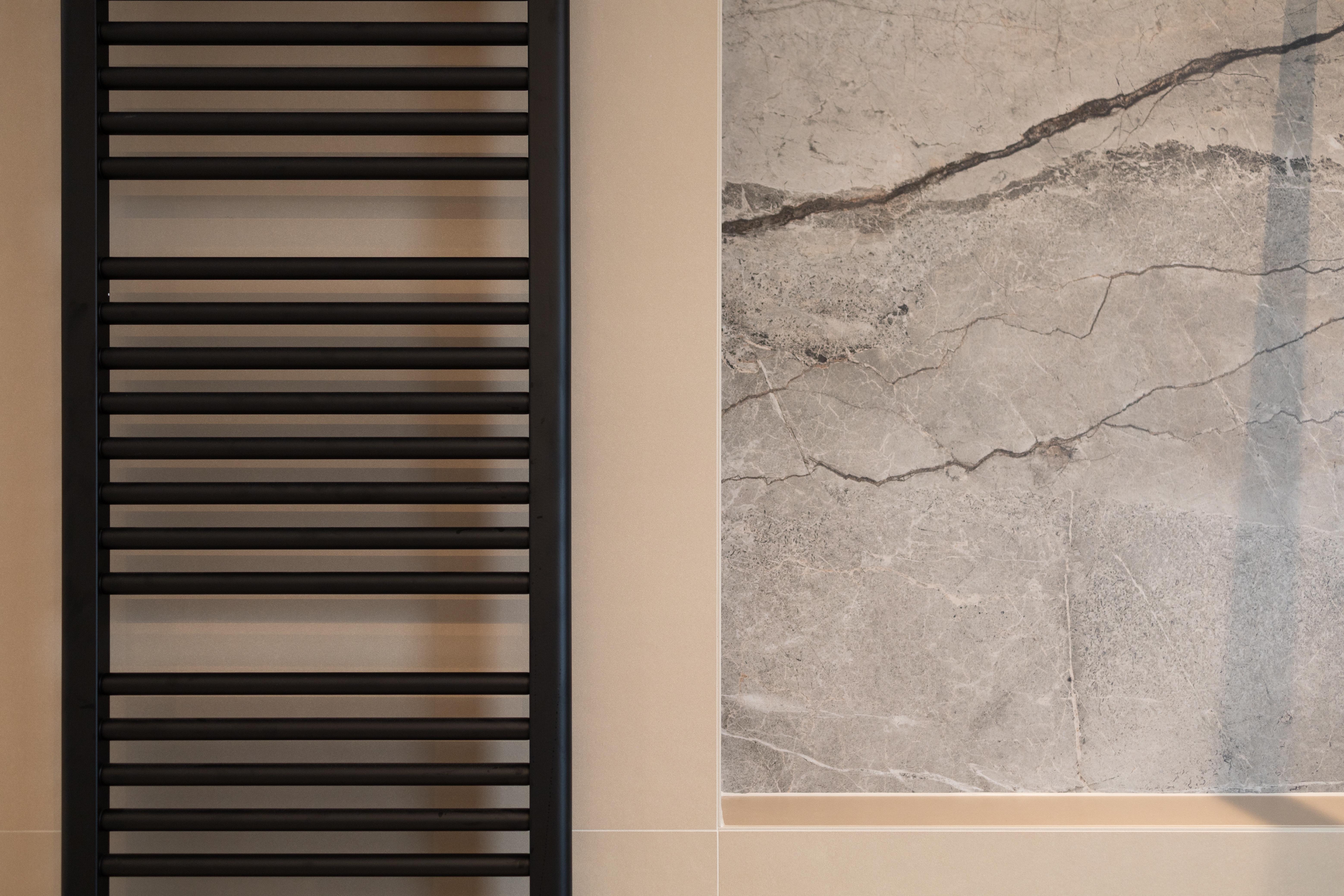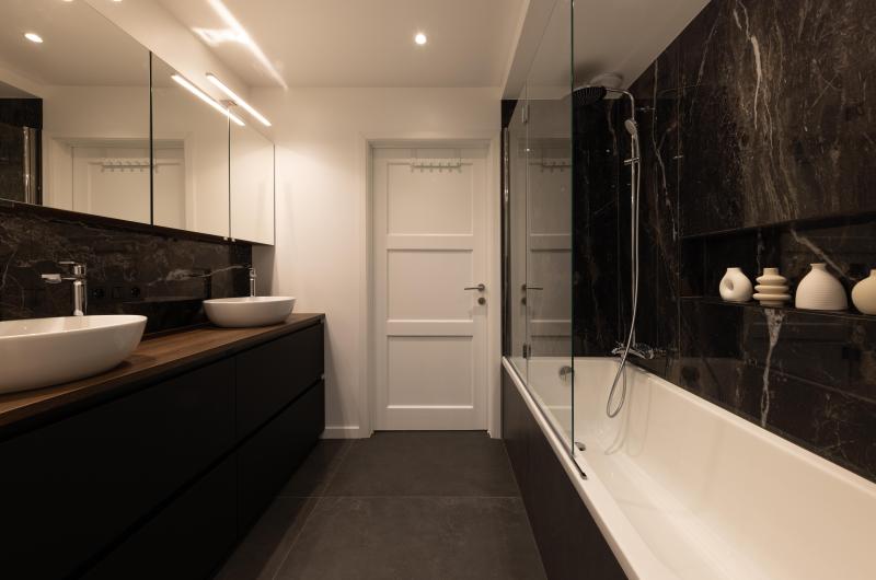 Salle de bains à la pointe de la tendance avec l’utilisation du carrelage marbre de grand format et d'une touche déco "noire". Loin de l'idée vieillotte véhiculée par certains quand on parle de marbre. Ici son association à des éléments contemporains le met en valeur et lui donne sans conteste une modernité assurée.