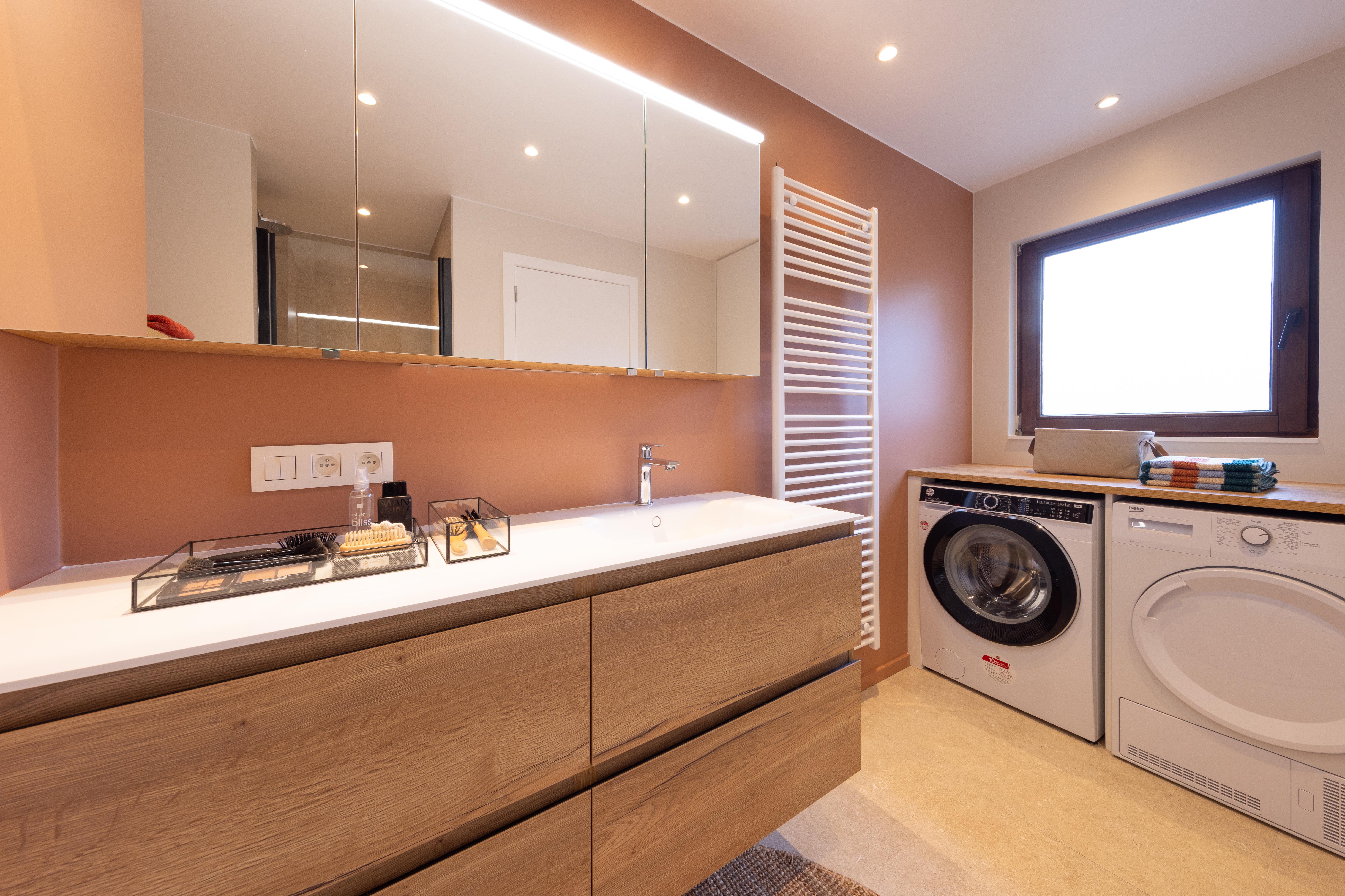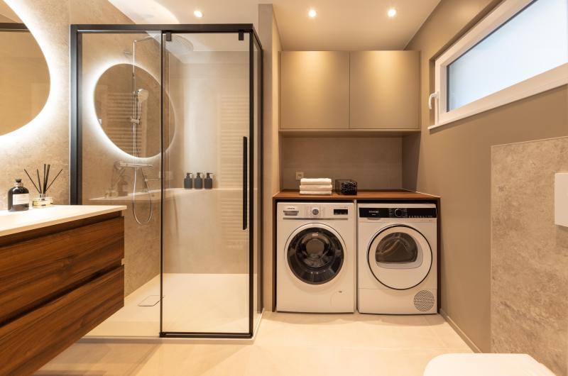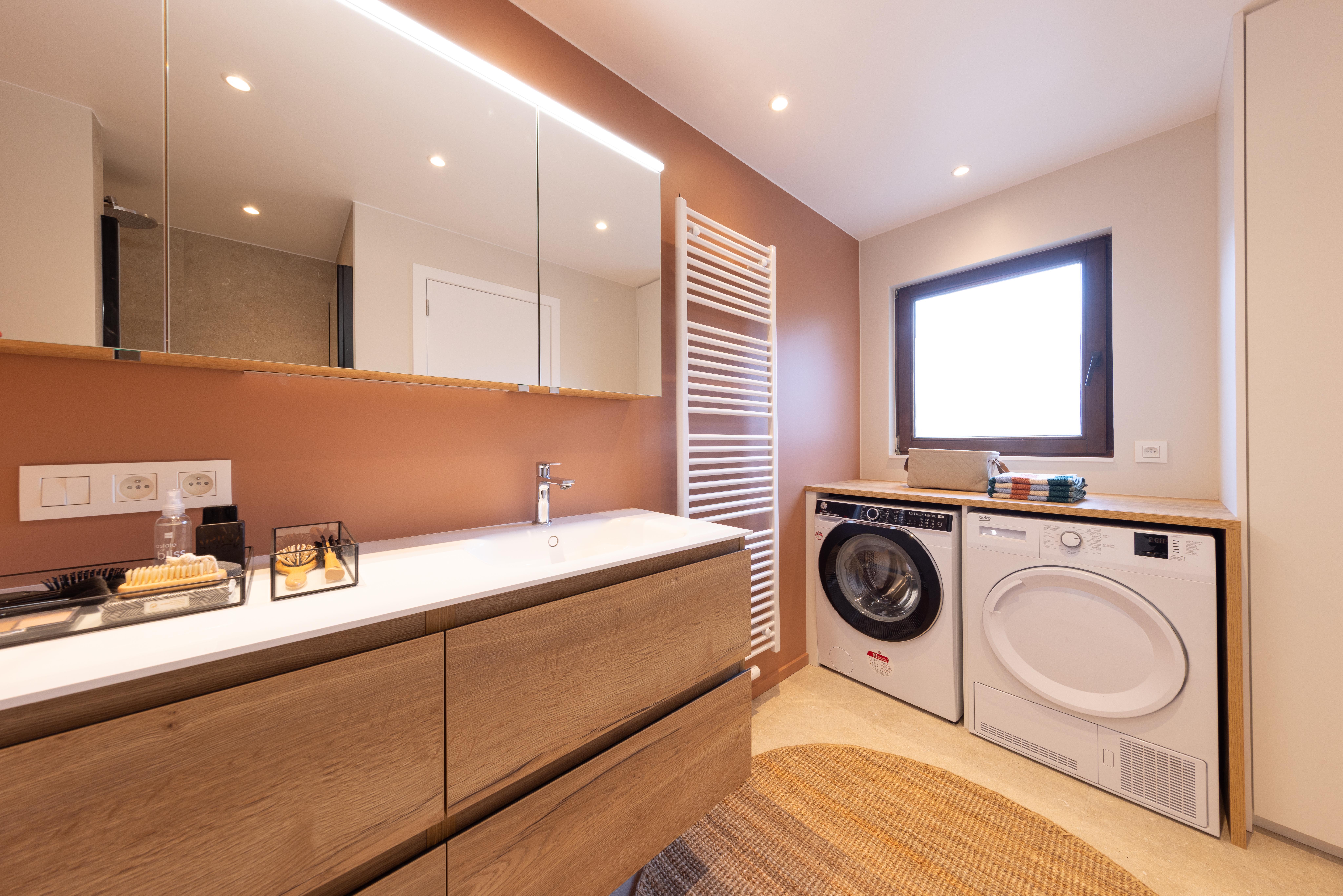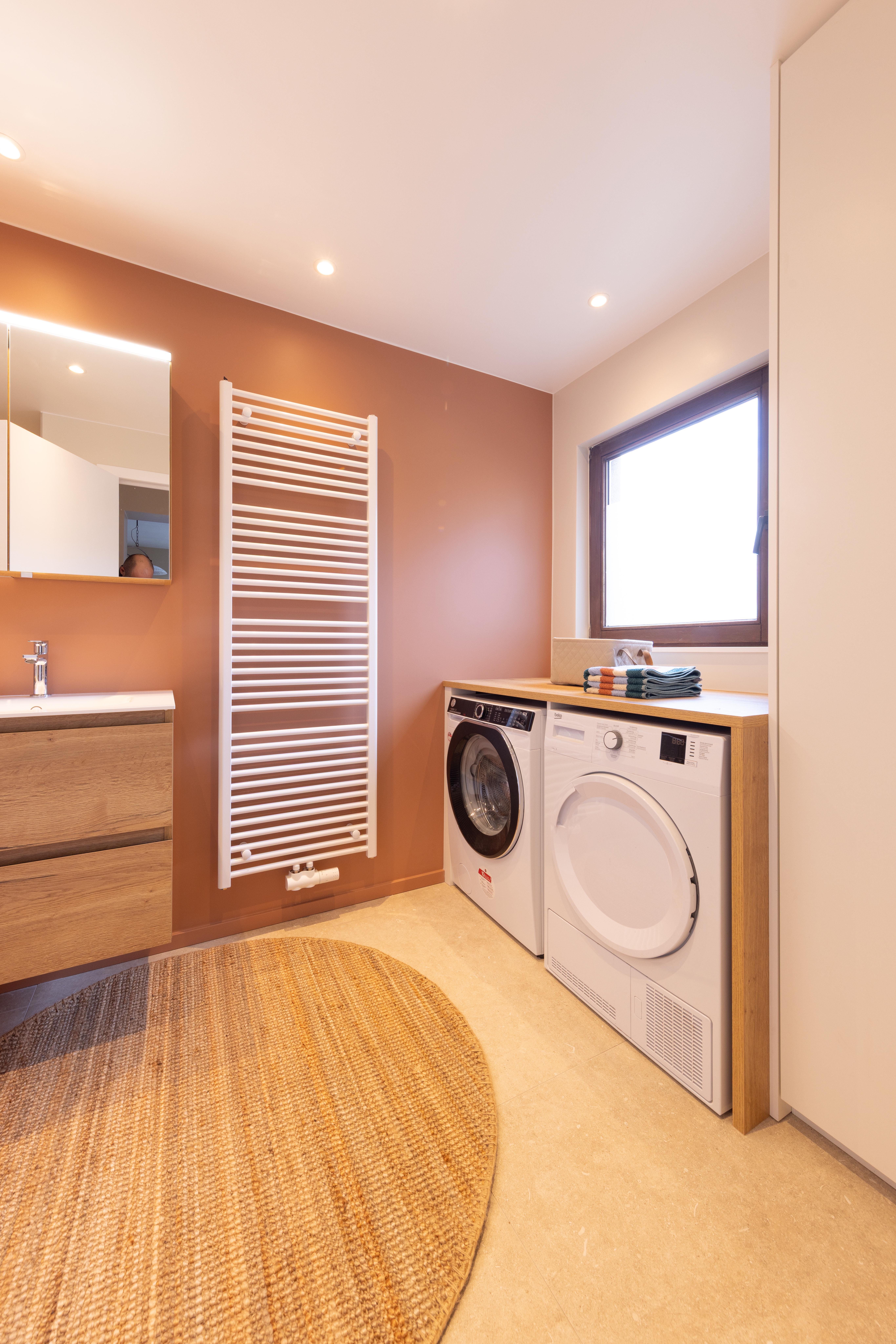 Il arrive que l'on n'ait pas le choix d'intégrer le lave-linge, voire le sèche-linge, dans la salle de bains. Voici un projet qui démontre que la cohabitation peut être esthétique et fonctionnelle.