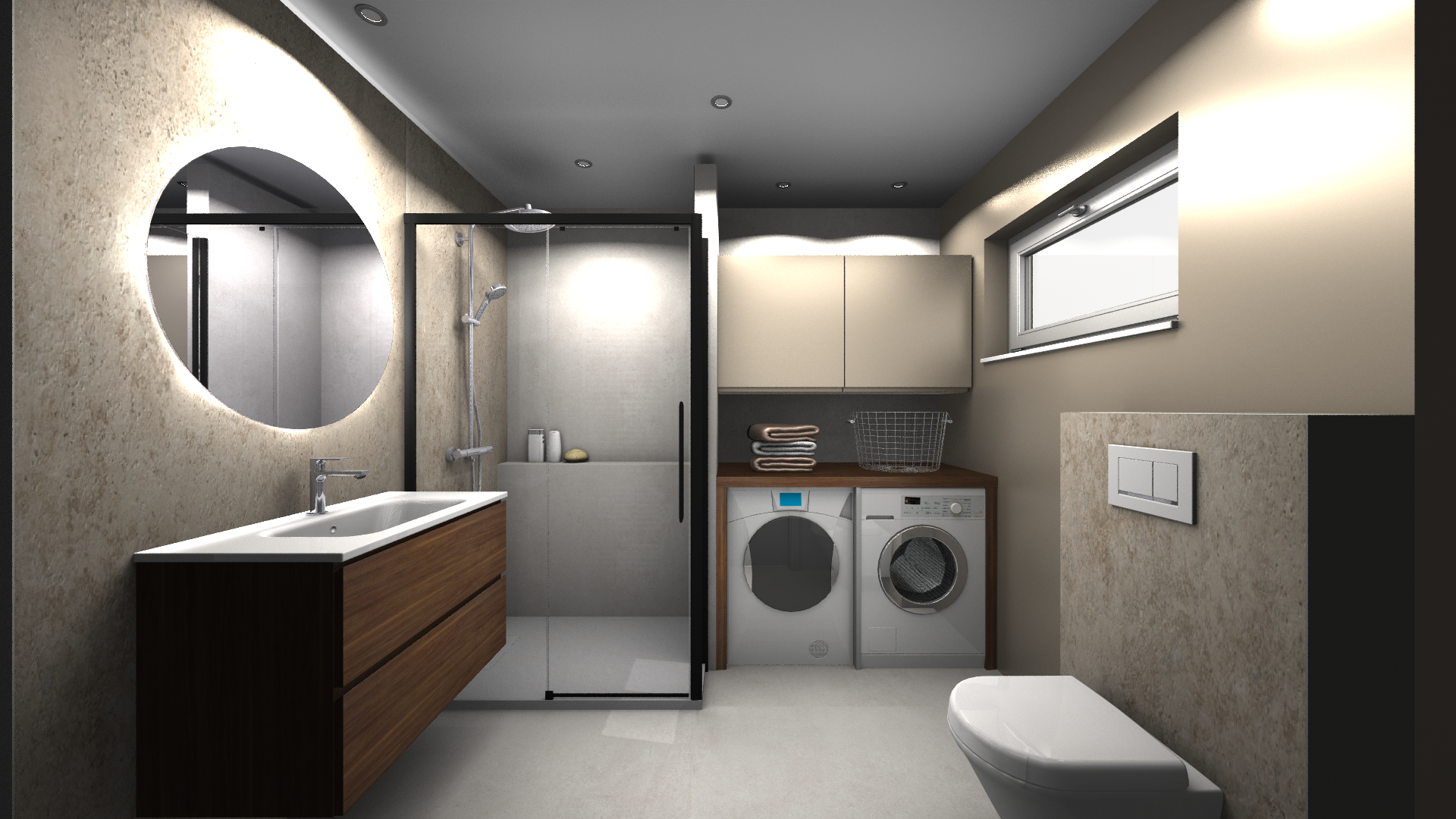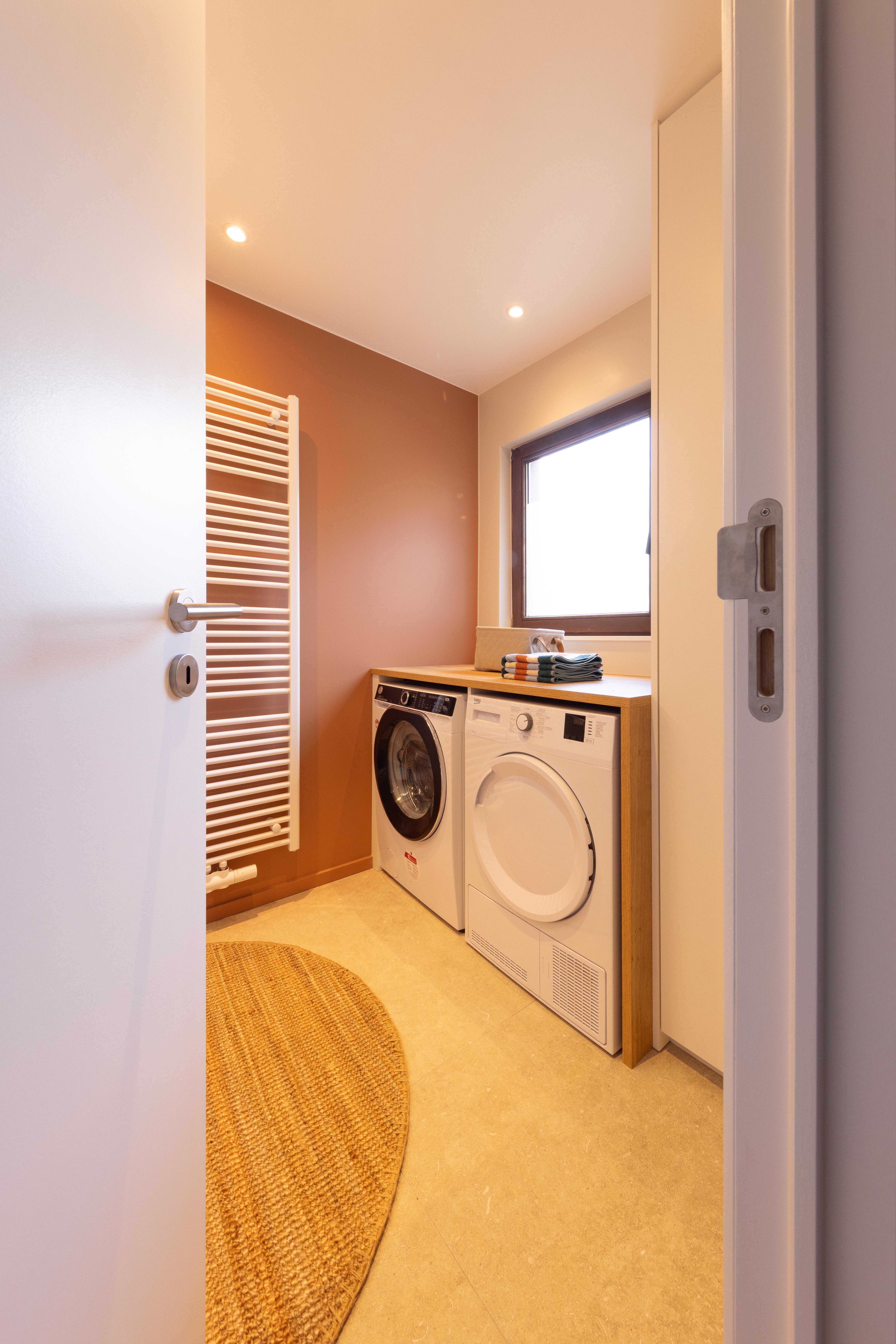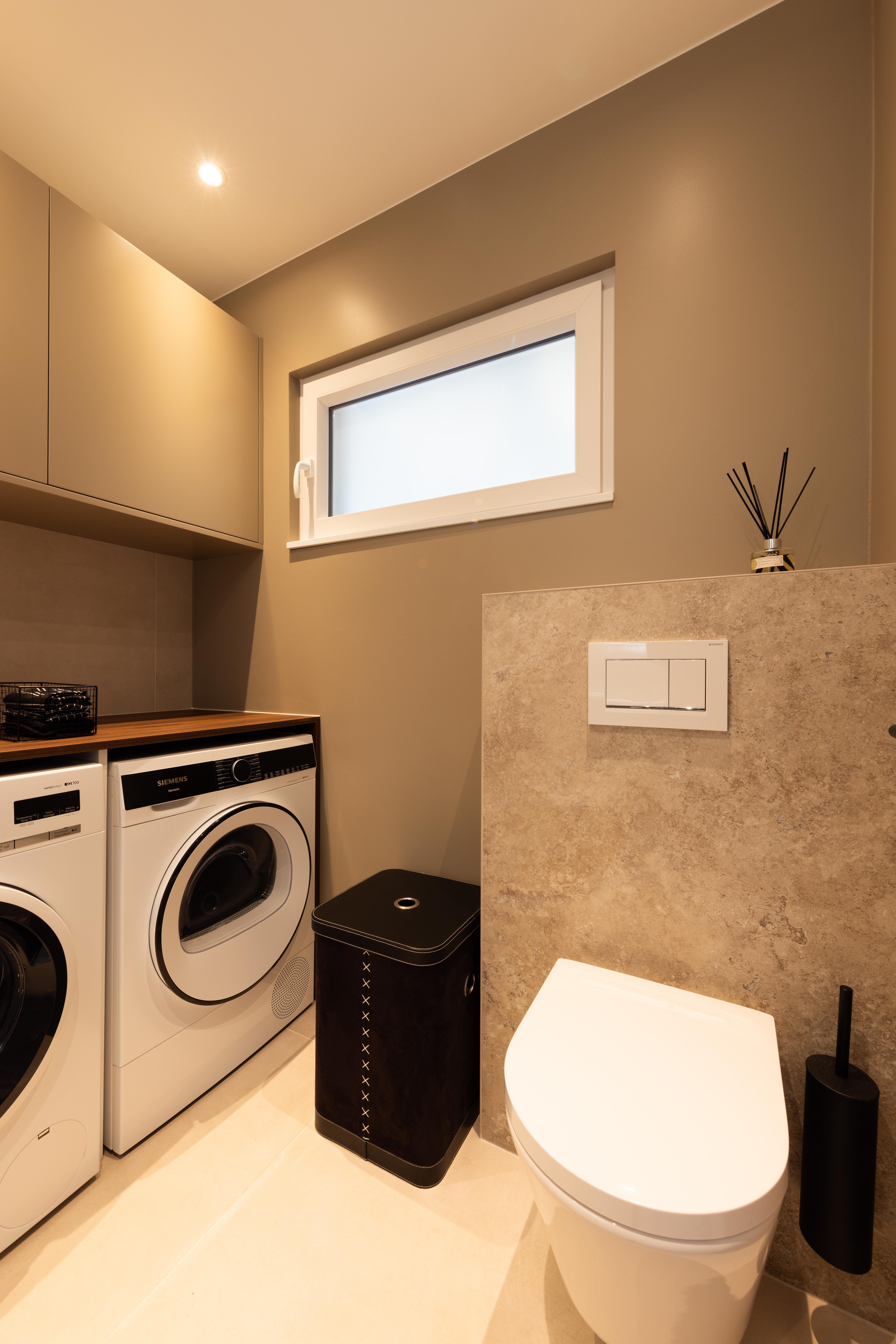 Il arrive que l'on n'ait pas le choix d'intégrer le lave-linge, voire le sèche-linge, dans la salle de bains. Voici un projet qui démontre que la cohabitation peut être esthétique et fonctionnelle.