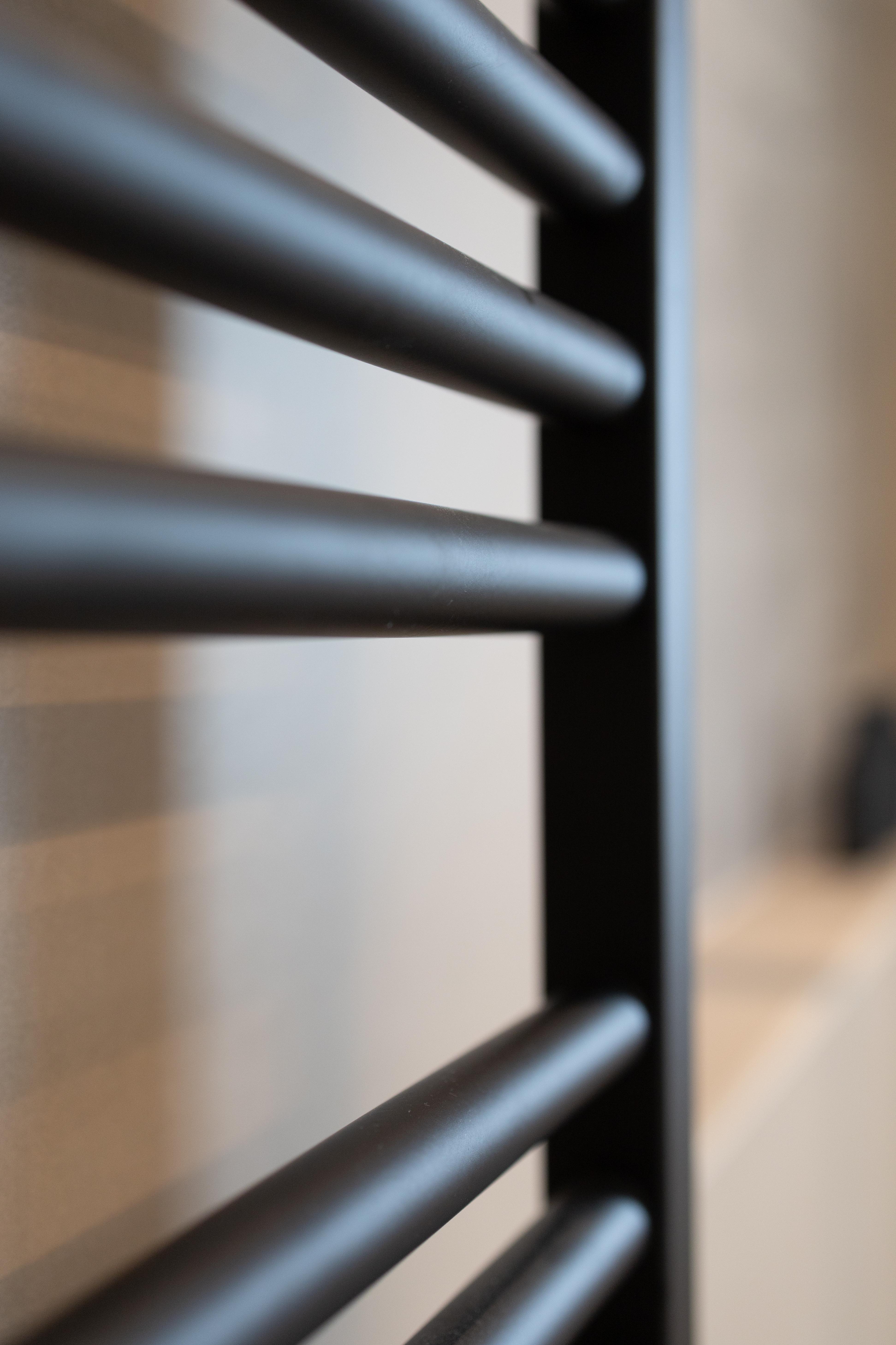 Salle de douche de style industriel, dynamiquement sombre ! Le noir prédomine dans ce projet. Touche subtile avec la mise en place de carreaux blanc mat en reliefs et en pose brique.