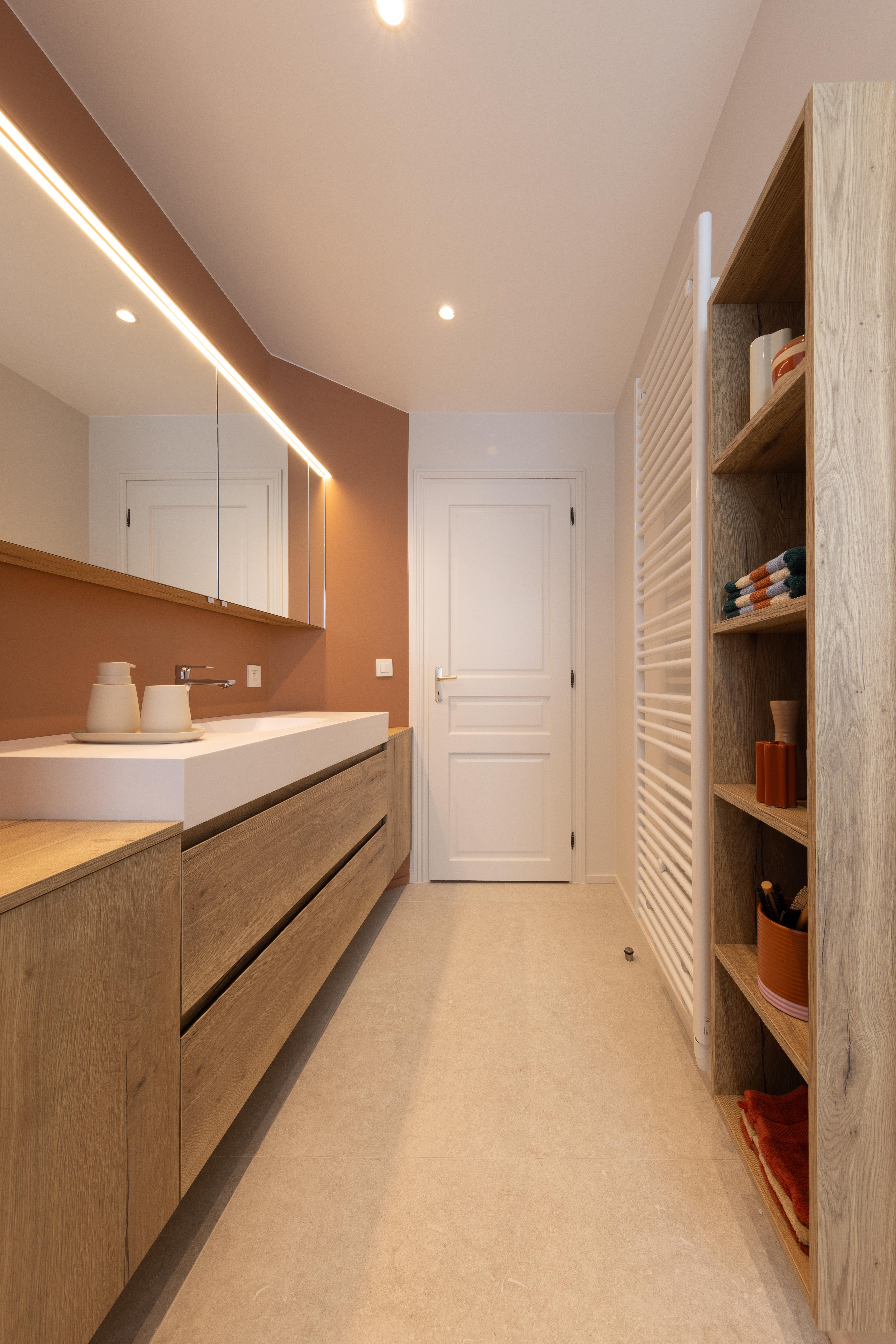 Salle de bains aux côtés chaleureux et enveloppants ! Pas de perte de place, on retrouve des astuces rangements en harmonie avec la configuration allongée de la pièce.