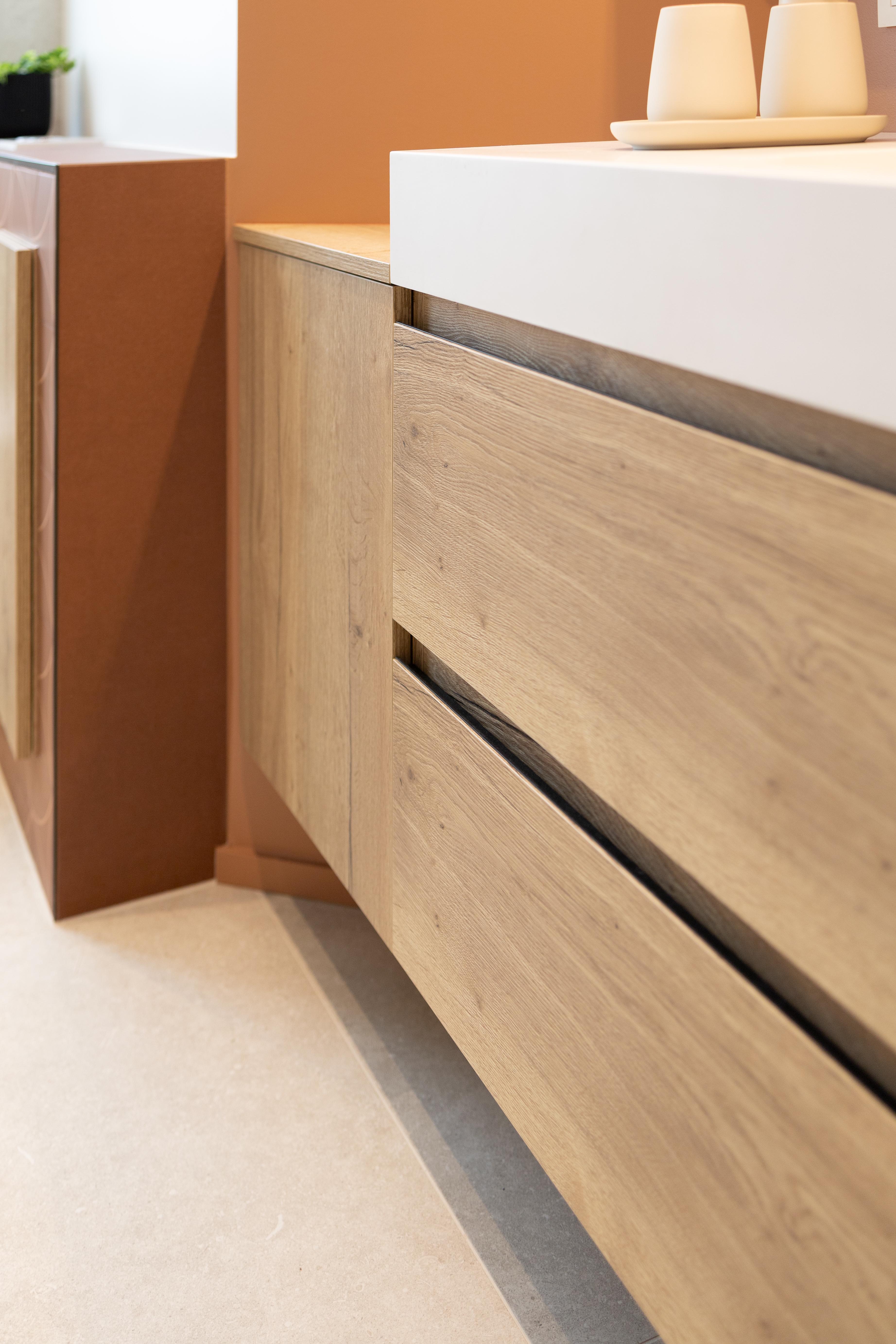 Le défi de ce projet était de réaliser un ensemble sur mesures dans un style cottage voulu par les clients. Les teintes naturelles s’harmonisent bien à la chaleur du bois utilisé. Les angles du plan vasque et des miroirs rappellent les différentes pentes de toit. Quelques jolis paniers en osier, quelques bougies… c'est l'accord parfait!